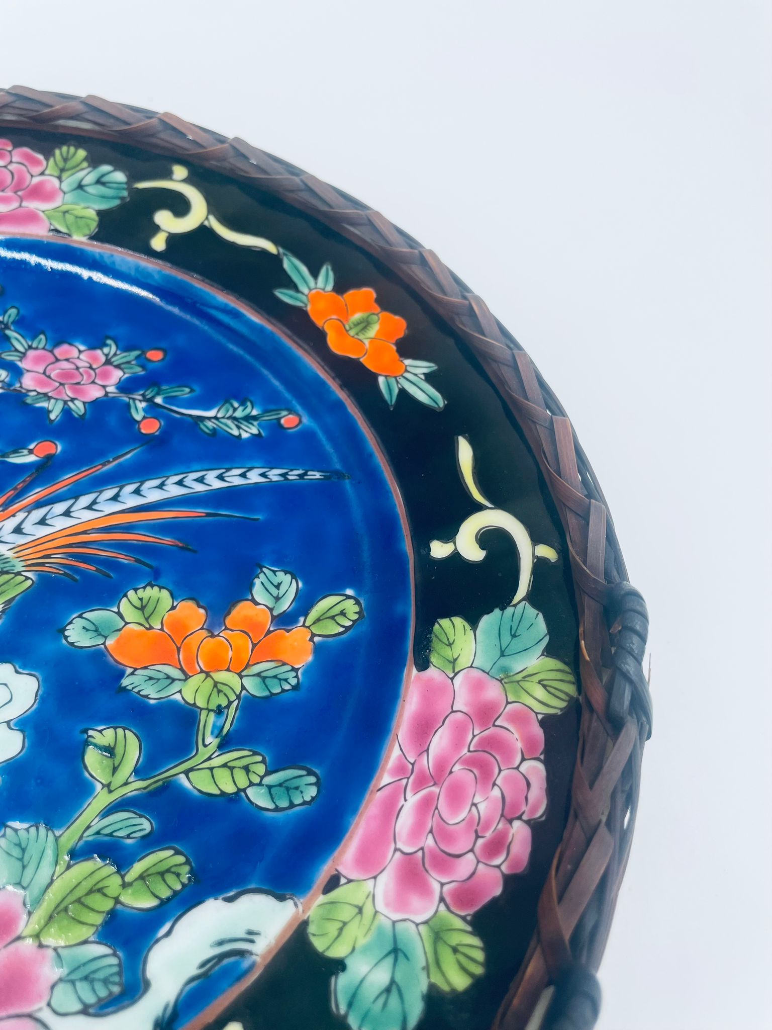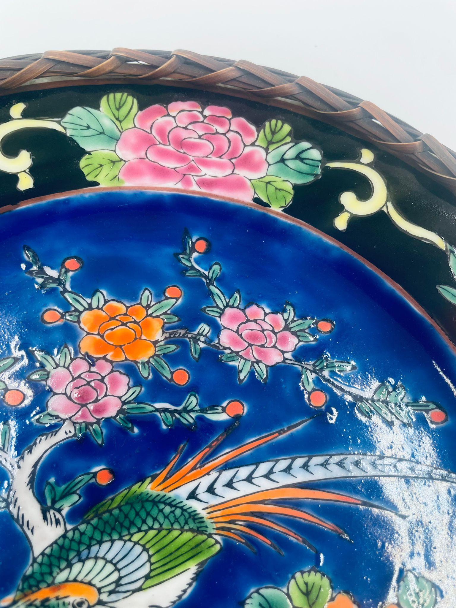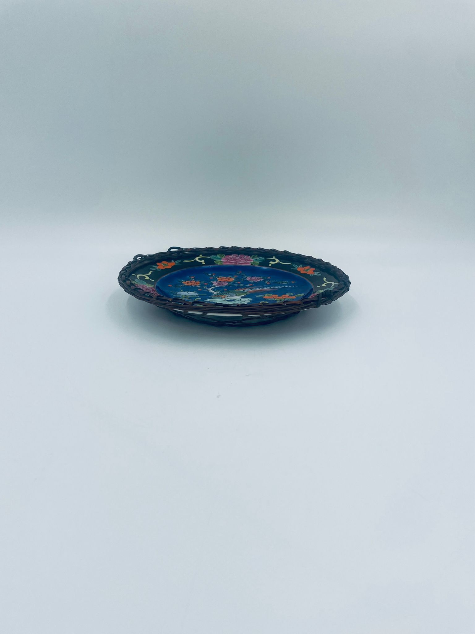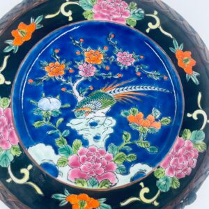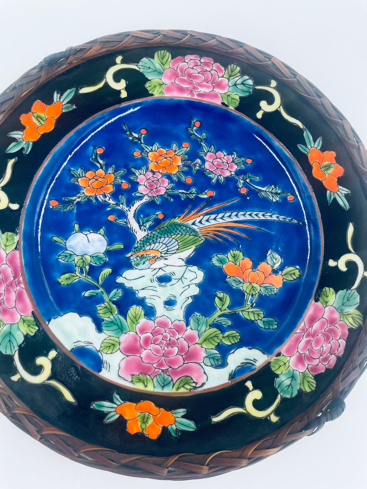 Antyczny talerz dekoracyjny Japoński z lat 50tych, wykonany z wysokiej jakości porcelany. Talerz ręcznie malowany we wzór przedstawiający rajskiego ptaka siedzącego na skale pod kwitnącym drzewem, ozdobiony czarna obwódką z motywem kwiatowym, wykończony ozdobnym, rattanowym oplotem na brzegu.