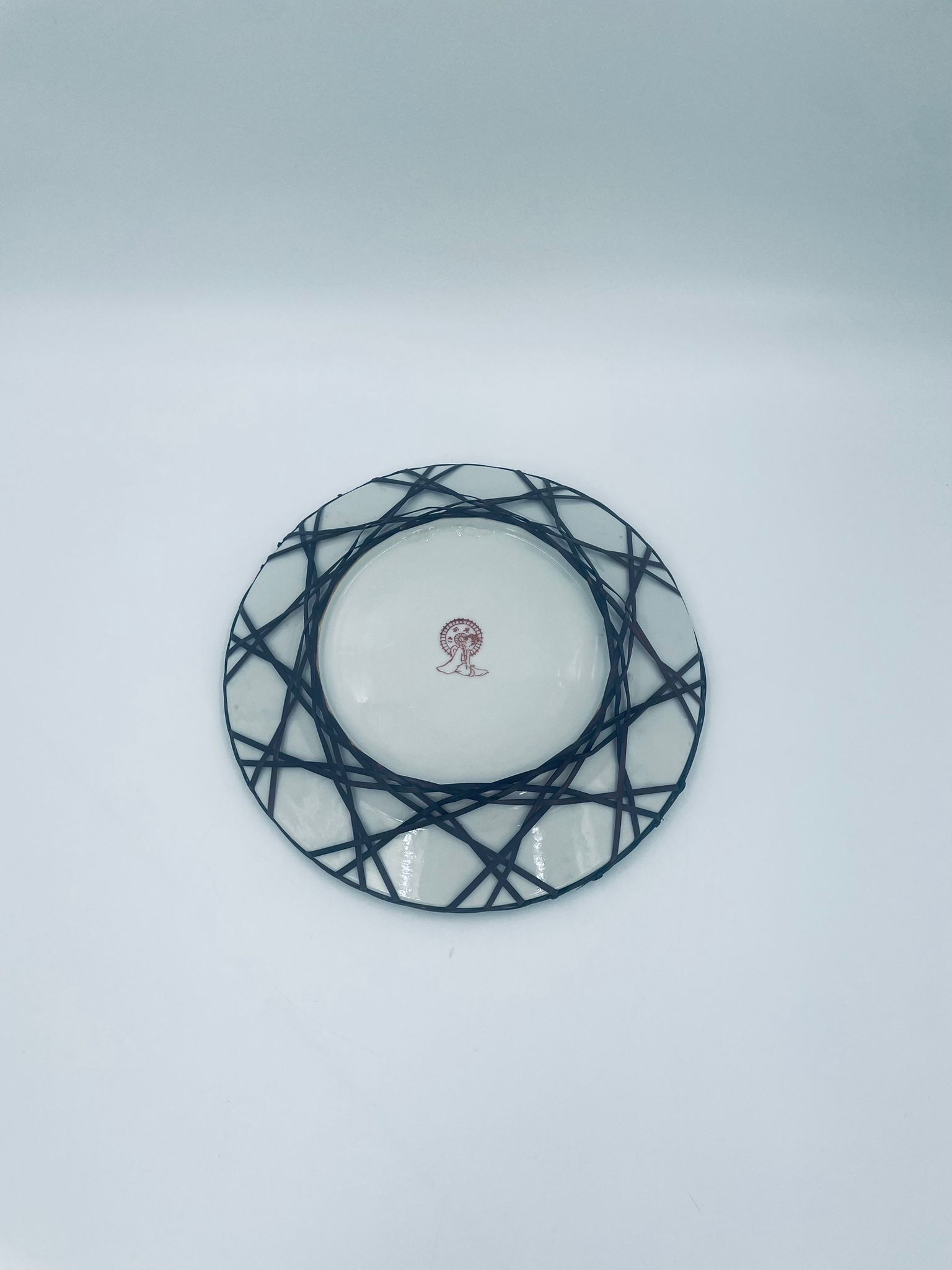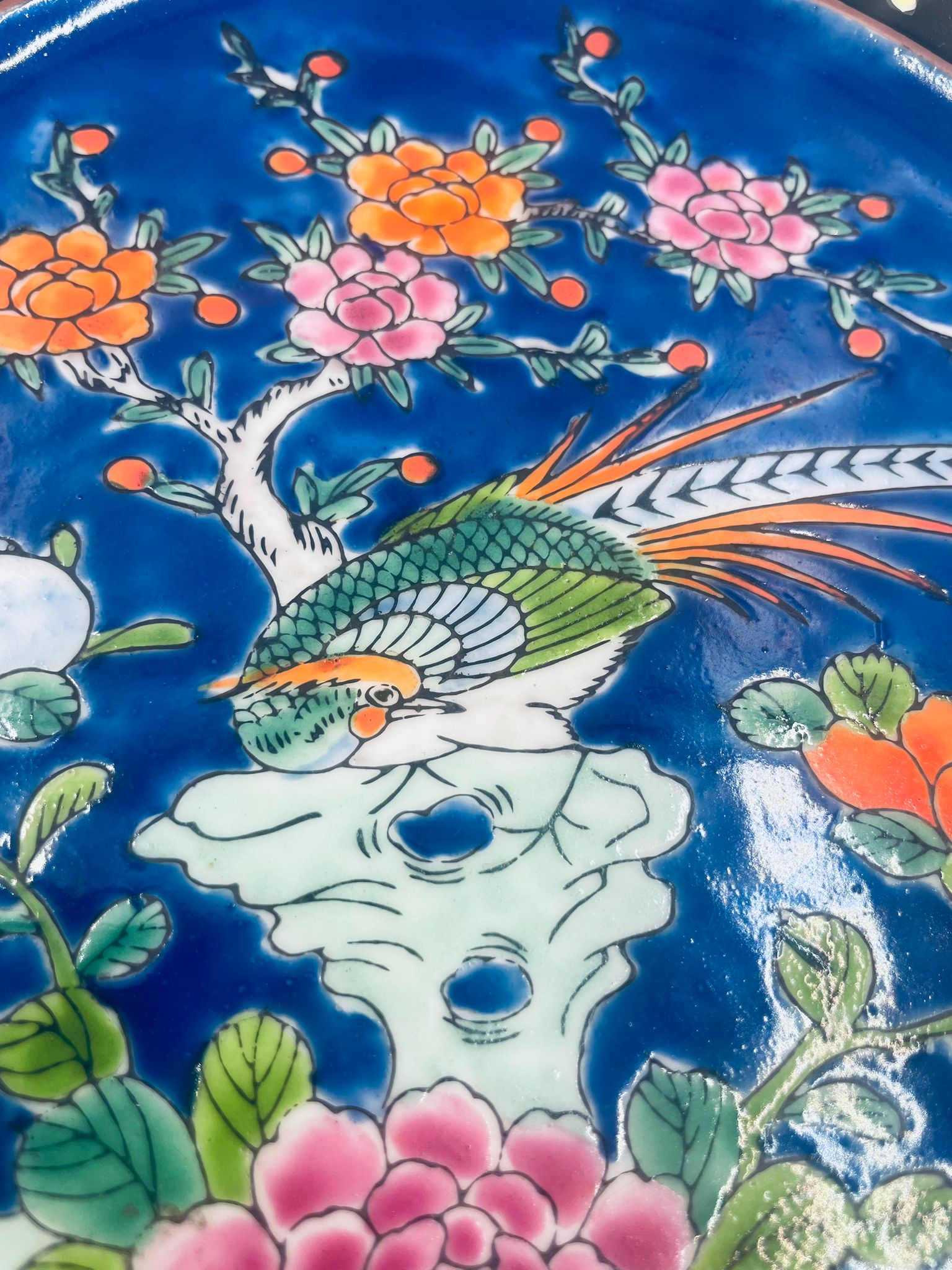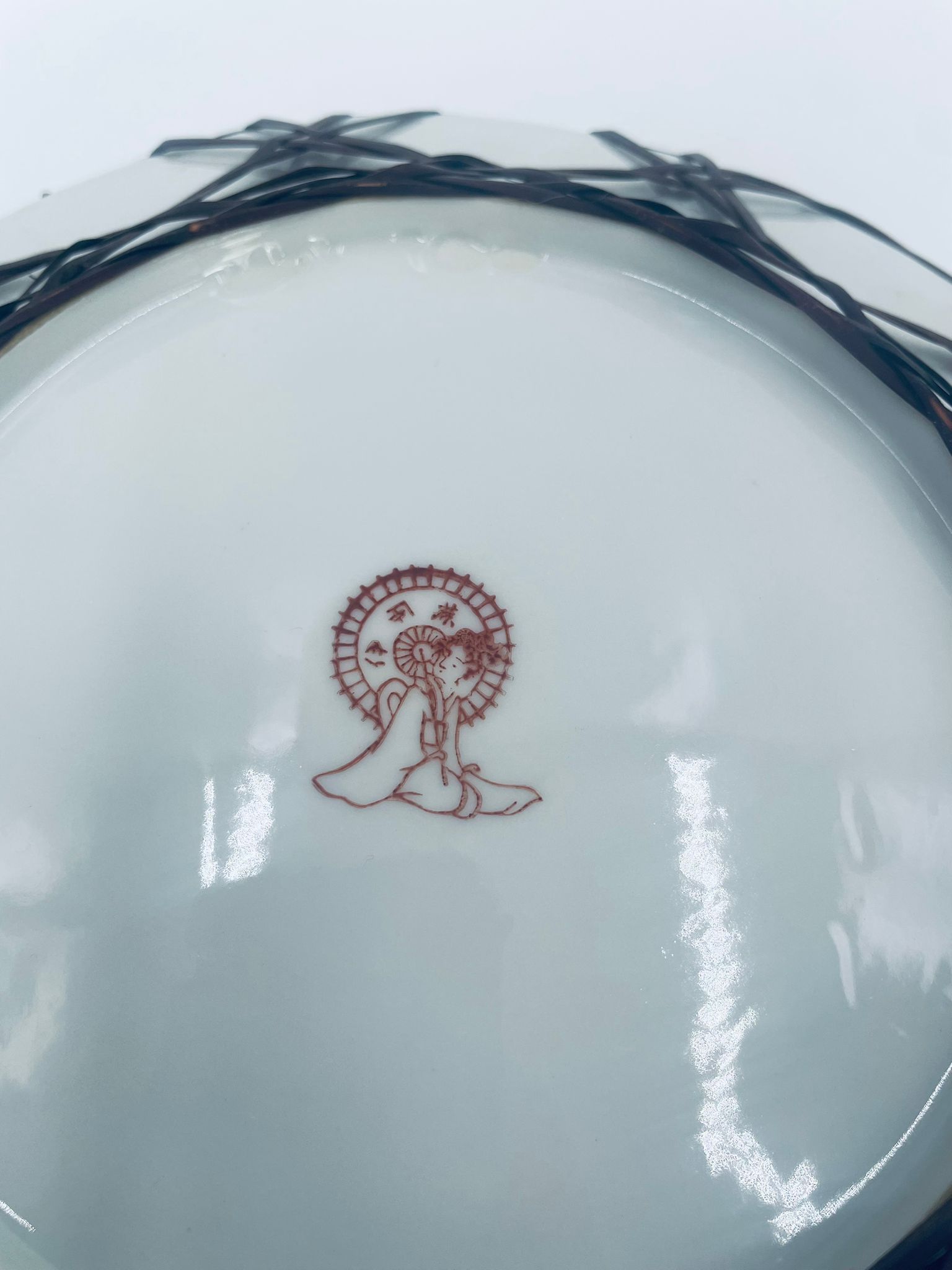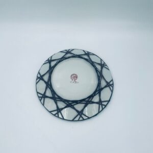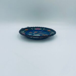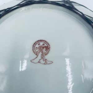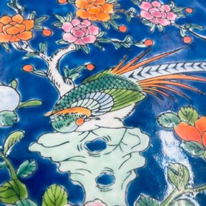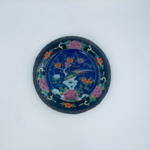 Antyczny talerz dekoracyjny Japoński z lat 50tych, wykonany z wysokiej jakości porcelany. Talerz ręcznie malowany we wzór przedstawiający rajskiego ptaka siedzącego na skale pod kwitnącym drzewem, ozdobiony czarna obwódką z motywem kwiatowym, wykończony ozdobnym, rattanowym oplotem na brzegu.