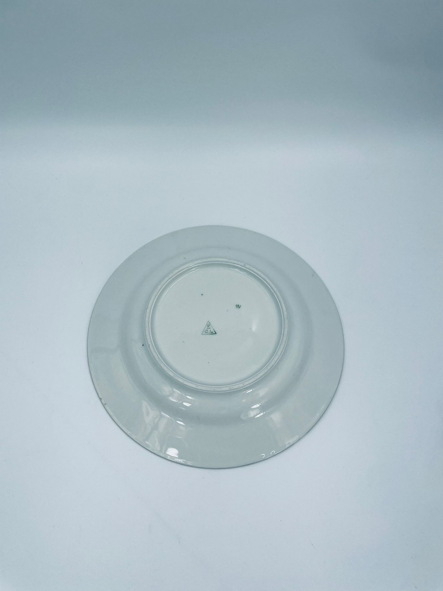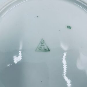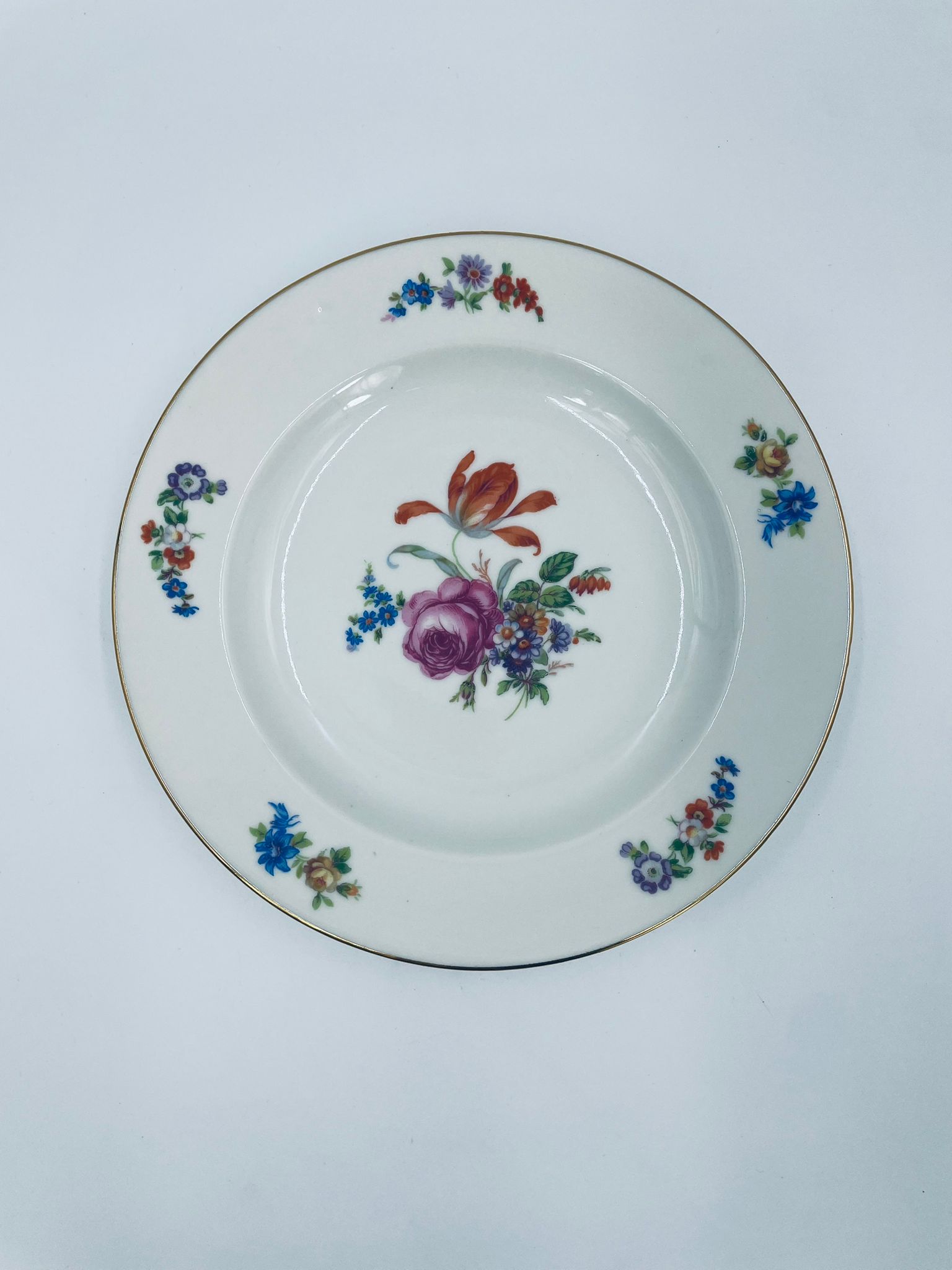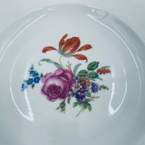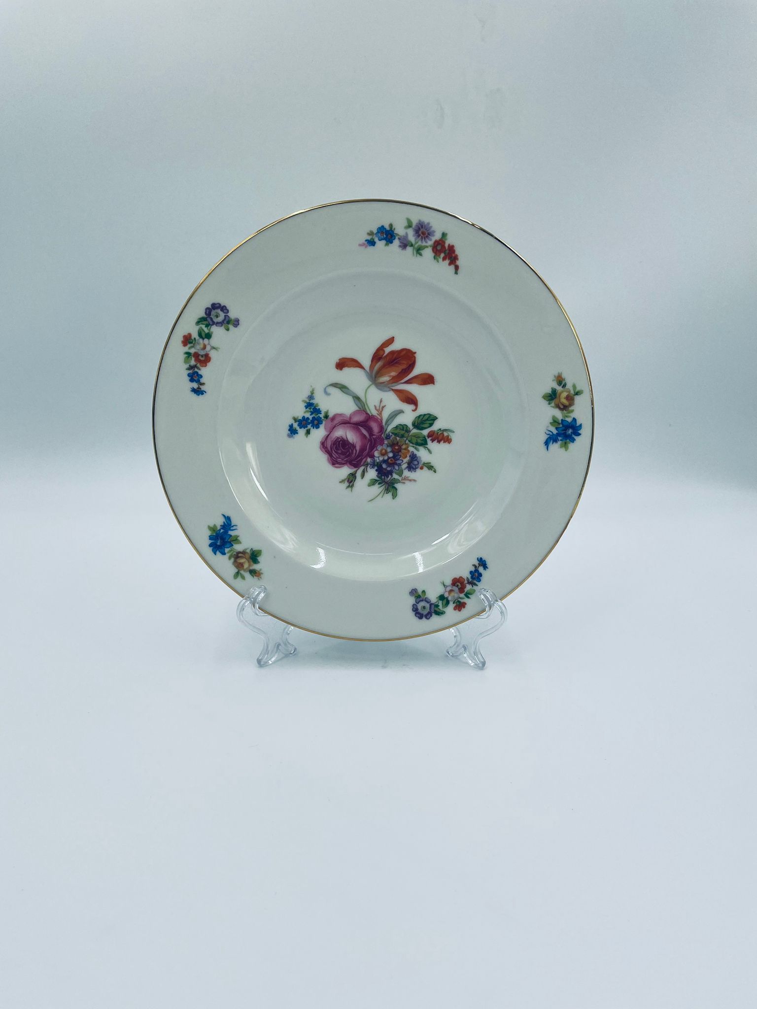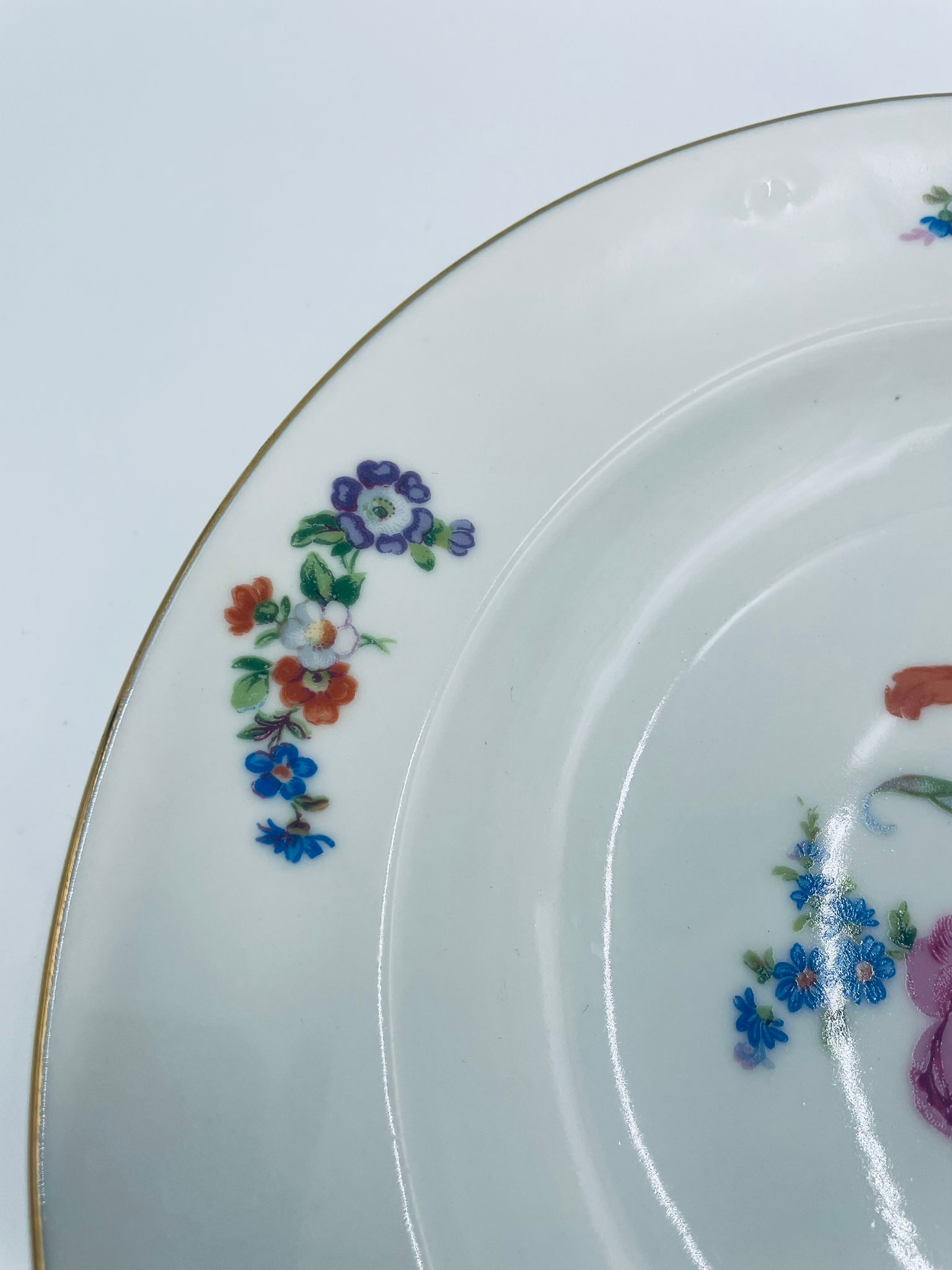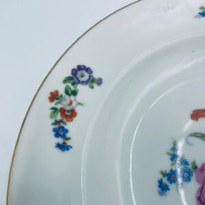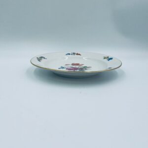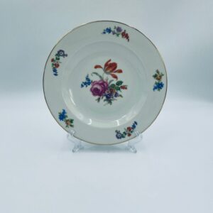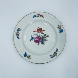 Antyczny talerz głęboki obiadowy, francuskiej wytwórni P.C.L, wykonany z wysokiej jakości białej porcelany. Talerz klasyczny, elegancki, ręcznie malowany w dekor kwiatowy, wykończony złoceniem na rancie.
