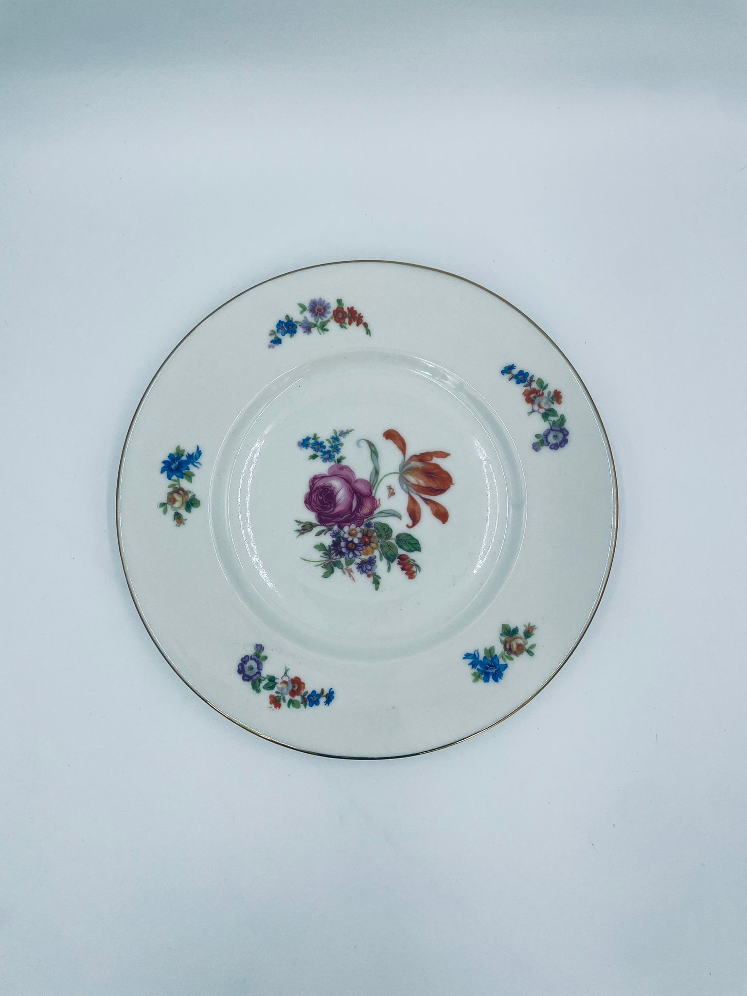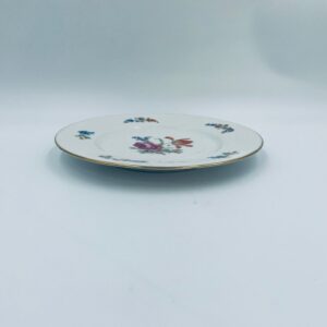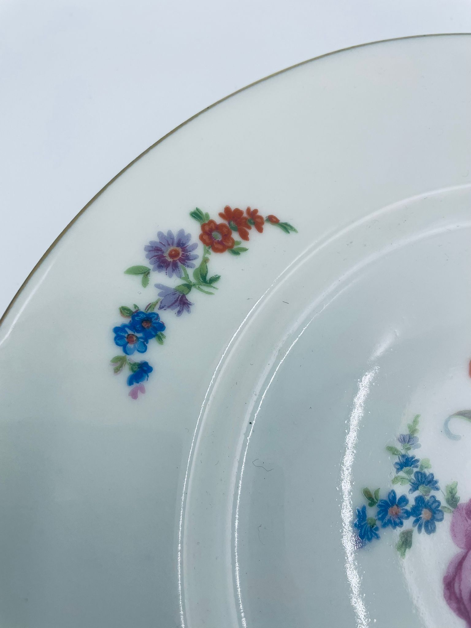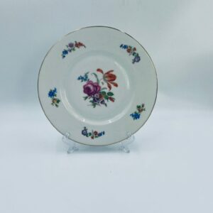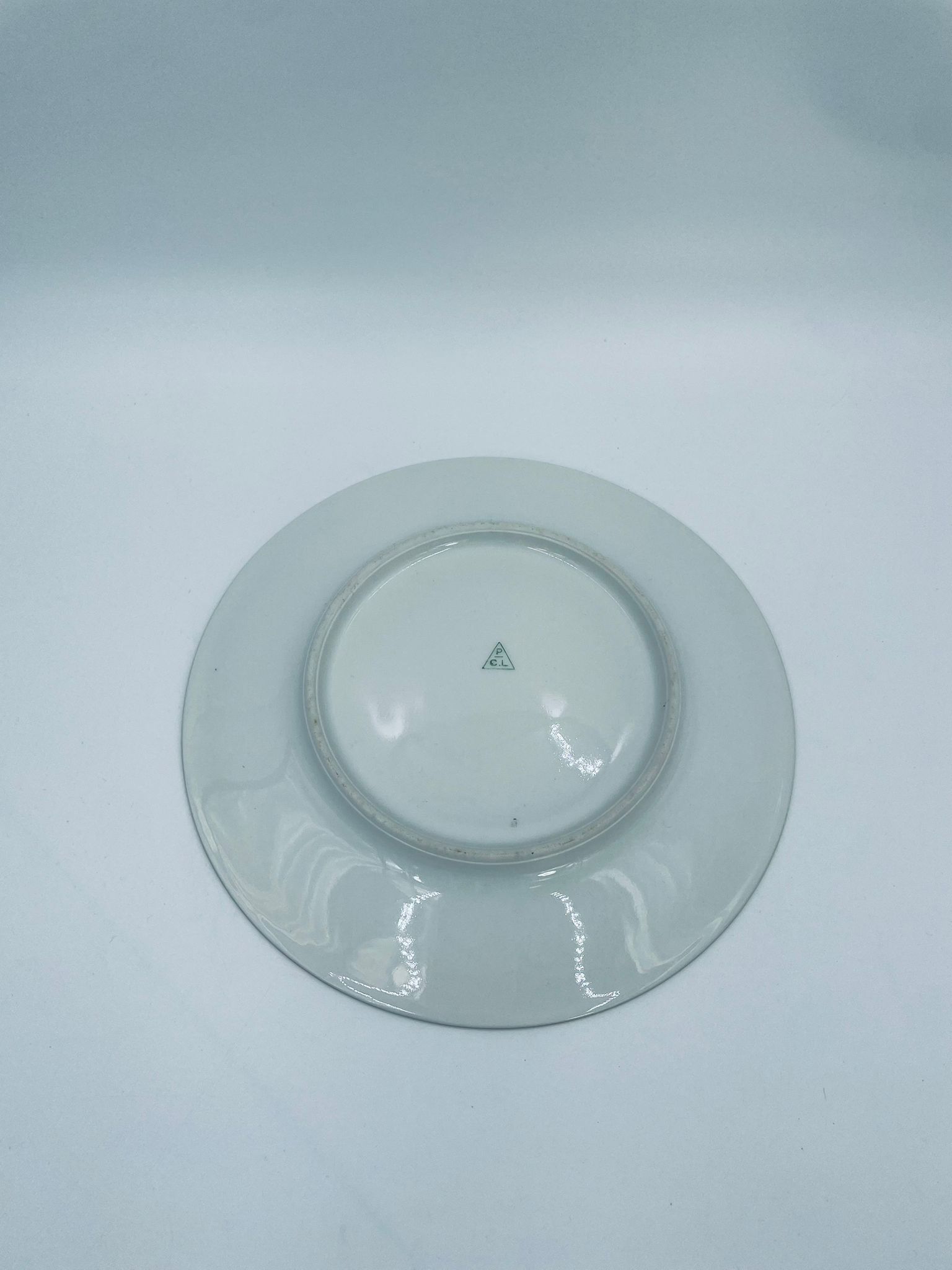 Antyczny talerz płaski obiadowy, francuskiej wytwórni P.C.L, wykonany z wysokiej jakości białej porcelany. Talerz klasyczny, elegancki, ręcznie malowany w dekor kwiatowy, wykończony złoceniem na rancie.