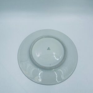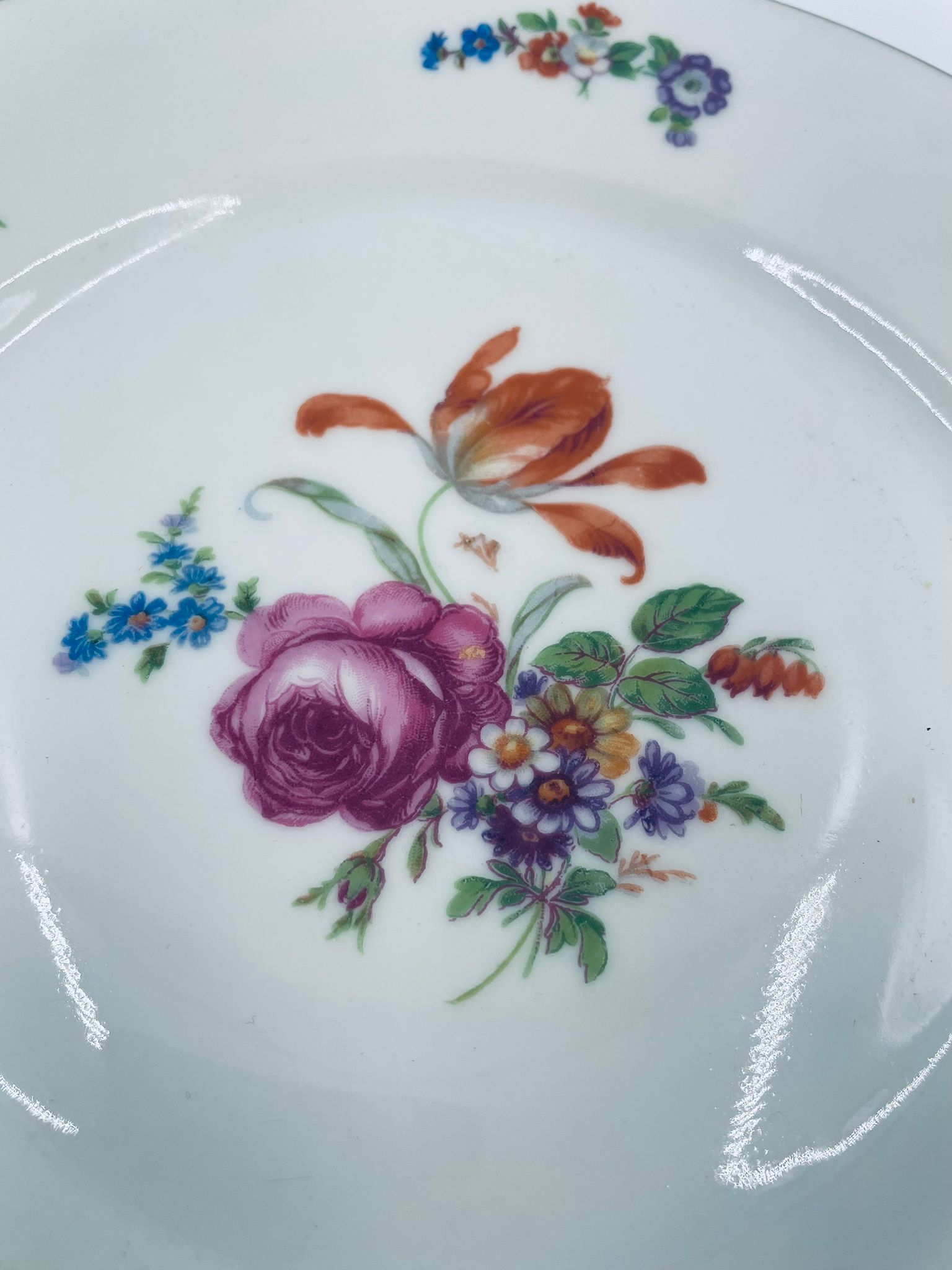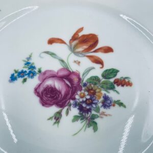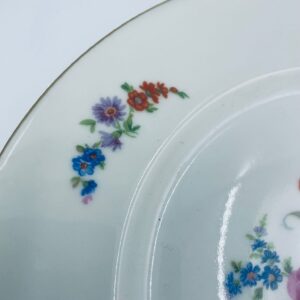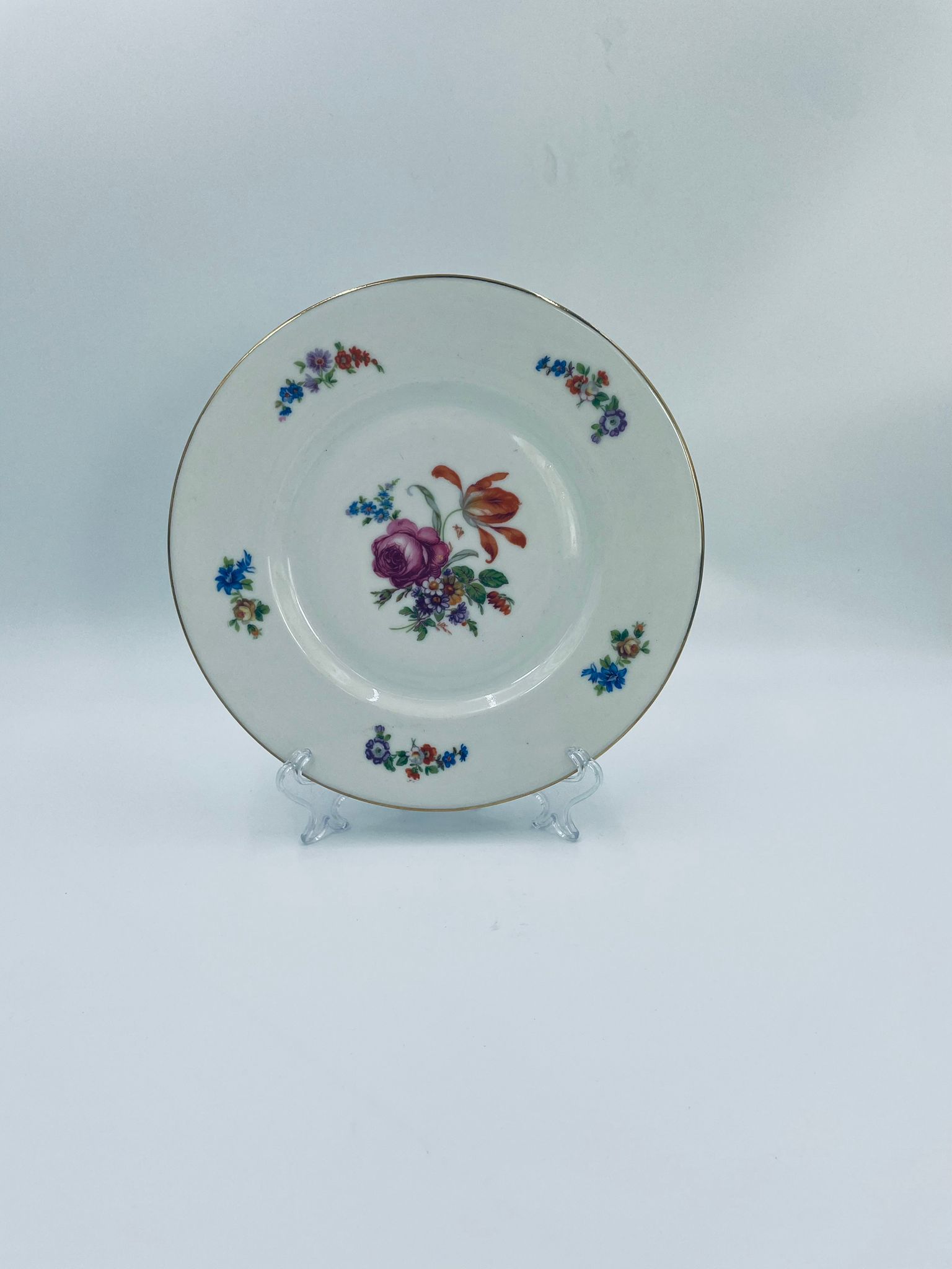 Antyczny talerz płaski obiadowy, francuskiej wytwórni P.C.L, wykonany z wysokiej jakości białej porcelany. Talerz klasyczny, elegancki, ręcznie malowany w dekor kwiatowy, wykończony złoceniem na rancie.