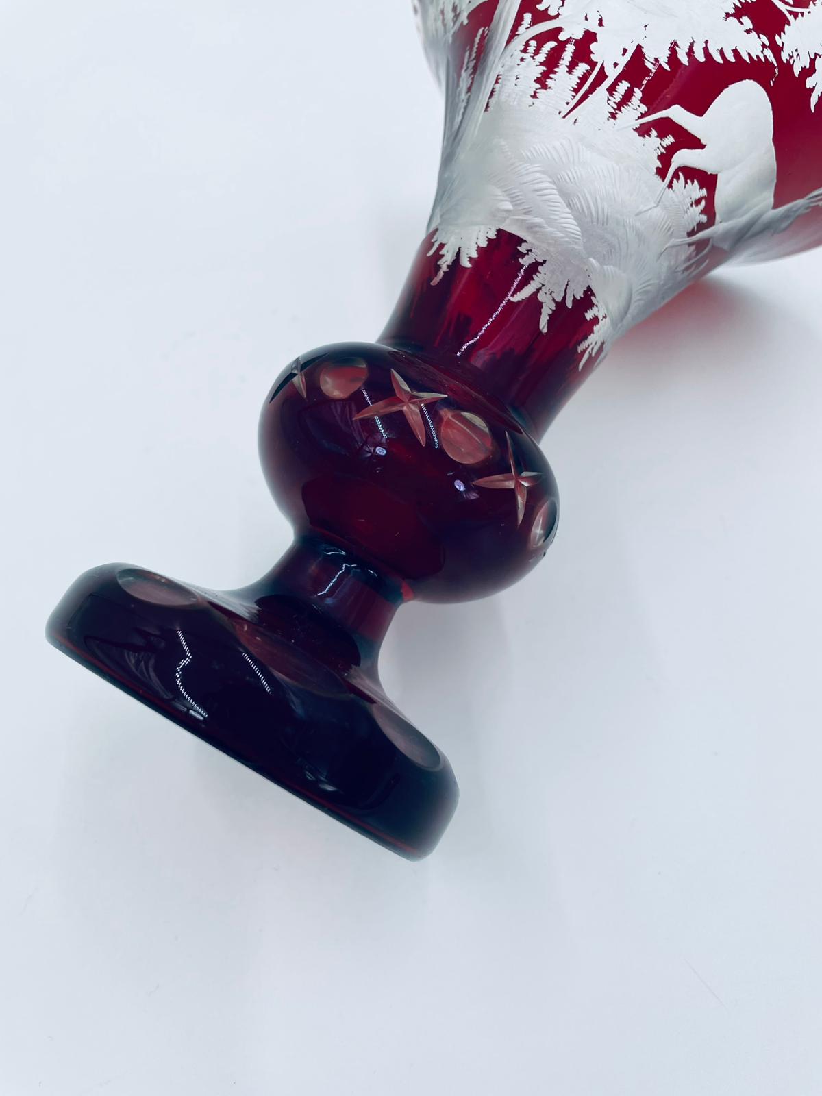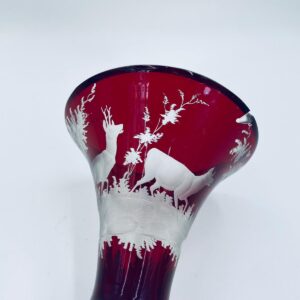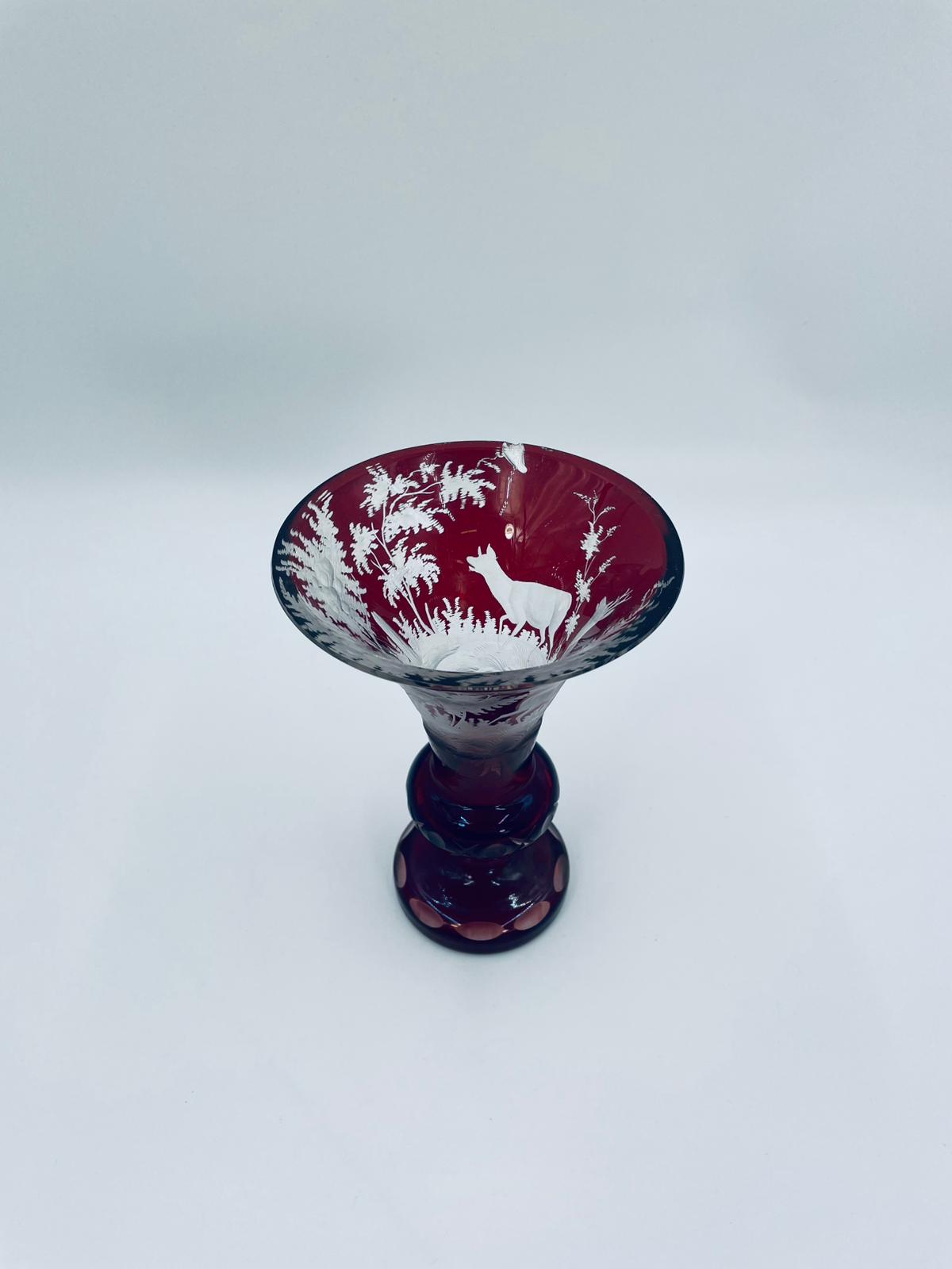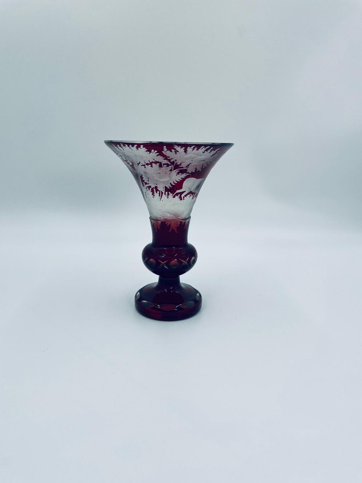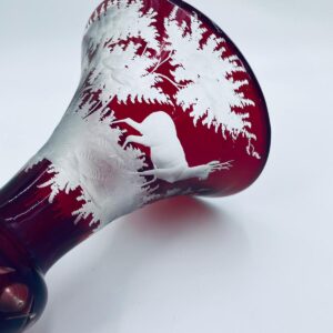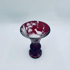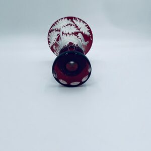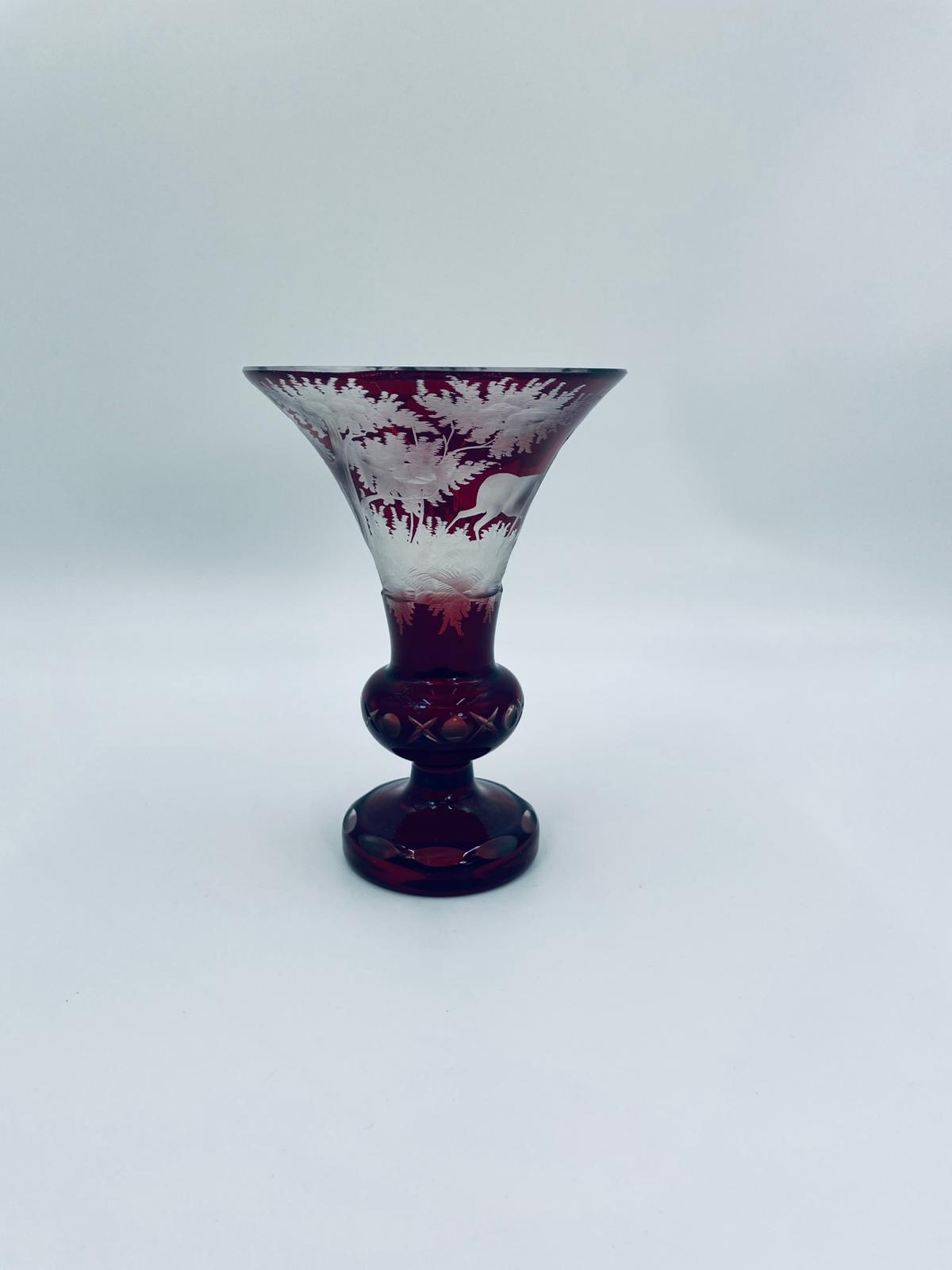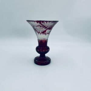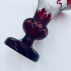 Antyczny wazon dekoracyjny w stylu Bedermeier, wykonany z wysokiej jakości szkła kryształowego. Wazon charakteryzuje się głębokim rubinowym kolorem oraz precyzyjnym szlifem ze wzorem myśliwskim, nóżka i podstawa z fasetowanymi wycinanymi wzorami. Posiada uszczerbek na górnej krawędzi.