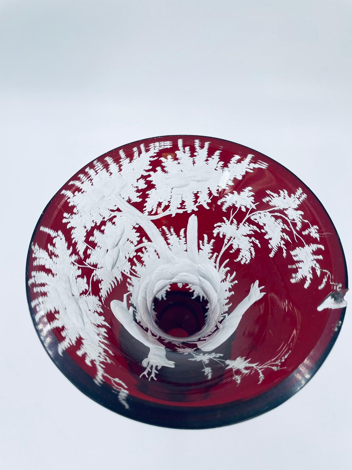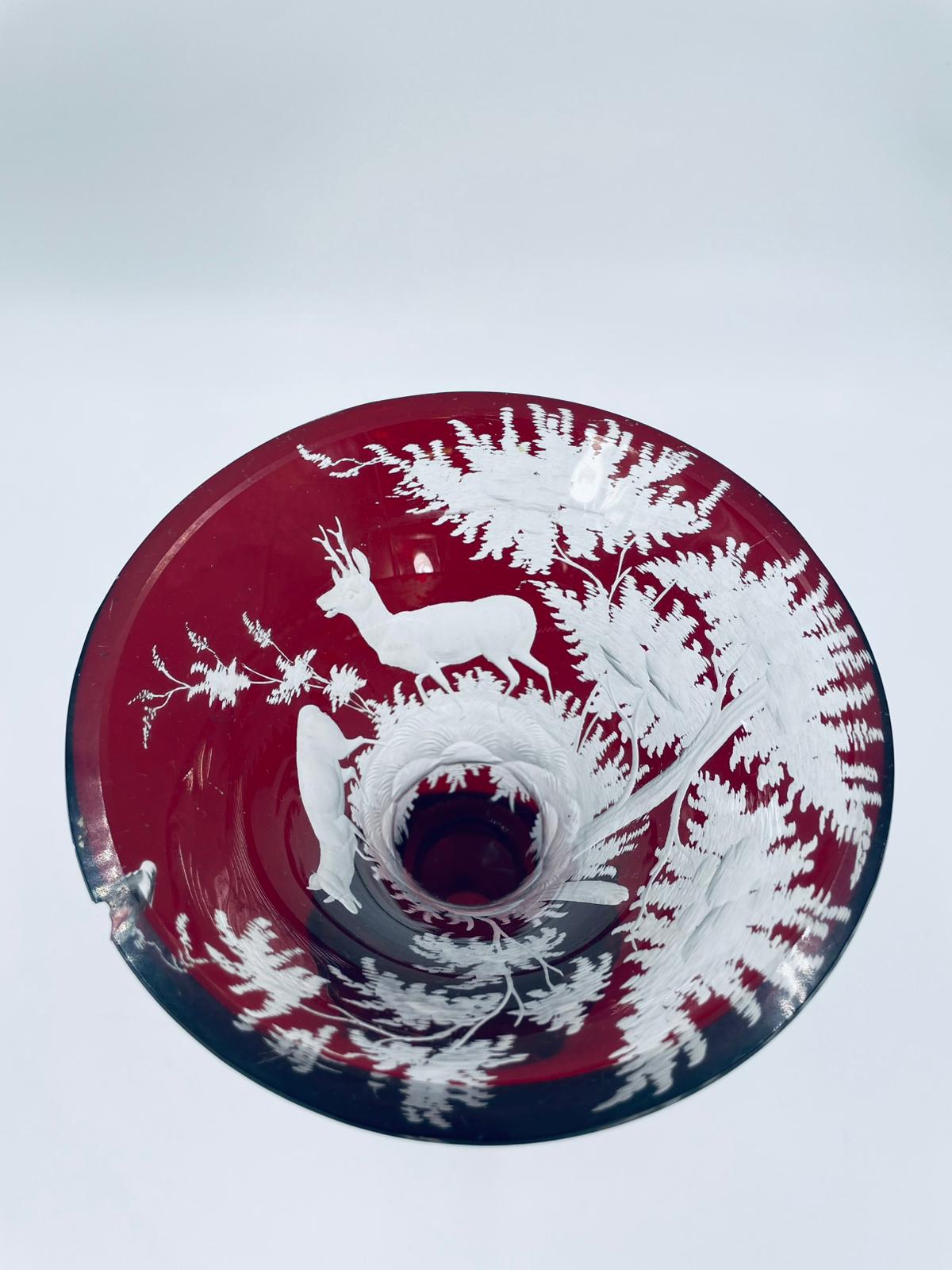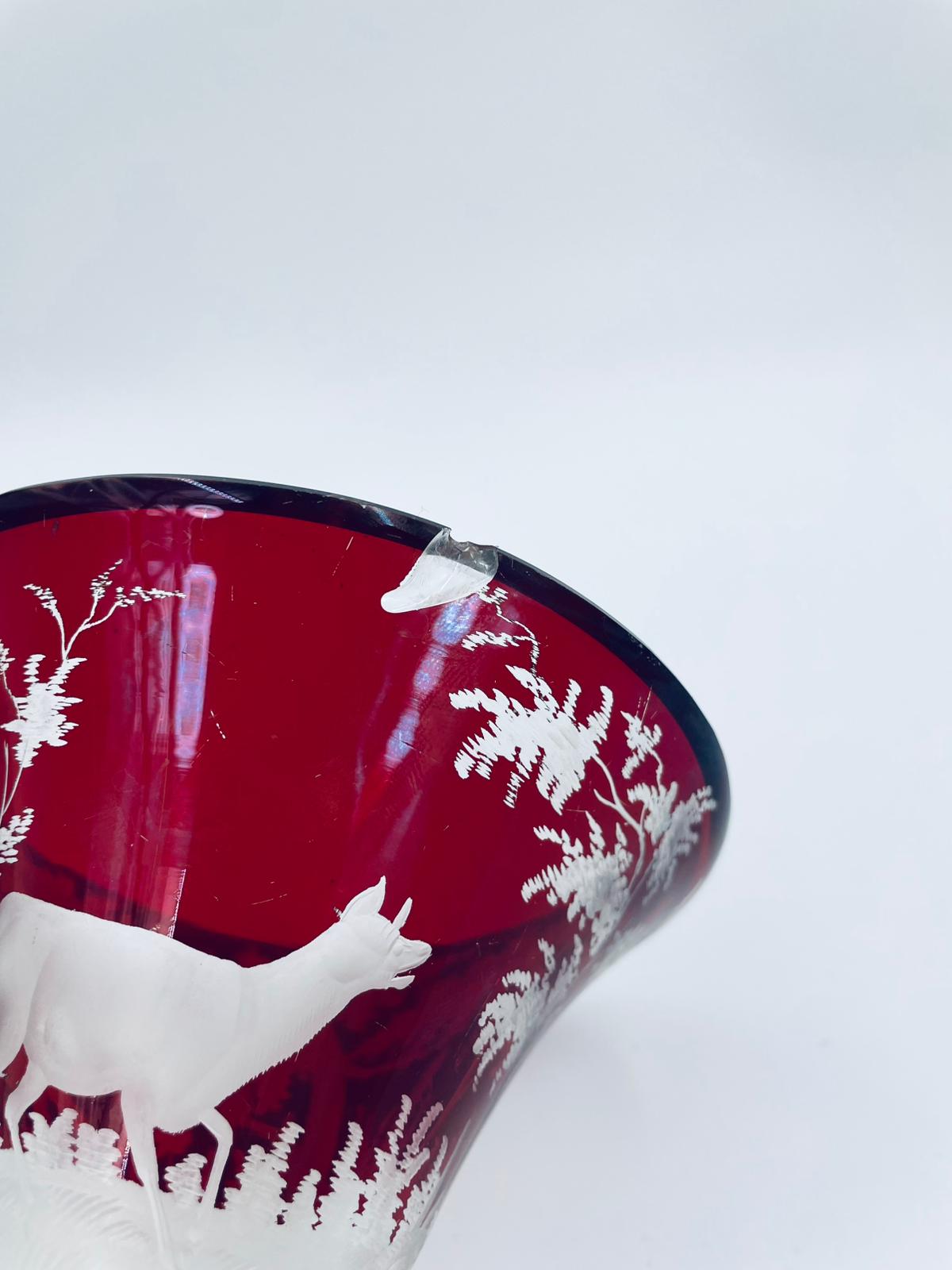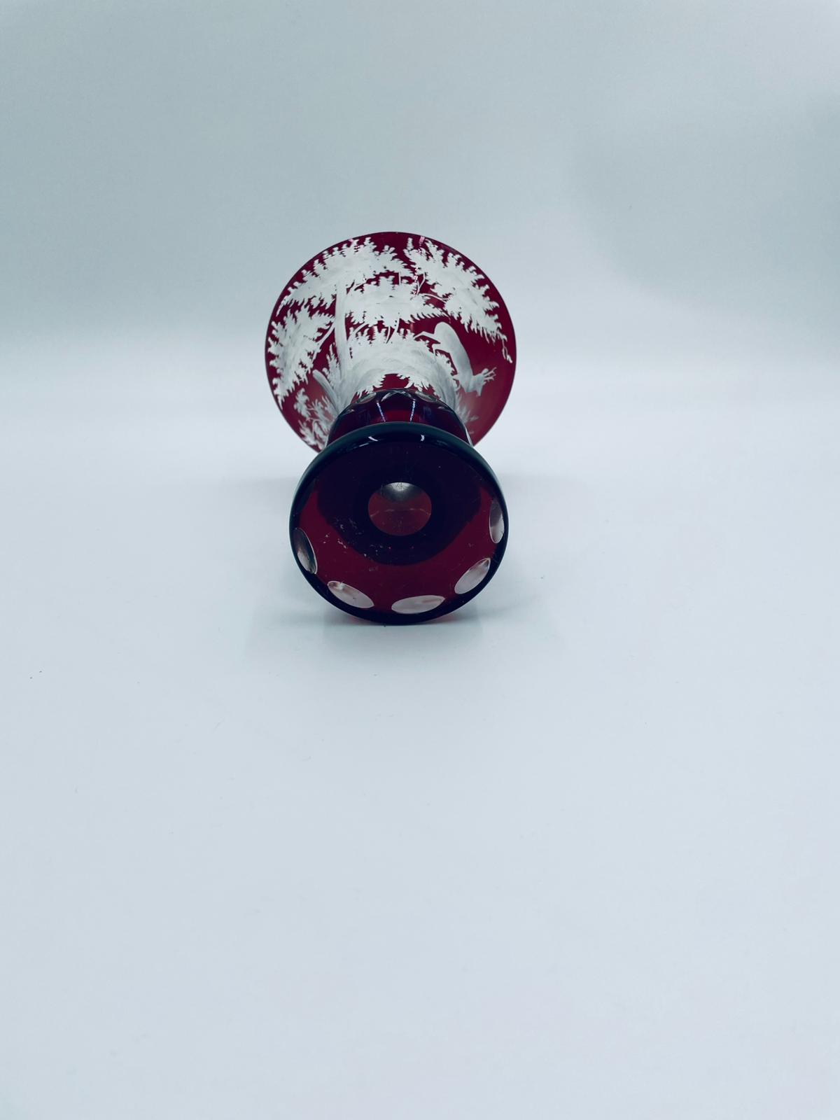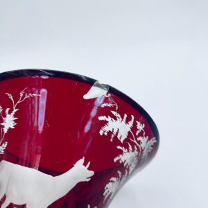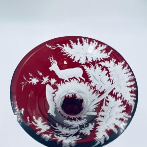 Antyczny wazon dekoracyjny w stylu Bedermeier, wykonany z wysokiej jakości szkła kryształowego. Wazon charakteryzuje się głębokim rubinowym kolorem oraz precyzyjnym szlifem ze wzorem myśliwskim, nóżka i podstawa z fasetowanymi wycinanymi wzorami. Posiada uszczerbek na górnej krawędzi.