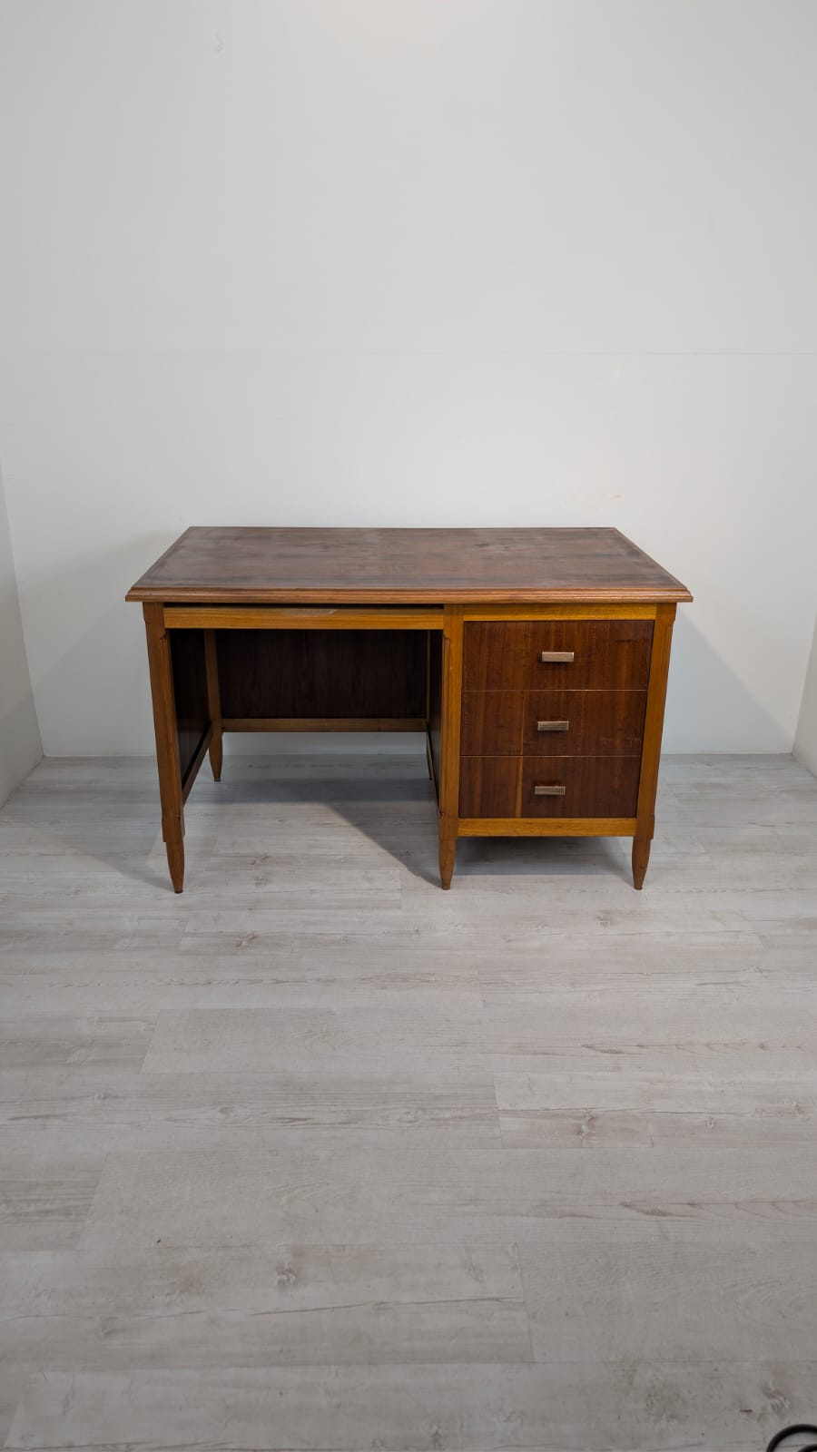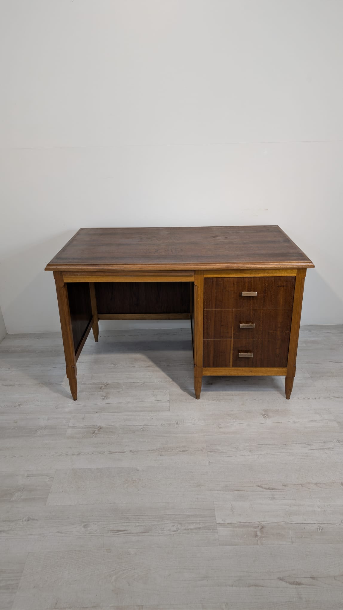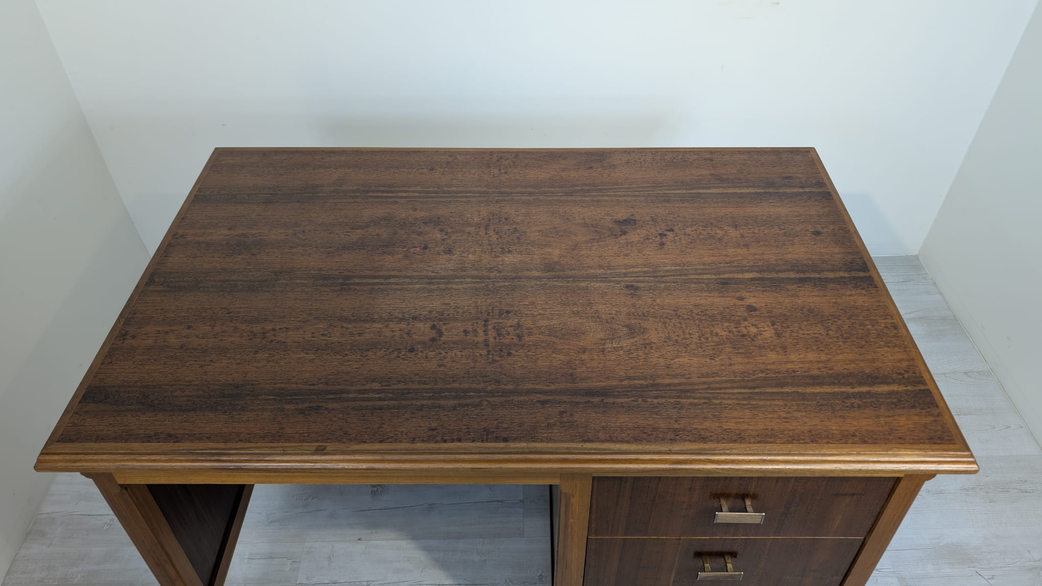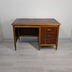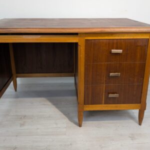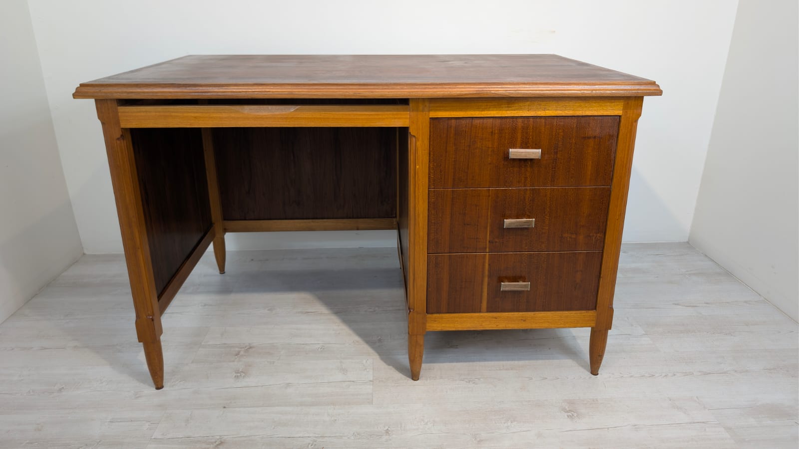 Solidny, drewniany, teak biurko z lat 60./70. Posiada trzy szuflad oraz wysuwany blat roboczy, które zapewniają dodatkową przestrzeń do przechowywania oraz funkcjonowania na większej powierzchni.