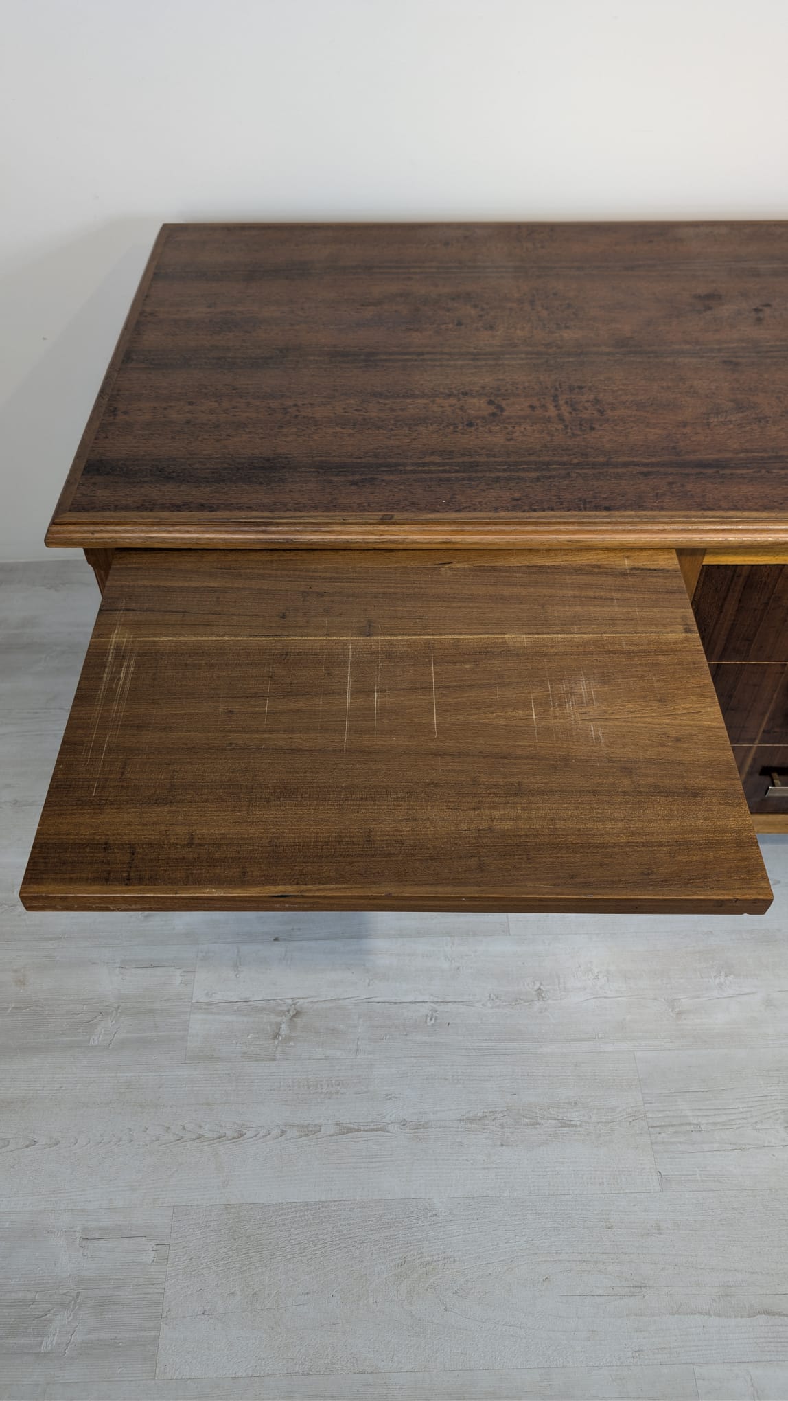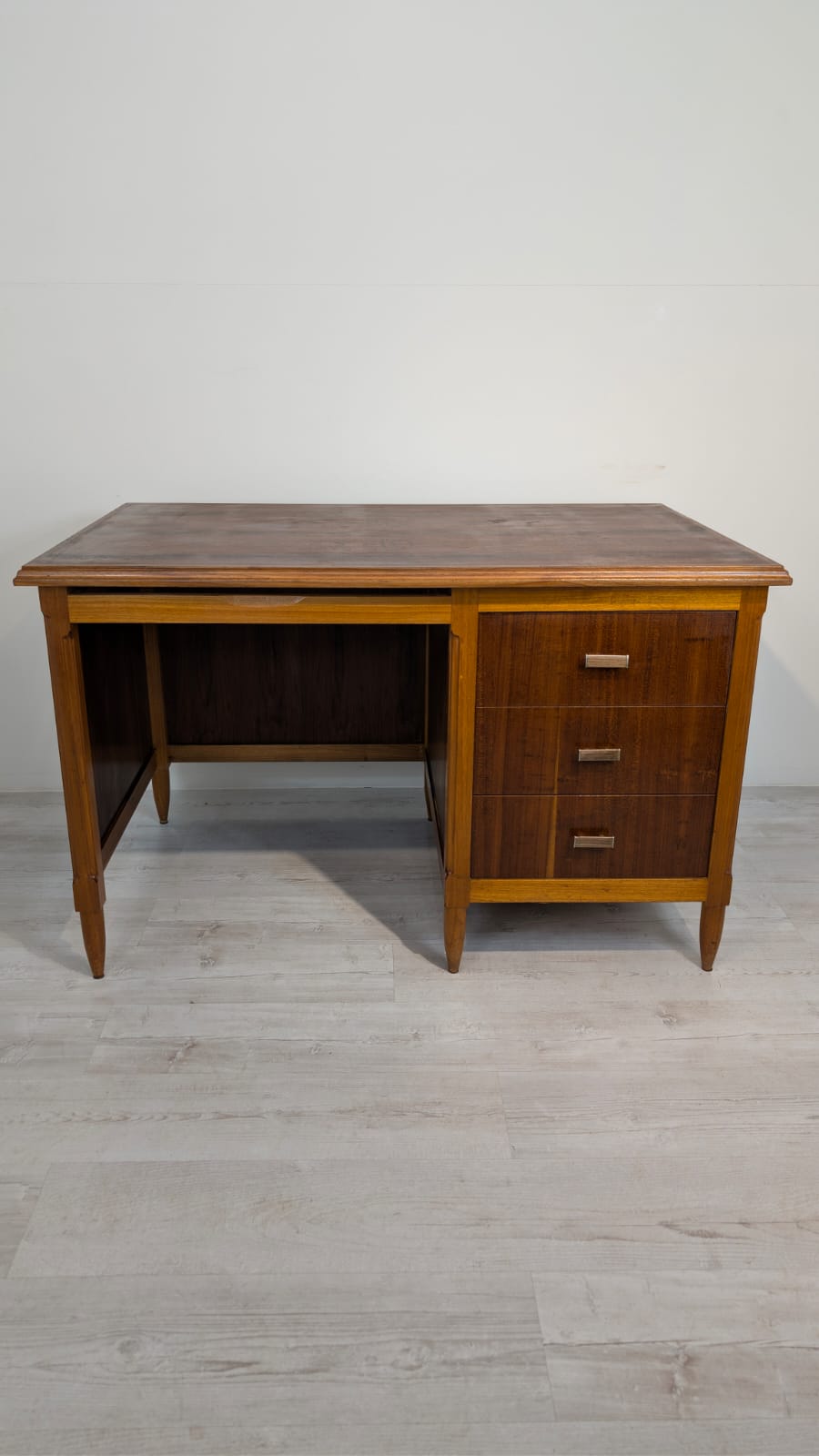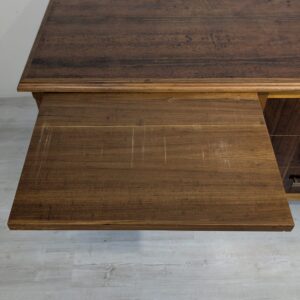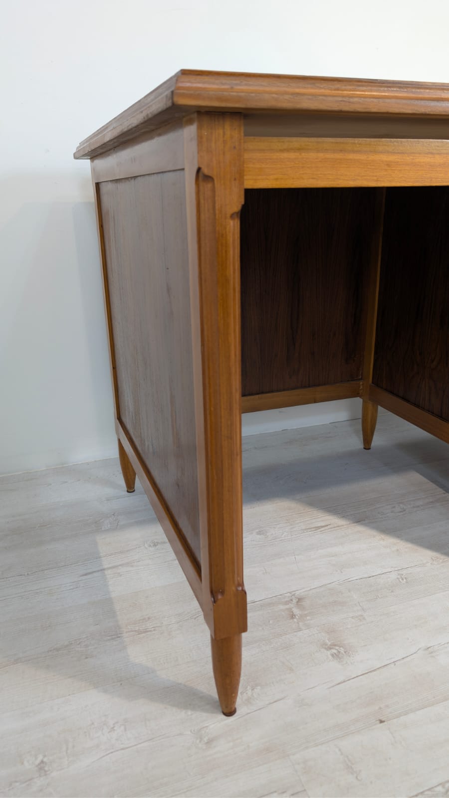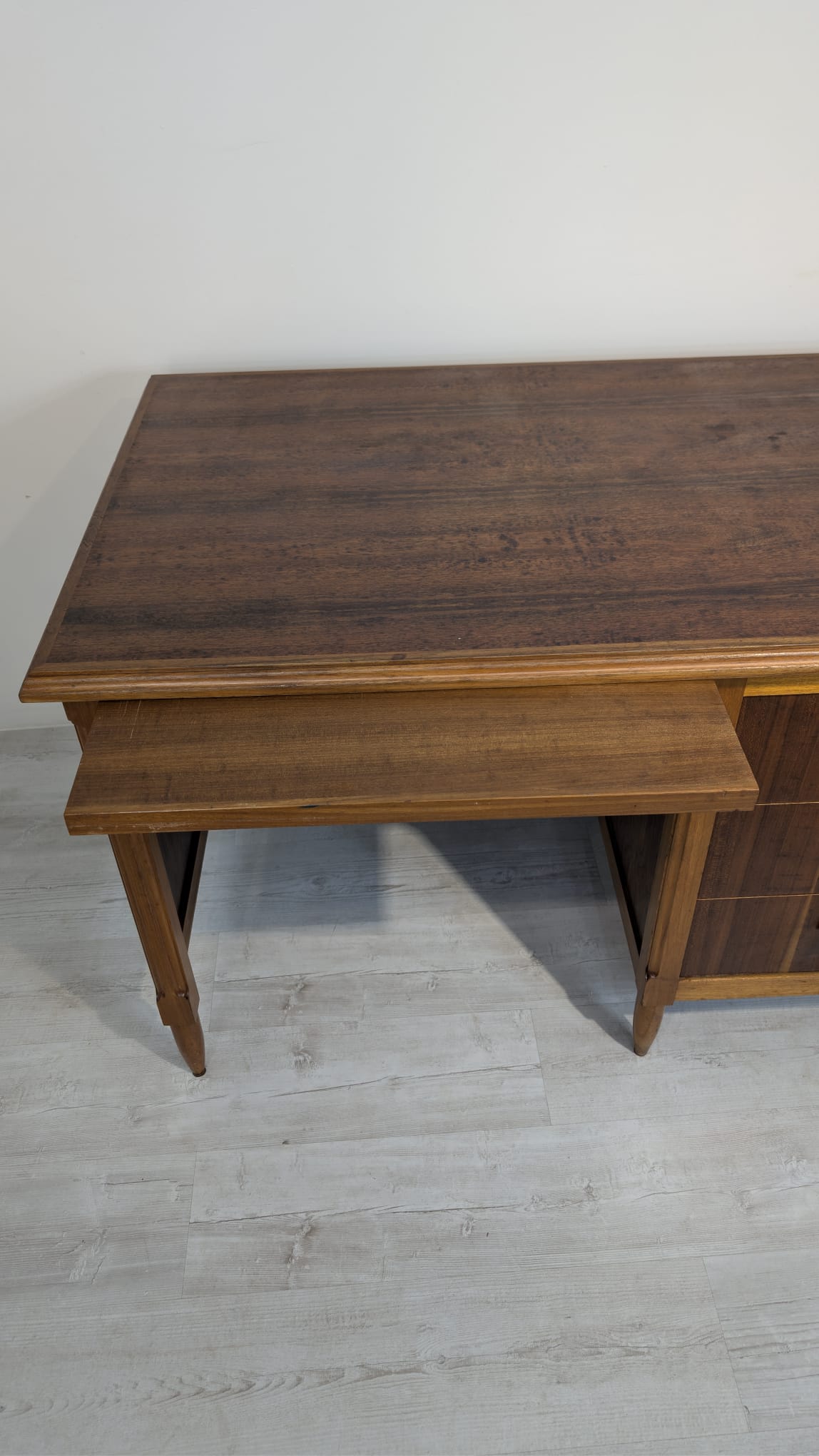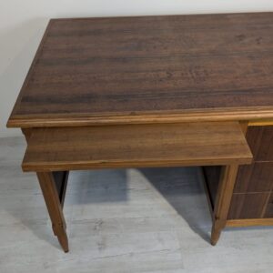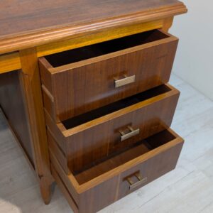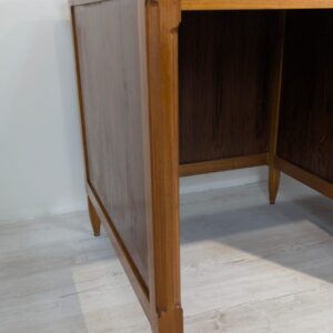 Solidny, drewniany, teak biurko z lat 60./70. Posiada trzy szuflad oraz wysuwany blat roboczy, które zapewniają dodatkową przestrzeń do przechowywania oraz funkcjonowania na większej powierzchni.