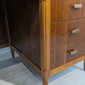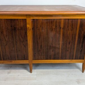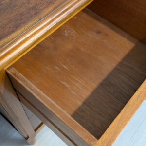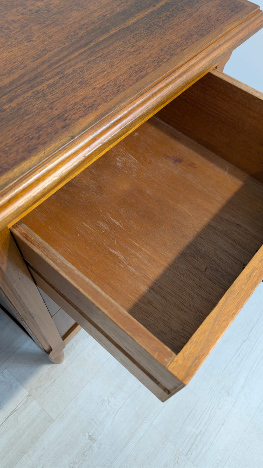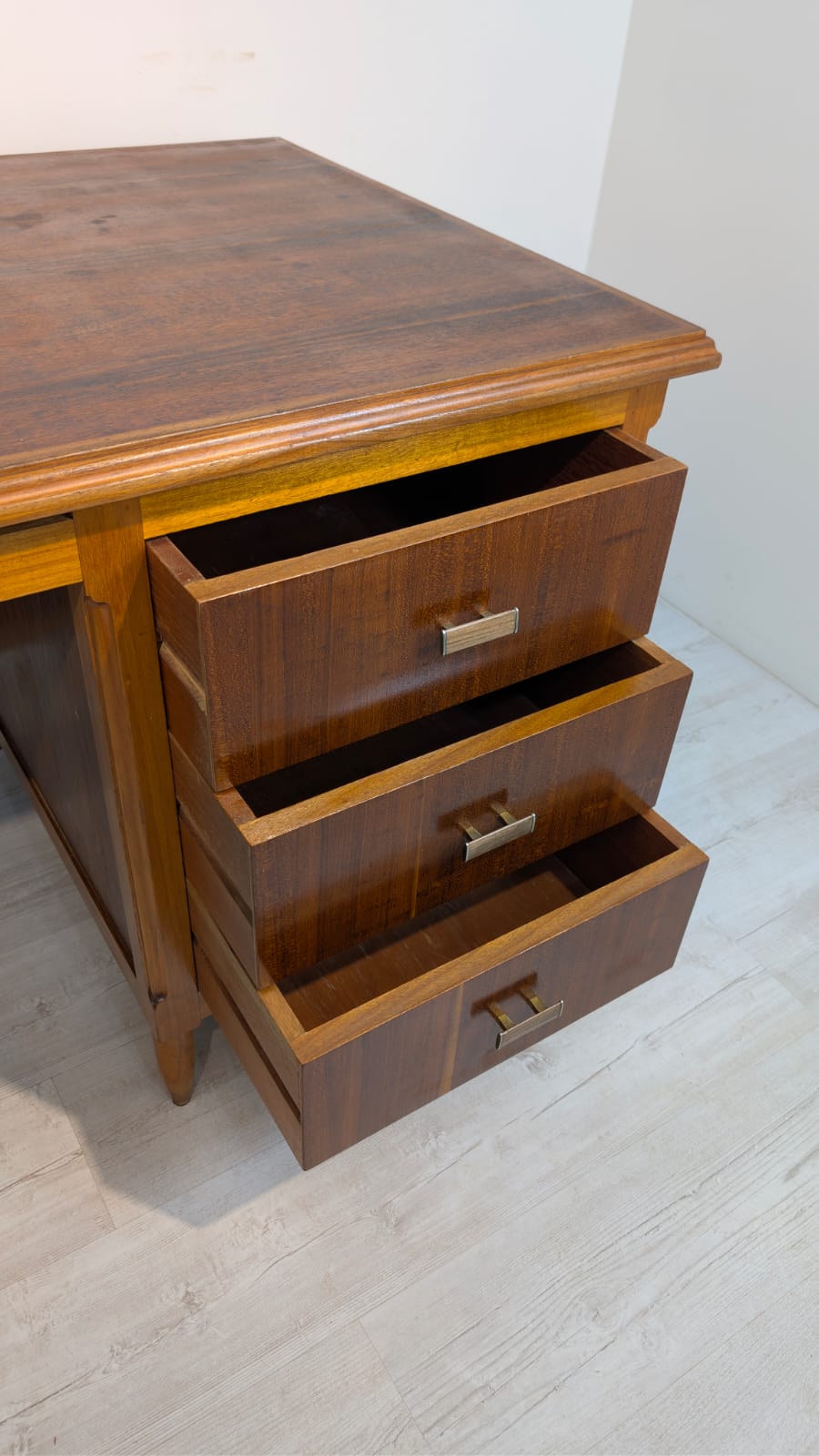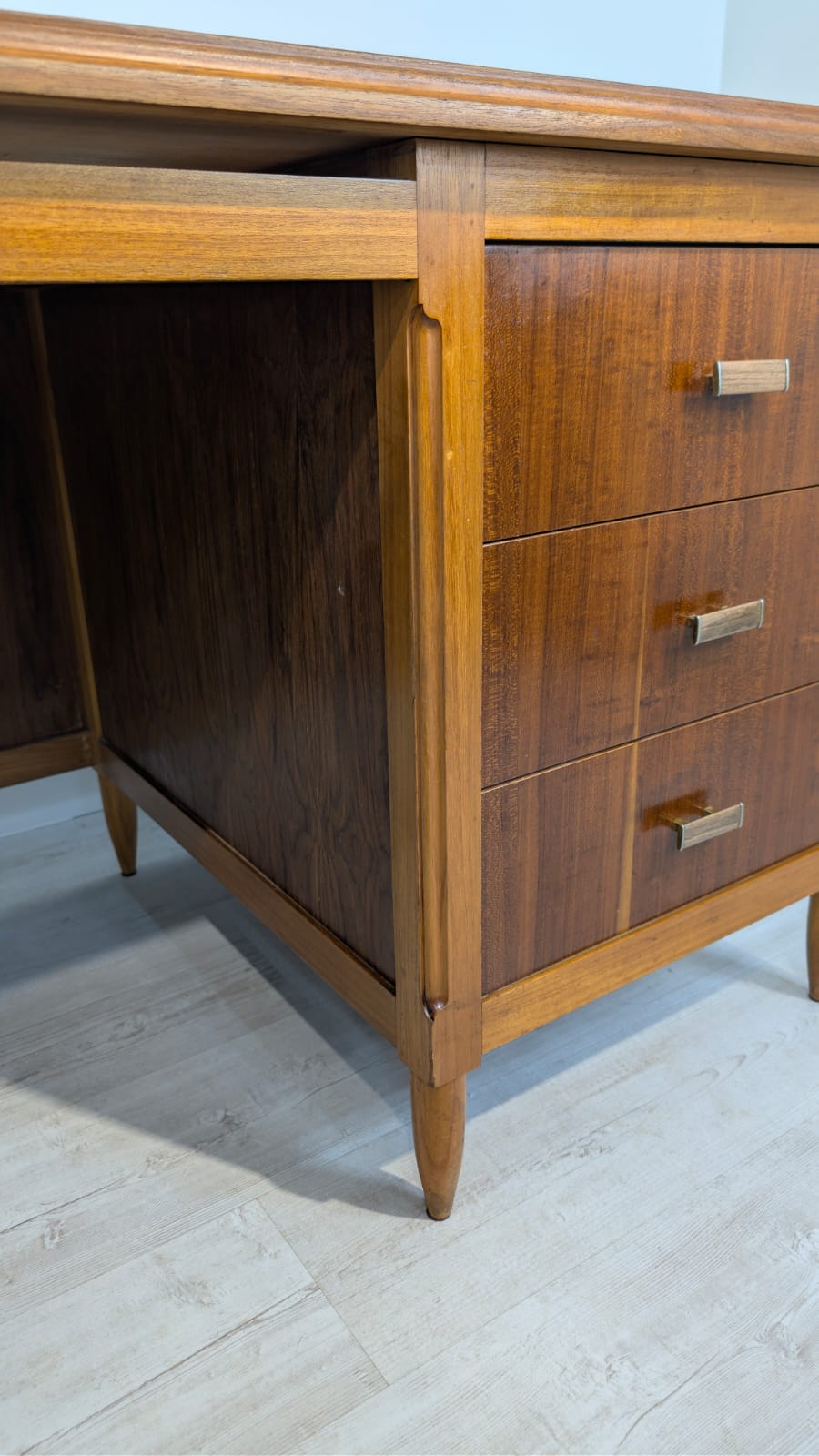 Solidny, drewniany, teak biurko z lat 60./70. Posiada trzy szuflad oraz wysuwany blat roboczy, które zapewniają dodatkową przestrzeń do przechowywania oraz funkcjonowania na większej powierzchni.