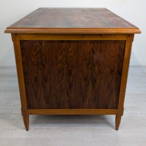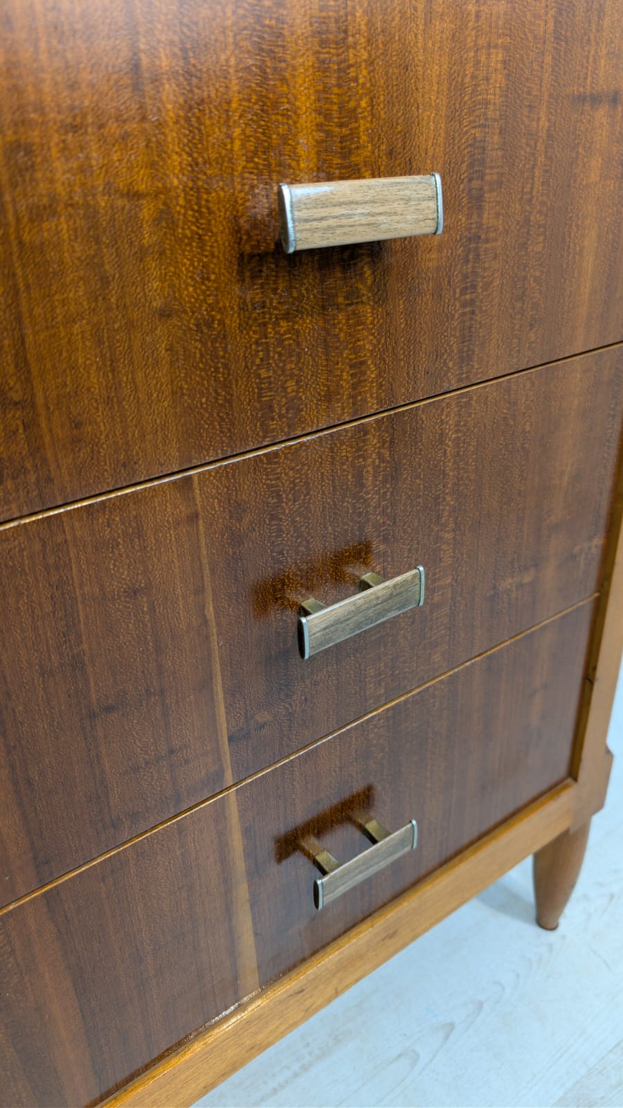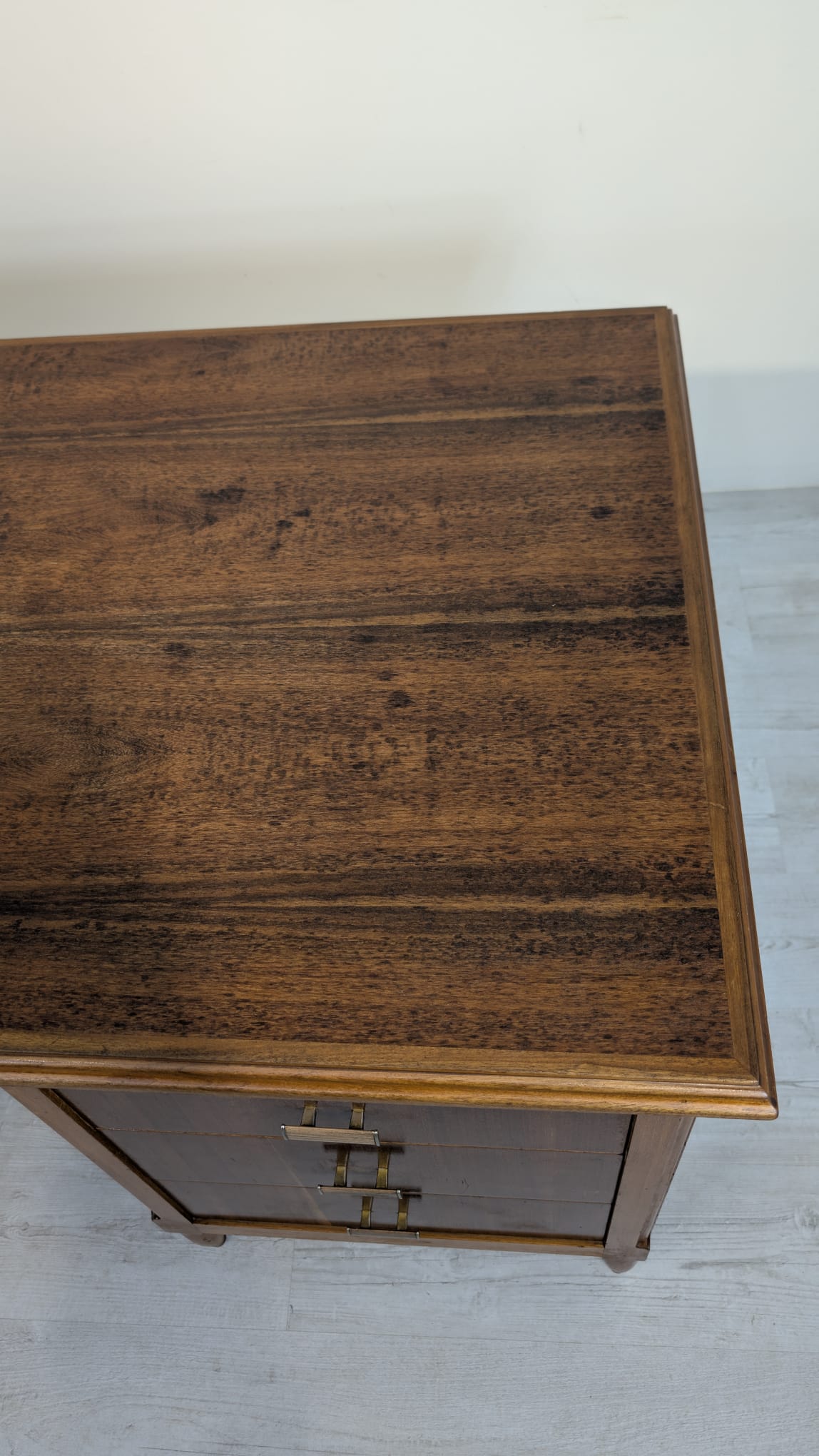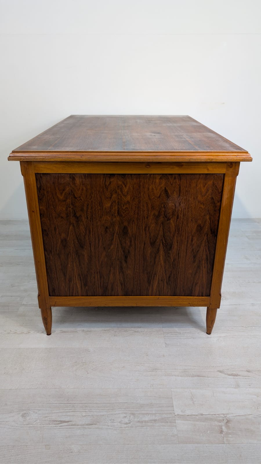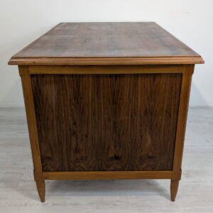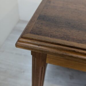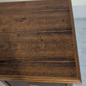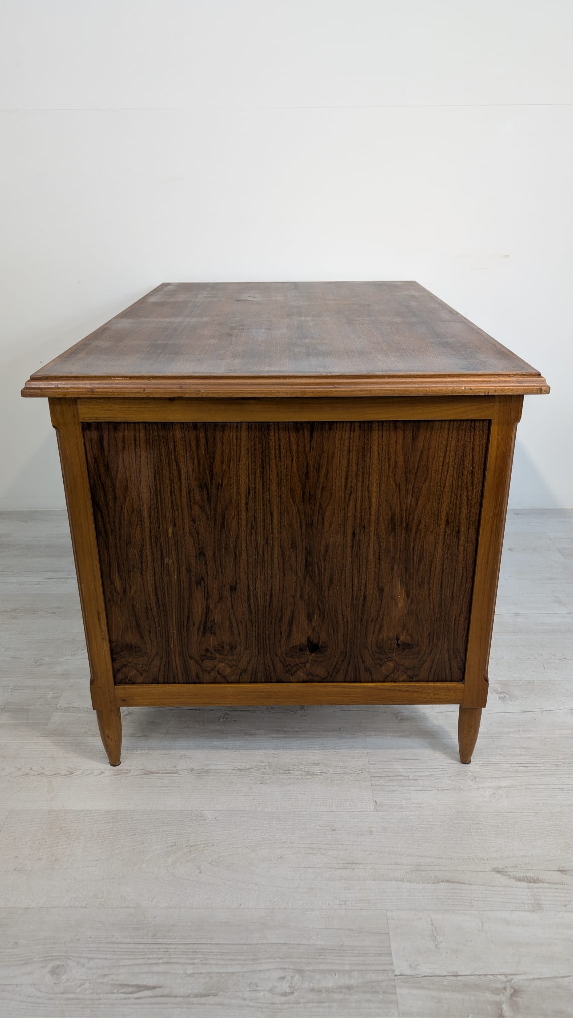 Solidny, drewniany, teak biurko z lat 60./70. Posiada trzy szuflad oraz wysuwany blat roboczy, które zapewniają dodatkową przestrzeń do przechowywania oraz funkcjonowania na większej powierzchni.