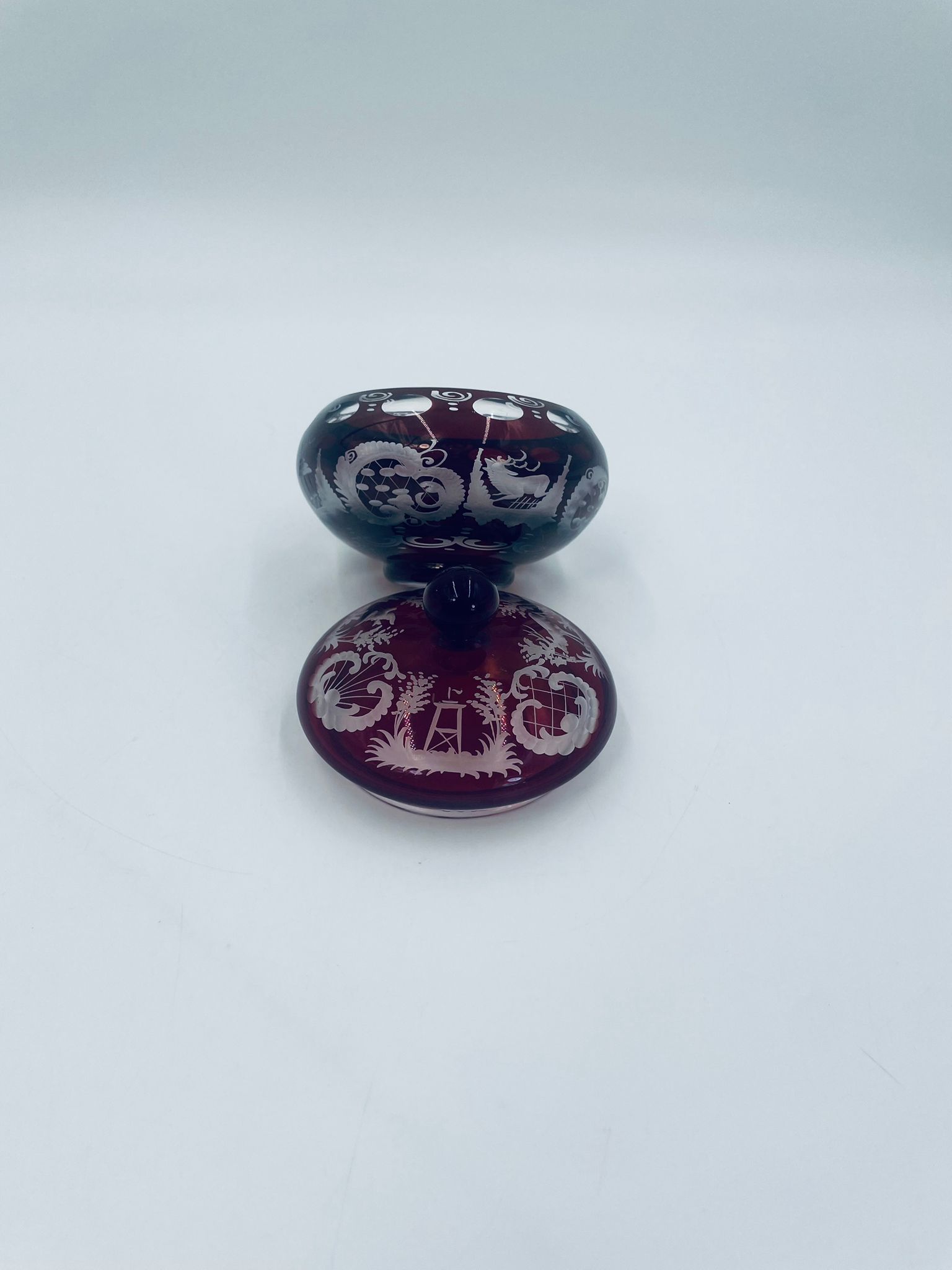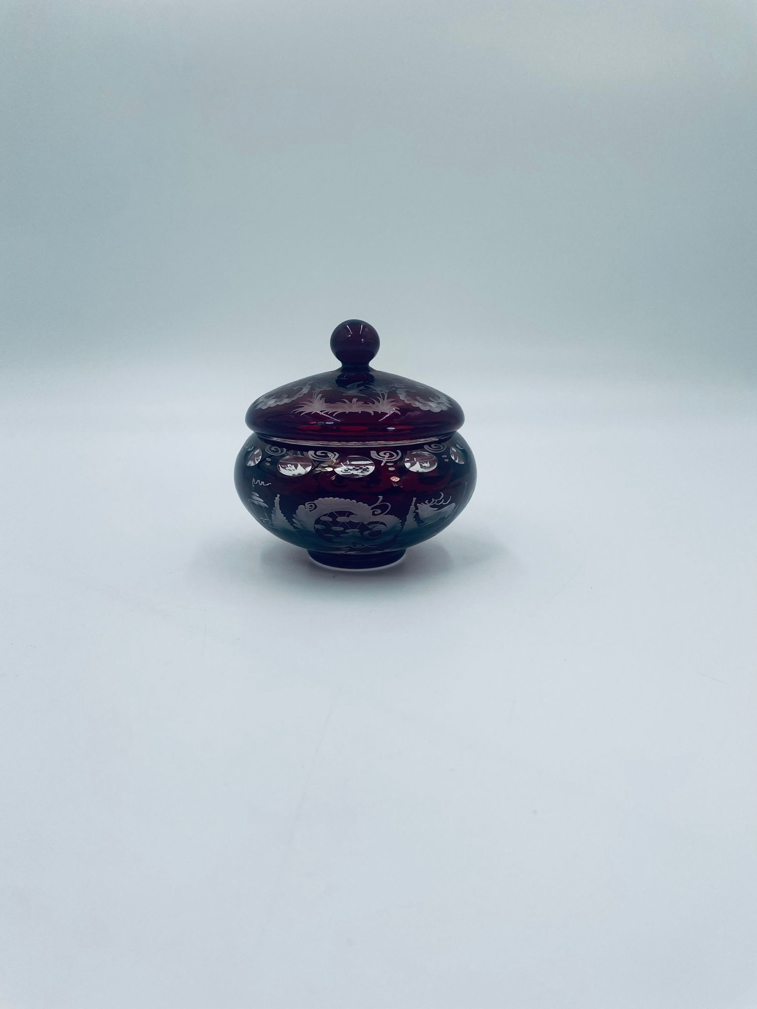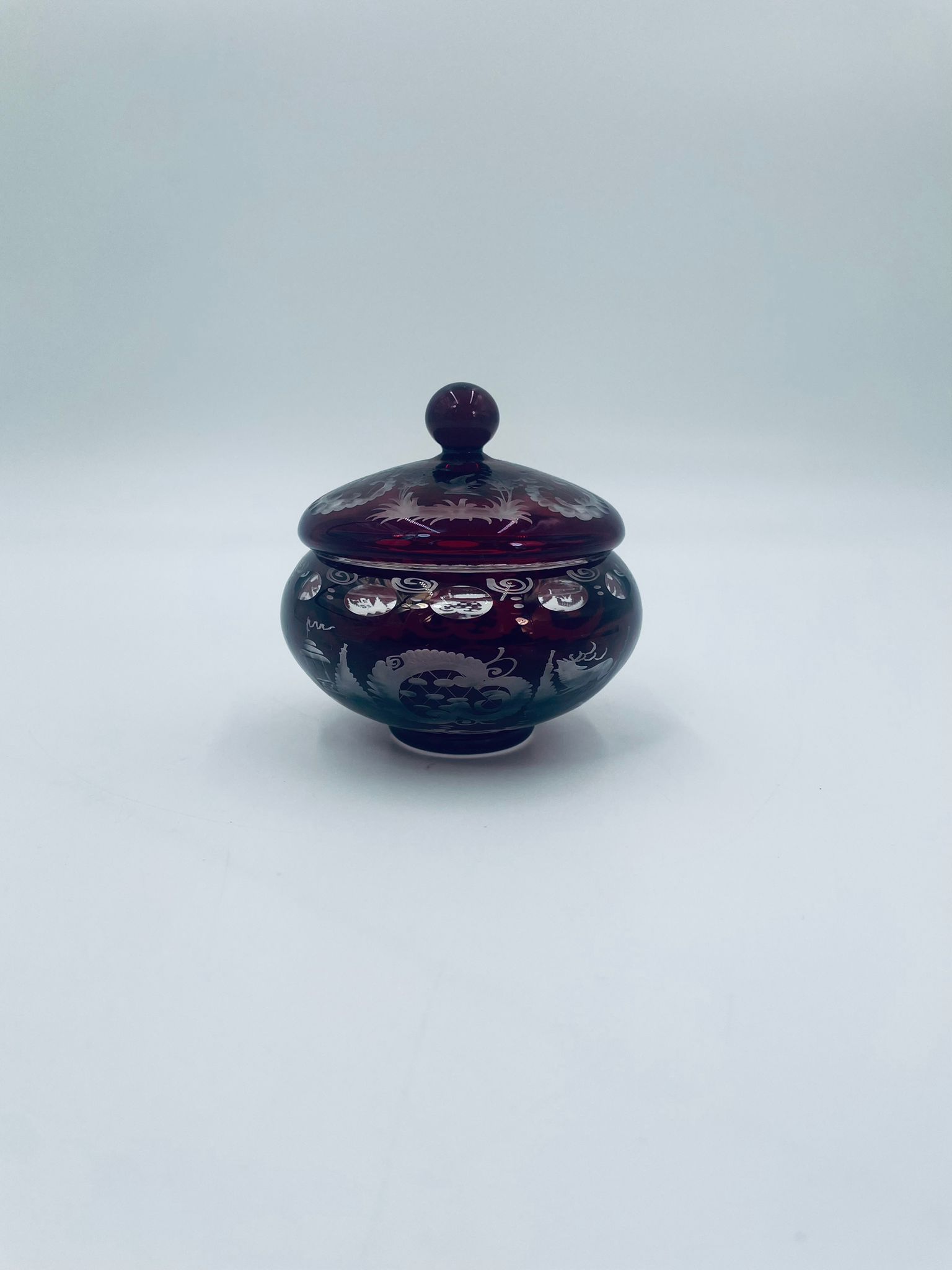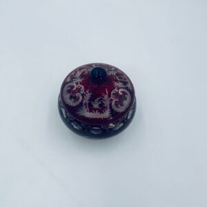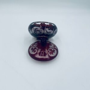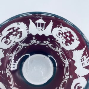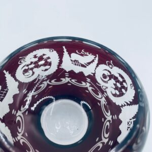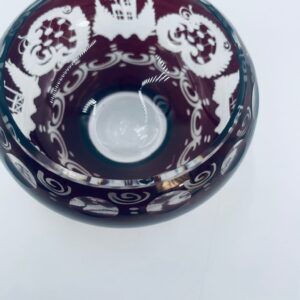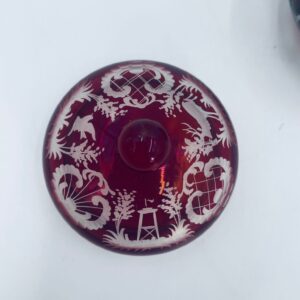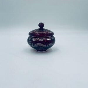 Zabytkowa Bombonierka, cukiernica wytwórni Egermann, wykonana z wysokiej jakości szkła kryształowego. Bombonierka w głęboko rubinowym kolorze, ozdobiona precyzyjnie ręcznym grawerowanym motywem orientalnym i myśliwskim. Posiada mały uszczerbek na górnym rancie.