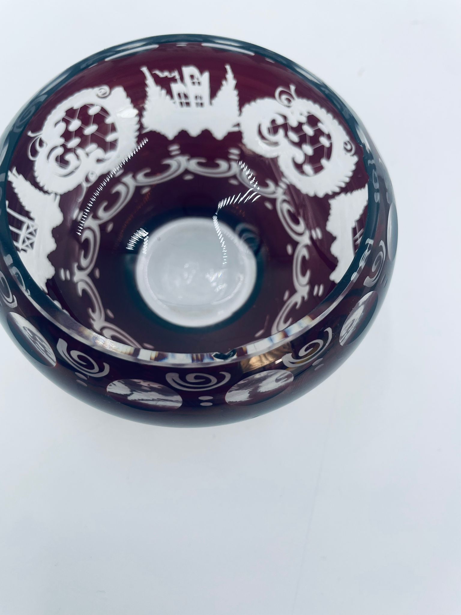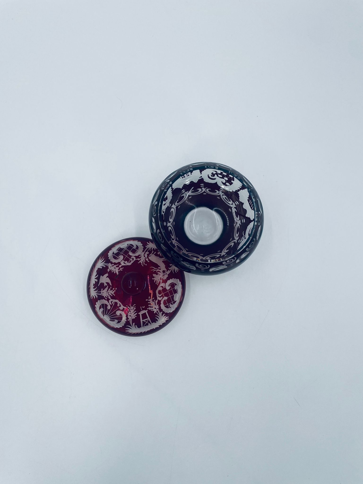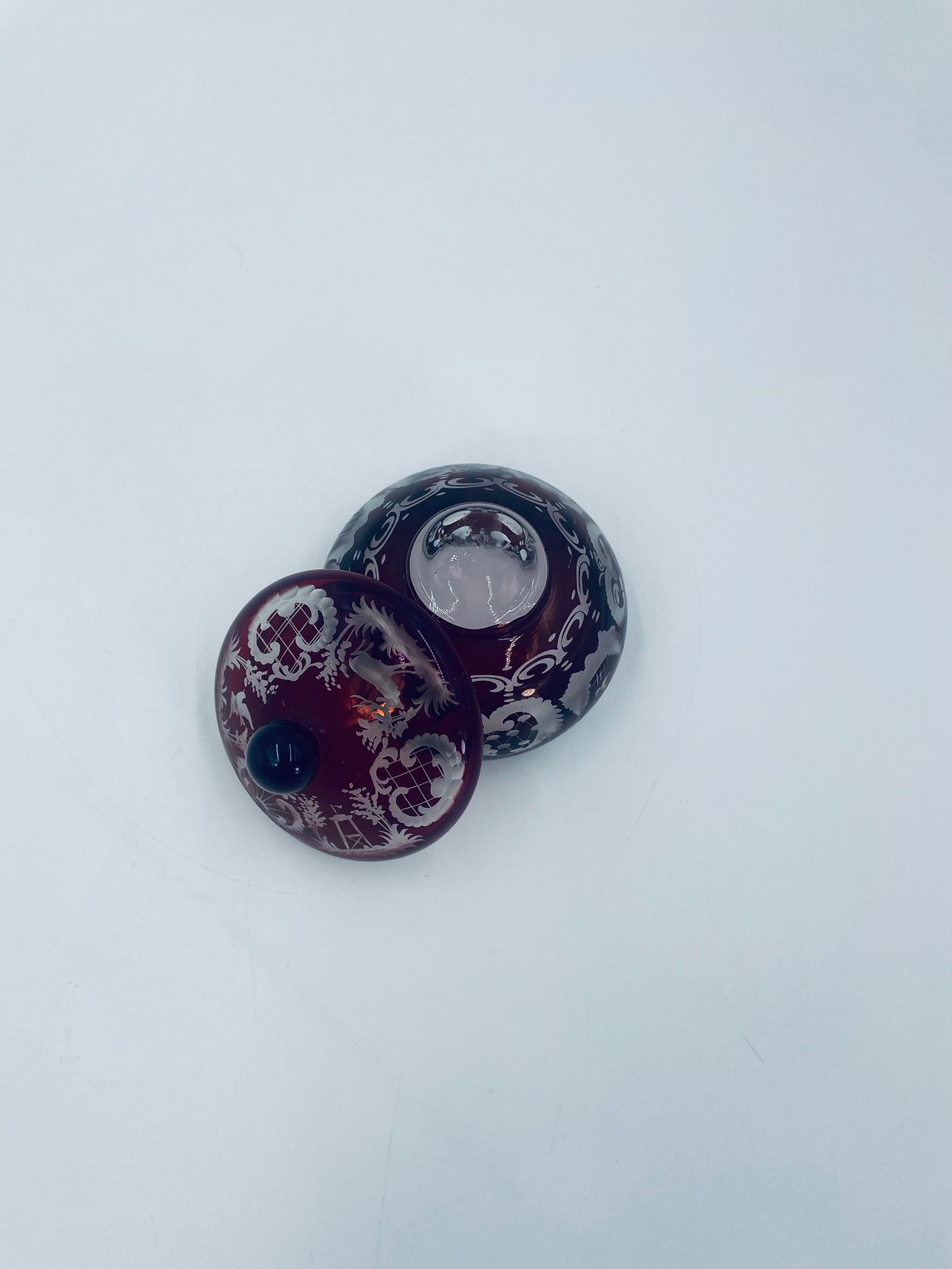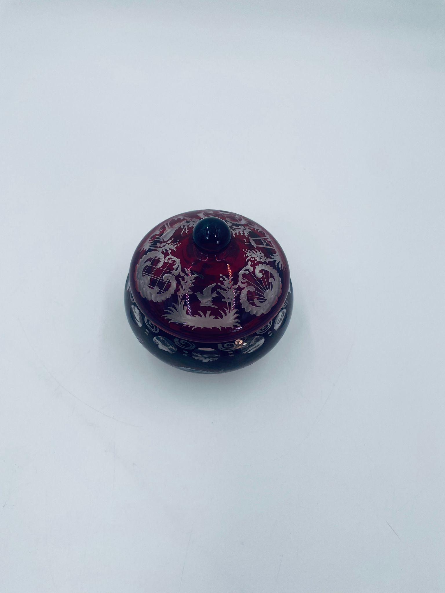 Zabytkowa Bombonierka, cukiernica wytwórni Egermann, wykonana z wysokiej jakości szkła kryształowego. Bombonierka w głęboko rubinowym kolorze, ozdobiona precyzyjnie ręcznym grawerowanym motywem orientalnym i myśliwskim. Posiada mały uszczerbek na górnym rancie.