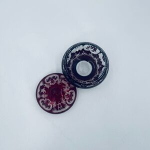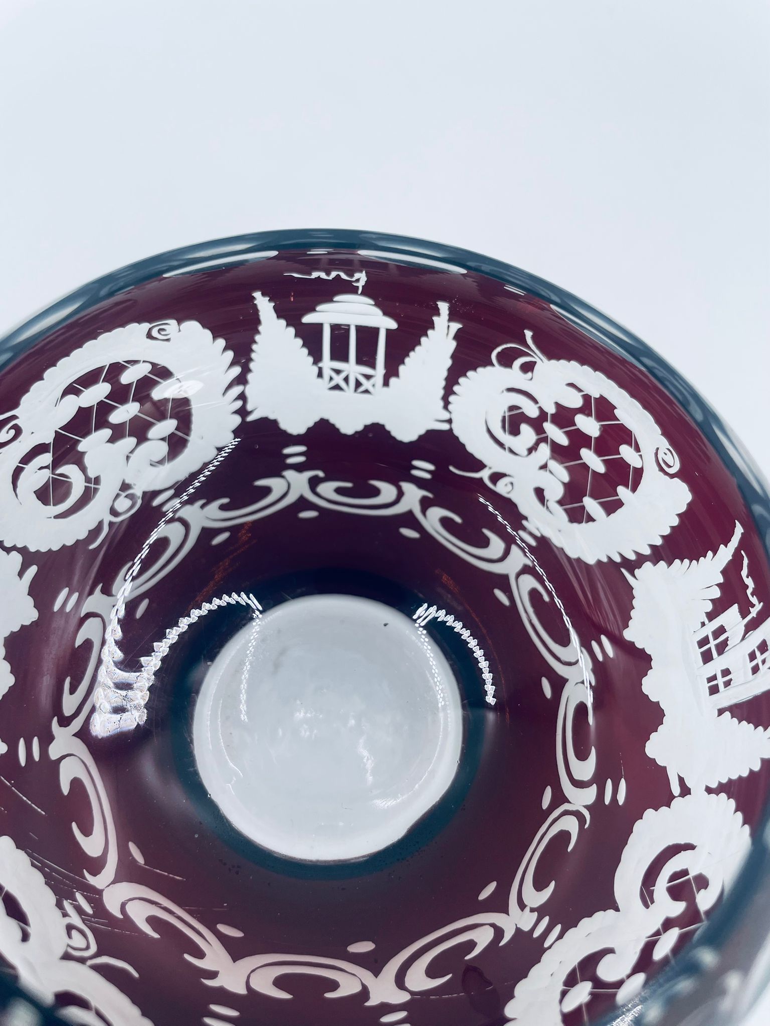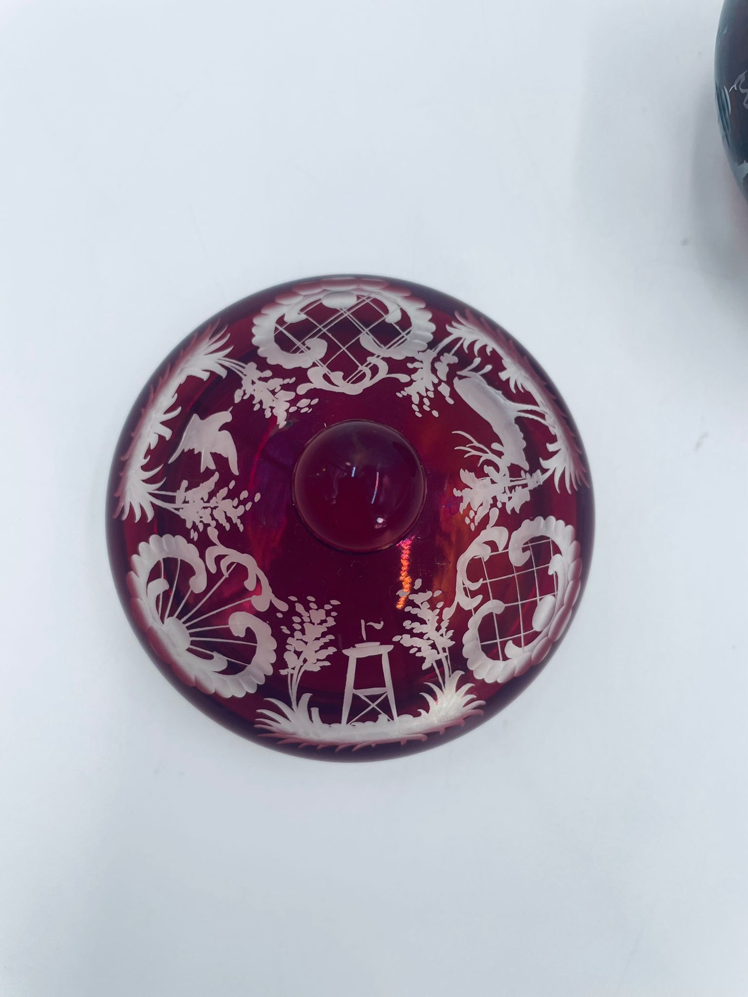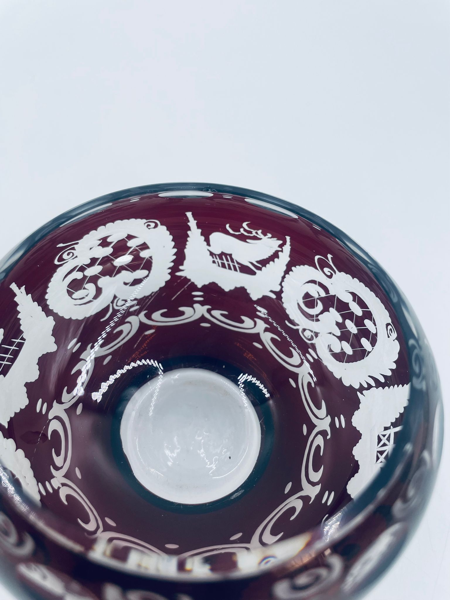 Zabytkowa Bombonierka, cukiernica wytwórni Egermann, wykonana z wysokiej jakości szkła kryształowego. Bombonierka w głęboko rubinowym kolorze, ozdobiona precyzyjnie ręcznym grawerowanym motywem orientalnym i myśliwskim. Posiada mały uszczerbek na górnym rancie.