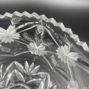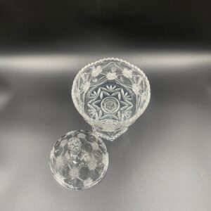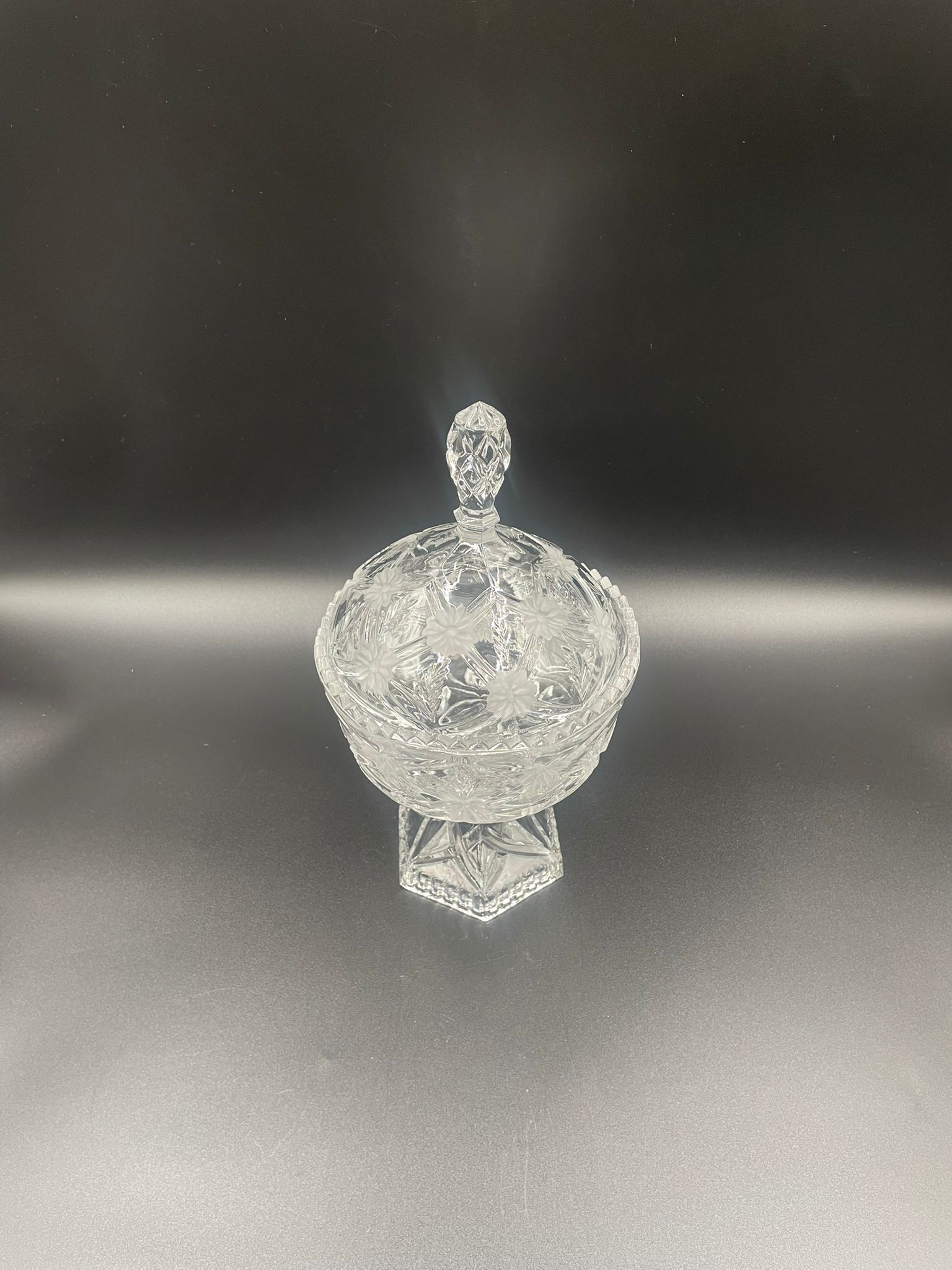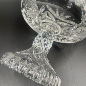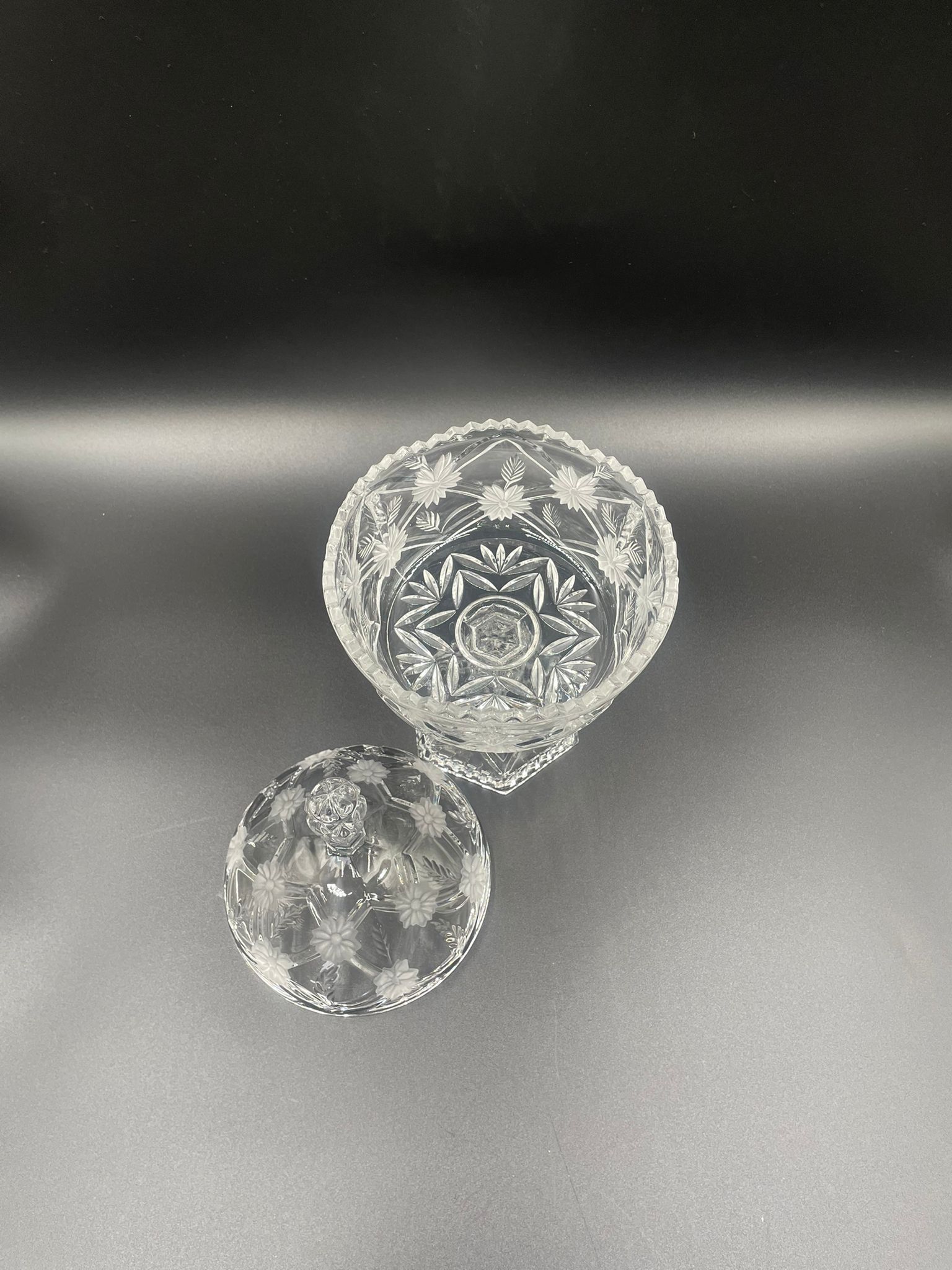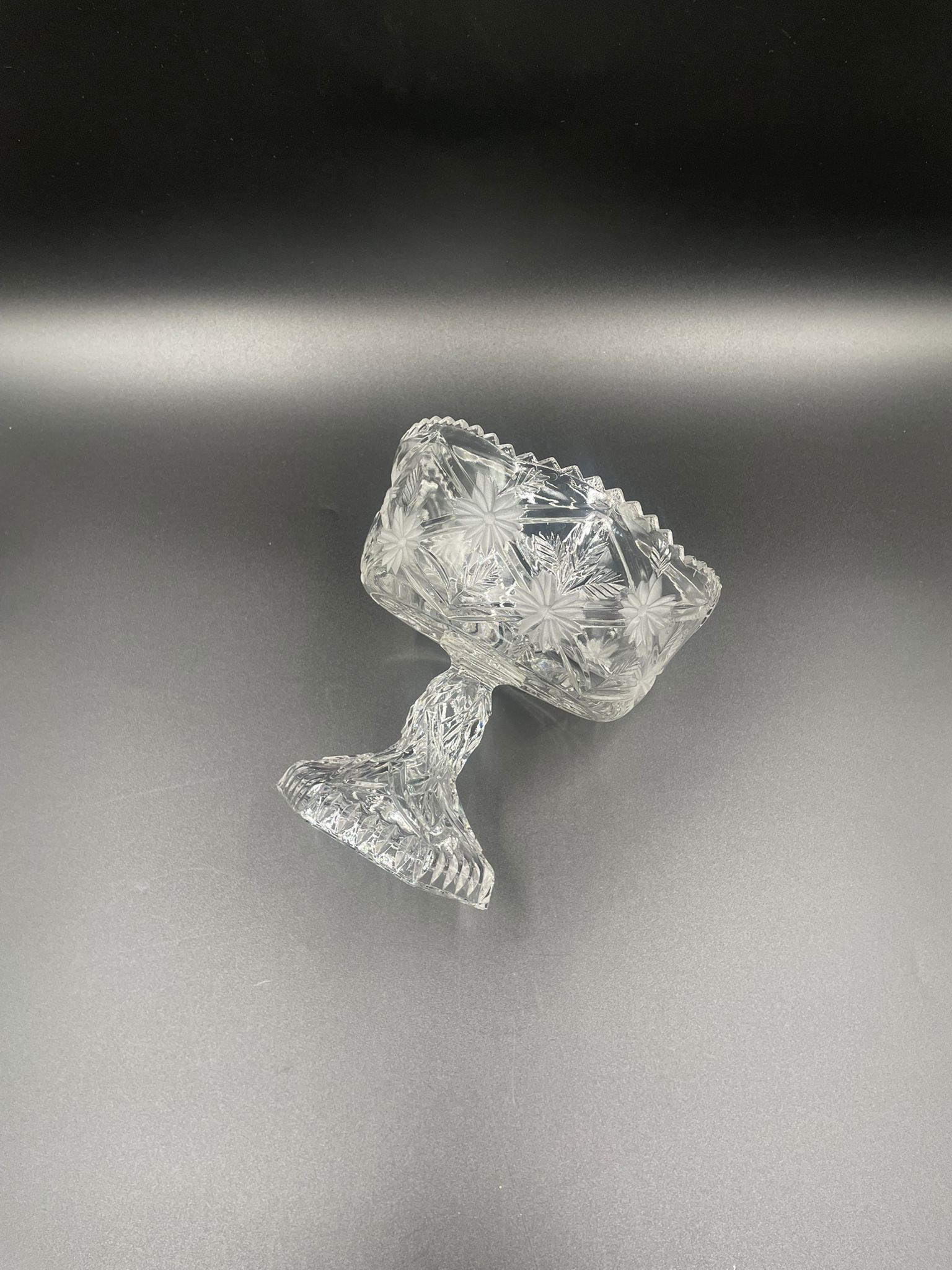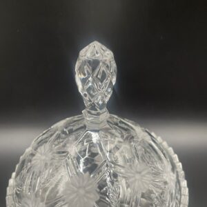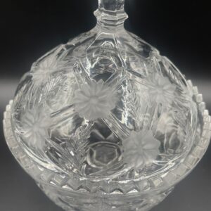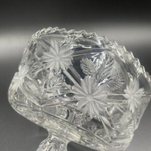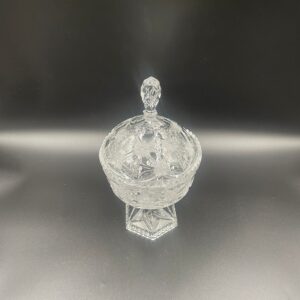 Zabytkowa bombonierka wytworni Anna Hutte Bleikristal, wykonana z wysokiej jakości ciężkiego szkła kryształowego. Bombonierka osadzona na ozdobnej, sześciokątnej podstawie, posiada ząbkowaną górną krawędź, ozdobiona ręcznie szlifowanymi, misternymi wzorami, oraz wytrawionym wzorem stokrotek. Bombonierka posiada pokrywę z ozdobnym uchwytem. Posiada mały uszczerbek w środku.