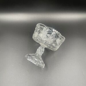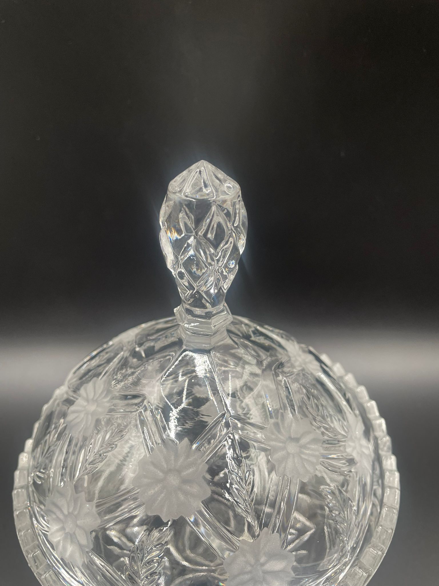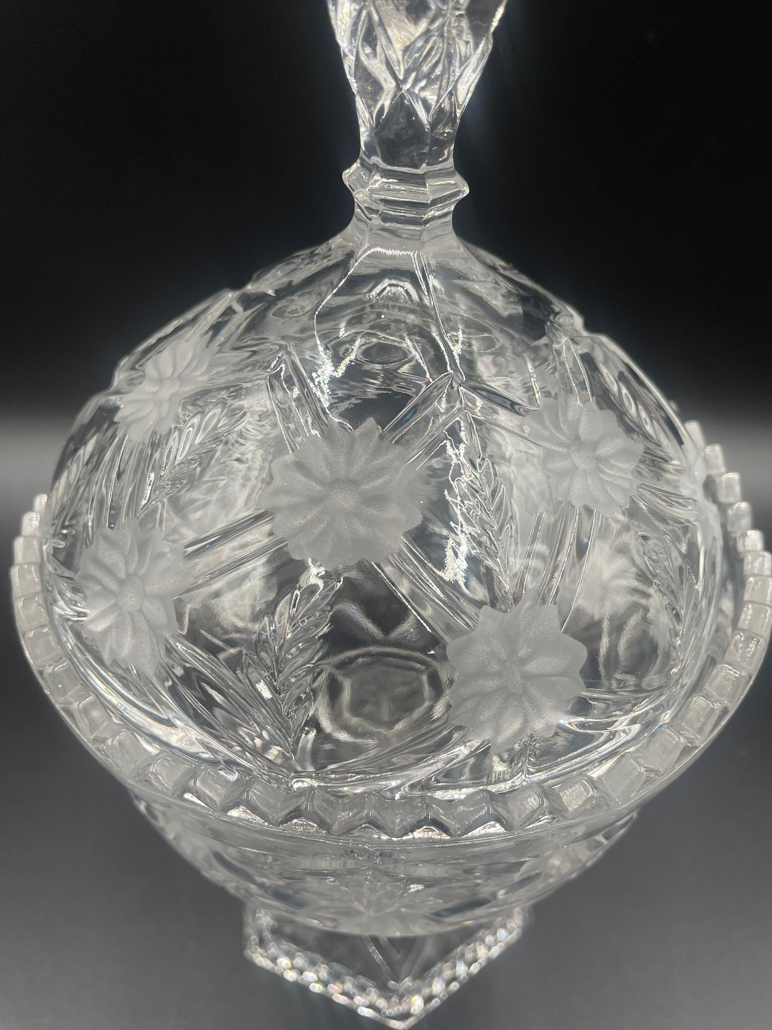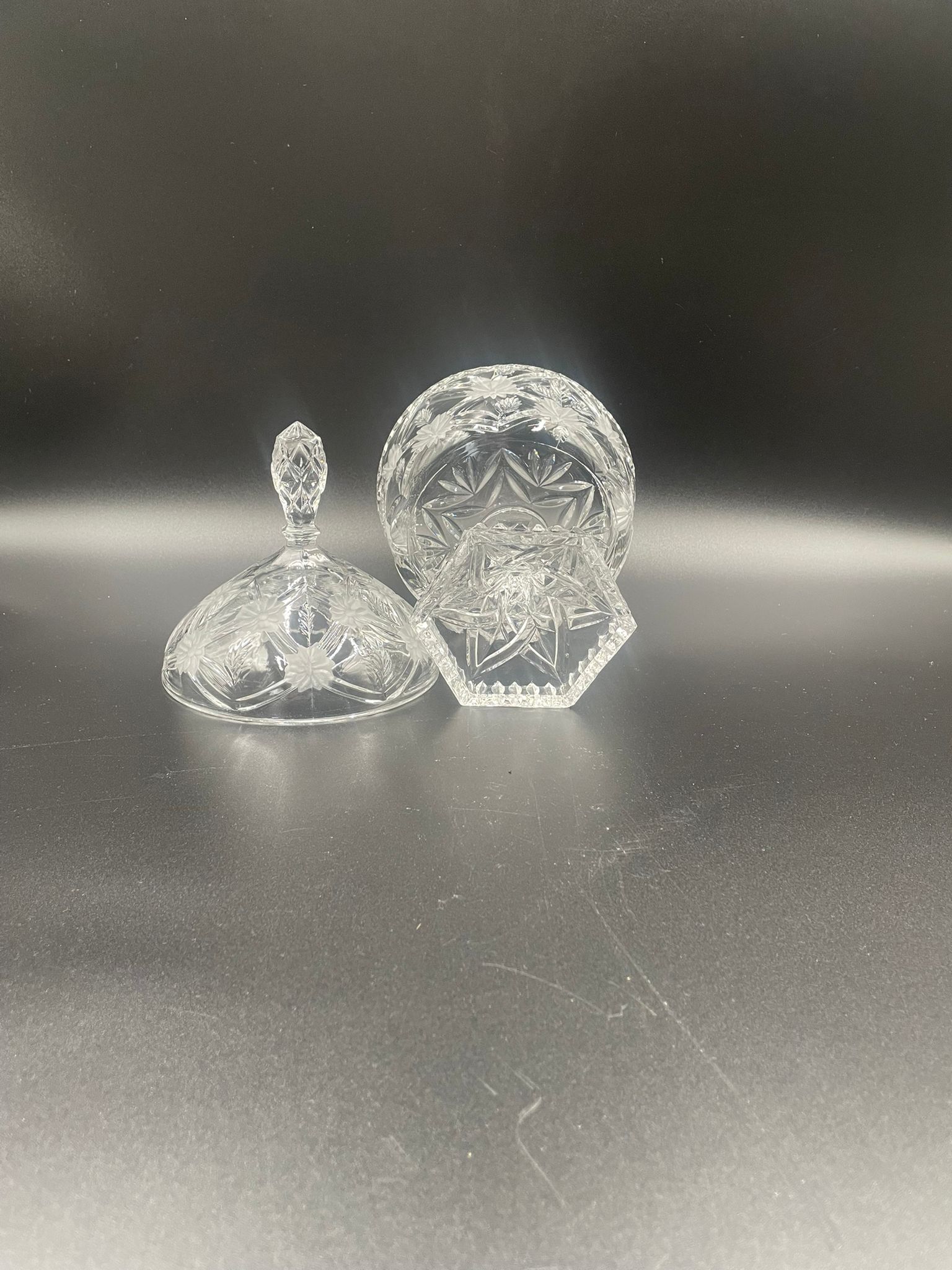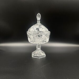 Zabytkowa bombonierka wytworni Anna Hutte Bleikristal, wykonana z wysokiej jakości ciężkiego szkła kryształowego. Bombonierka osadzona na ozdobnej, sześciokątnej podstawie, posiada ząbkowaną górną krawędź, ozdobiona ręcznie szlifowanymi, misternymi wzorami, oraz wytrawionym wzorem stokrotek. Bombonierka posiada pokrywę z ozdobnym uchwytem. Posiada mały uszczerbek w środku.