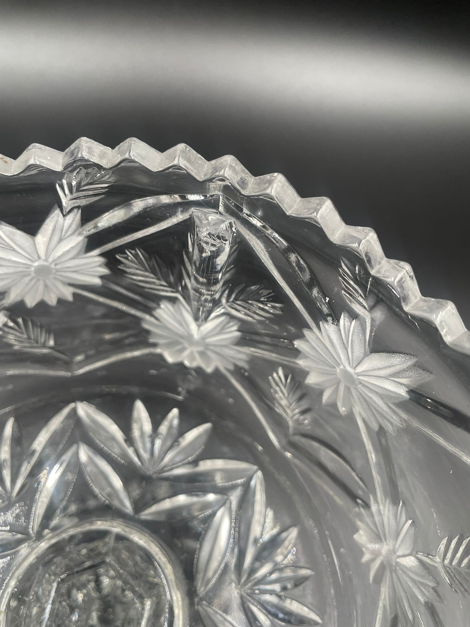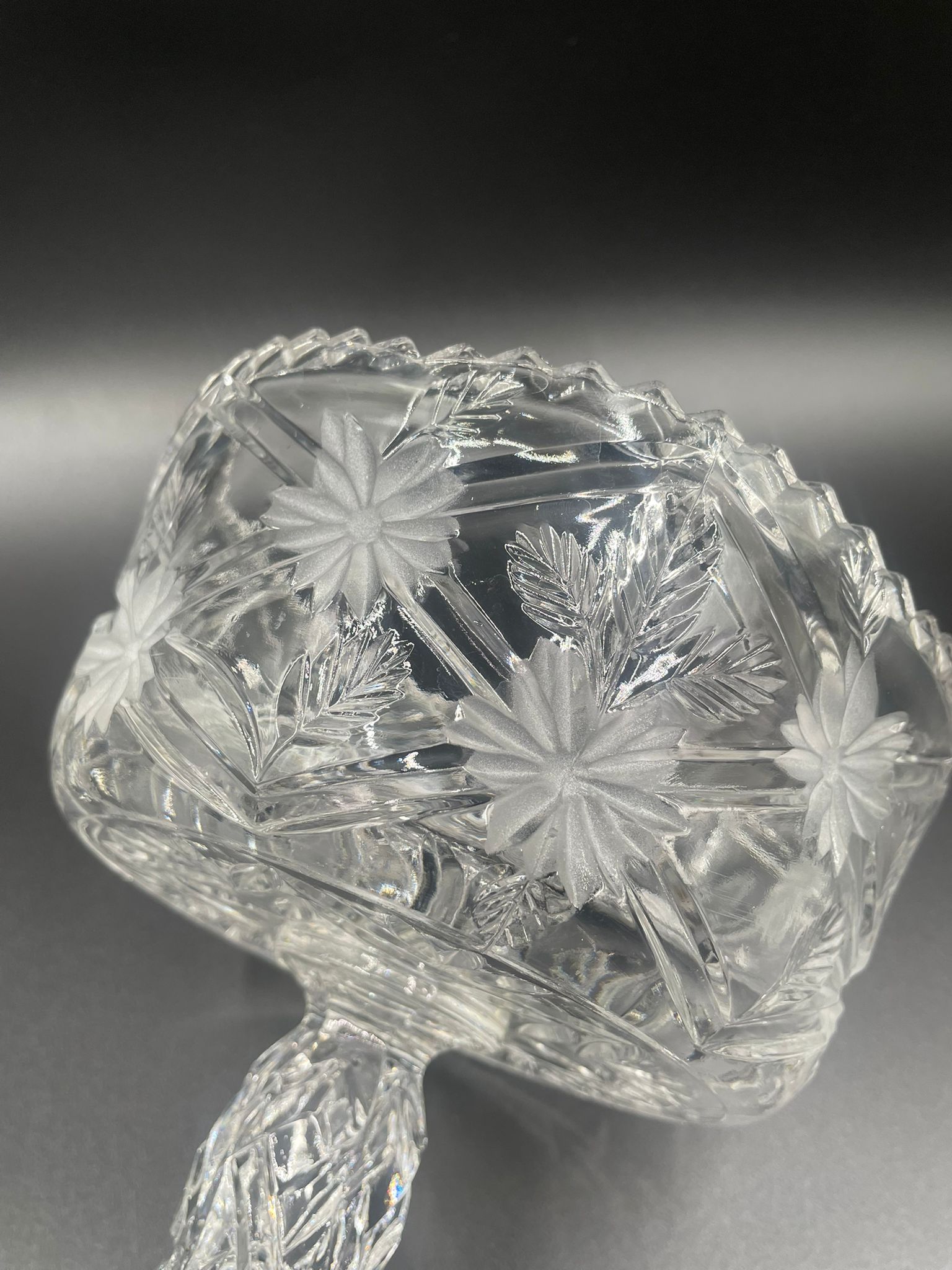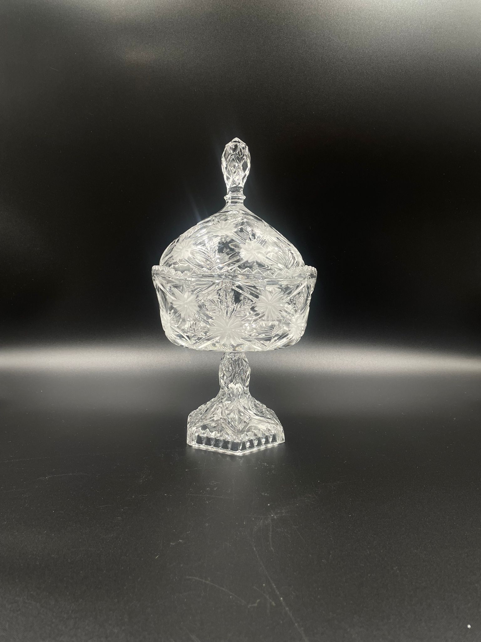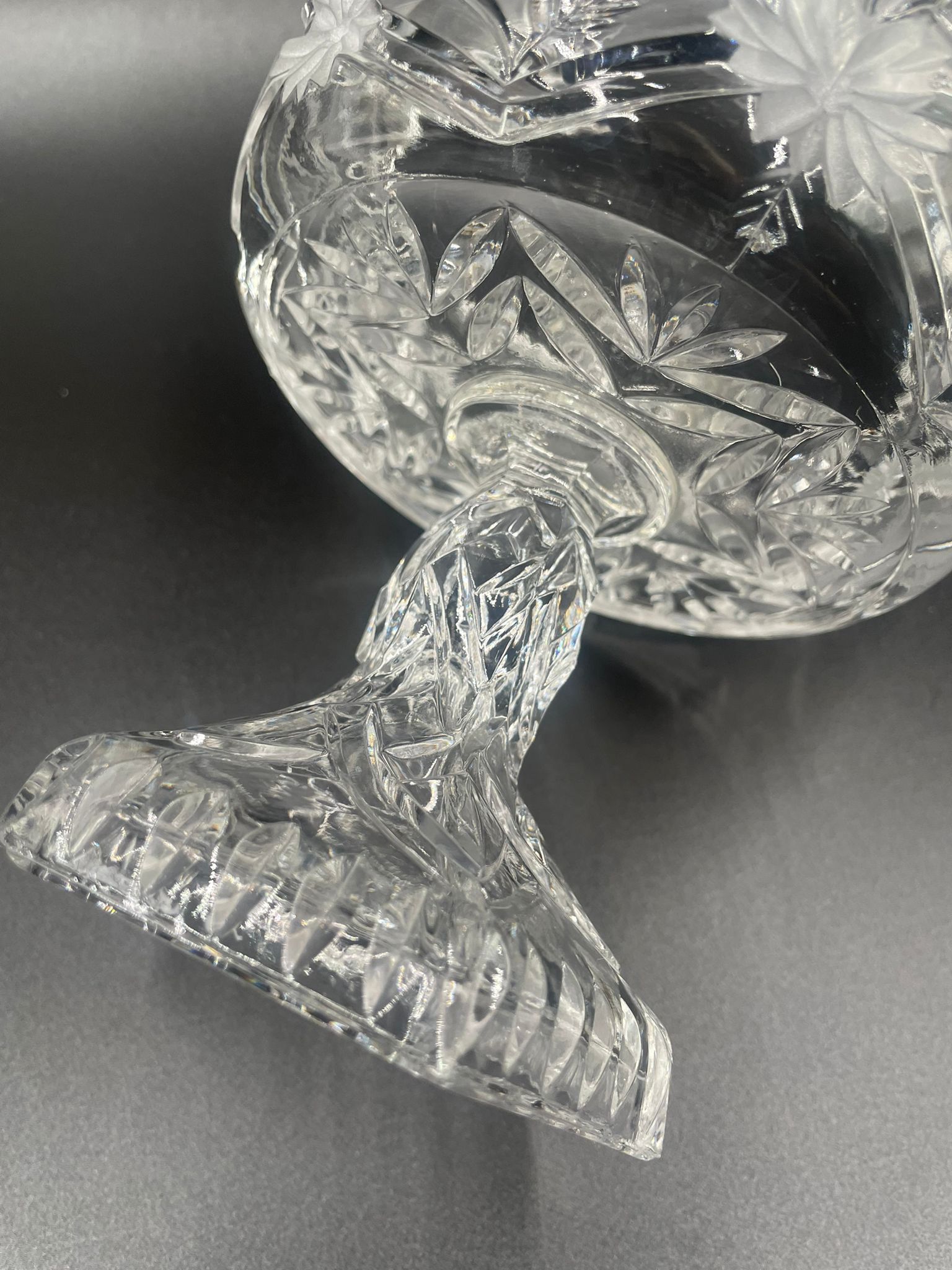 Zabytkowa bombonierka wytworni Anna Hutte Bleikristal, wykonana z wysokiej jakości ciężkiego szkła kryształowego. Bombonierka osadzona na ozdobnej, sześciokątnej podstawie, posiada ząbkowaną górną krawędź, ozdobiona ręcznie szlifowanymi, misternymi wzorami, oraz wytrawionym wzorem stokrotek. Bombonierka posiada pokrywę z ozdobnym uchwytem. Posiada mały uszczerbek w środku.