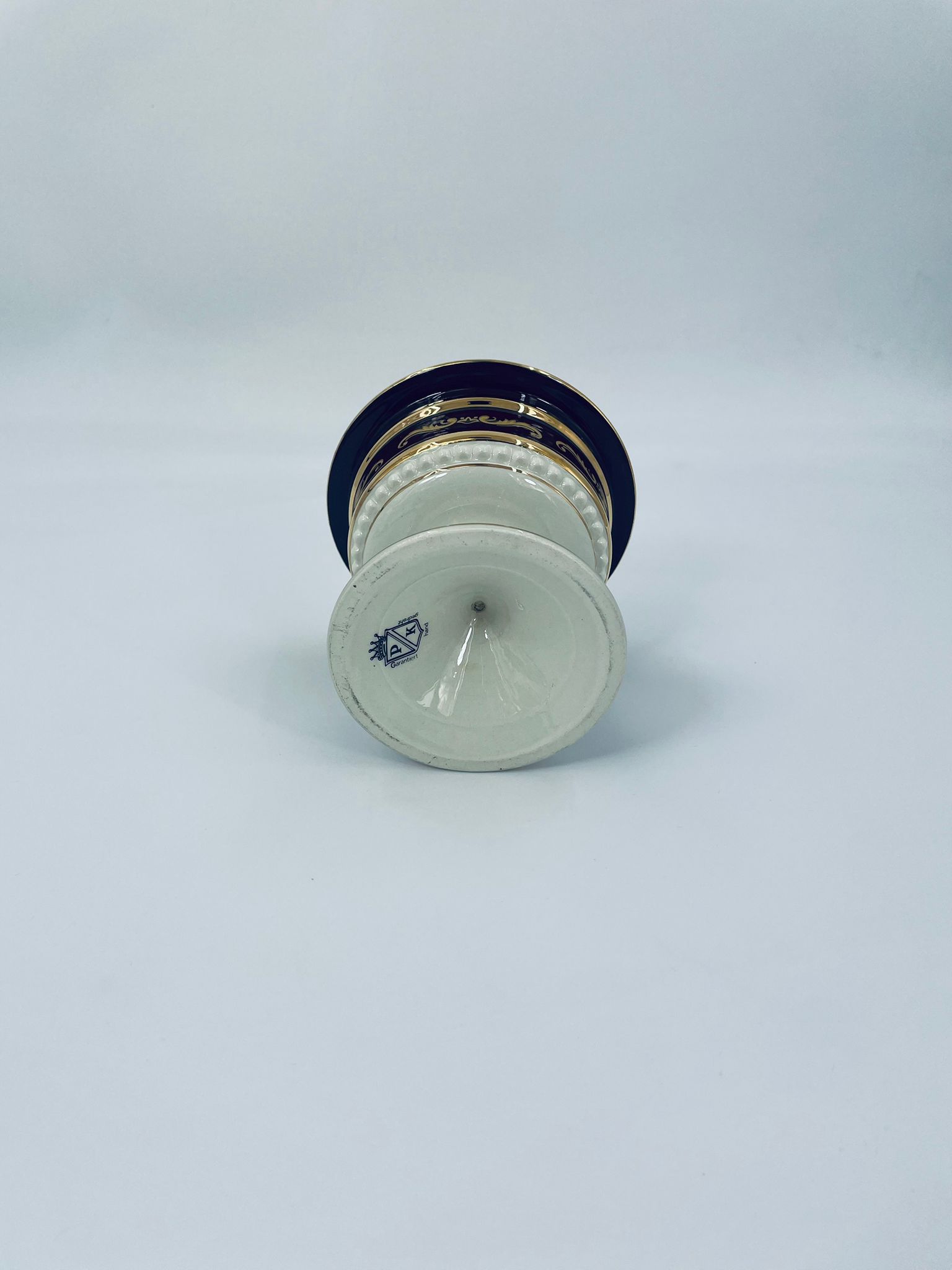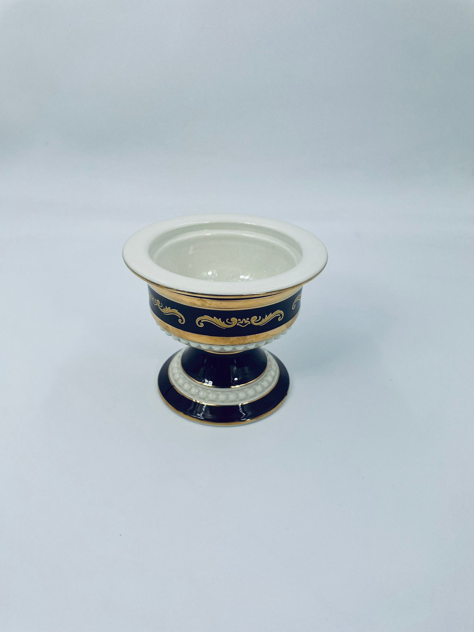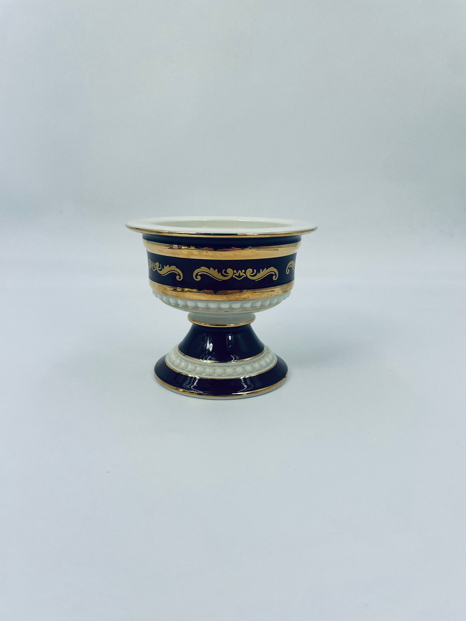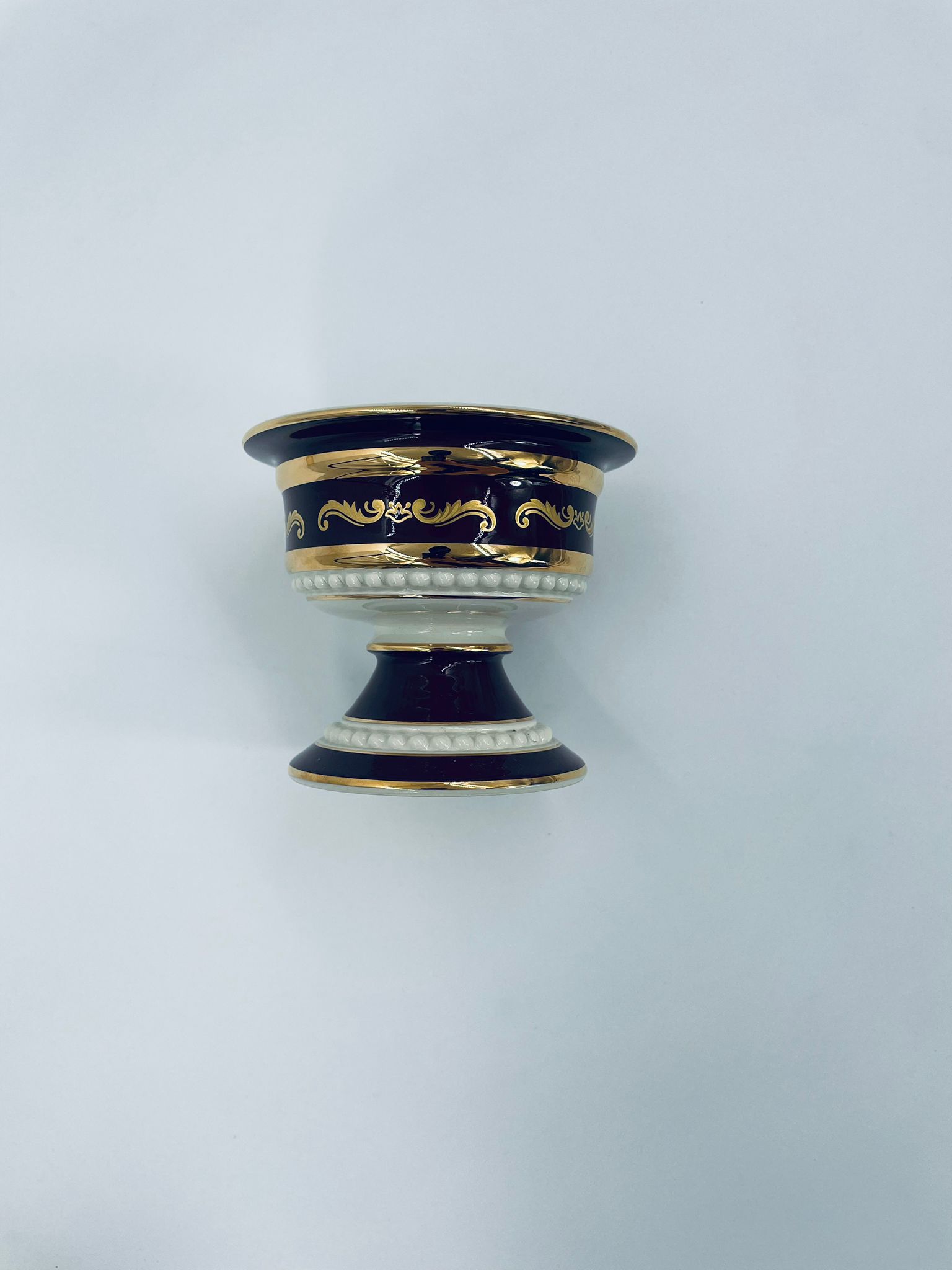 Bombonierka na nóżce autorstwa Klausa Cutika z Kups PK Korona, wykonana z porcelany, zdobiona bogatymi motywami złotymi na burgundowym tle. Bombonierka wykończona złoceniami na rantach.