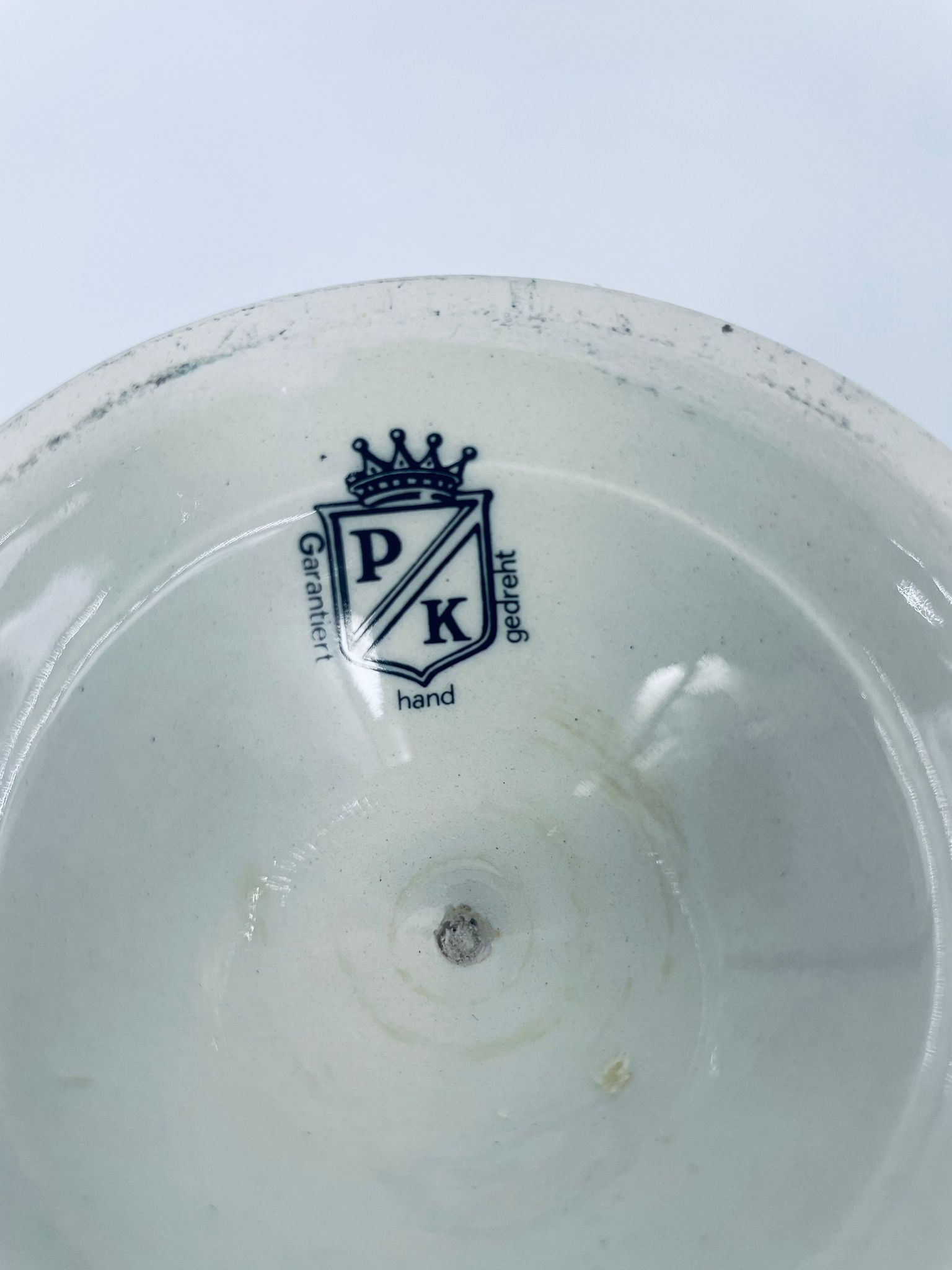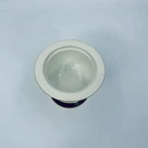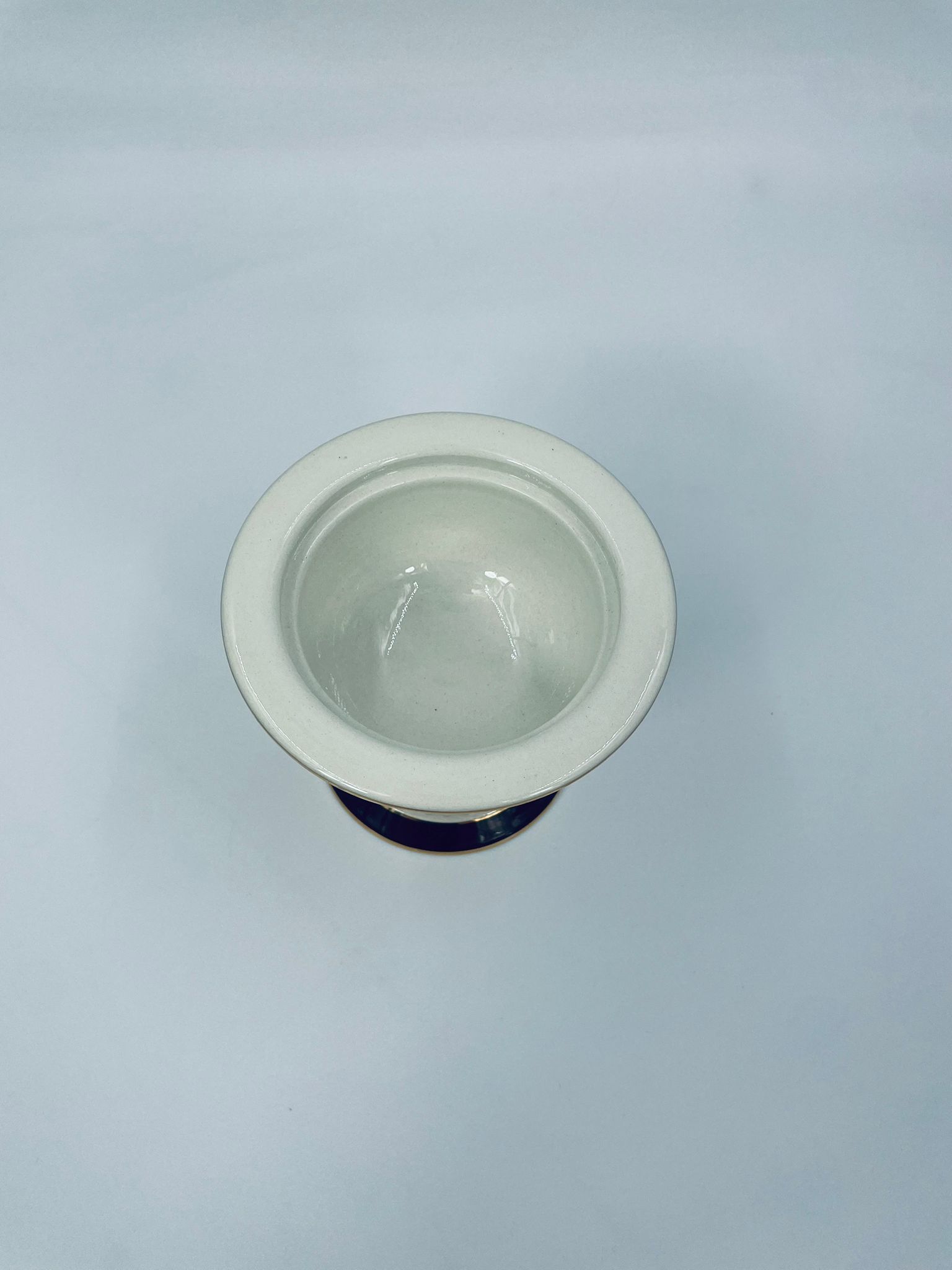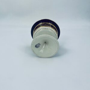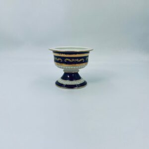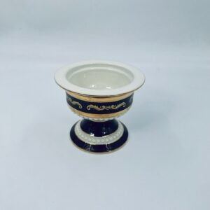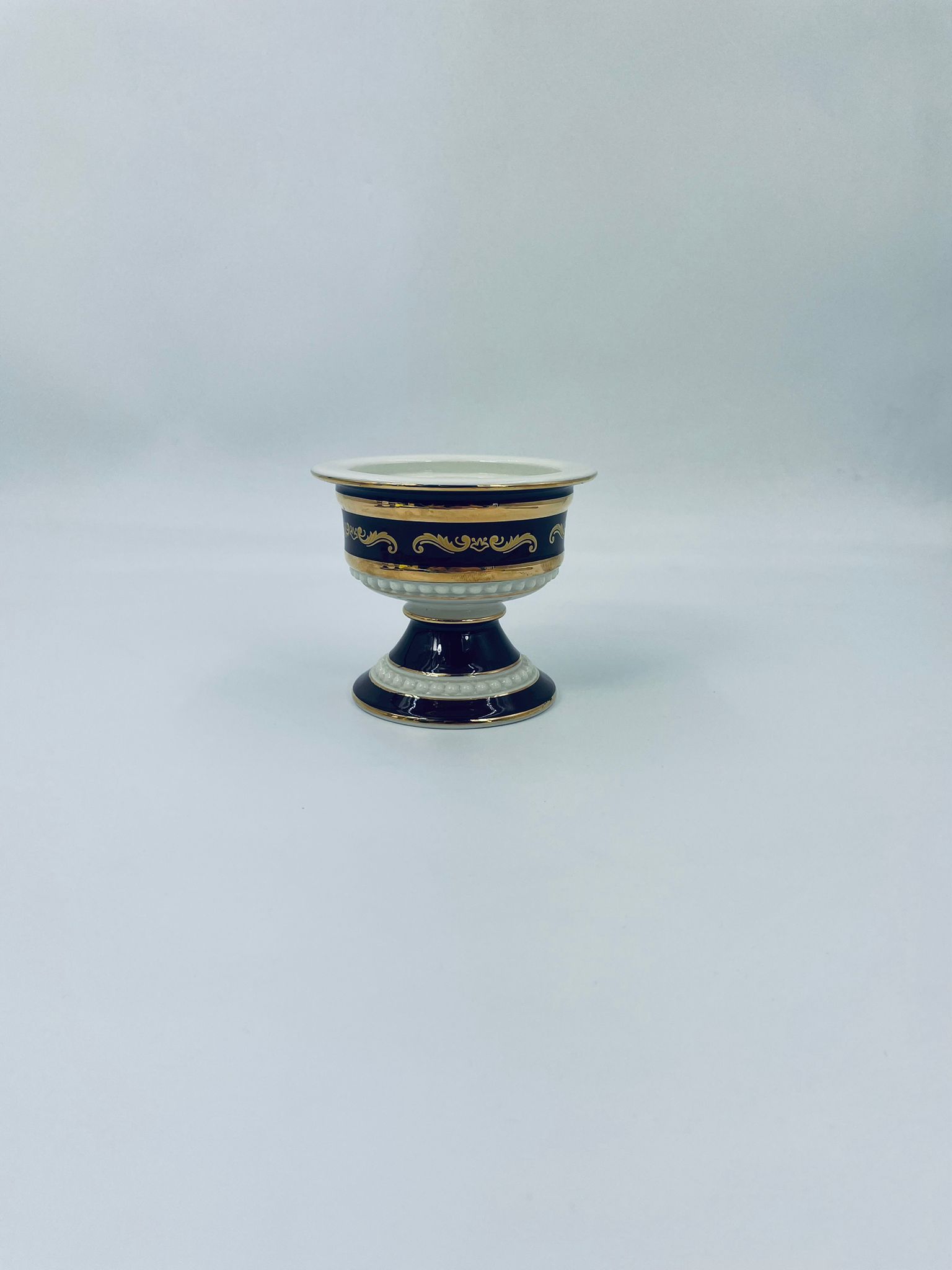 Bombonierka na nóżce autorstwa Klausa Cutika z Kups PK Korona, wykonana z porcelany, zdobiona bogatymi motywami złotymi na burgundowym tle. Bombonierka wykończona złoceniami na rantach.