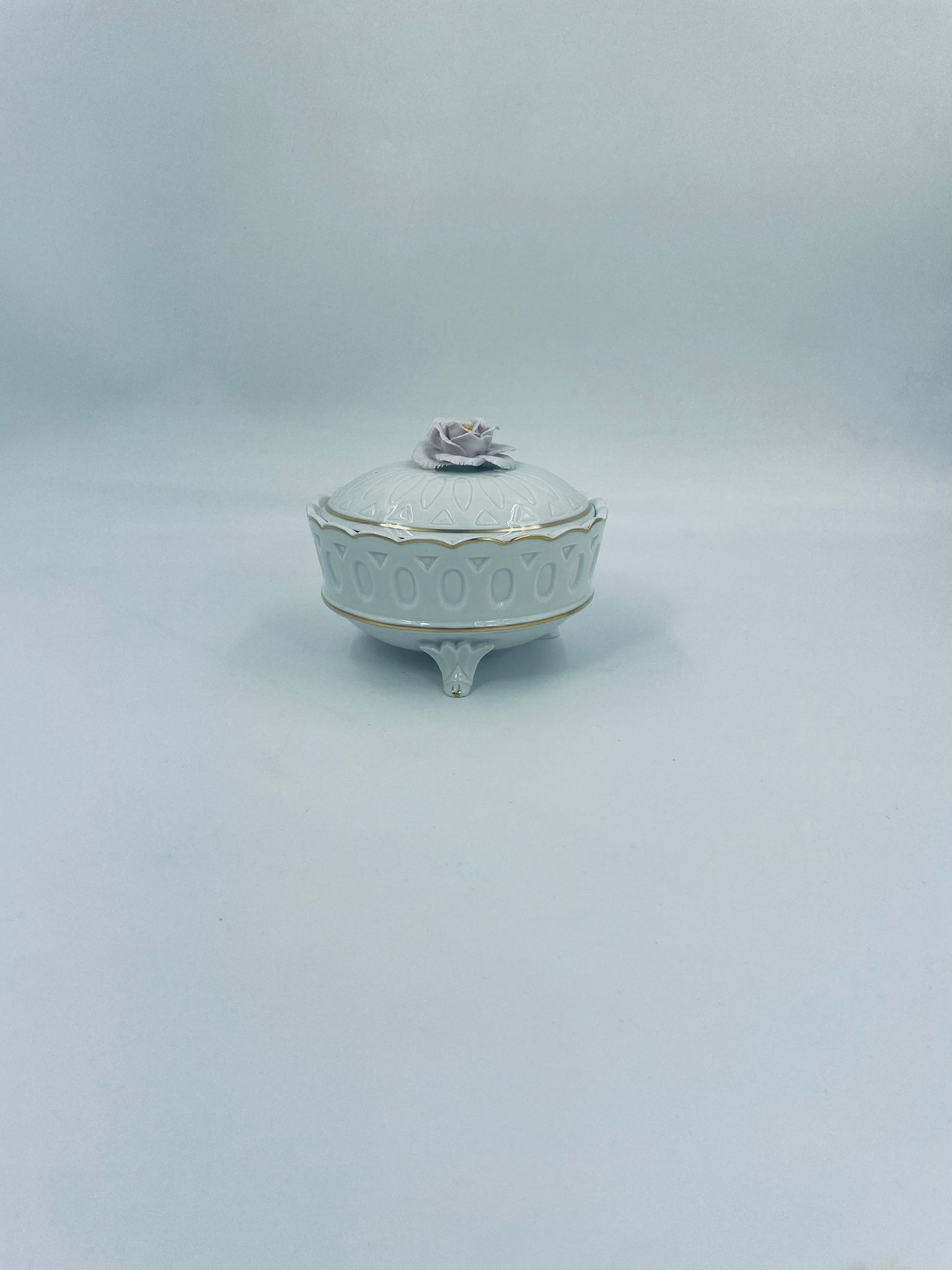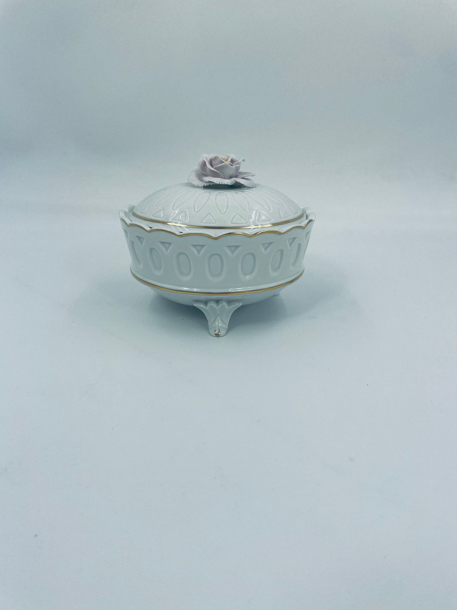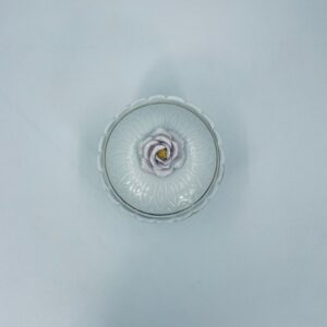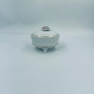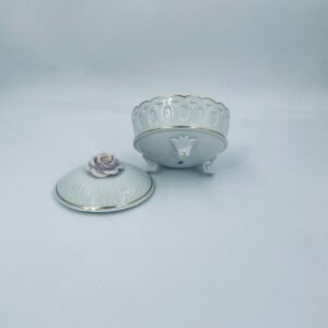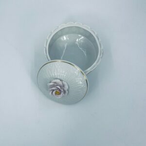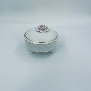 Bombonierka wytwórni Sitzendorf, wykonana z wysokiej jakości białej porcelany. Bombonierka osadzona na trzech ozdobnych nóżkach, o okrągłym kształcie, ozdobiona reliefowymi wzorami wzdłuż boku, falowanym górnym rantem wykończonym złoceniem. Pokrywa również ze złotym pasem oraz z ozdobną różą.