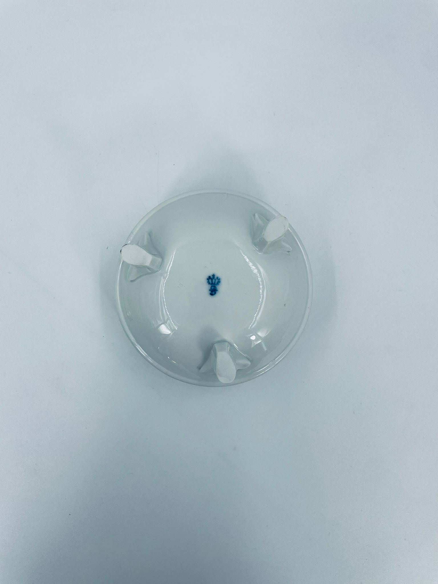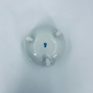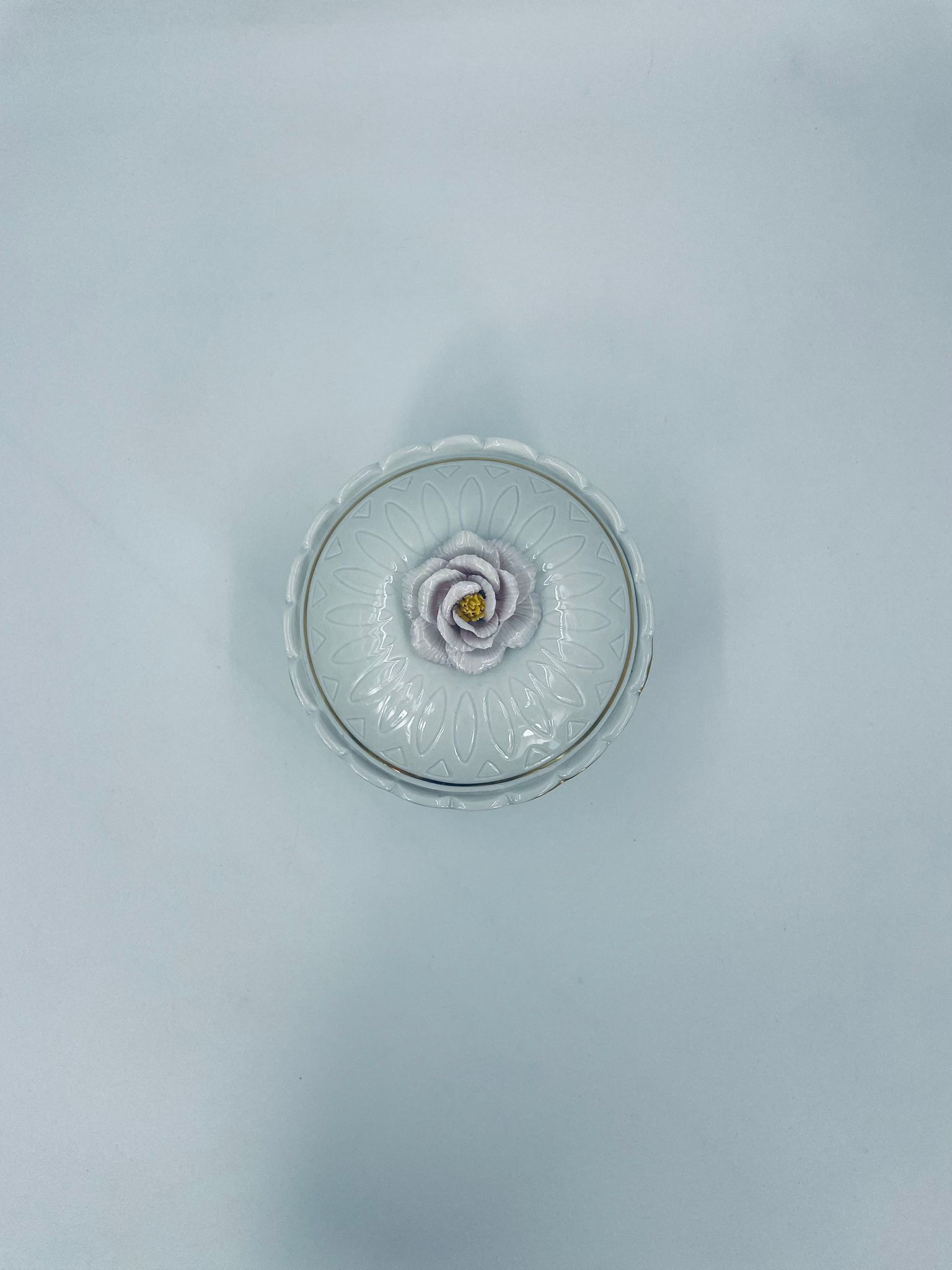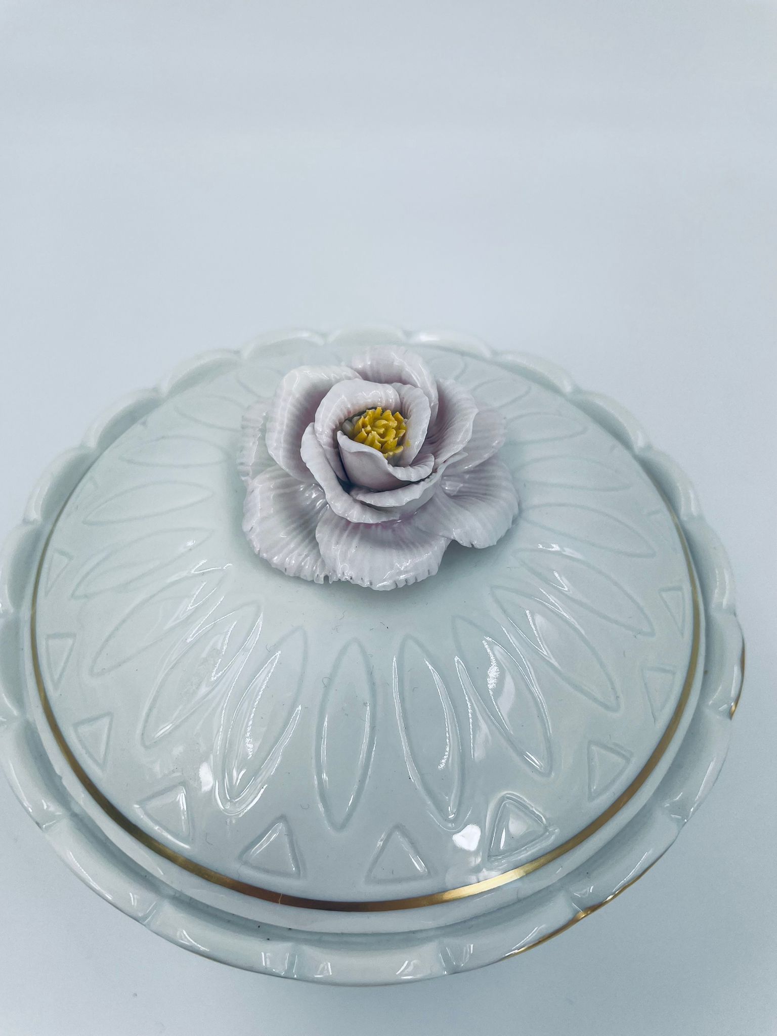 Bombonierka wytwórni Sitzendorf, wykonana z wysokiej jakości białej porcelany. Bombonierka osadzona na trzech ozdobnych nóżkach, o okrągłym kształcie, ozdobiona reliefowymi wzorami wzdłuż boku, falowanym górnym rantem wykończonym złoceniem. Pokrywa również ze złotym pasem oraz z ozdobną różą.