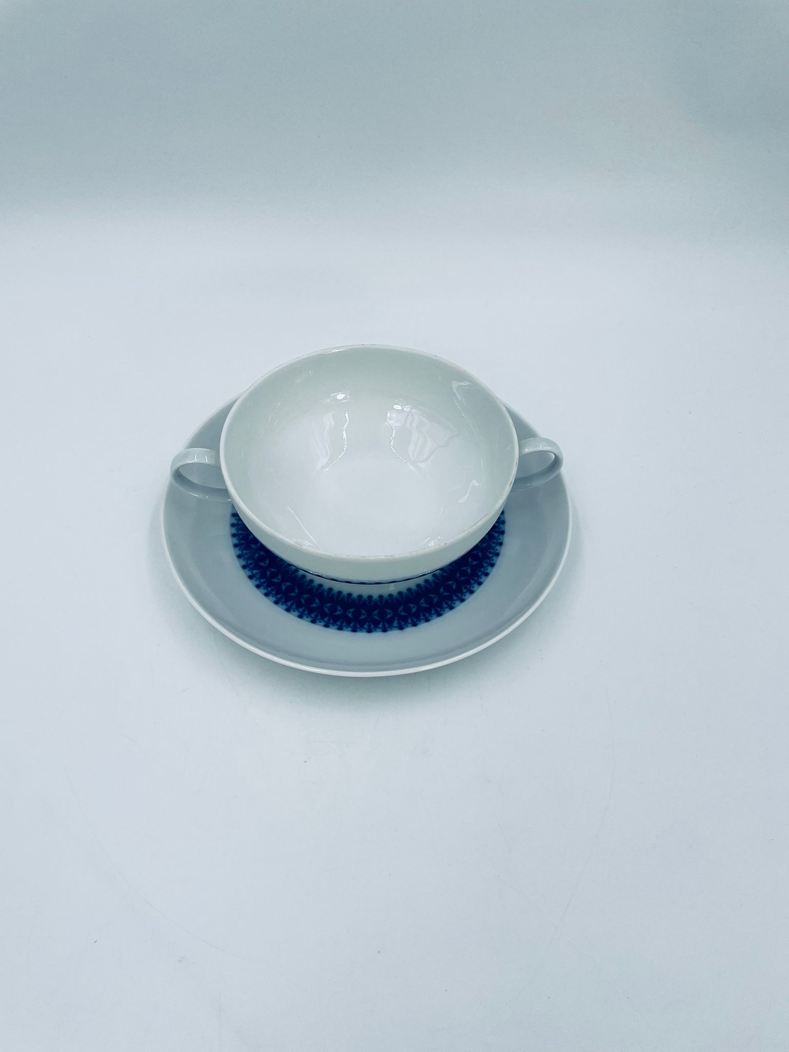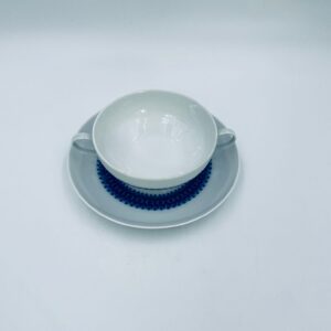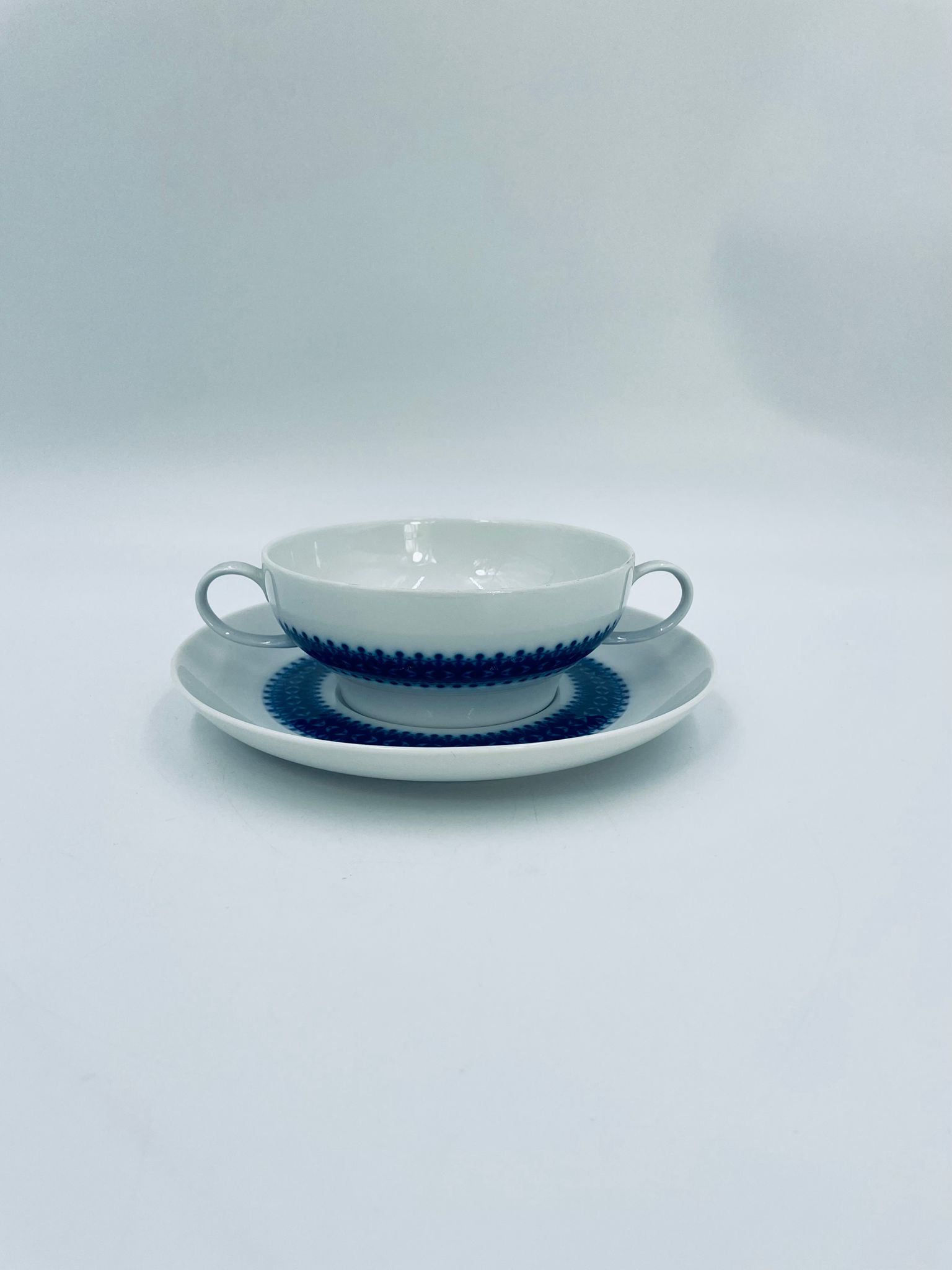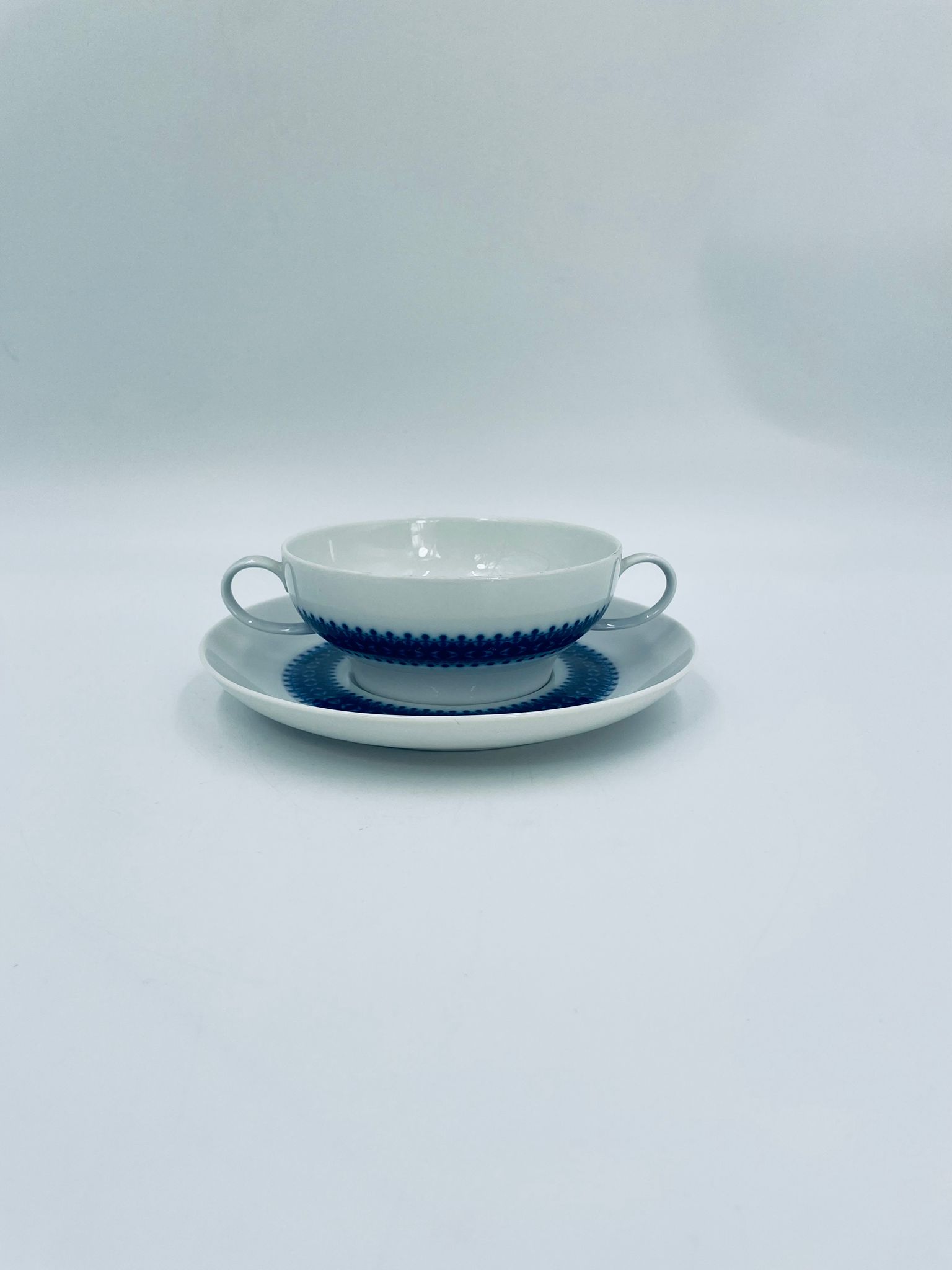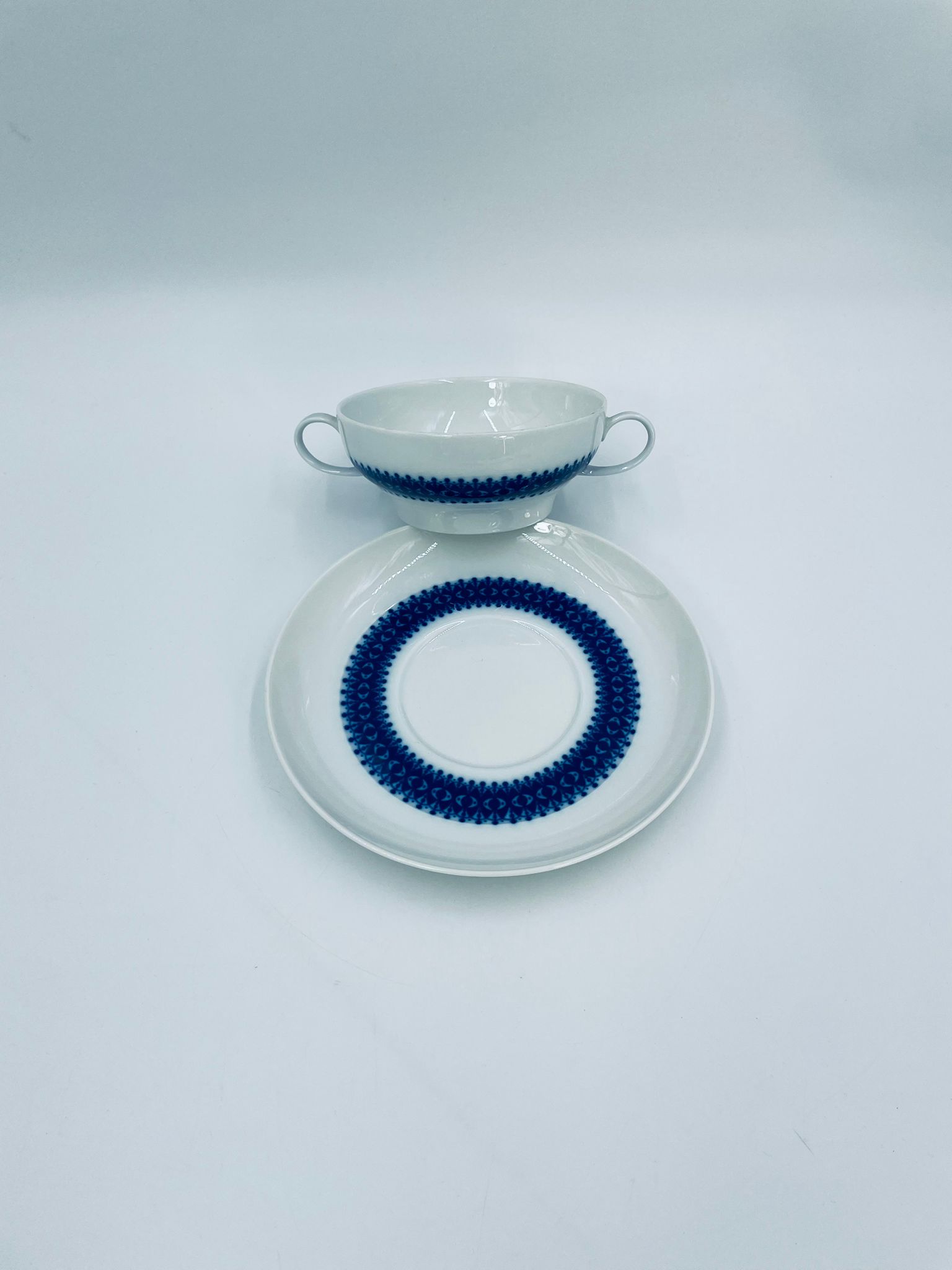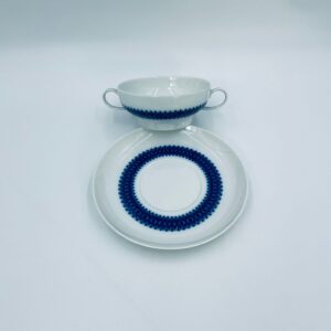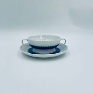 Bulionówka ze spodkiem renomowanej wytwórni Thomas, która od 1908r należy do koncernu Rosenthal, zaprojektowana przez Tapio Wirkkalę w latach 60tych, z serii Rotunda Cobalt Blue, wykonana z najwyższej jakości białej porcelany. Bulionówka z dwoma uchwytami i spodkiem, ozdobiona charakterystycznym kobaltowym, geometrycznym wzorem.