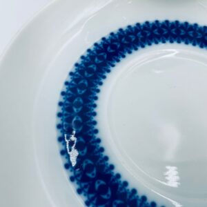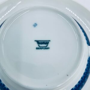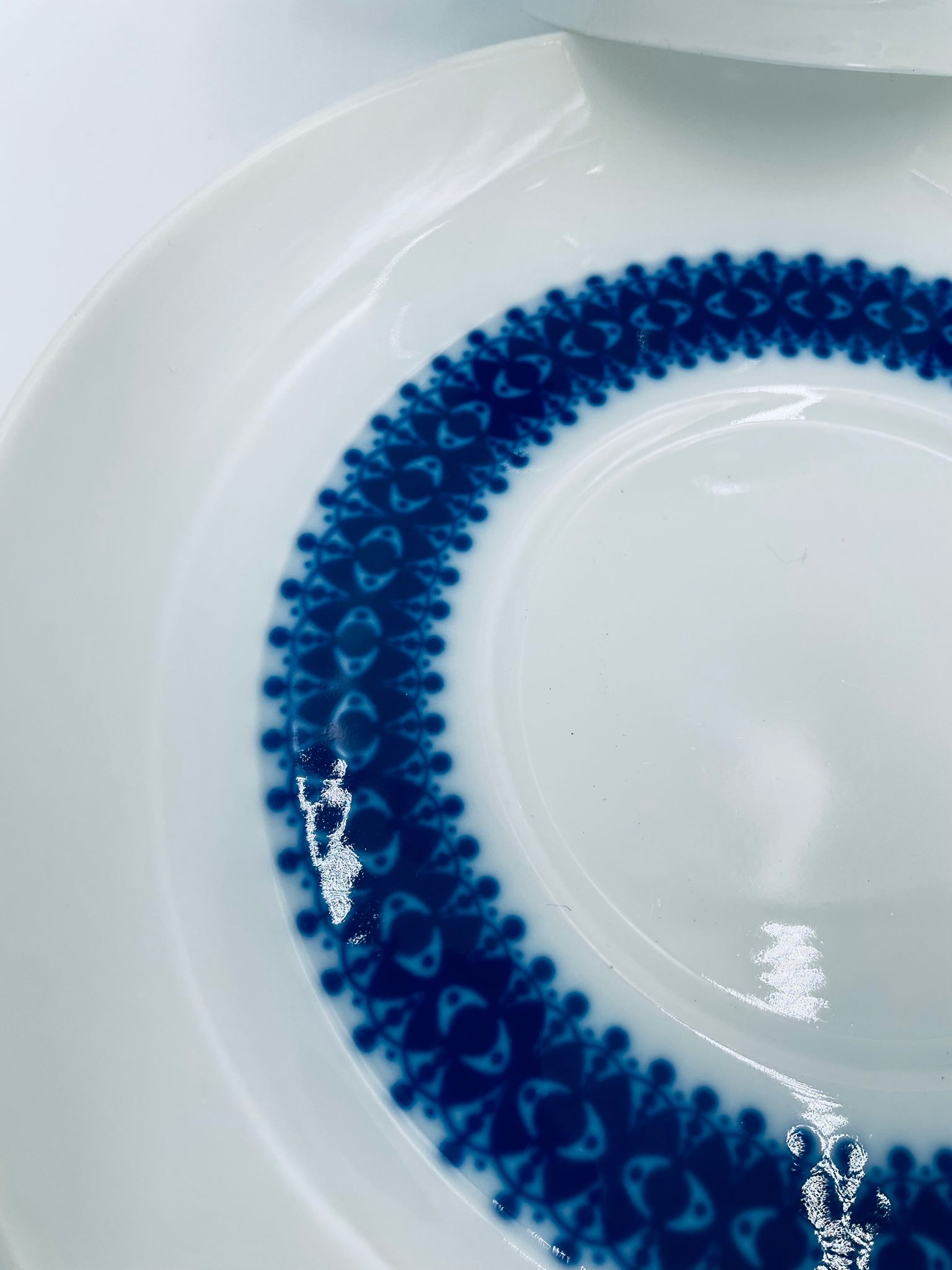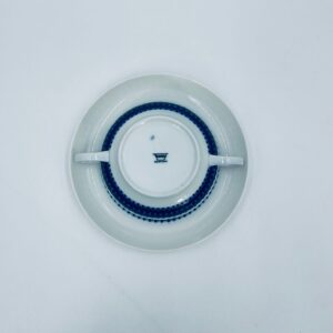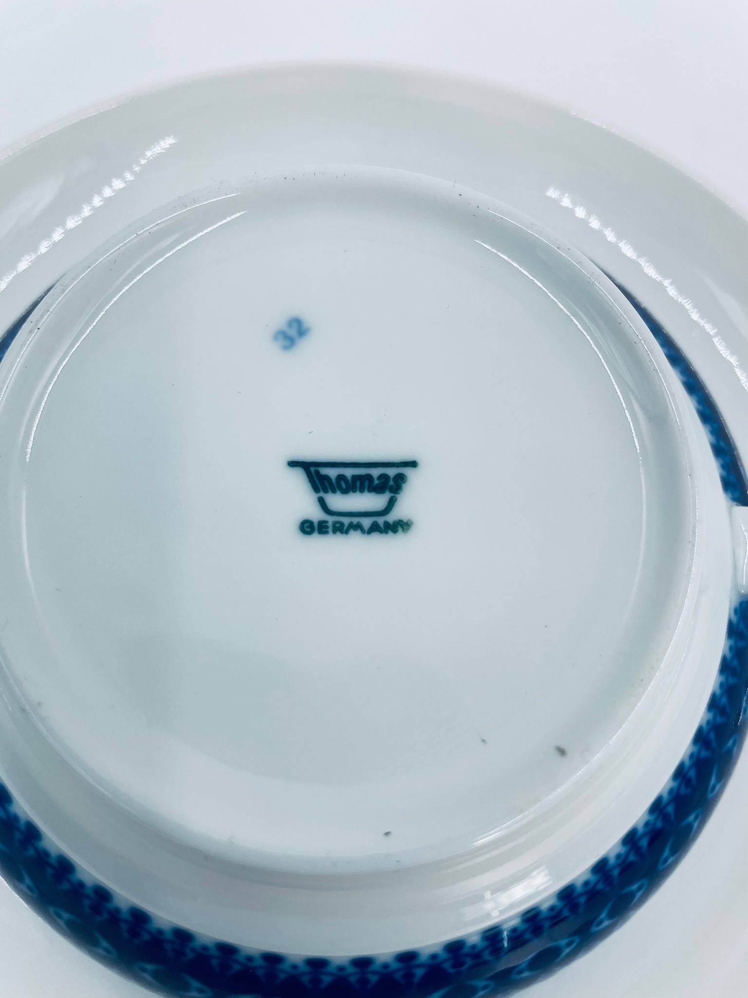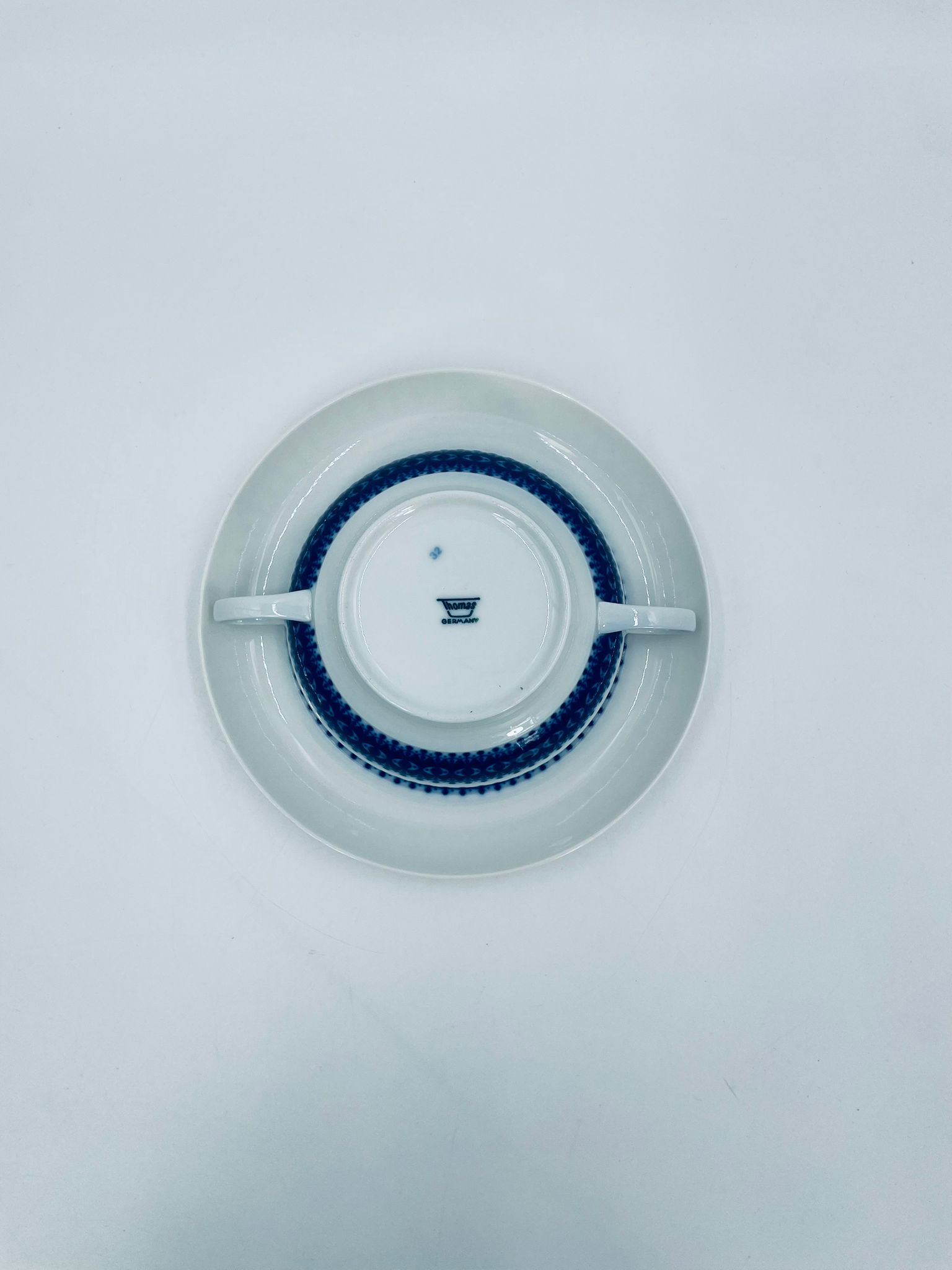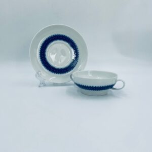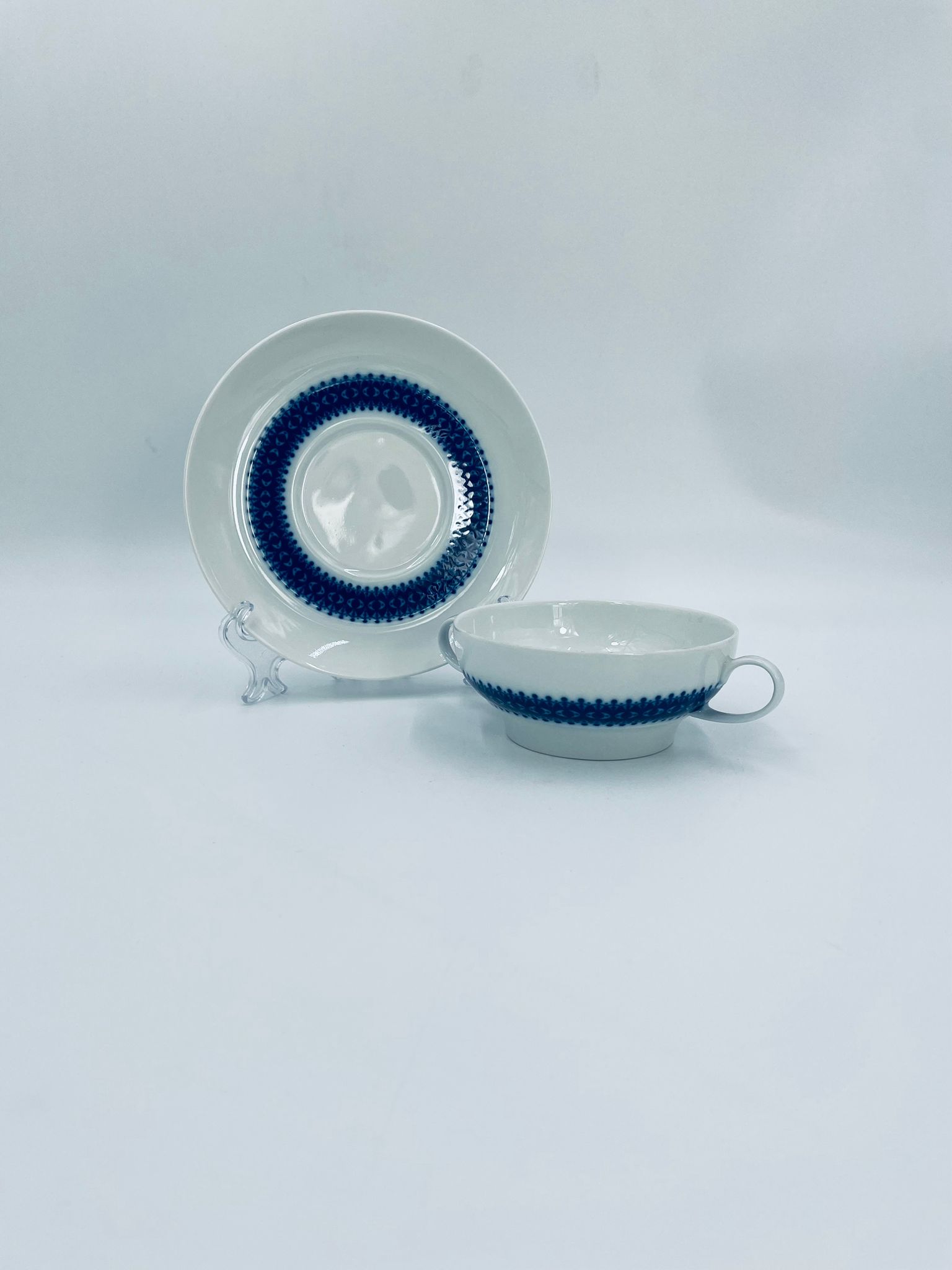 Bulionówka ze spodkiem renomowanej wytwórni Thomas, która od 1908r należy do koncernu Rosenthal, zaprojektowana przez Tapio Wirkkalę w latach 60tych, z serii Rotunda Cobalt Blue, wykonana z najwyższej jakości białej porcelany. Bulionówka z dwoma uchwytami i spodkiem, ozdobiona charakterystycznym kobaltowym, geometrycznym wzorem.