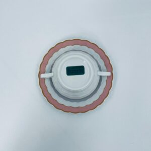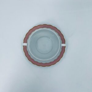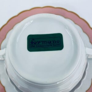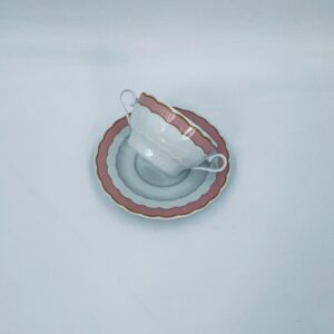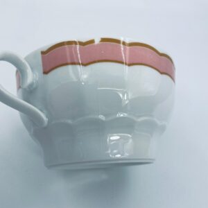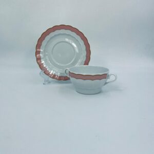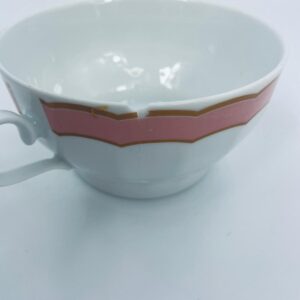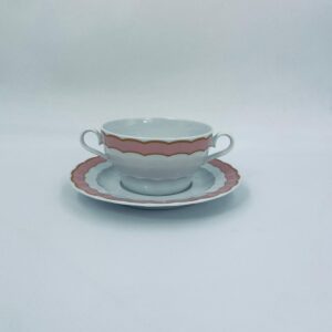 Bulionówka ze spodkiem w stylu współczesnym, wykonana z białej porcelany. Charakteryzuje się różowym, falbankowym brzegiem i złotym zdobieniem. Jedna Bulionówka posiada pęknięcie.