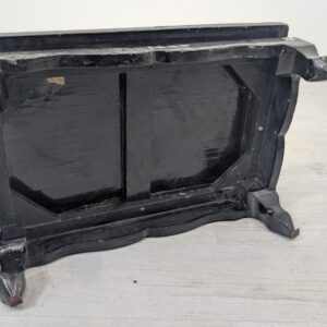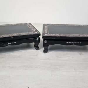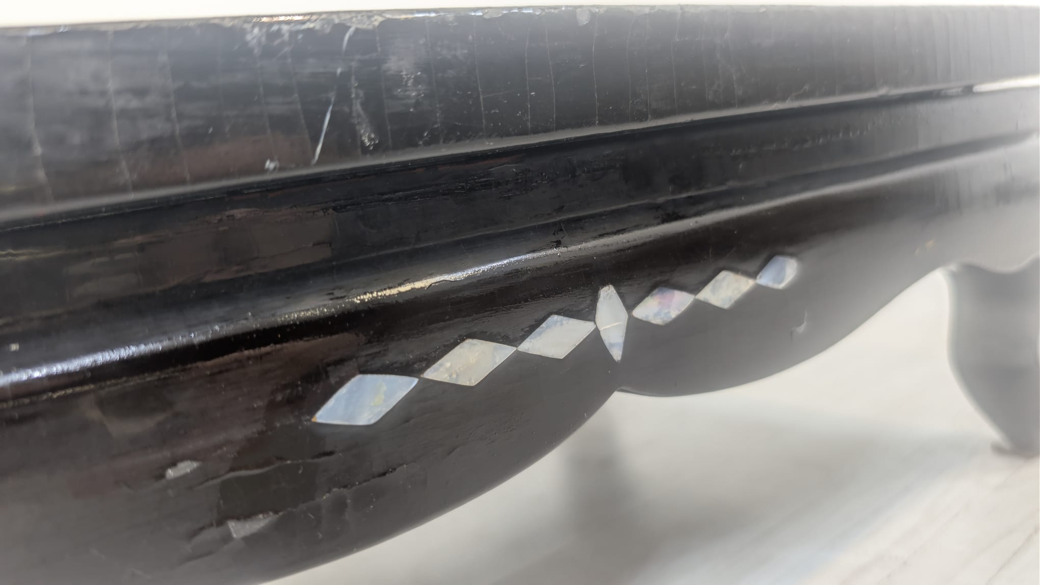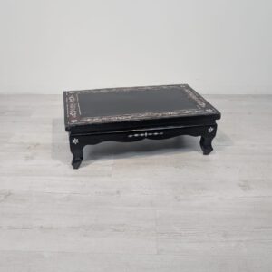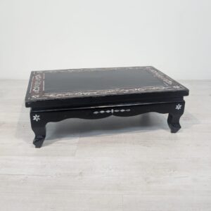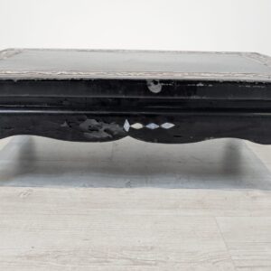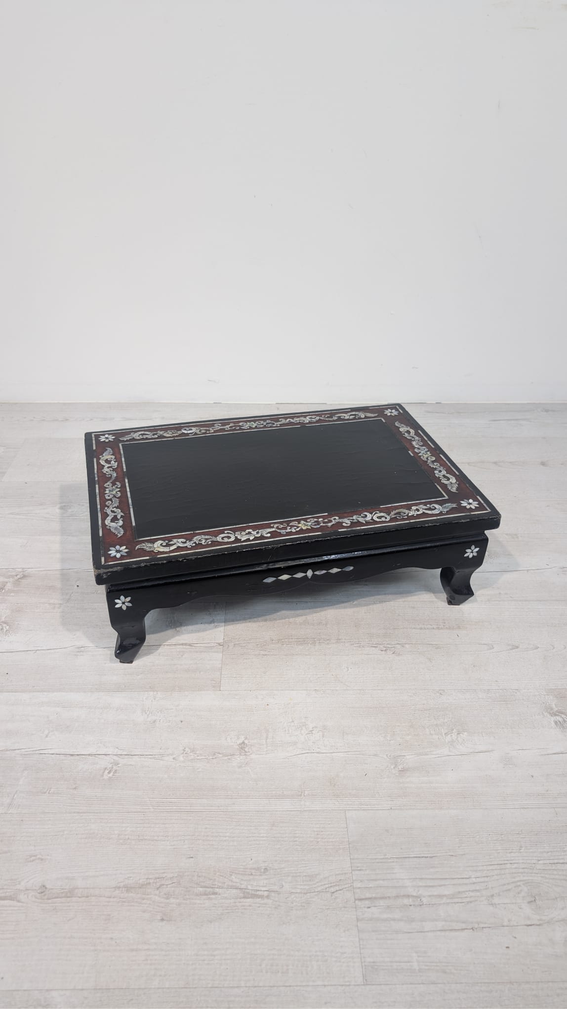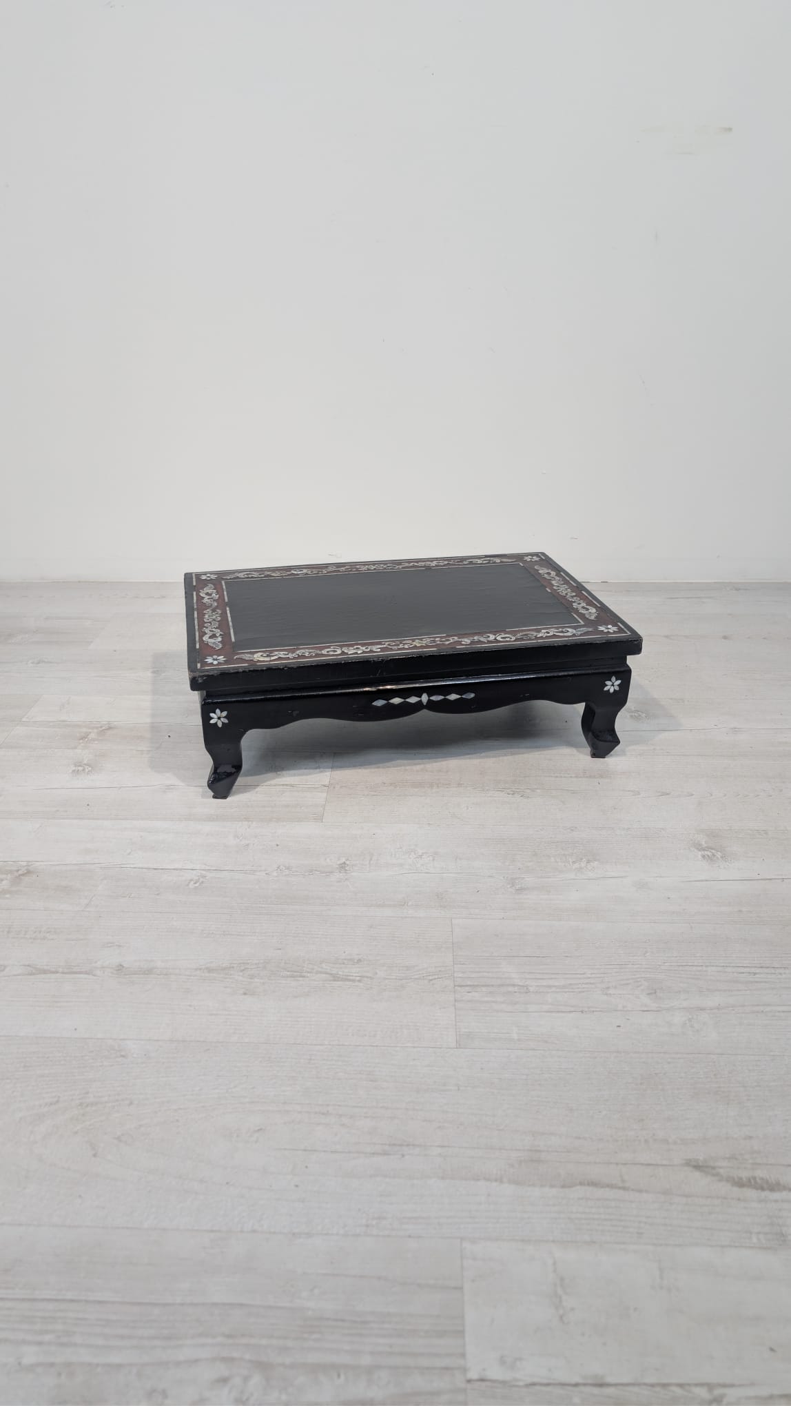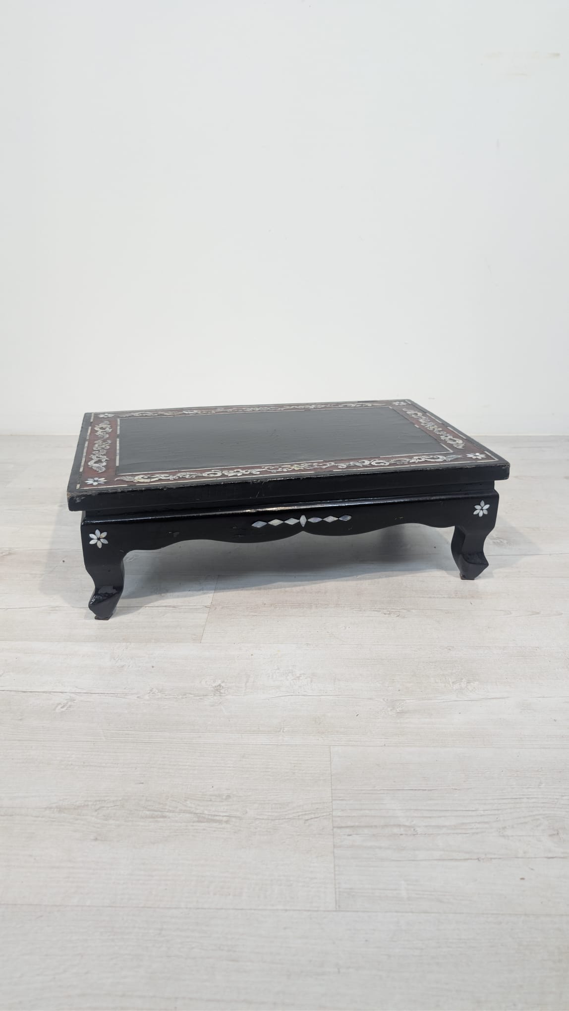 Stylowy, niski stolik kawowy w orientalnym stylu, inkrustowany muszlą. Posiada charakterystyczne, rzeźbione nogi. Mimo widocznych śladów użytkowania, zachował swój oryginalny urok i elegancję. Doskonały element dekoracyjny do salonu lub sypialni.