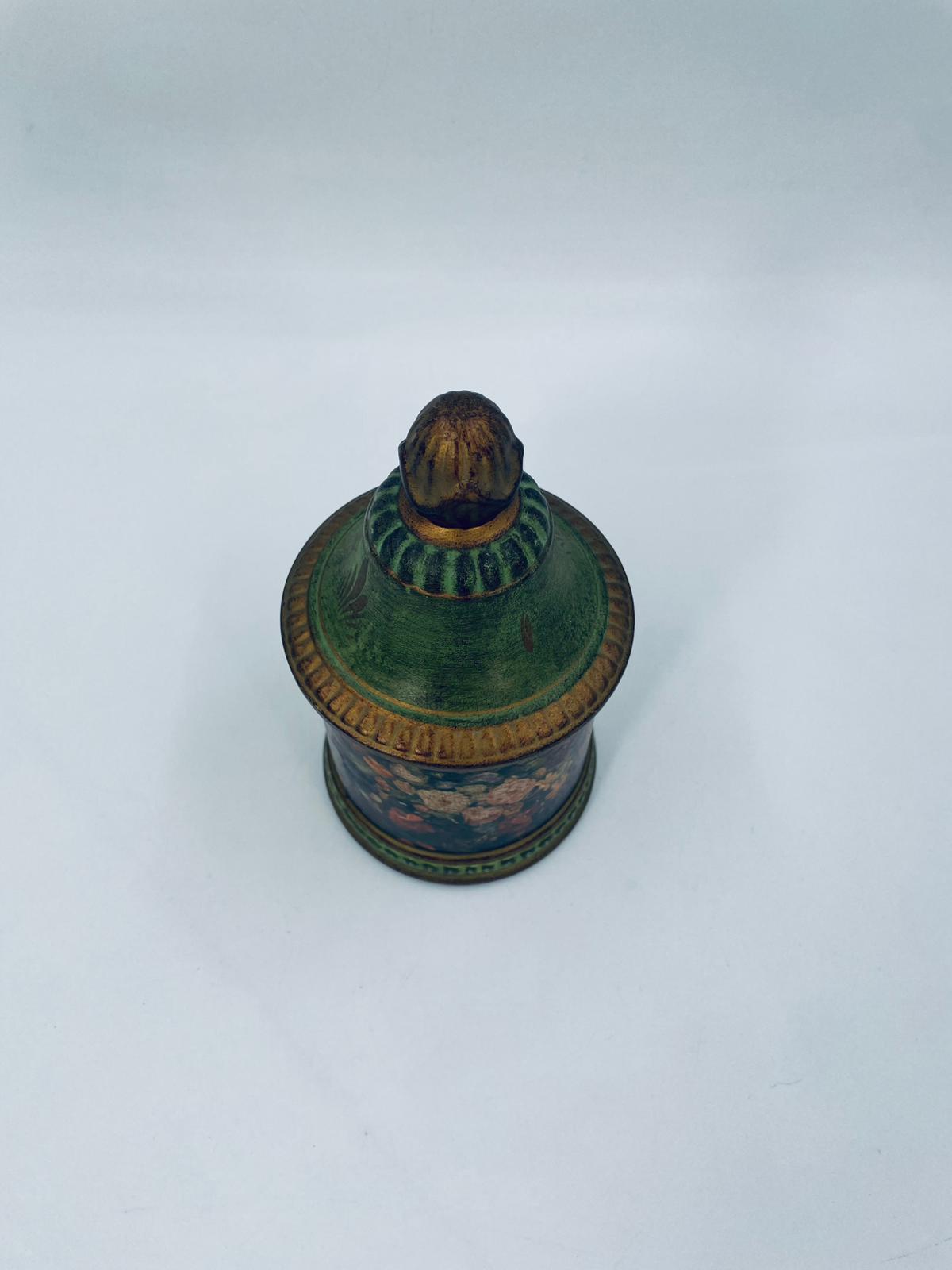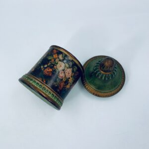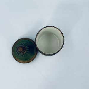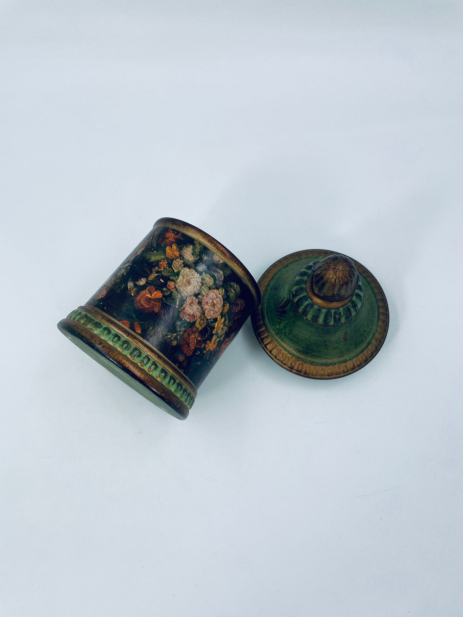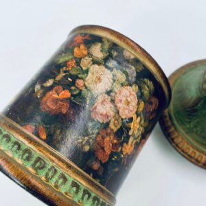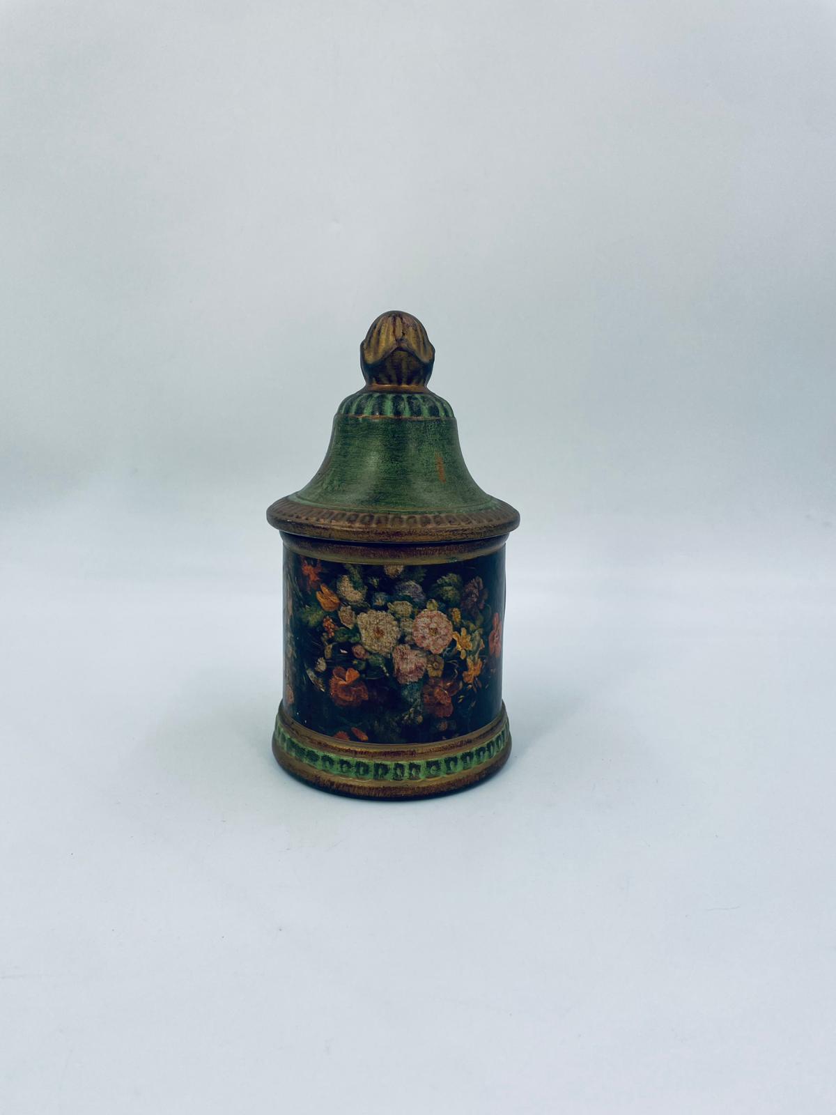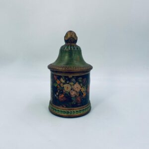 Cukiernica w stylu Vintage, wykonana z ceramiki. Cukiernica charakteryzuje się kolorem zielono- złotym, ręcznie malowanym wzorem kwiatowym oraz dekoracyjna pokrywa z uchwytem.