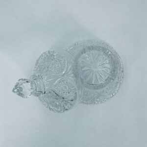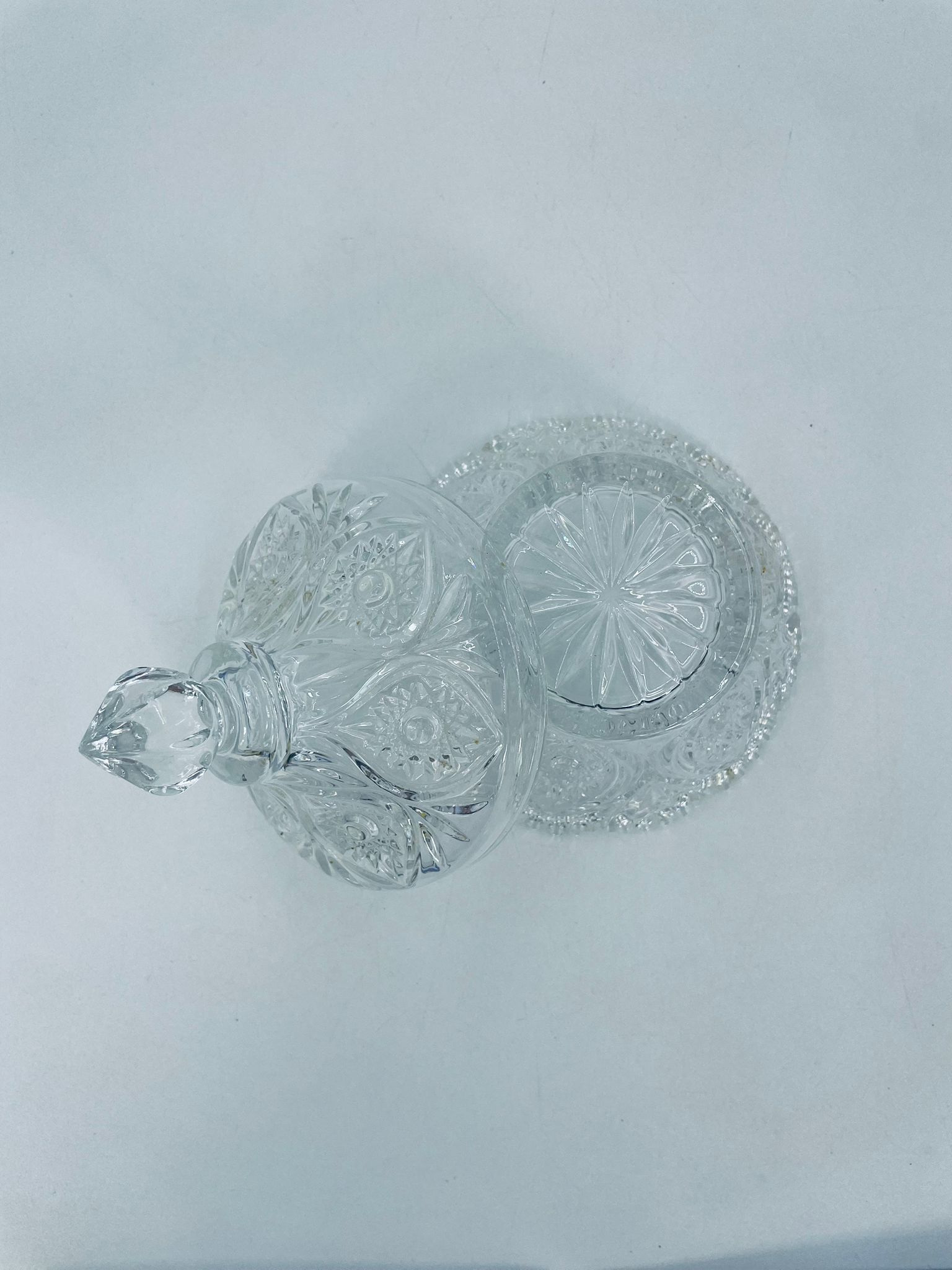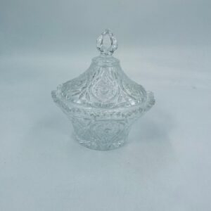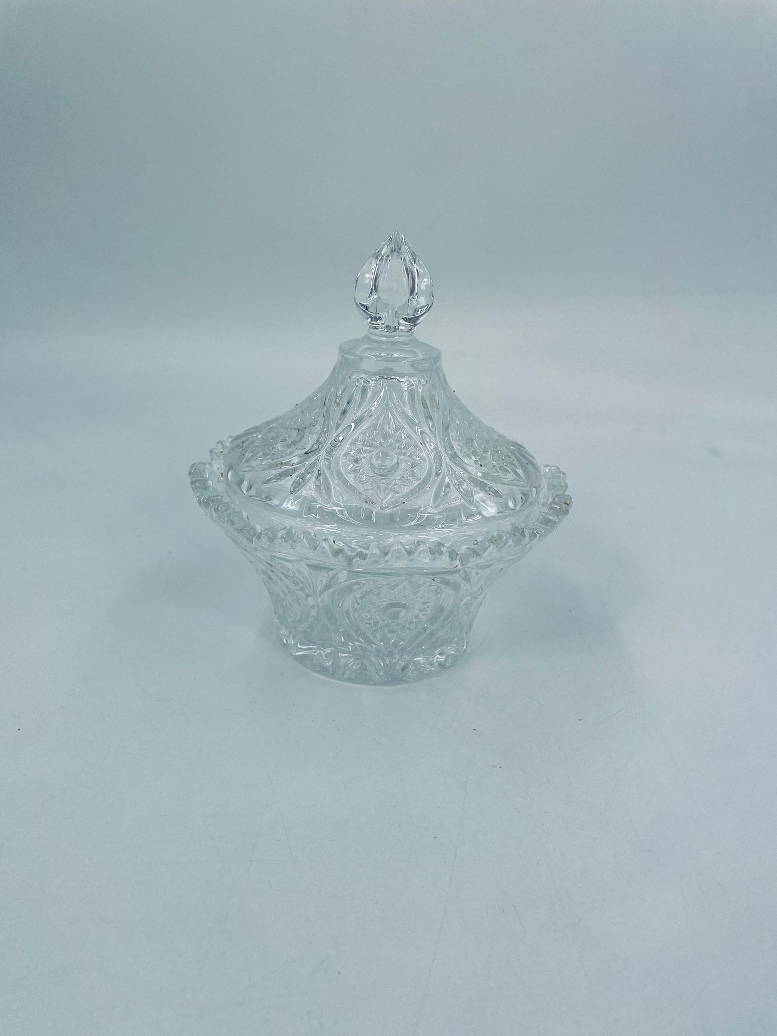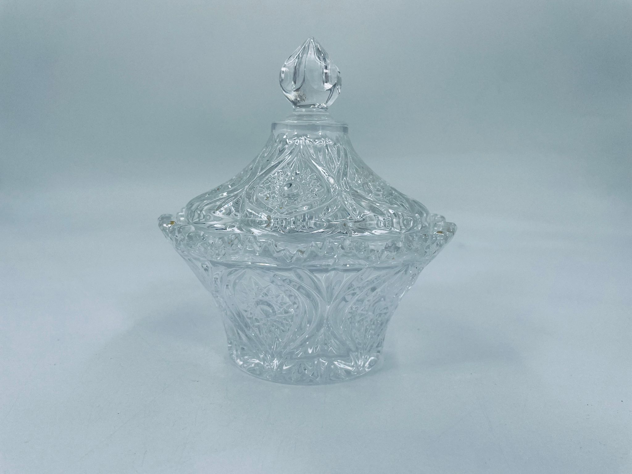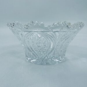 Cukiernica kryształowa z lat 50tych, przezroczysta. Elegancki przedmiot z ząbkowaną krawędzią oraz precyzyjnym szlifowaniem i zdobieniami.
