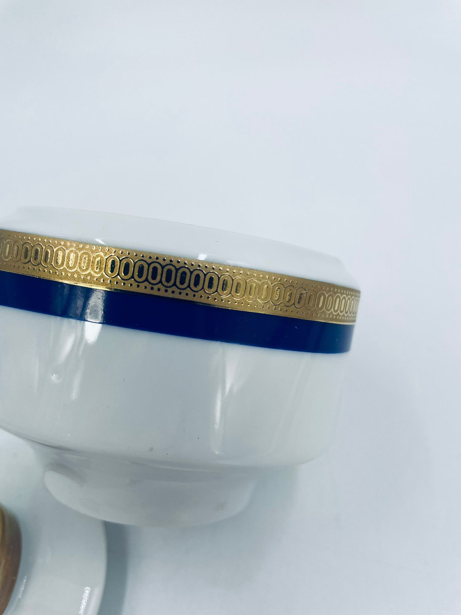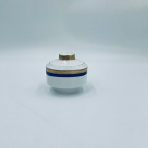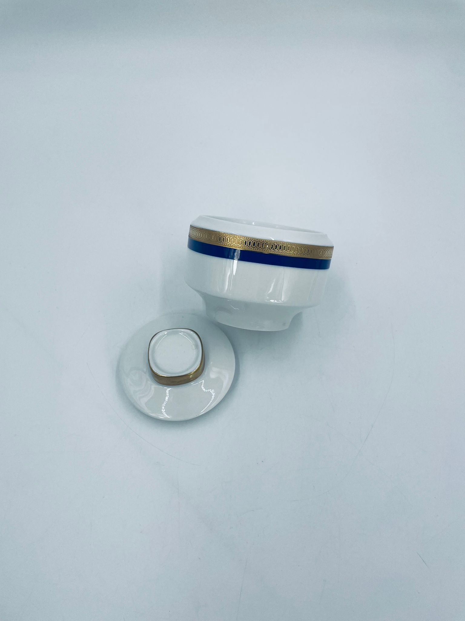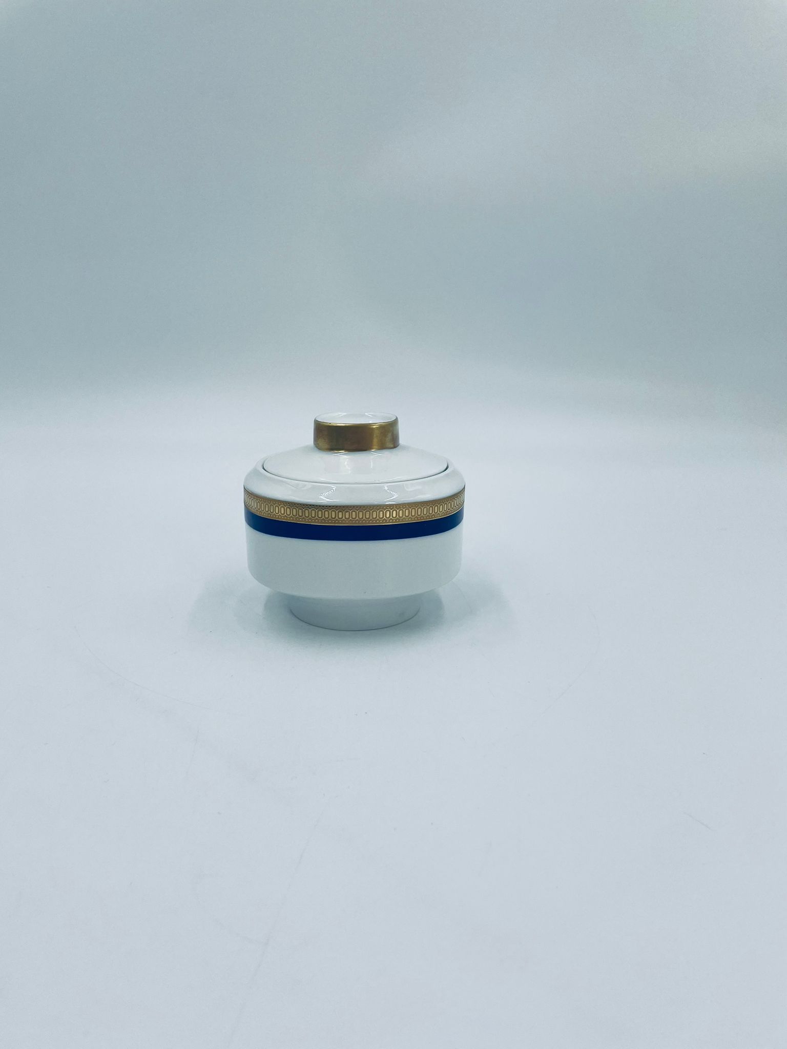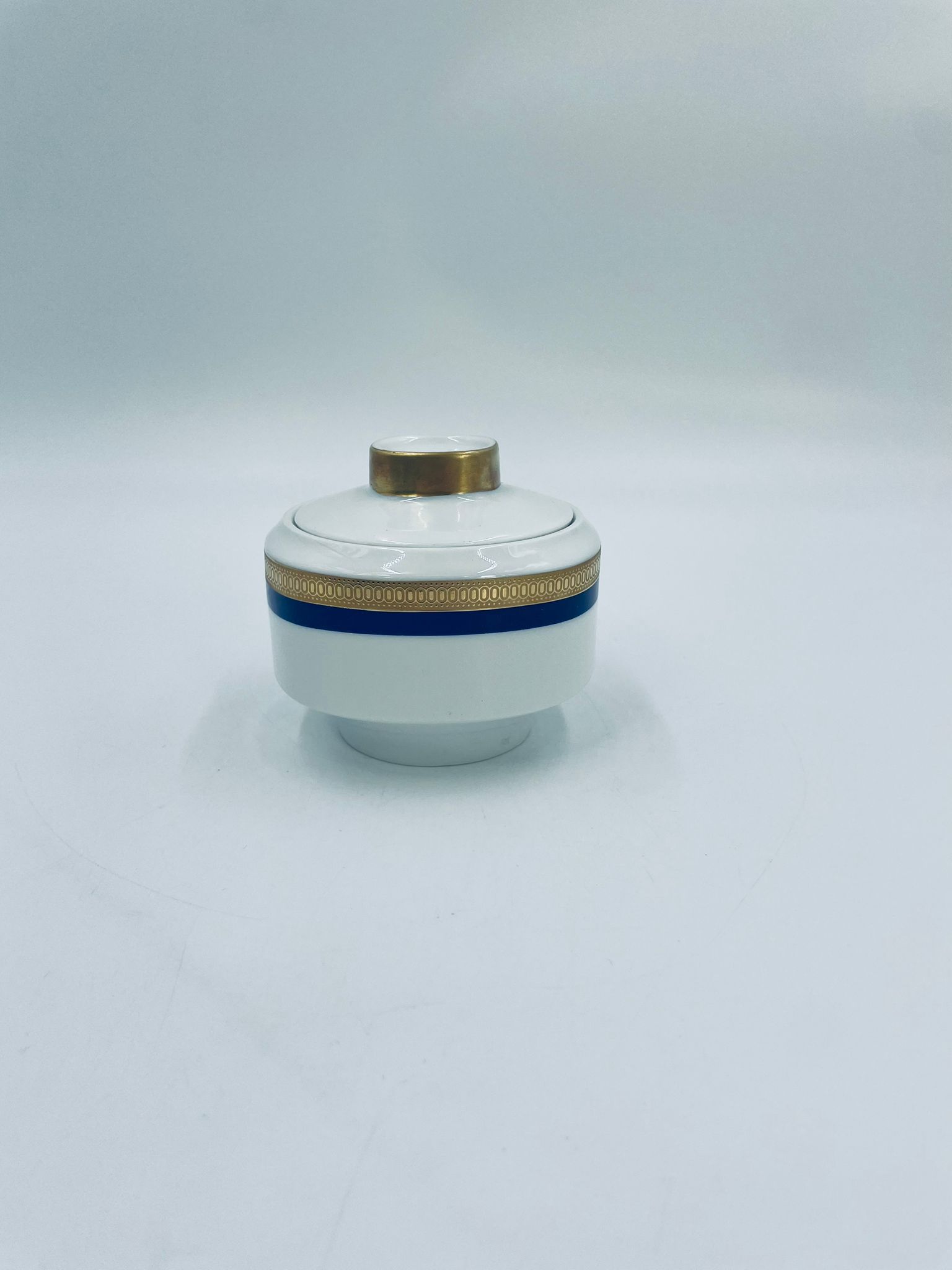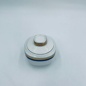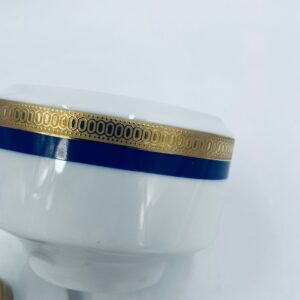 Cukiernica wytwórni Eschenbach Bavaria, wykonana z wysokiej jakości białej porcelany. Cukiernica klasyczna, charakteryzuje się elegancją o ponadczasowym fasonie, ozdobiona kobaltową bordiurą oraz bogatym złoceniem z geometrycznym wzorem. Może posiadać minimalne przetarcie na złoceniu.