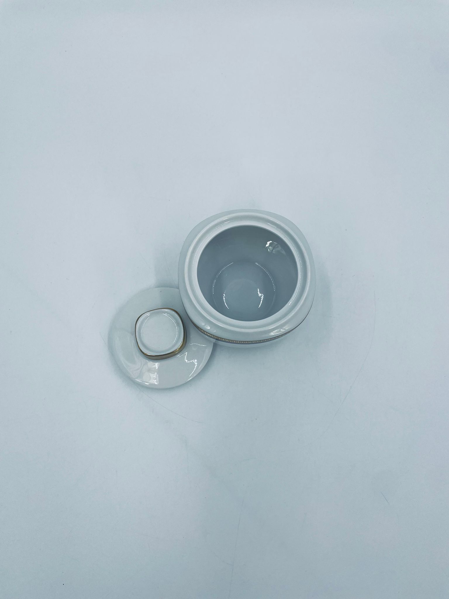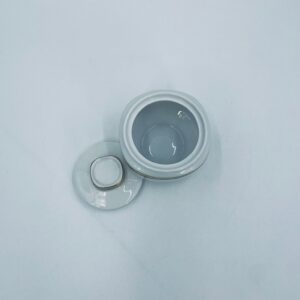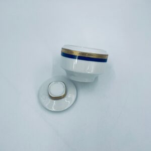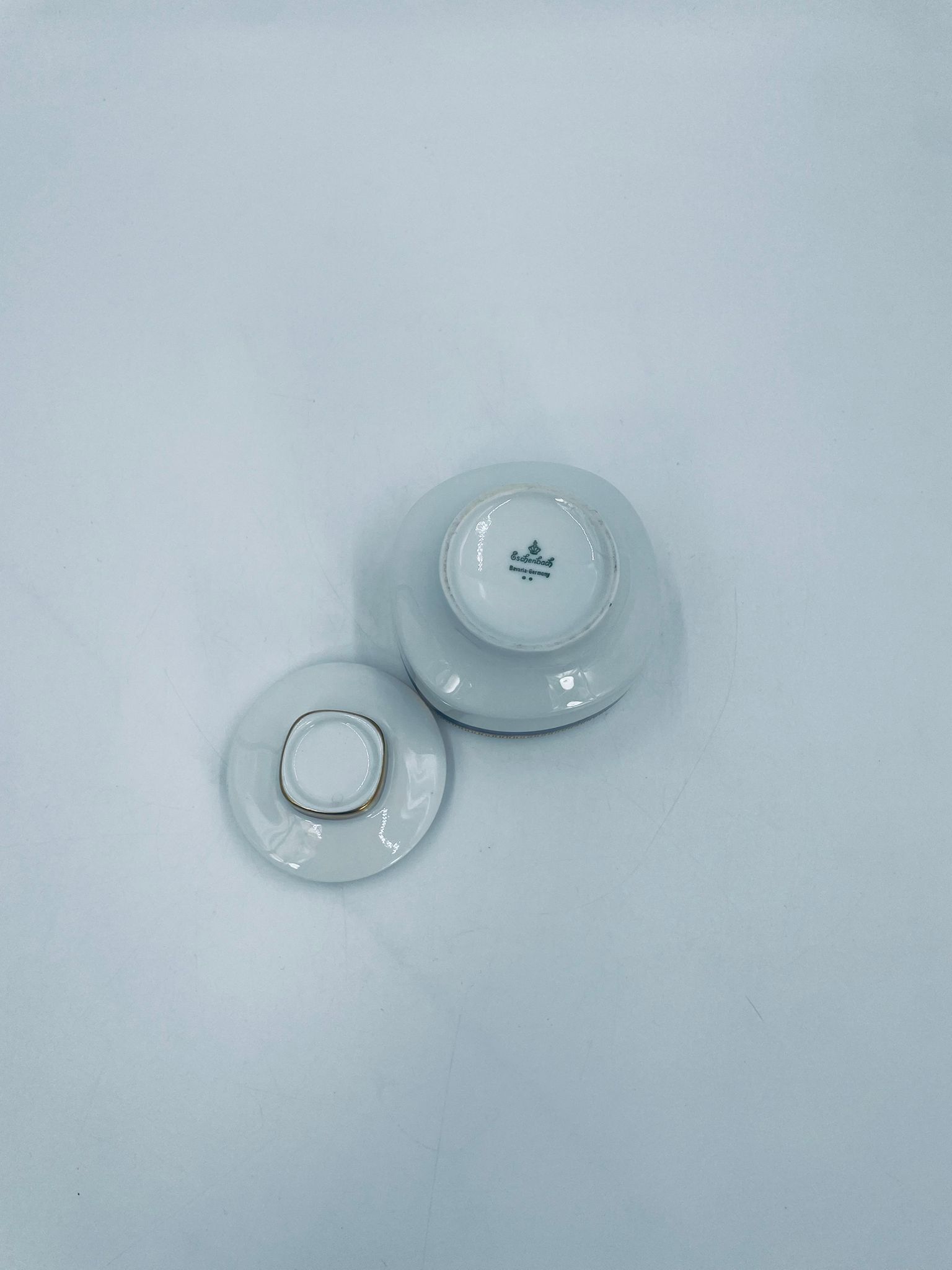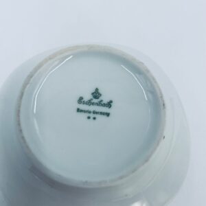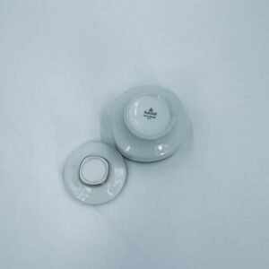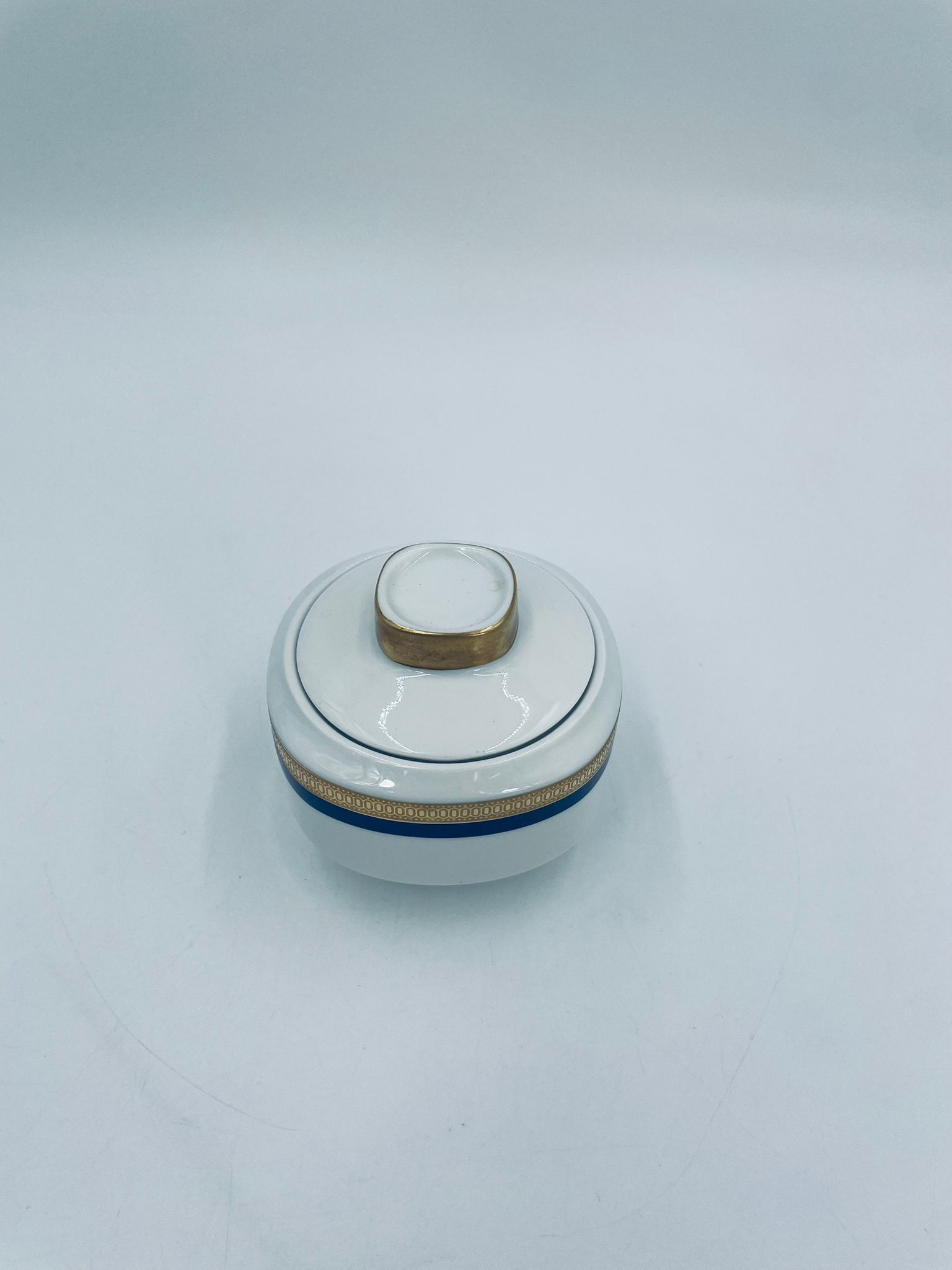 Cukiernica wytwórni Eschenbach Bavaria, wykonana z wysokiej jakości białej porcelany. Cukiernica klasyczna, charakteryzuje się elegancją o ponadczasowym fasonie, ozdobiona kobaltową bordiurą oraz bogatym złoceniem z geometrycznym wzorem. Może posiadać minimalne przetarcie na złoceniu.