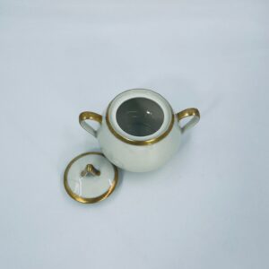 Cukiernica wytwórni Eschenbach, kolekcji Cornelia, wykonana z wysokiej jakości porcelany w kolorze Ecru. Klasyczna, elegancka, wykończona złoceniem na rantach. Posiada przetarcia na złoceniu.