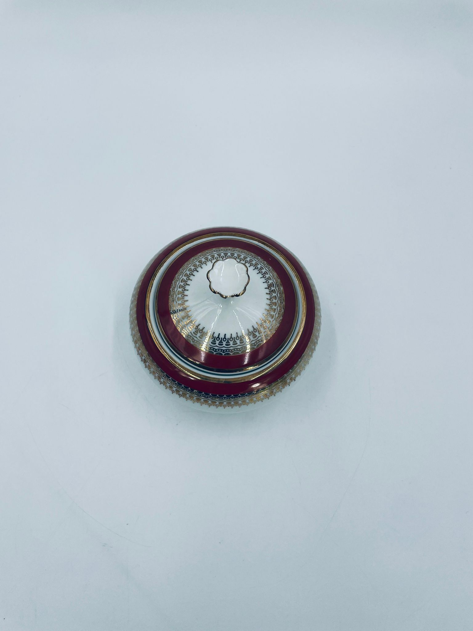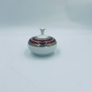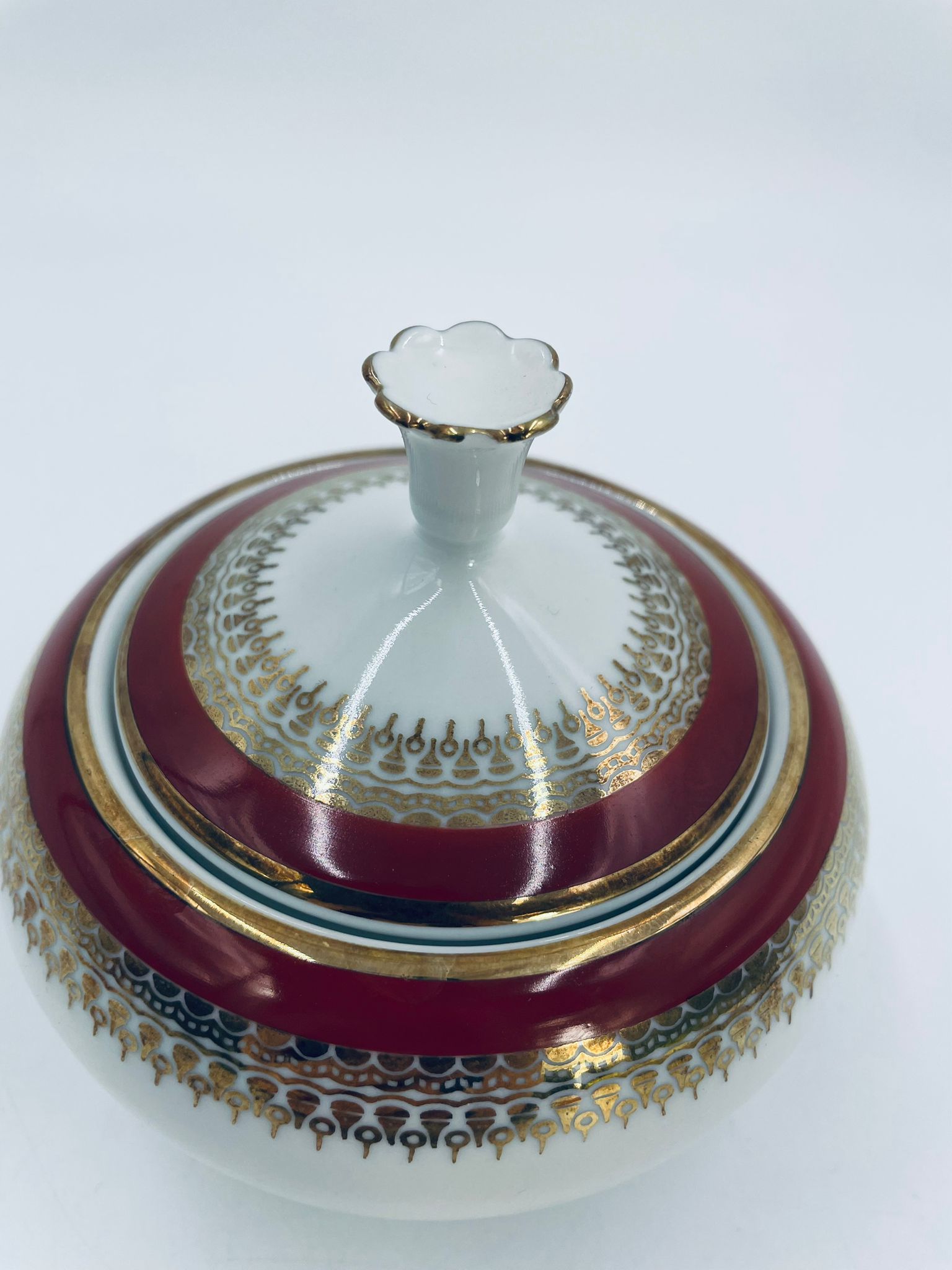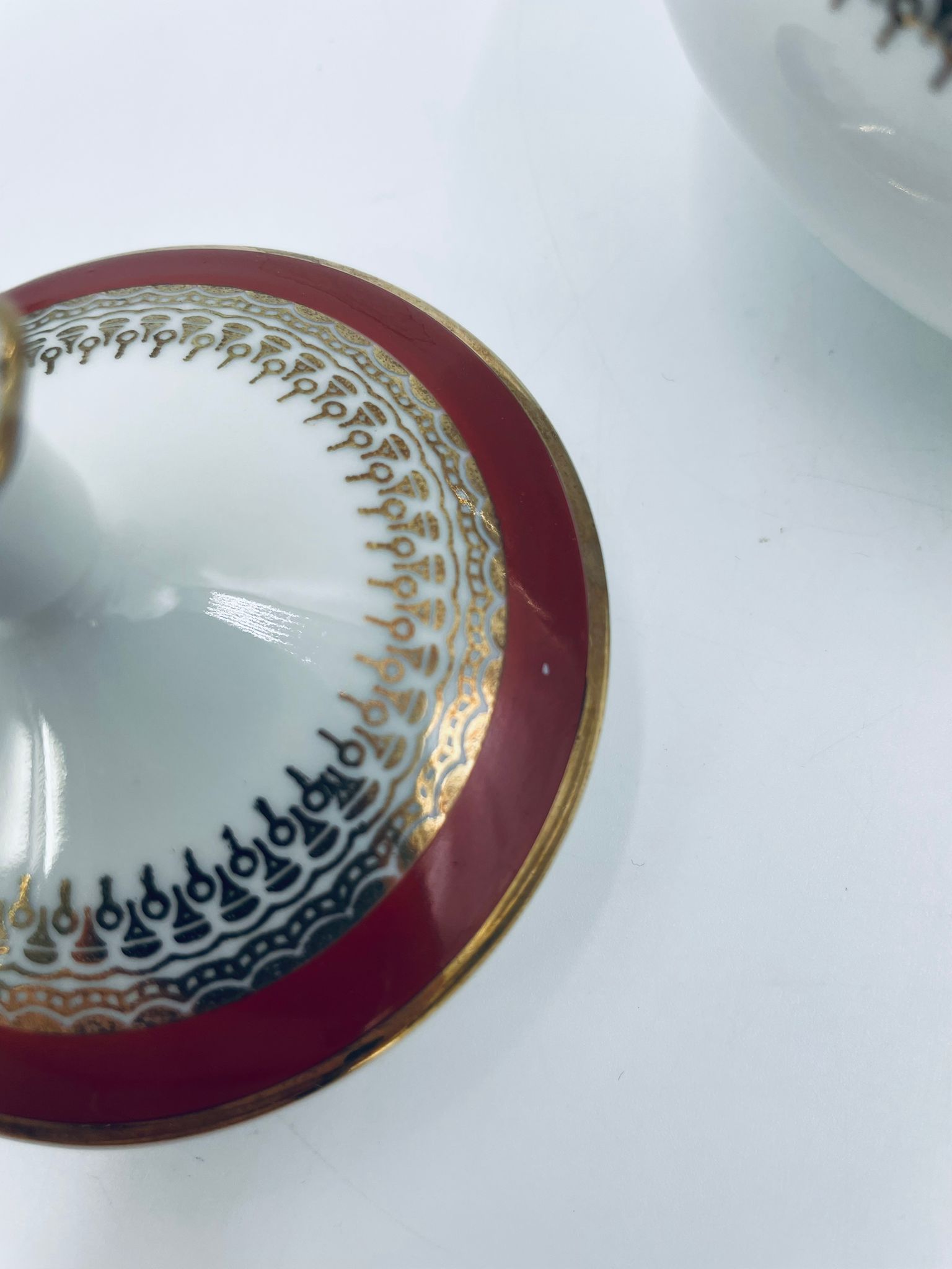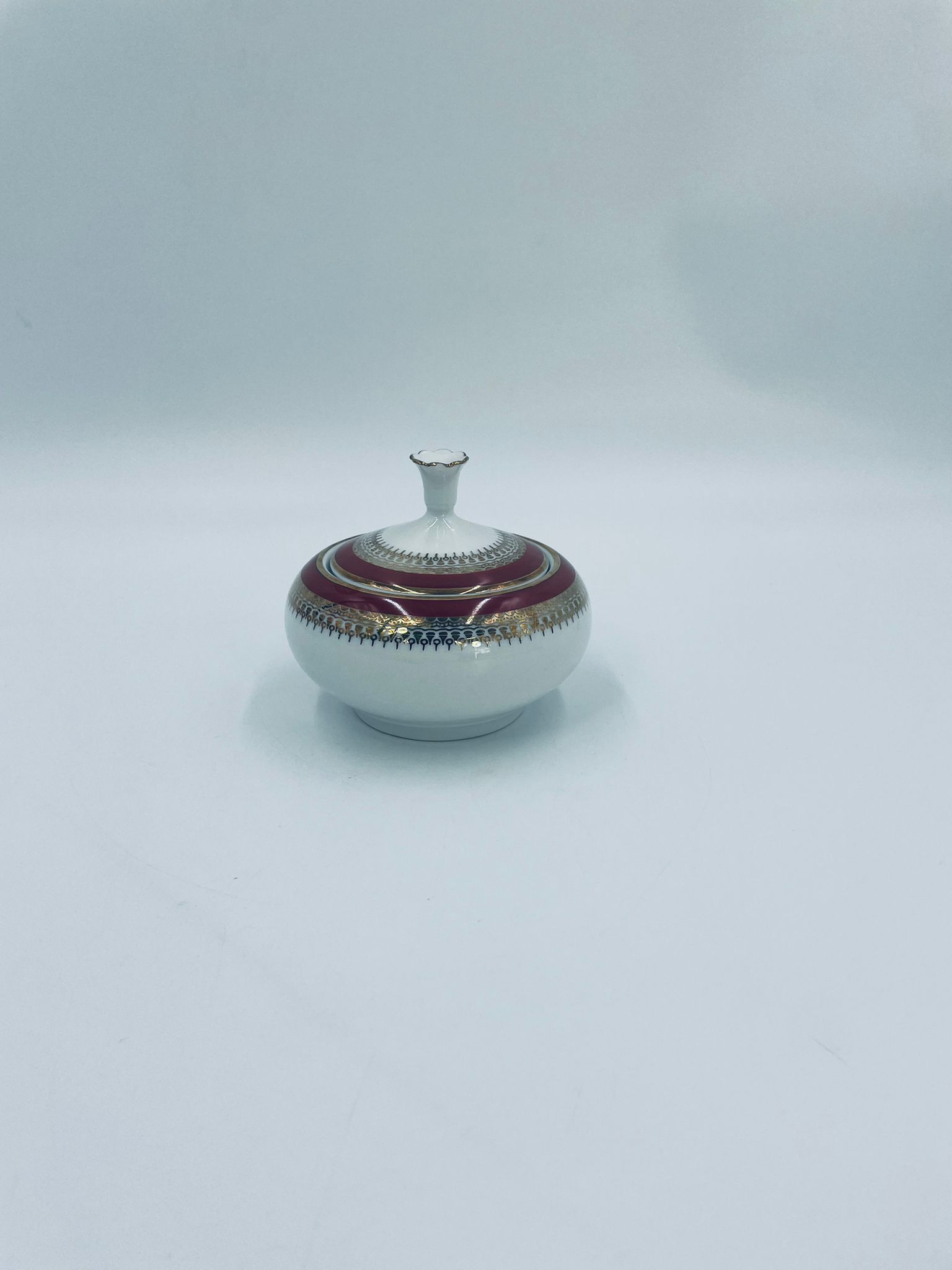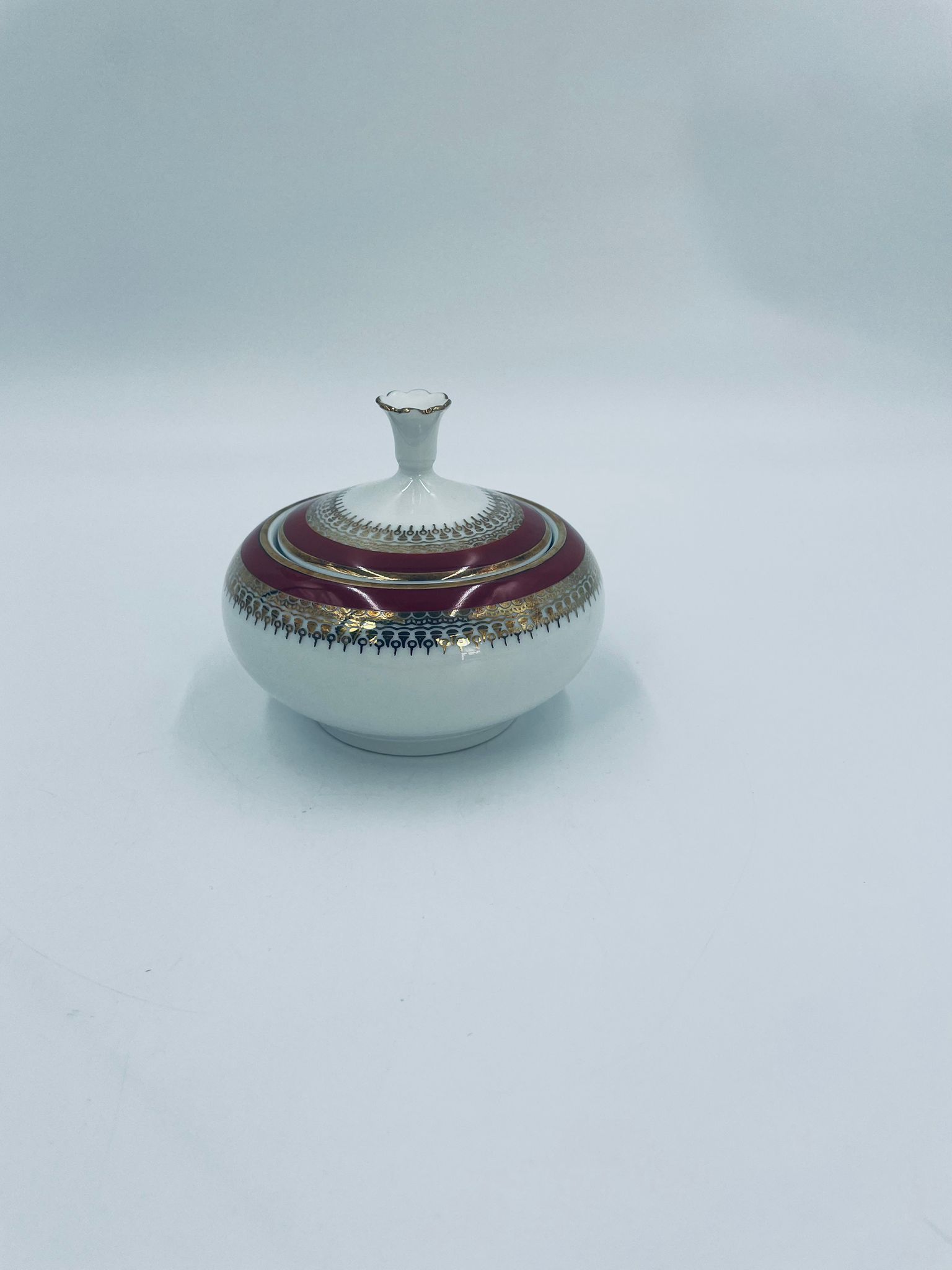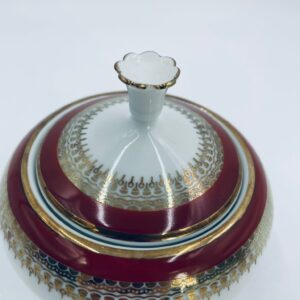 Cukiernica wytwórni Johann Seltmann Vohenstrauss, wykonana z wysokiej jakości białej porcelany. Cukiernica z pokrywą i ozdobnym uchwytem, charakteryzuje się misternym i eleganckim wzorem w złotym kolorze oraz czerwonym pasem, wykończony złoceniem na krawędzi. Posiada przetarcie na złoceniu.