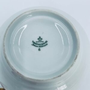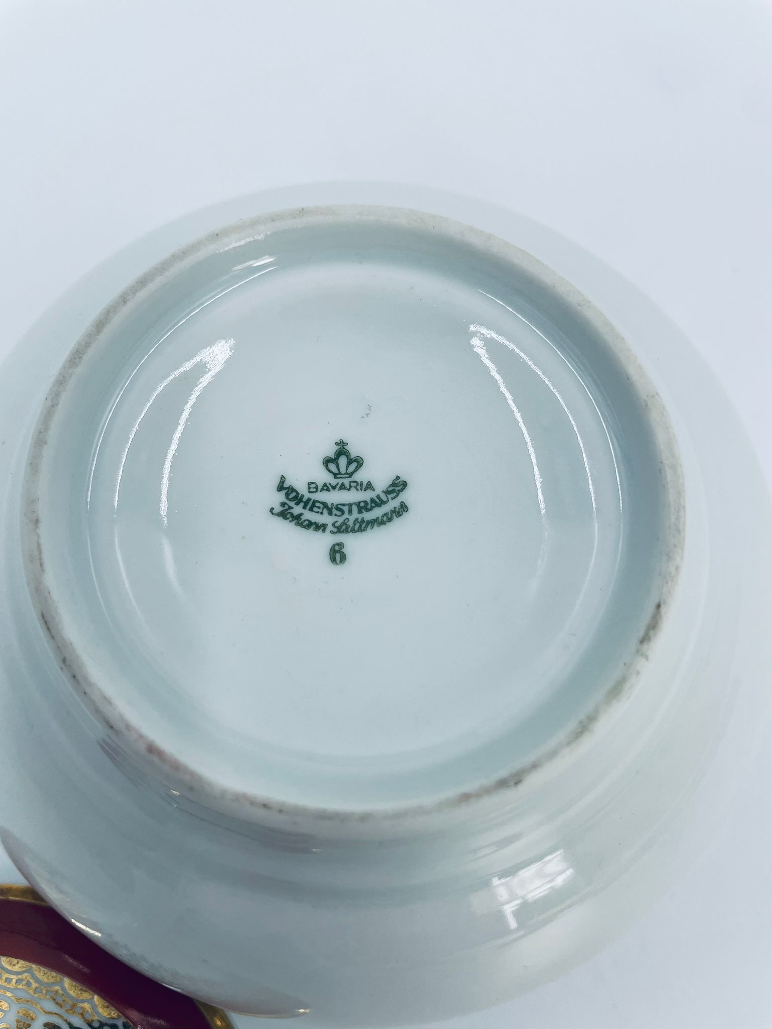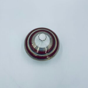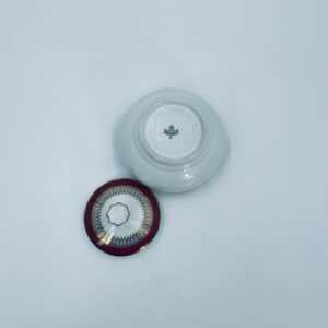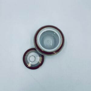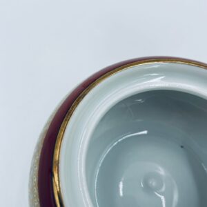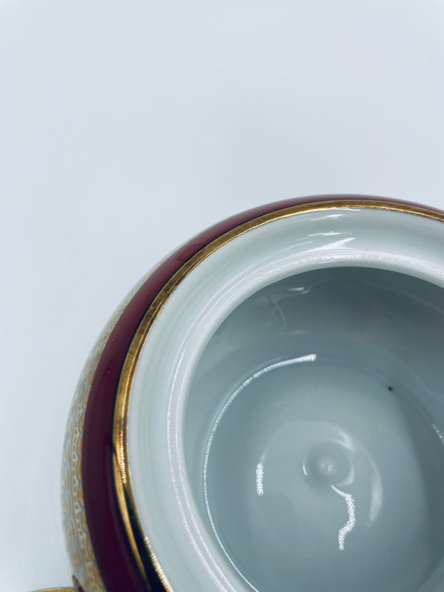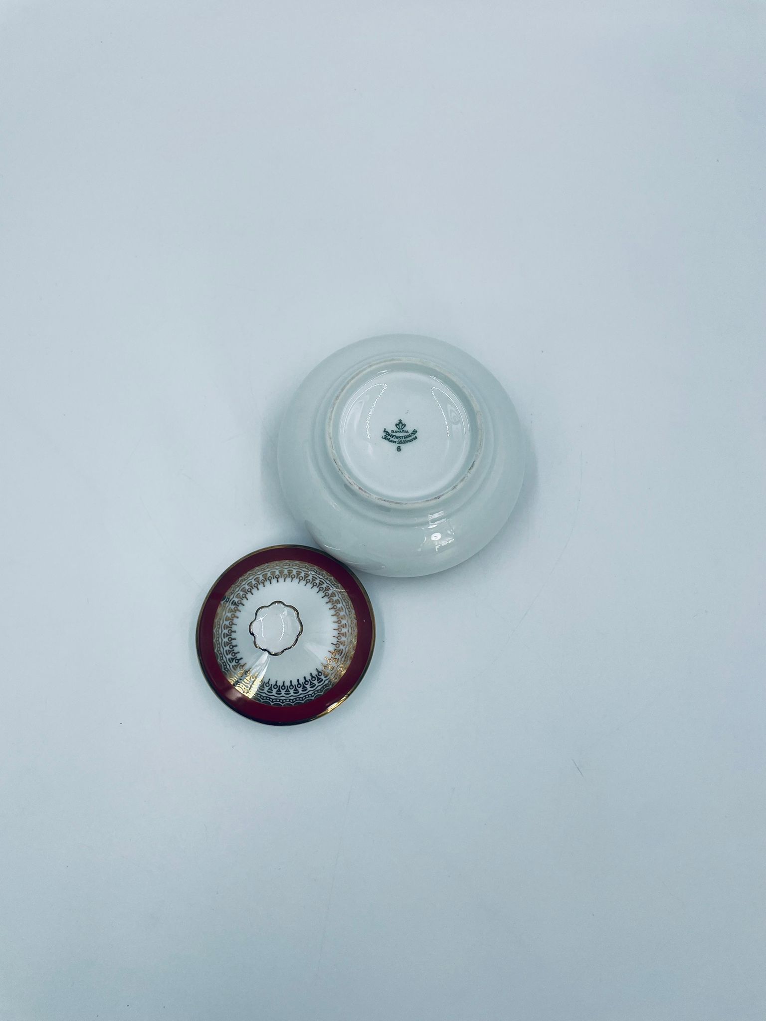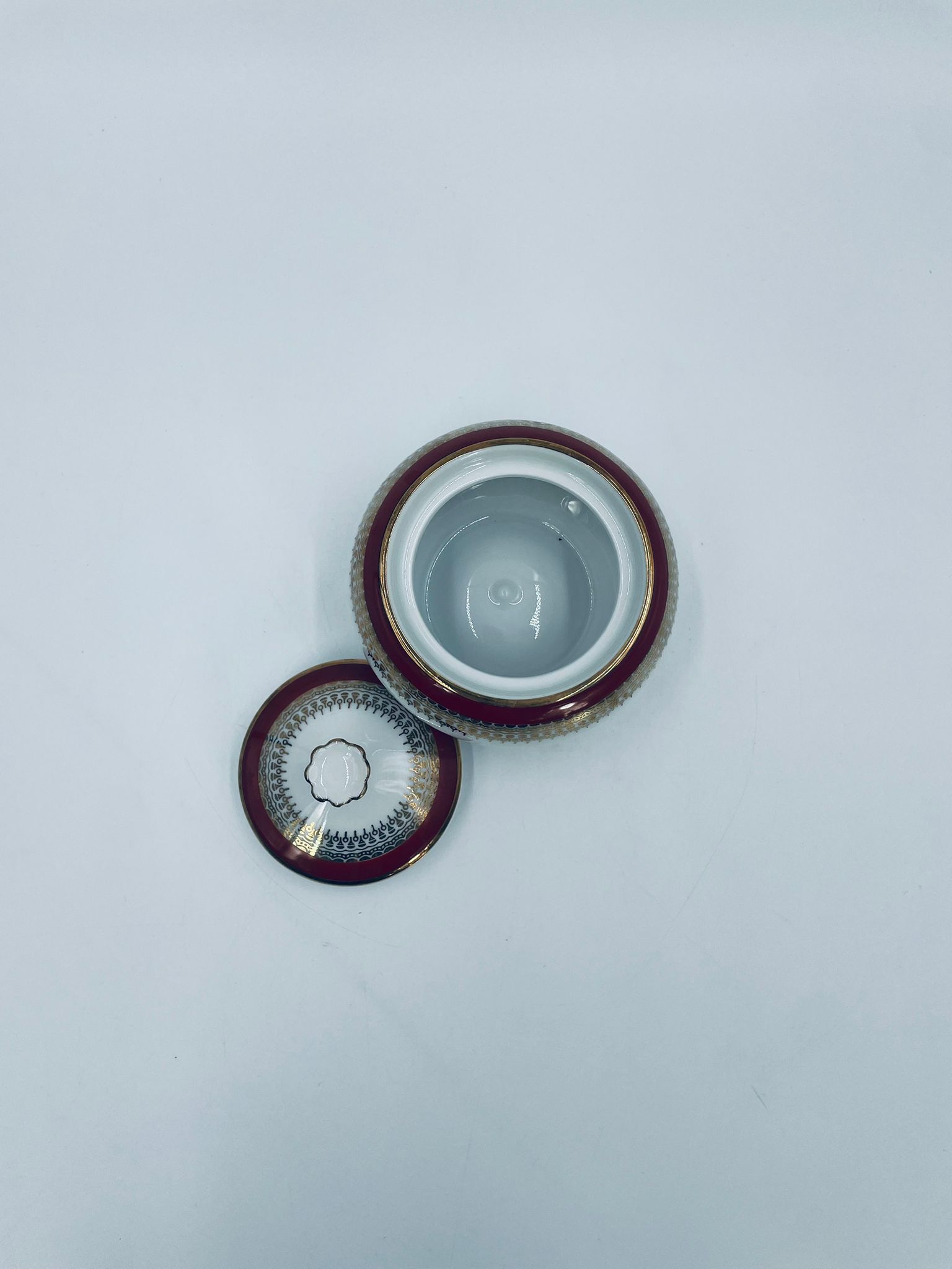 Cukiernica wytwórni Johann Seltmann Vohenstrauss, wykonana z wysokiej jakości białej porcelany. Cukiernica z pokrywą i ozdobnym uchwytem, charakteryzuje się misternym i eleganckim wzorem w złotym kolorze oraz czerwonym pasem, wykończony złoceniem na krawędzi. Posiada przetarcie na złoceniu.