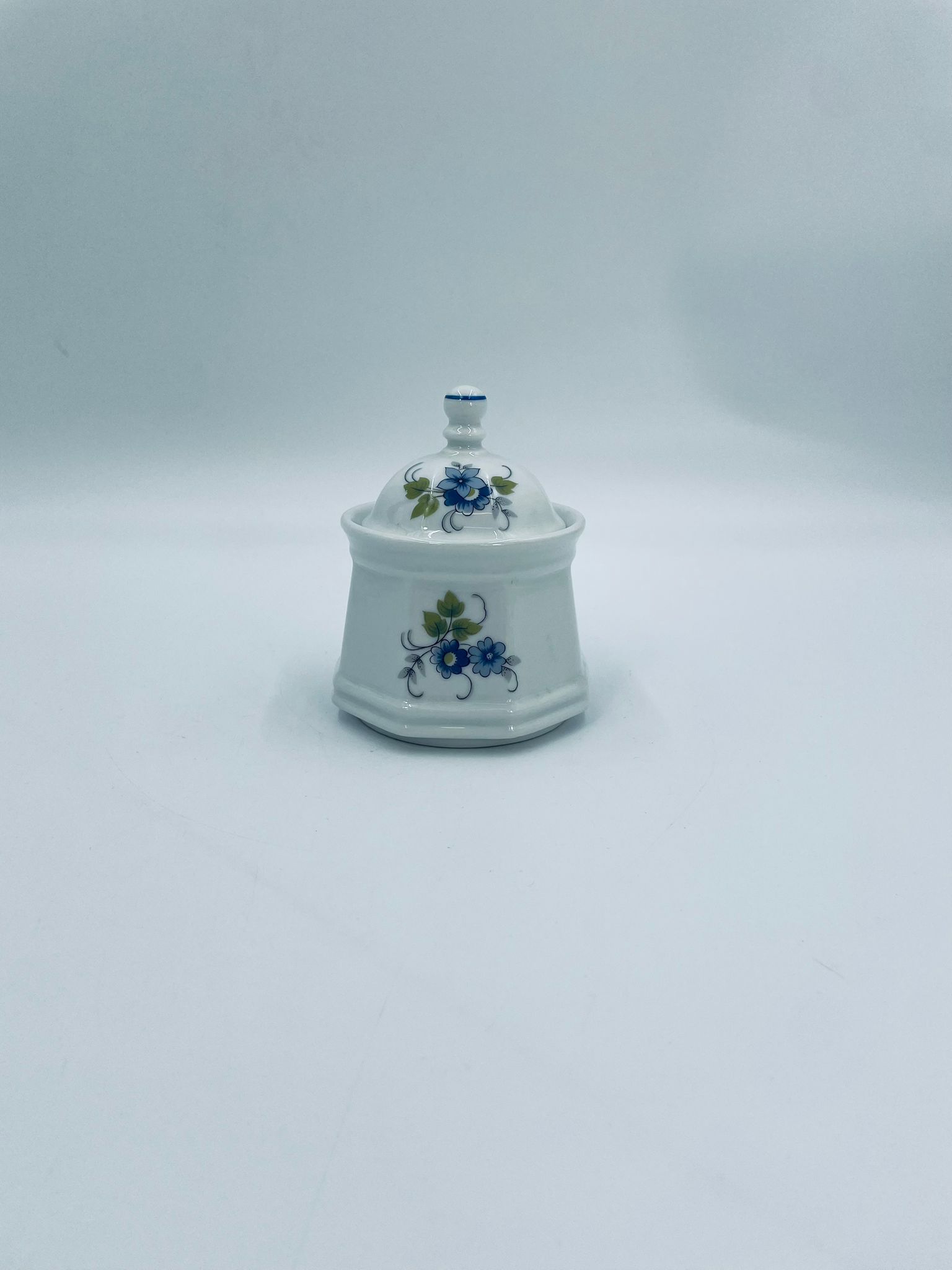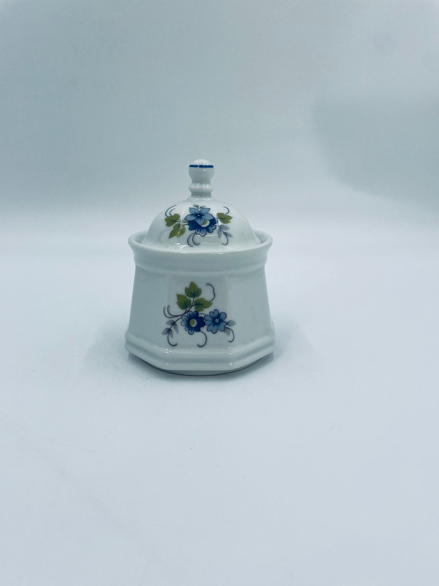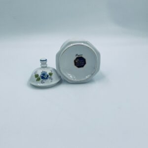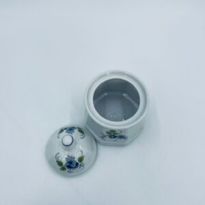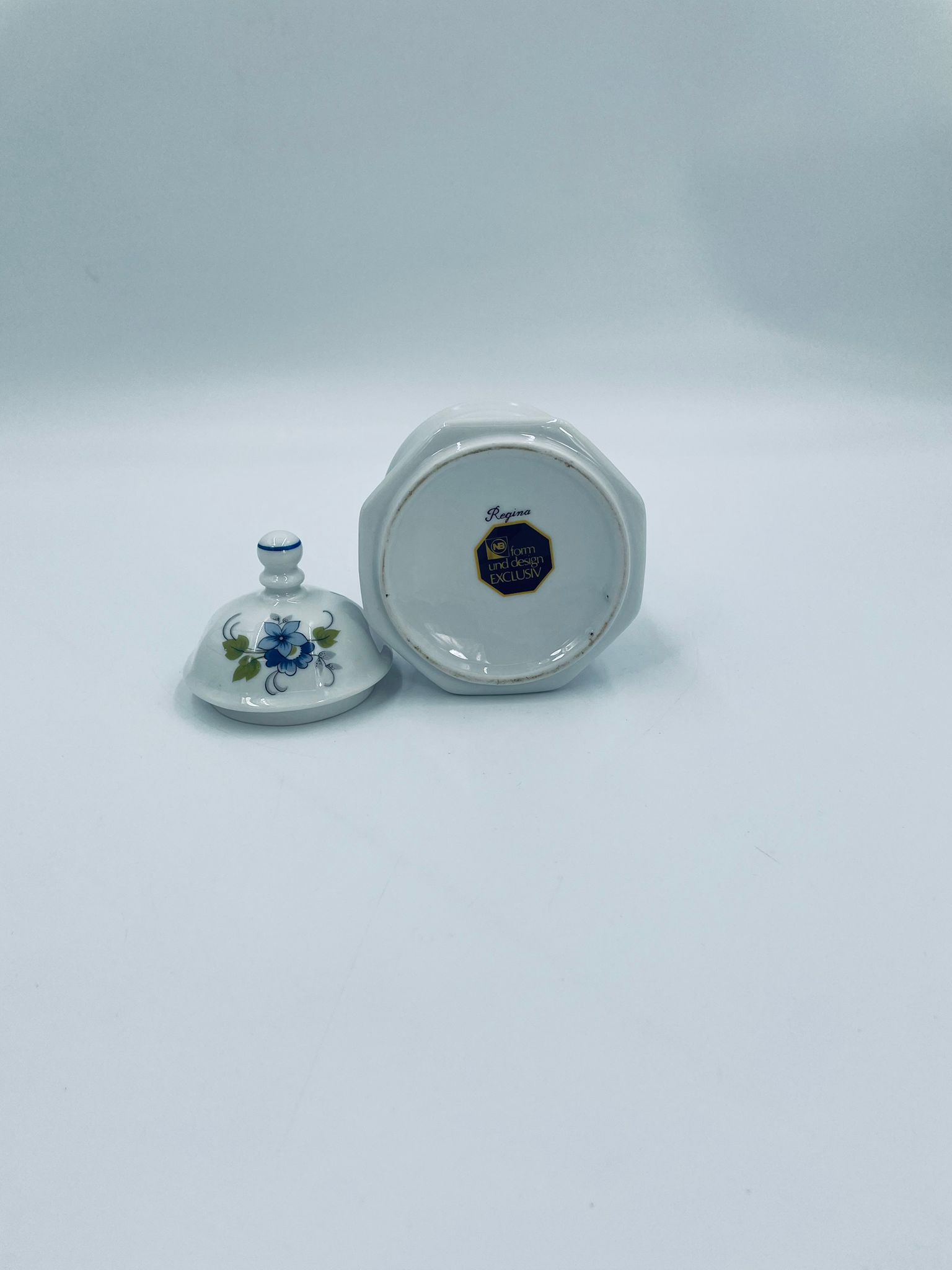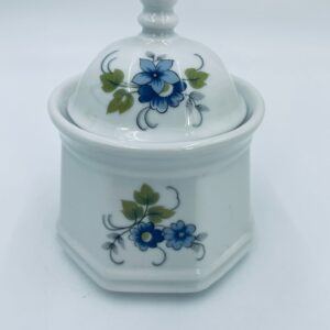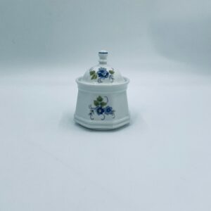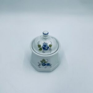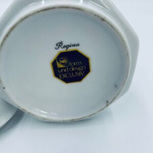 Cukiernica wytwórni Regina NB z lini „Form und design exclusiv”, wykonana z najwyższej jakości białej porcelany. Cukiernica posiada wielokątny korpus, dekoracyjna pokrywę, charakteryzuje się pięknym, delikatnym wzorem niebieskich kwiatuszków z zielono-szarymi listkami.
