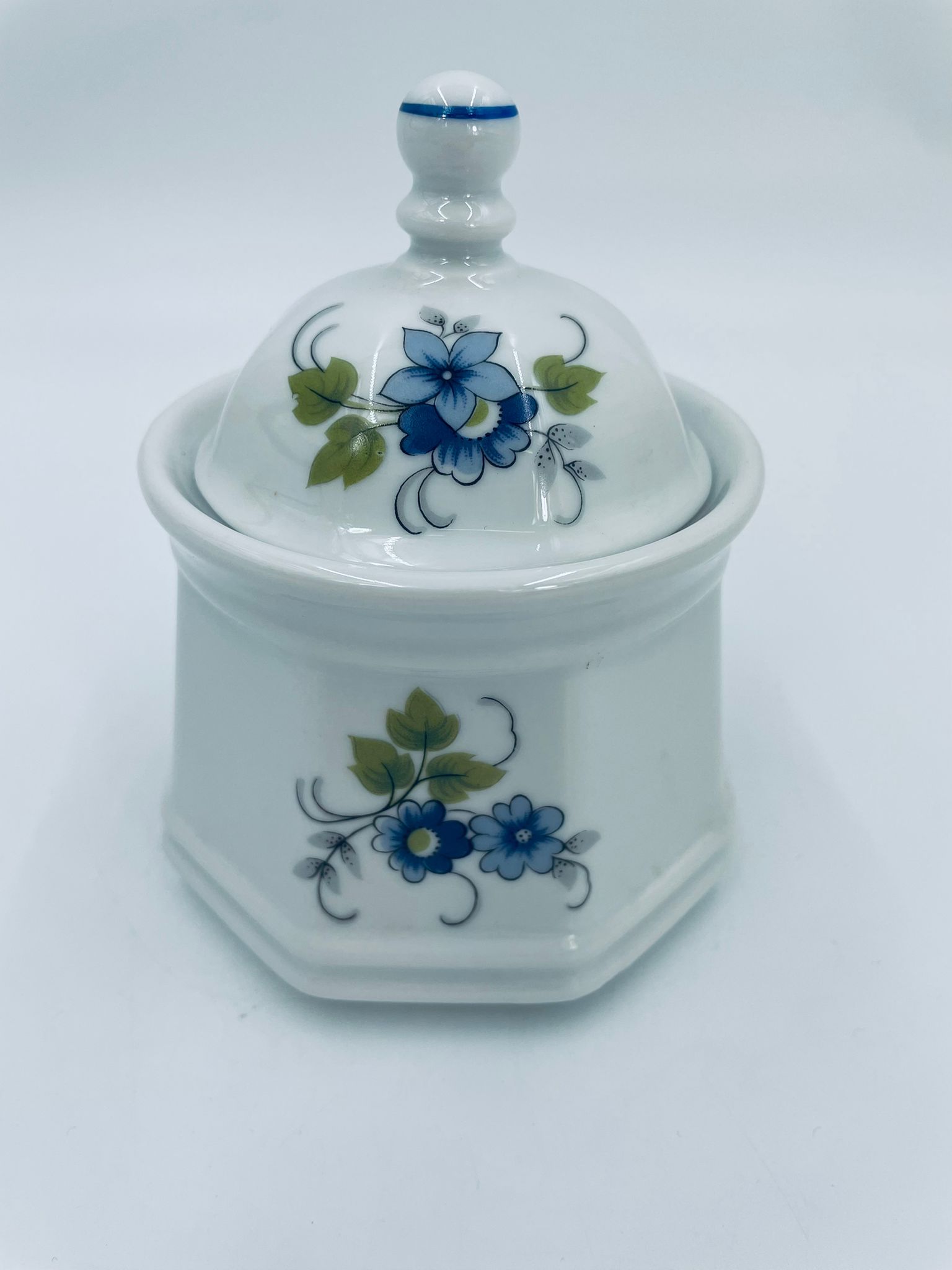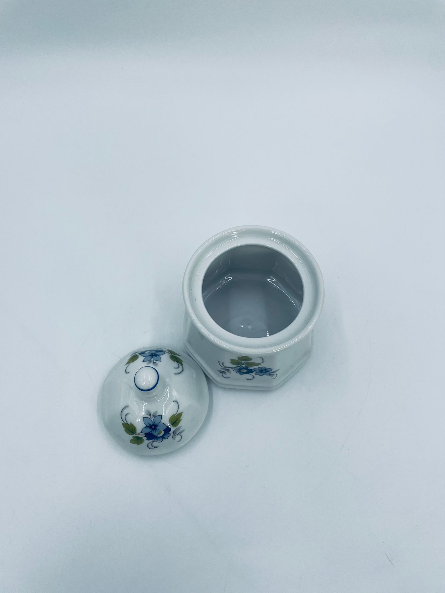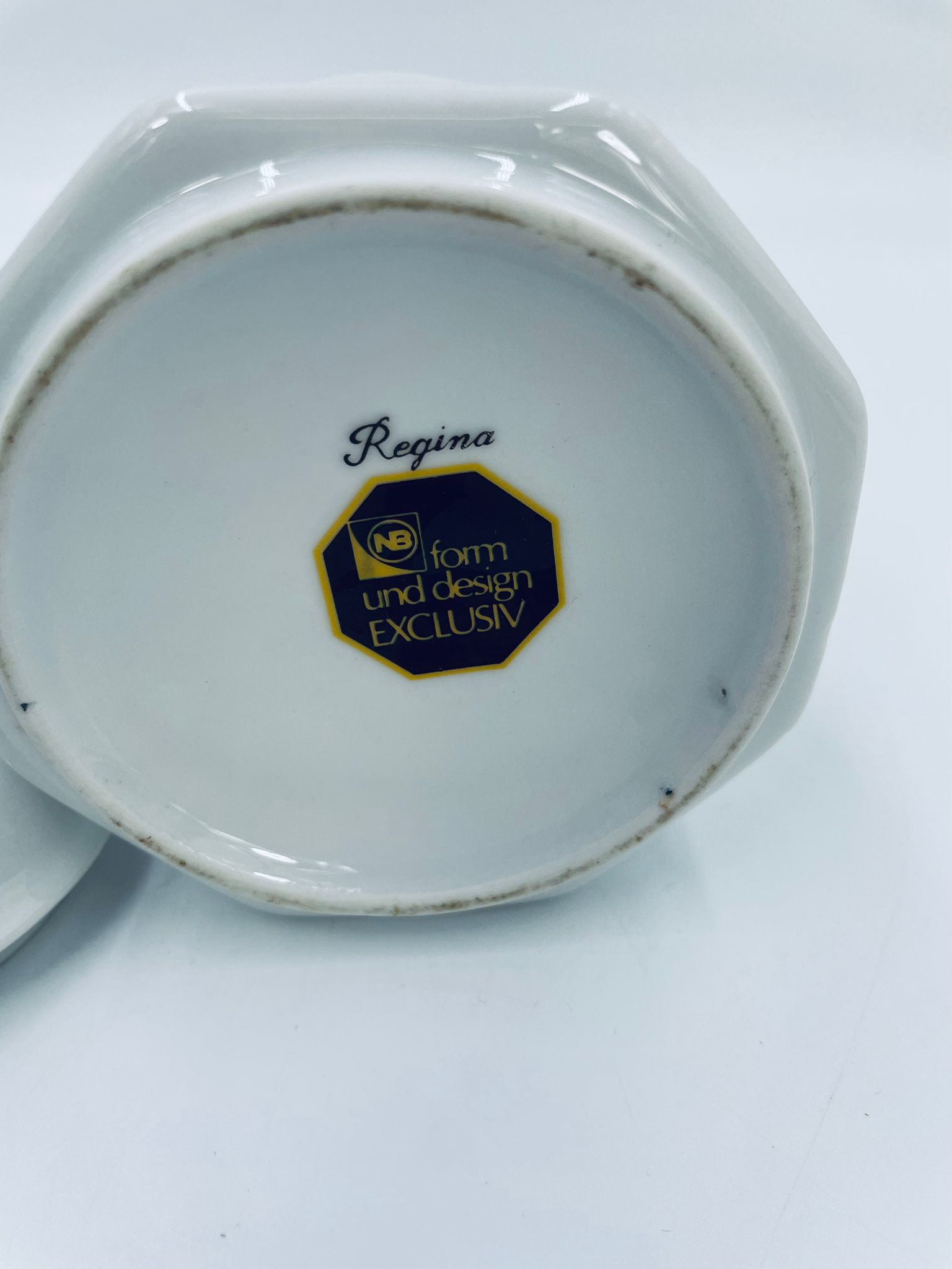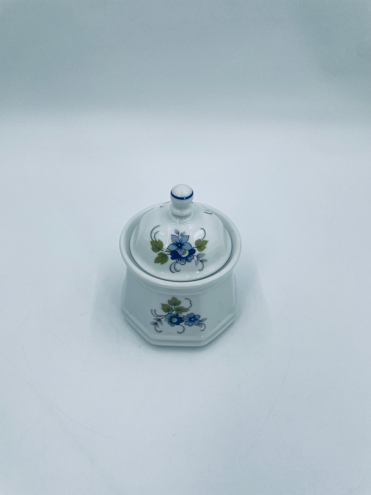 Cukiernica wytwórni Regina NB z lini „Form und design exclusiv”, wykonana z najwyższej jakości białej porcelany. Cukiernica posiada wielokątny korpus, dekoracyjna pokrywę, charakteryzuje się pięknym, delikatnym wzorem niebieskich kwiatuszków z zielono-szarymi listkami.