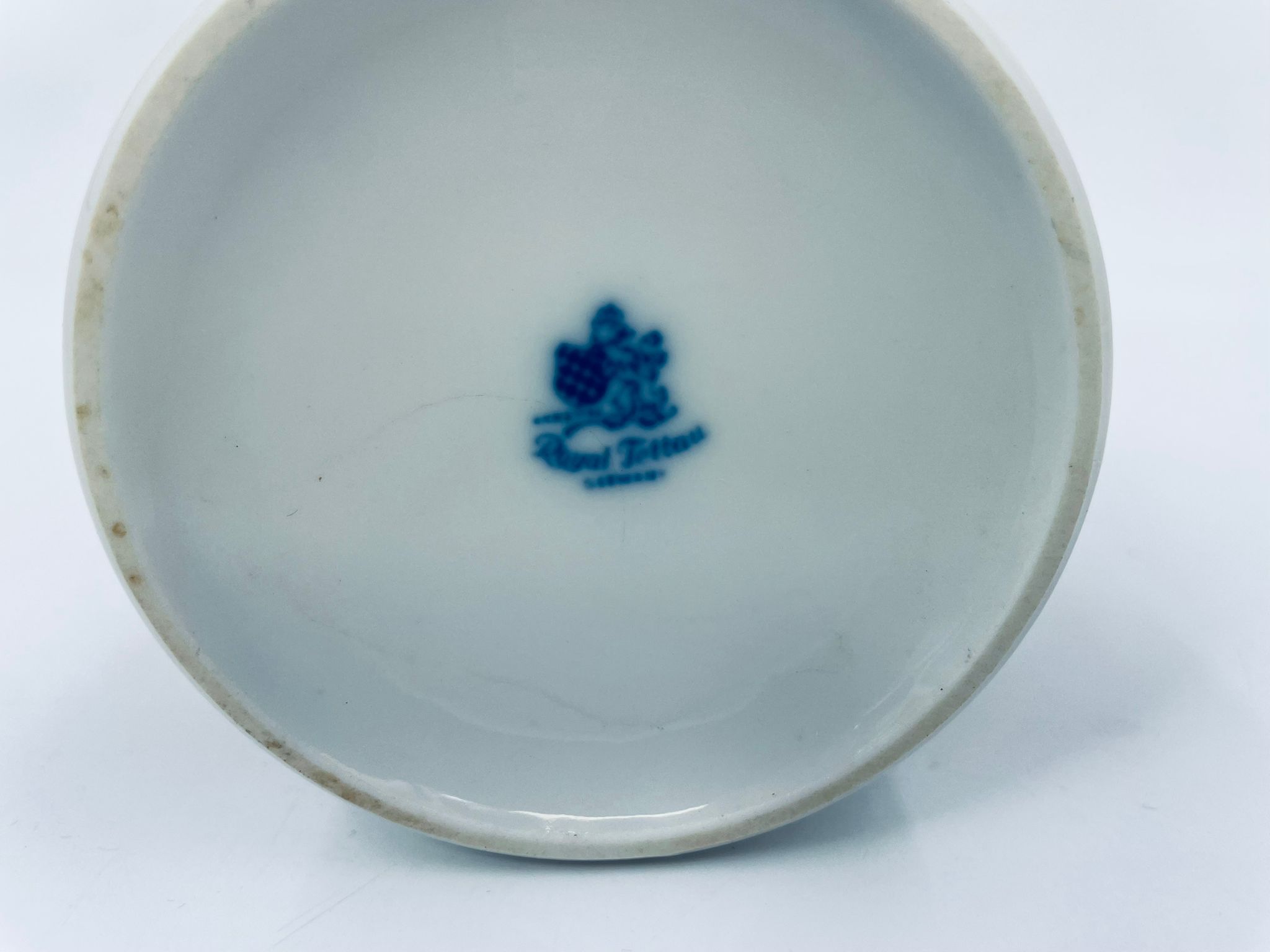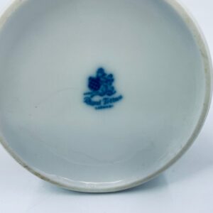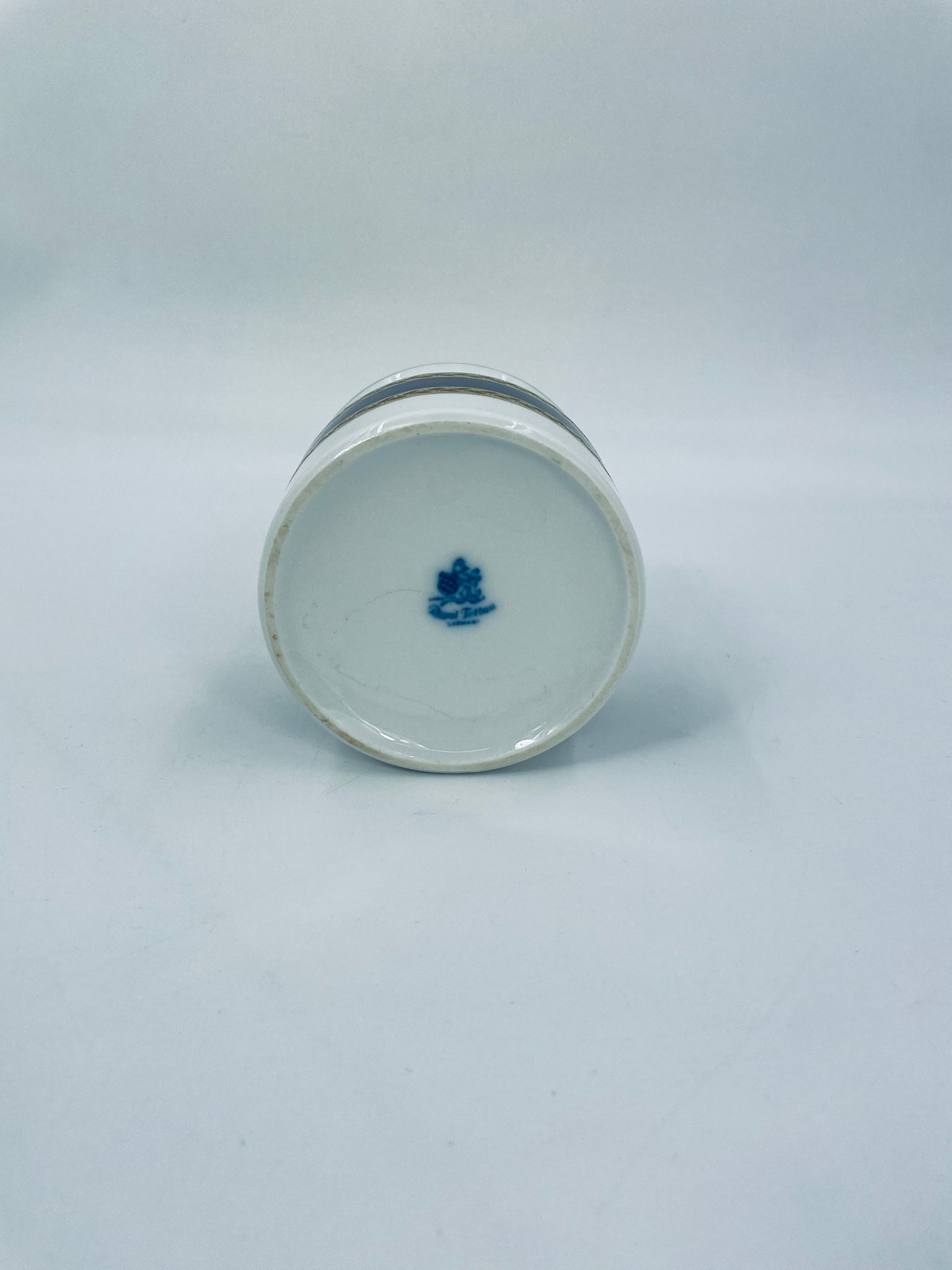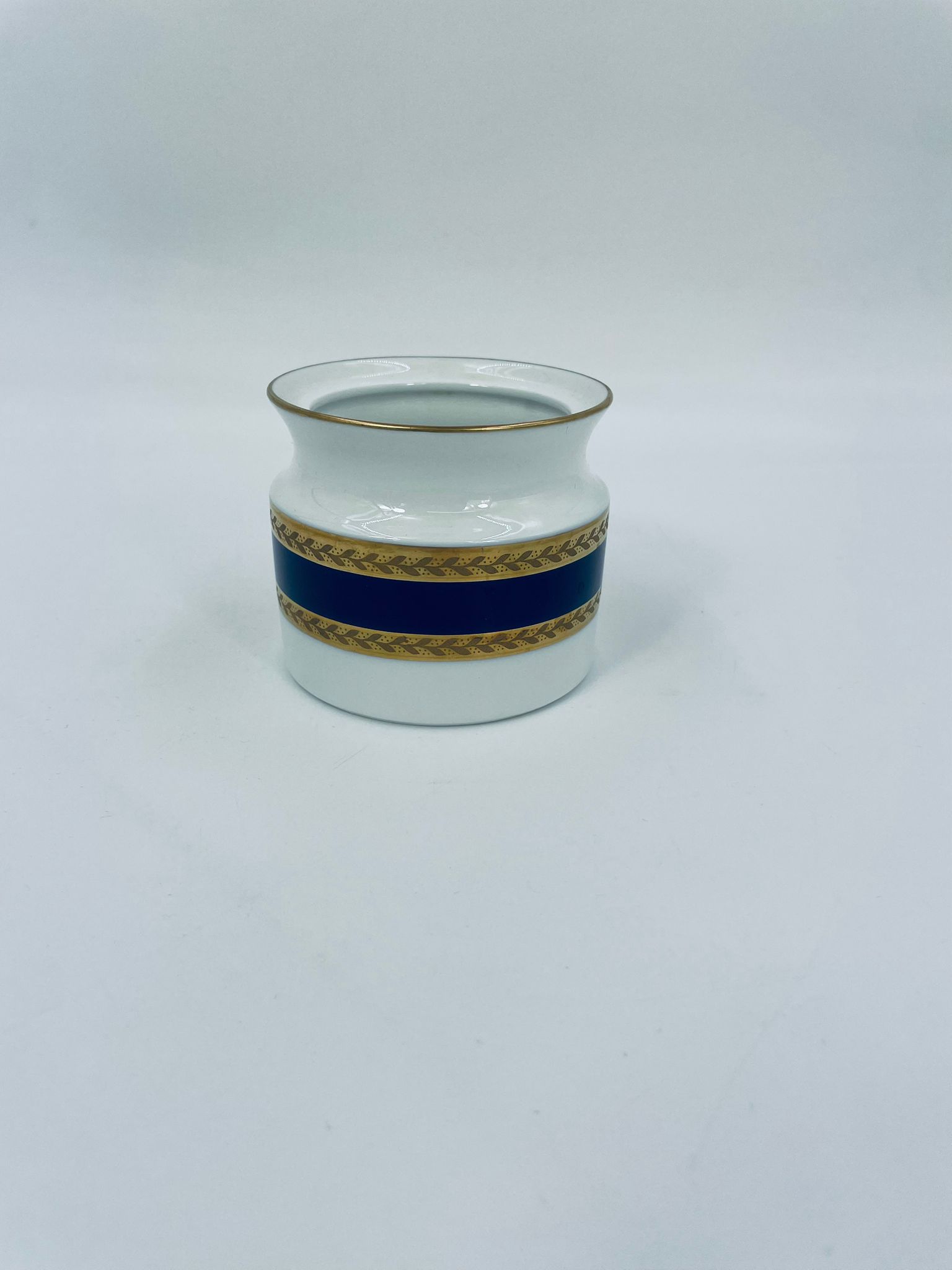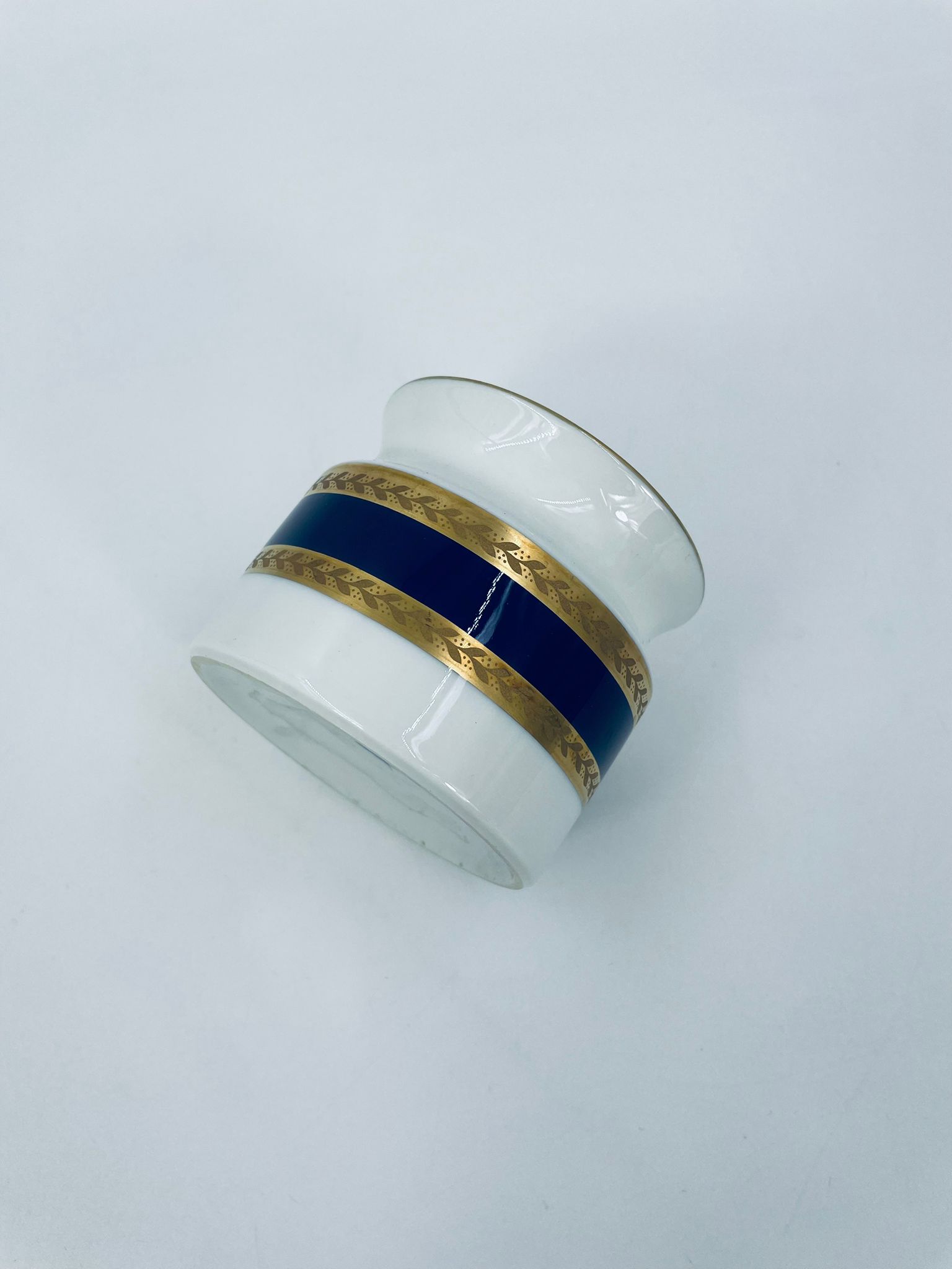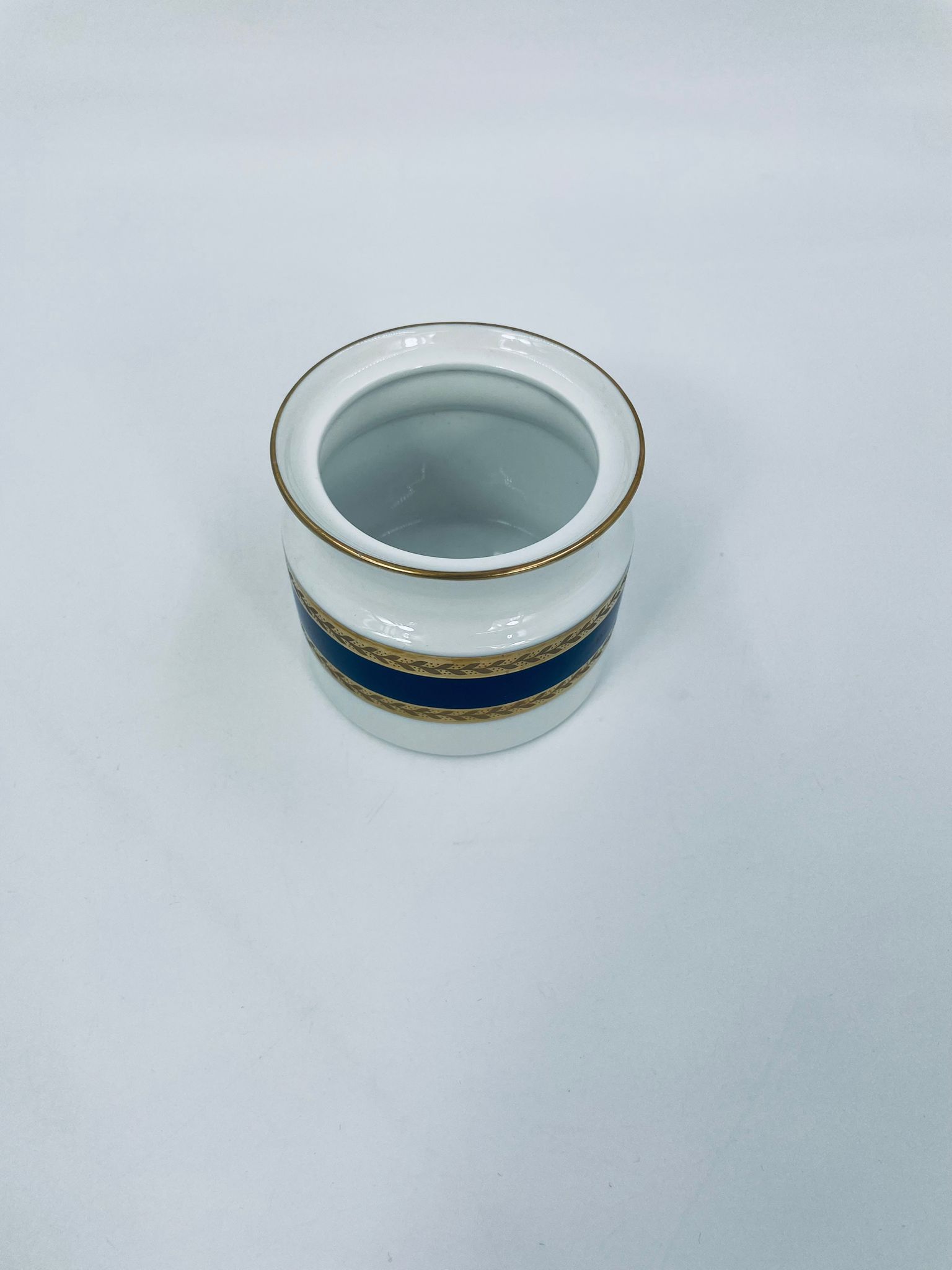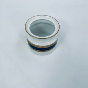 Cukiernica wytwórni Royal Tettau, wykonana z wysokiej jakości białej porcelany. Cukiernica ozdobiona jest szerokim, kobaltowo-niebieskim pasem, wykończona złoceniem ze wzorem liści.