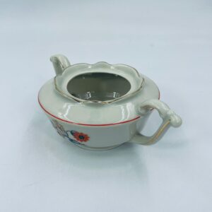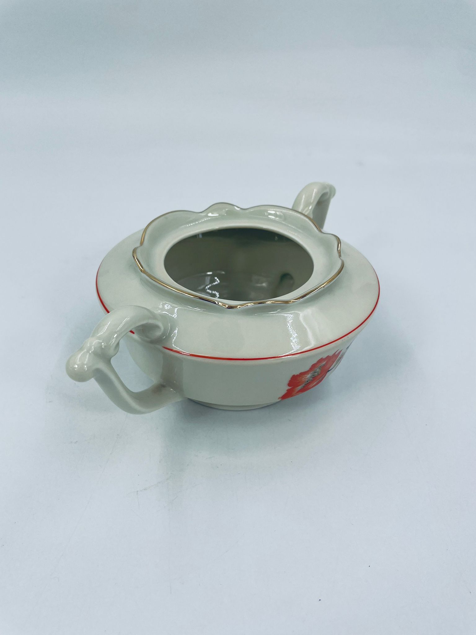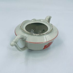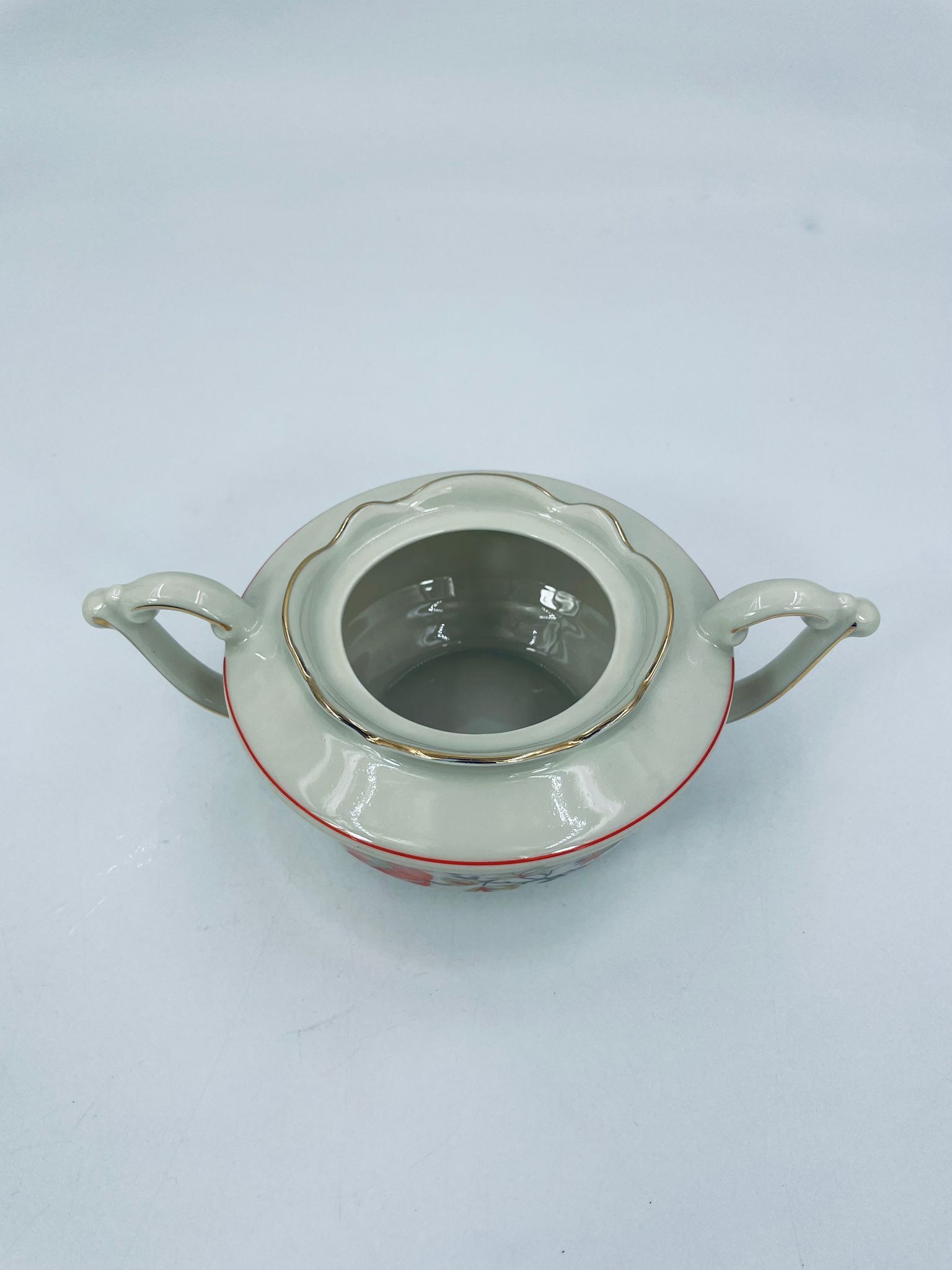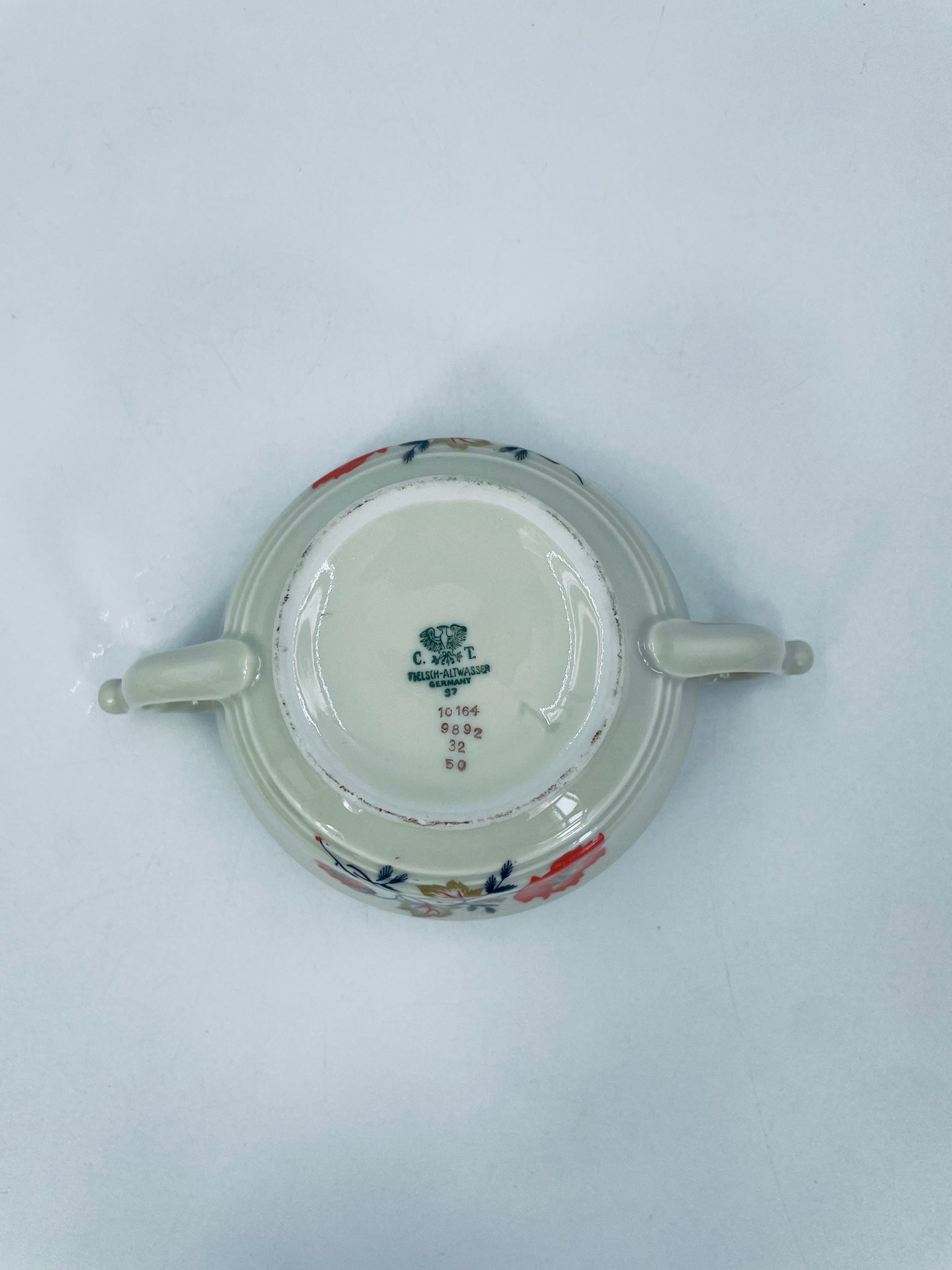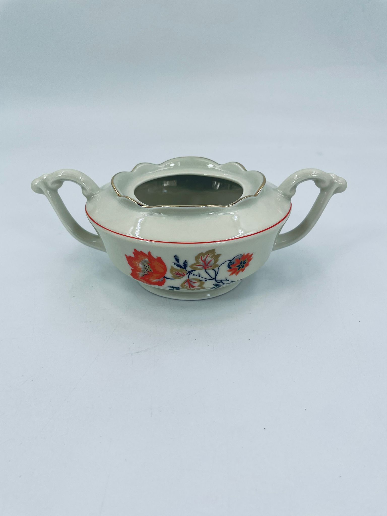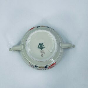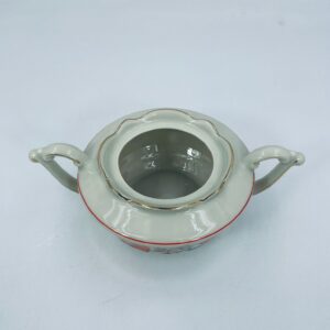 Cukiernica wytwórni Tielsch Altwasser z wysokiej jakości porcelany w kolorze ecru. Motywem na cukiernicy są pomarańczowe kwiaty na czarnych łodygach ze złotymi liśćmi, wykończony złoceniami na rantach.