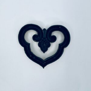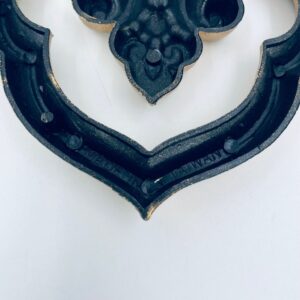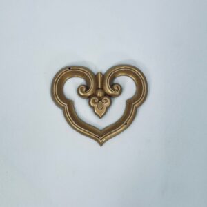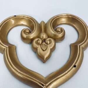 Dekoracja produkowana w Tajwanie w stylu Rococo, wykonana z plastiku. Dekoracja w złotym kolorze, w kształcie serca z ozdobnymi zawiniętymi krawędziami i centralnym motywem przypominający kwiat. Tego typu detale wykorzystuje się do upiększania luster, mebli, nadając im luksusowy i wyrafinowany charakter, pasujący do różnych aranżacji wnętrz.