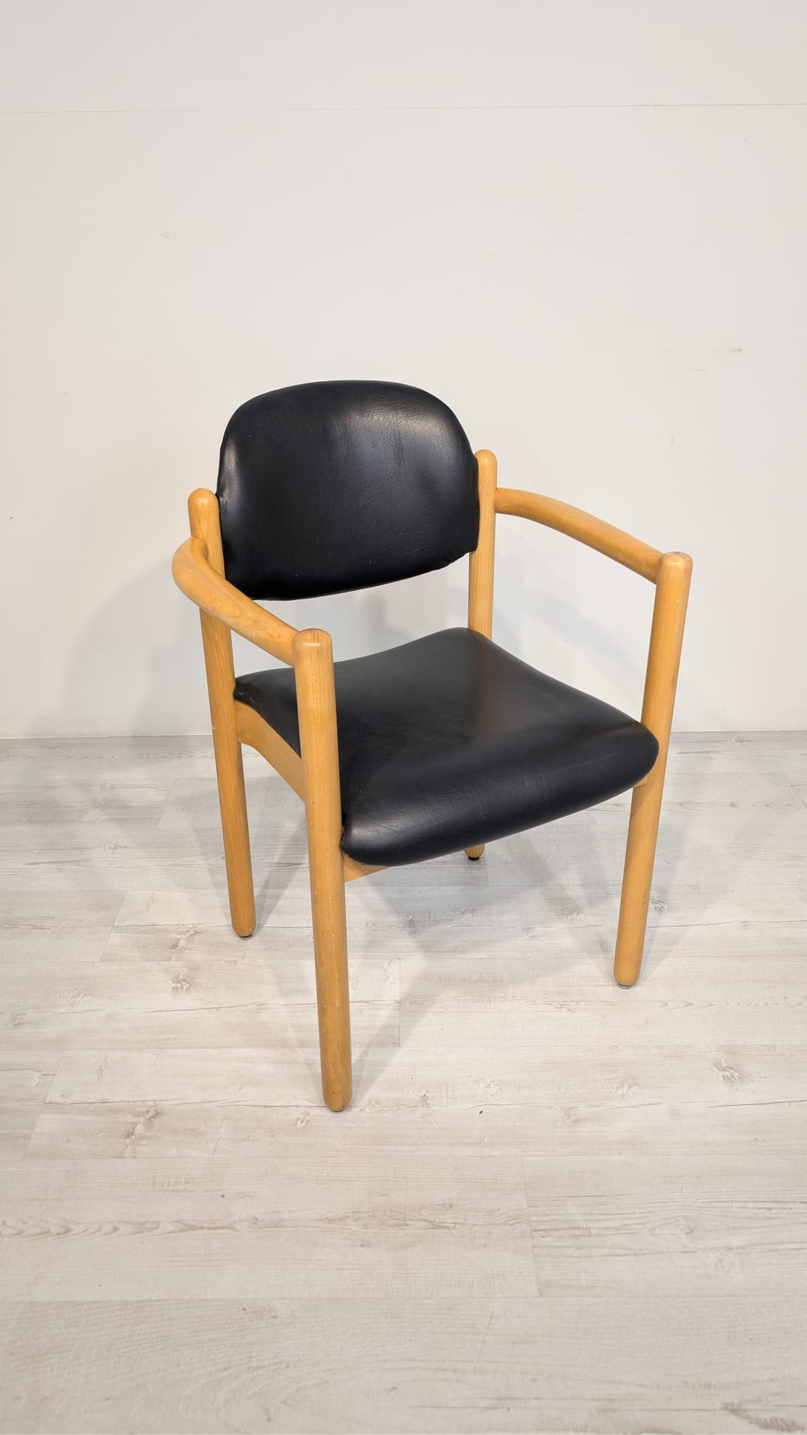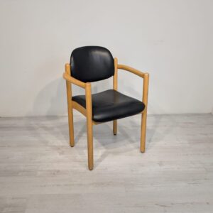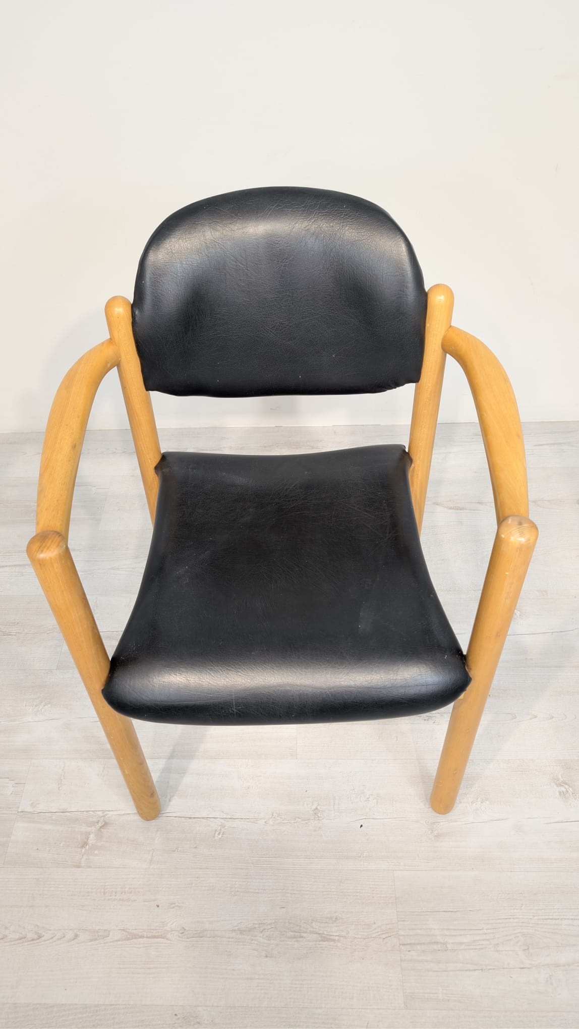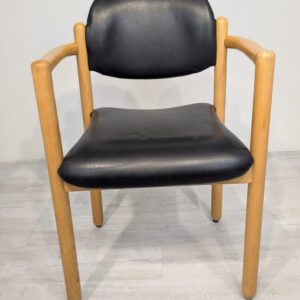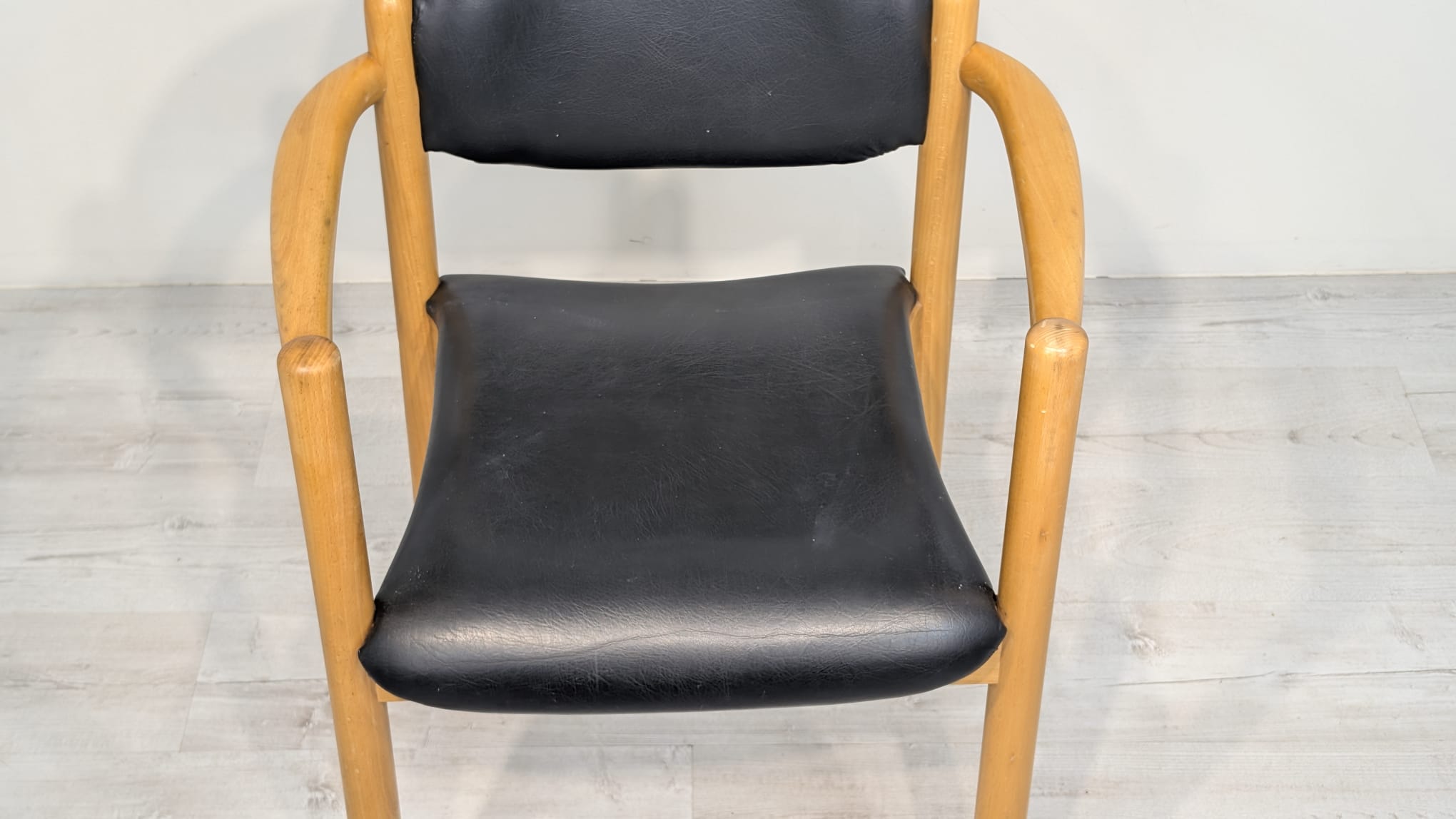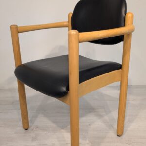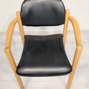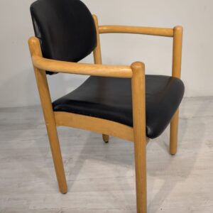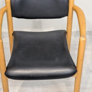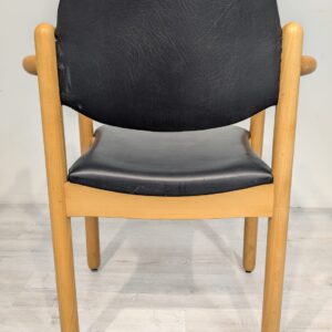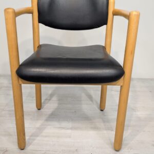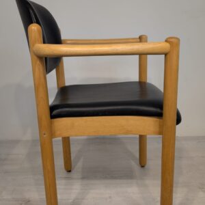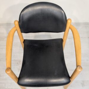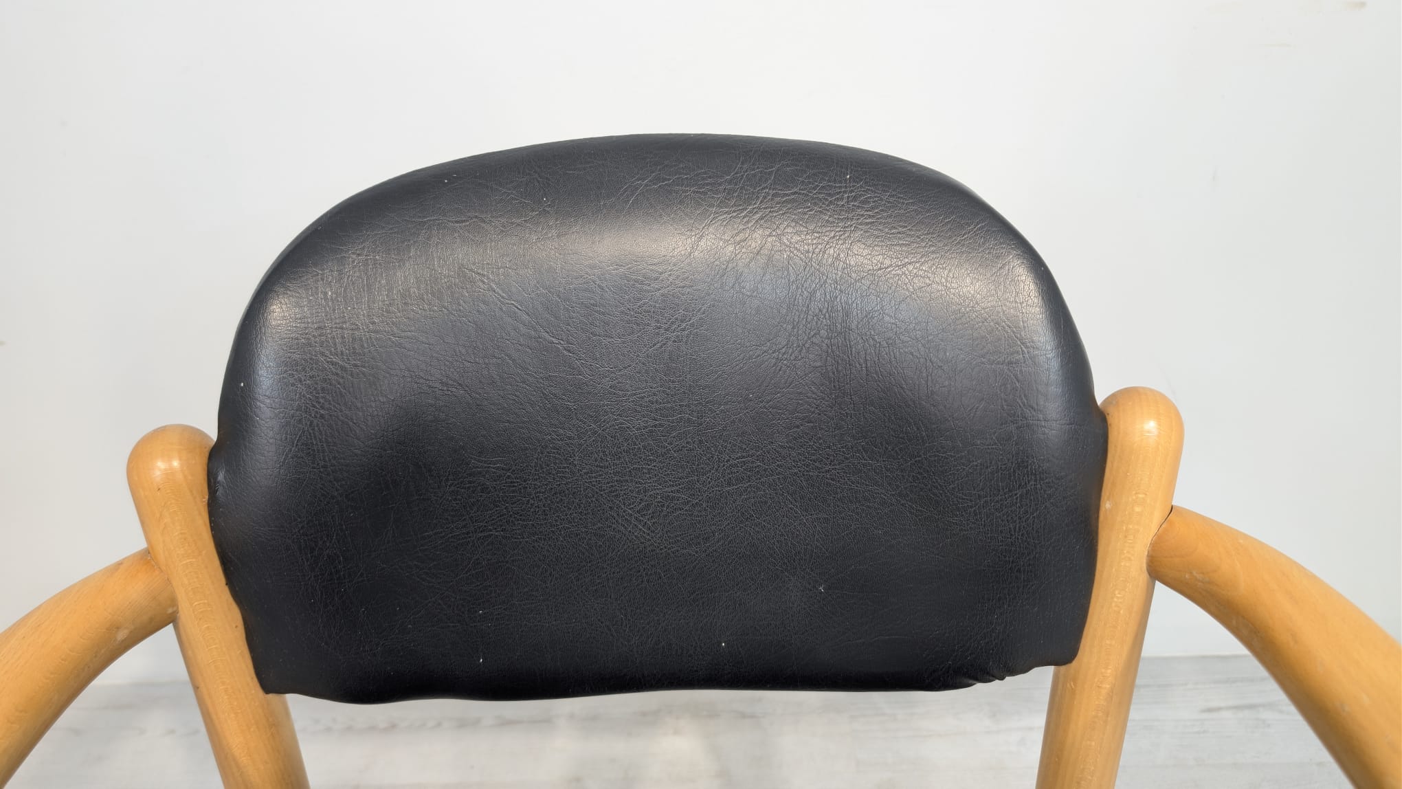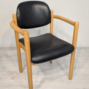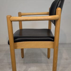 Solidny, drewniany fotel w stylu skandynawskim. Czarne, skórzane siedzisko z eko skóry i oparcie zapewniają komfort użytkowania. Drewniane, naturalne nogi dodają elegancji i ponadczasowego charakteru. Fotel idealnie sprawdzi się w salonie, gabinecie lub jadalni.