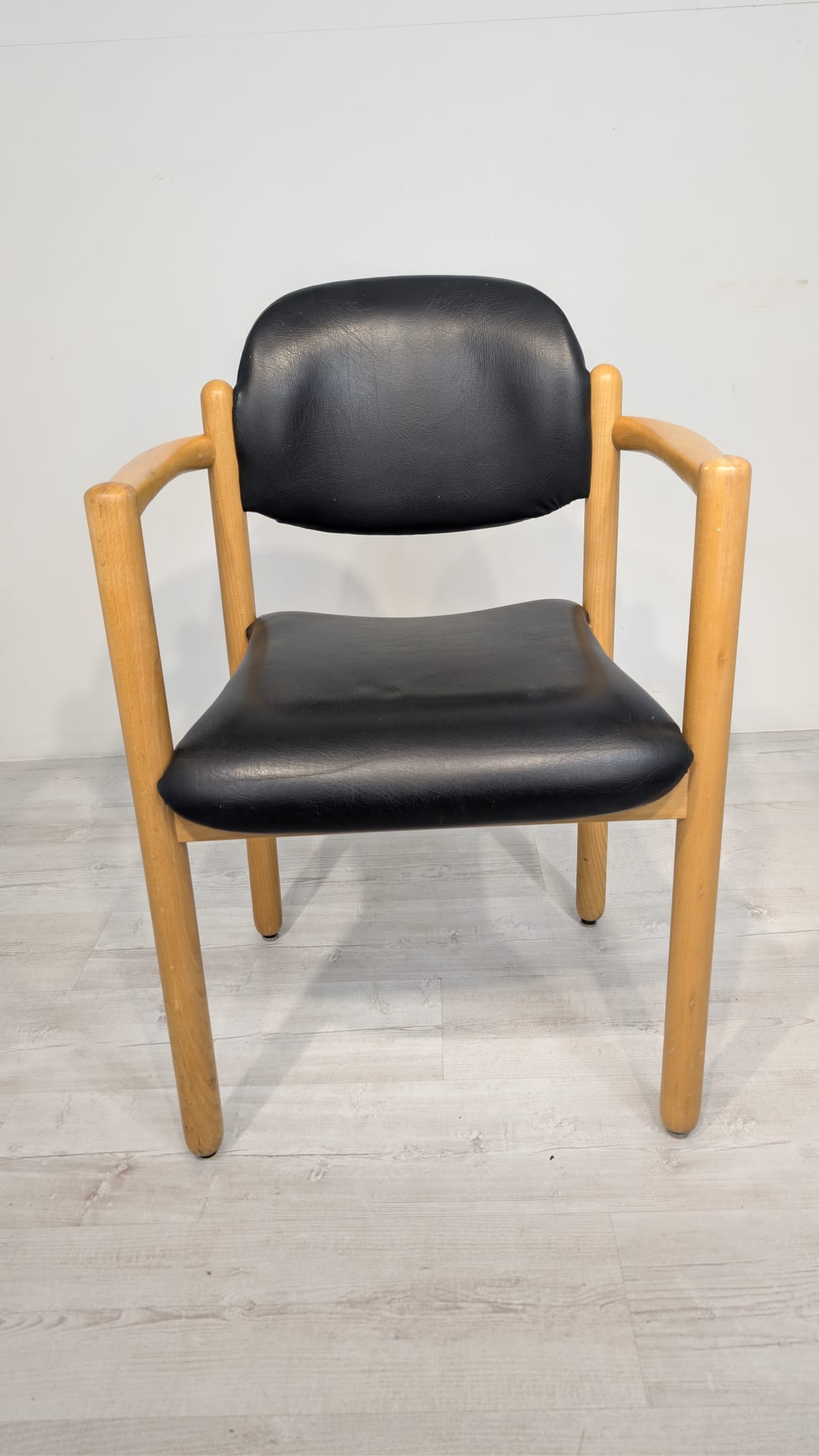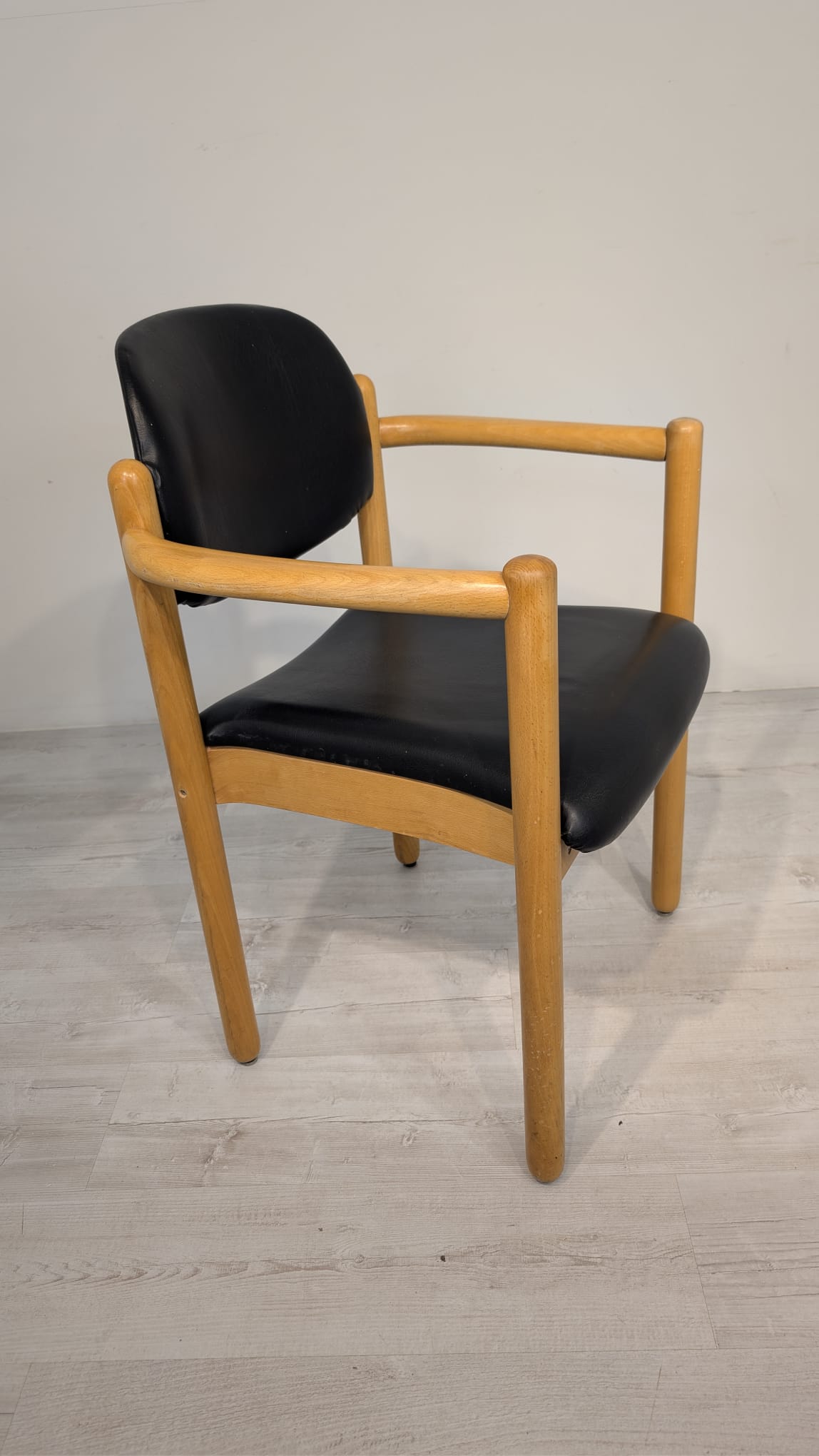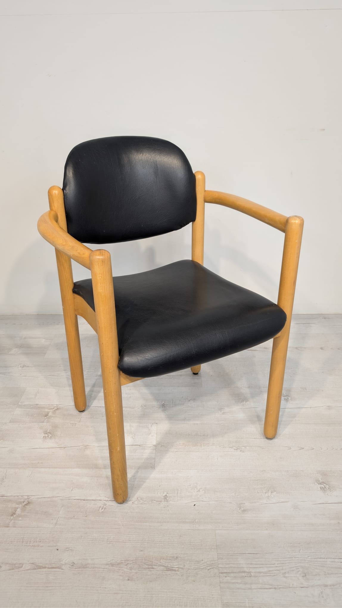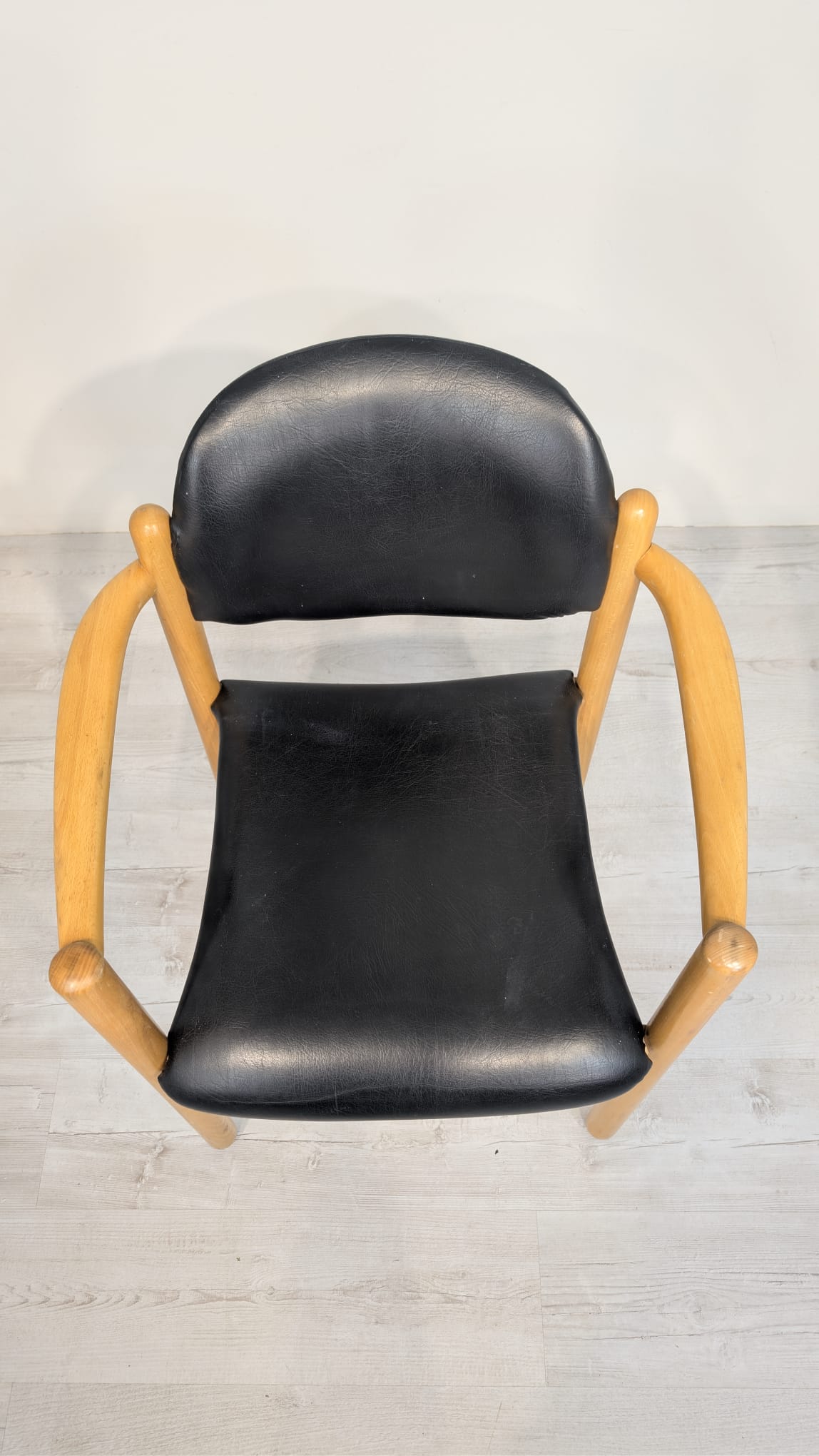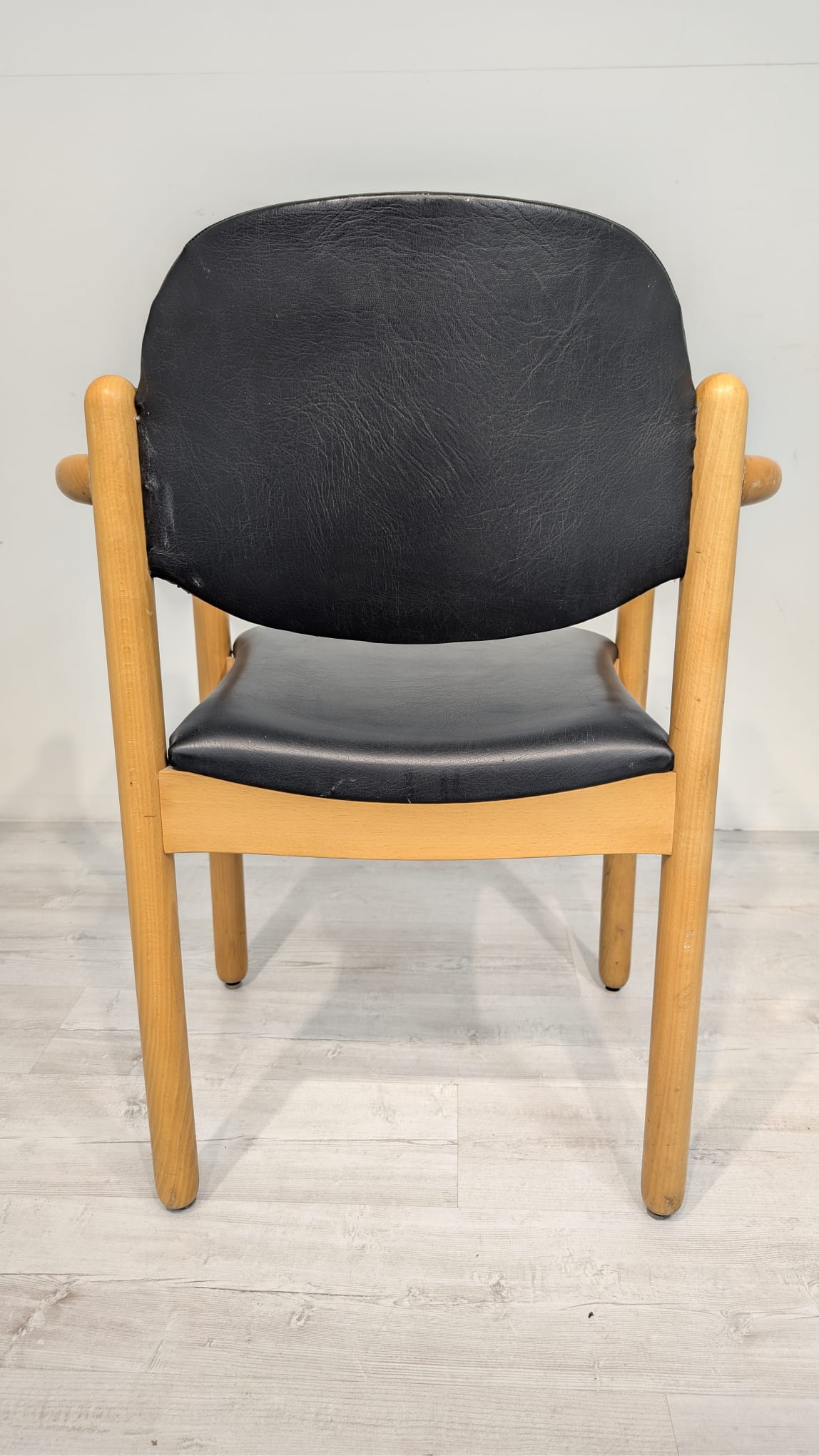 Solidny, drewniany fotel w stylu skandynawskim. Czarne, skórzane siedzisko z eko skóry i oparcie zapewniają komfort użytkowania. Drewniane, naturalne nogi dodają elegancji i ponadczasowego charakteru. Fotel idealnie sprawdzi się w salonie, gabinecie lub jadalni.
