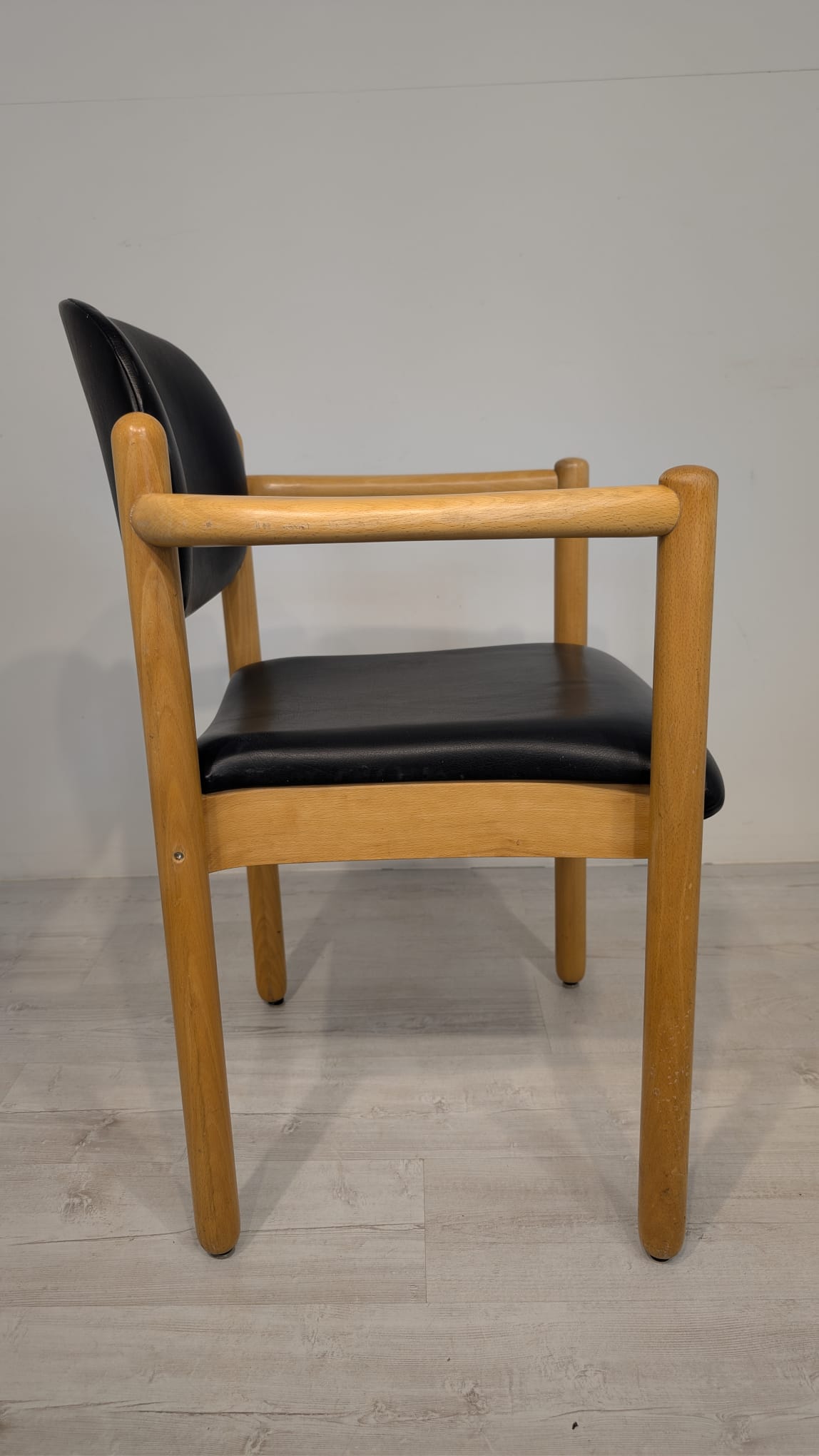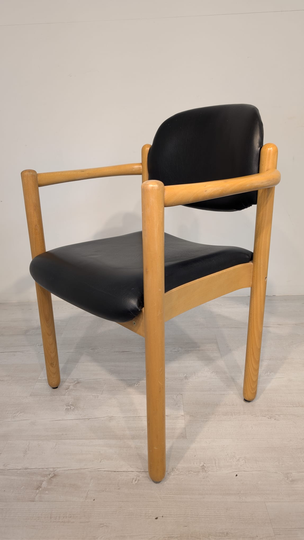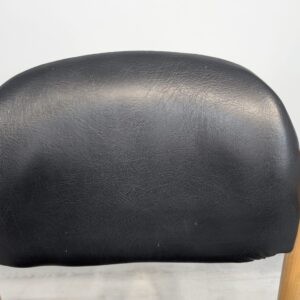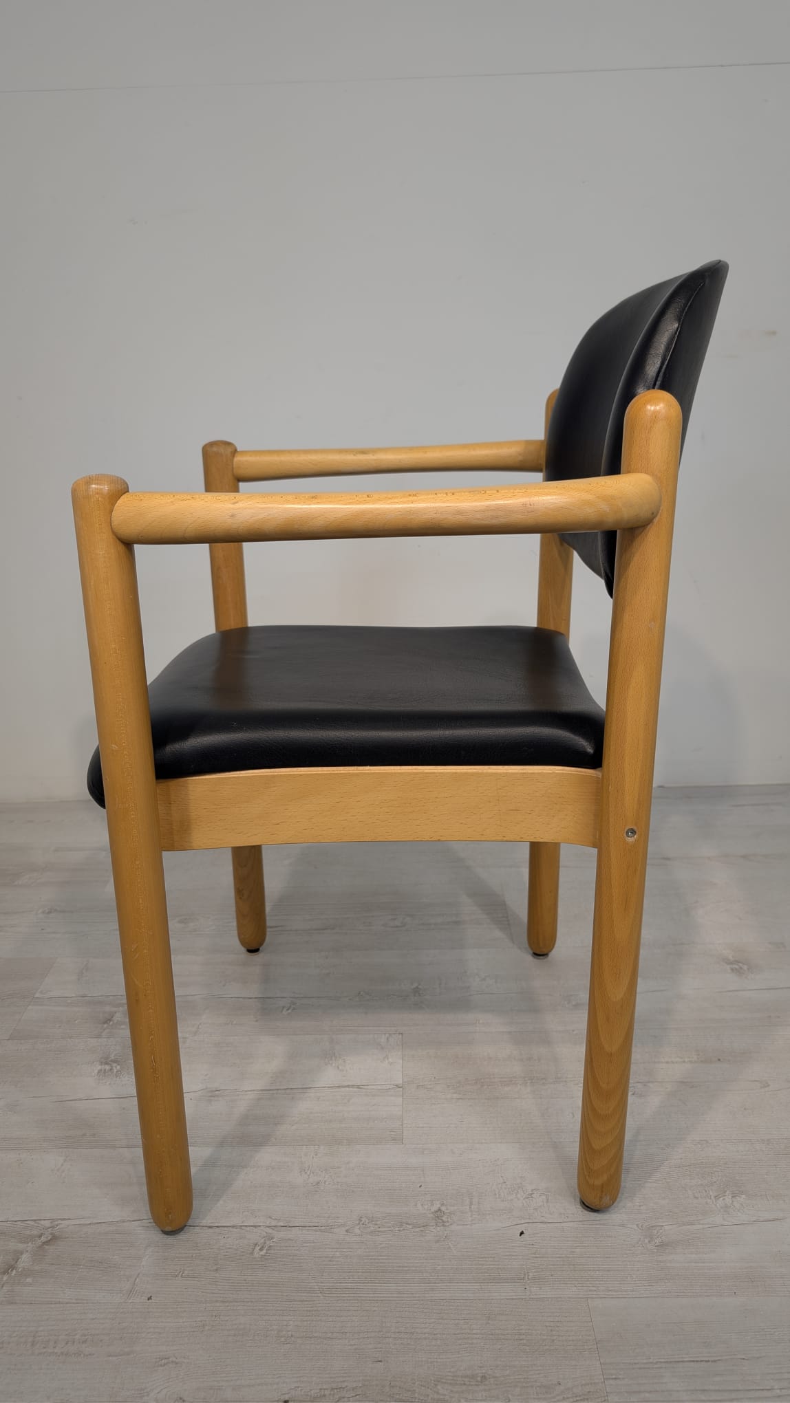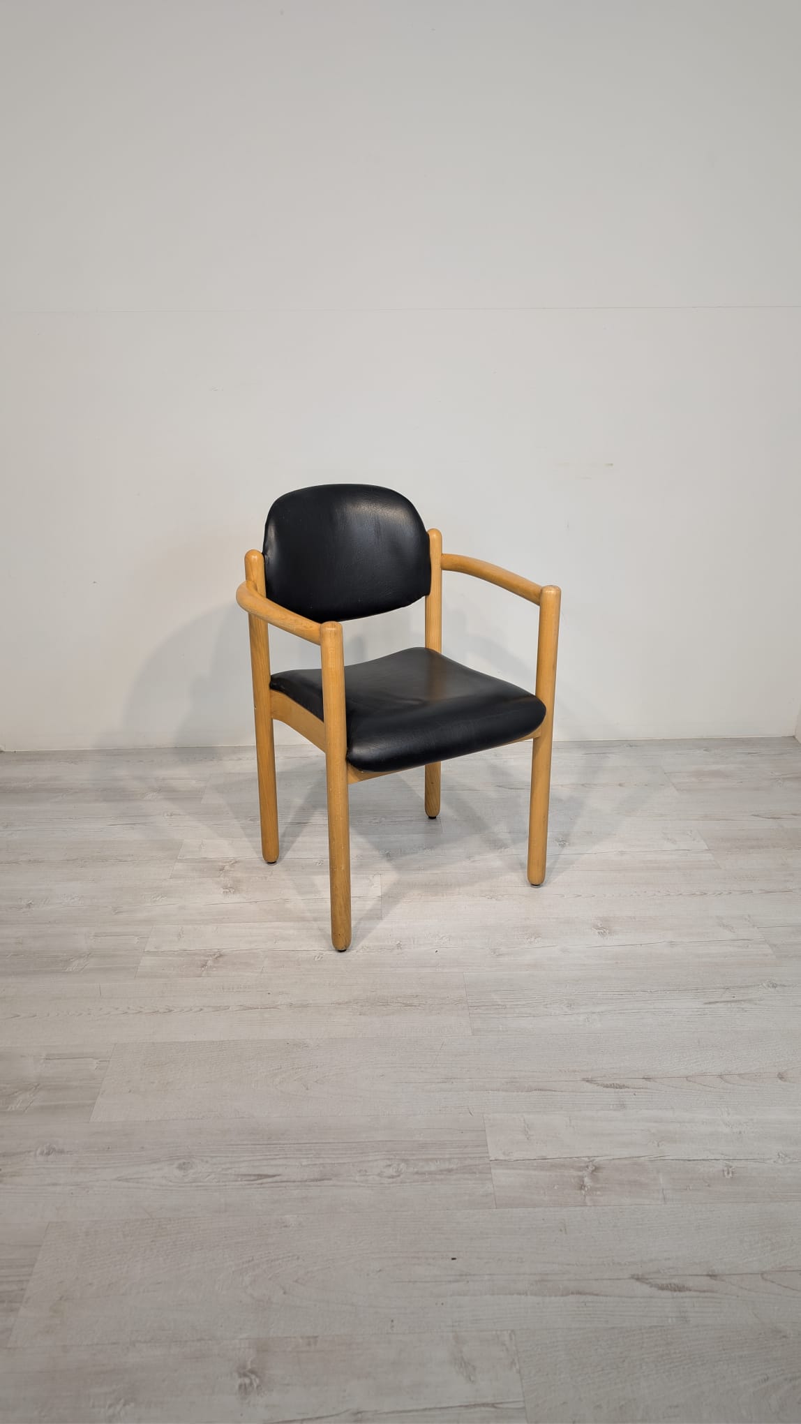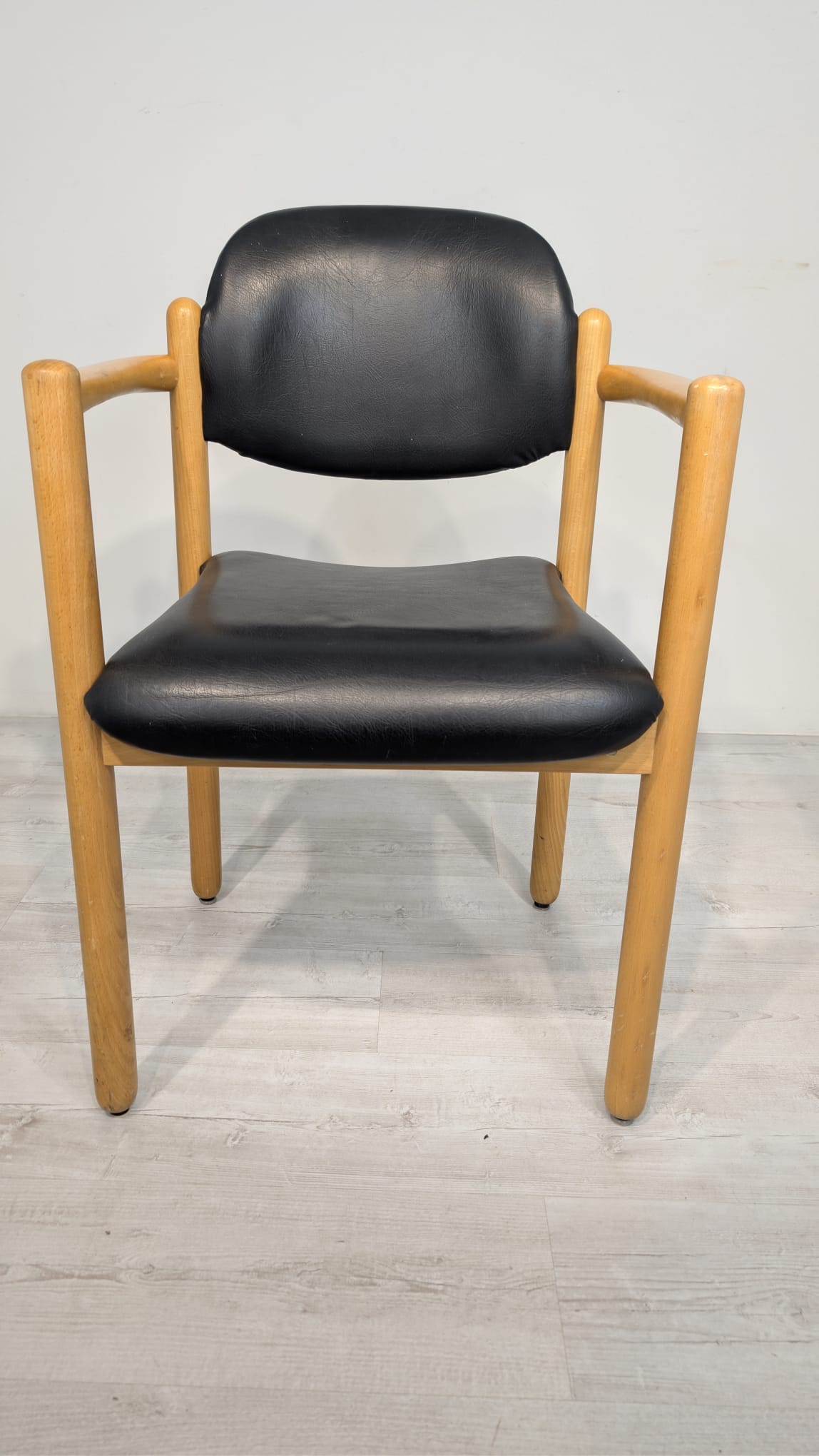 Solidny, drewniany fotel w stylu skandynawskim. Czarne, skórzane siedzisko z eko skóry i oparcie zapewniają komfort użytkowania. Drewniane, naturalne nogi dodają elegancji i ponadczasowego charakteru. Fotel idealnie sprawdzi się w salonie, gabinecie lub jadalni.
