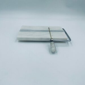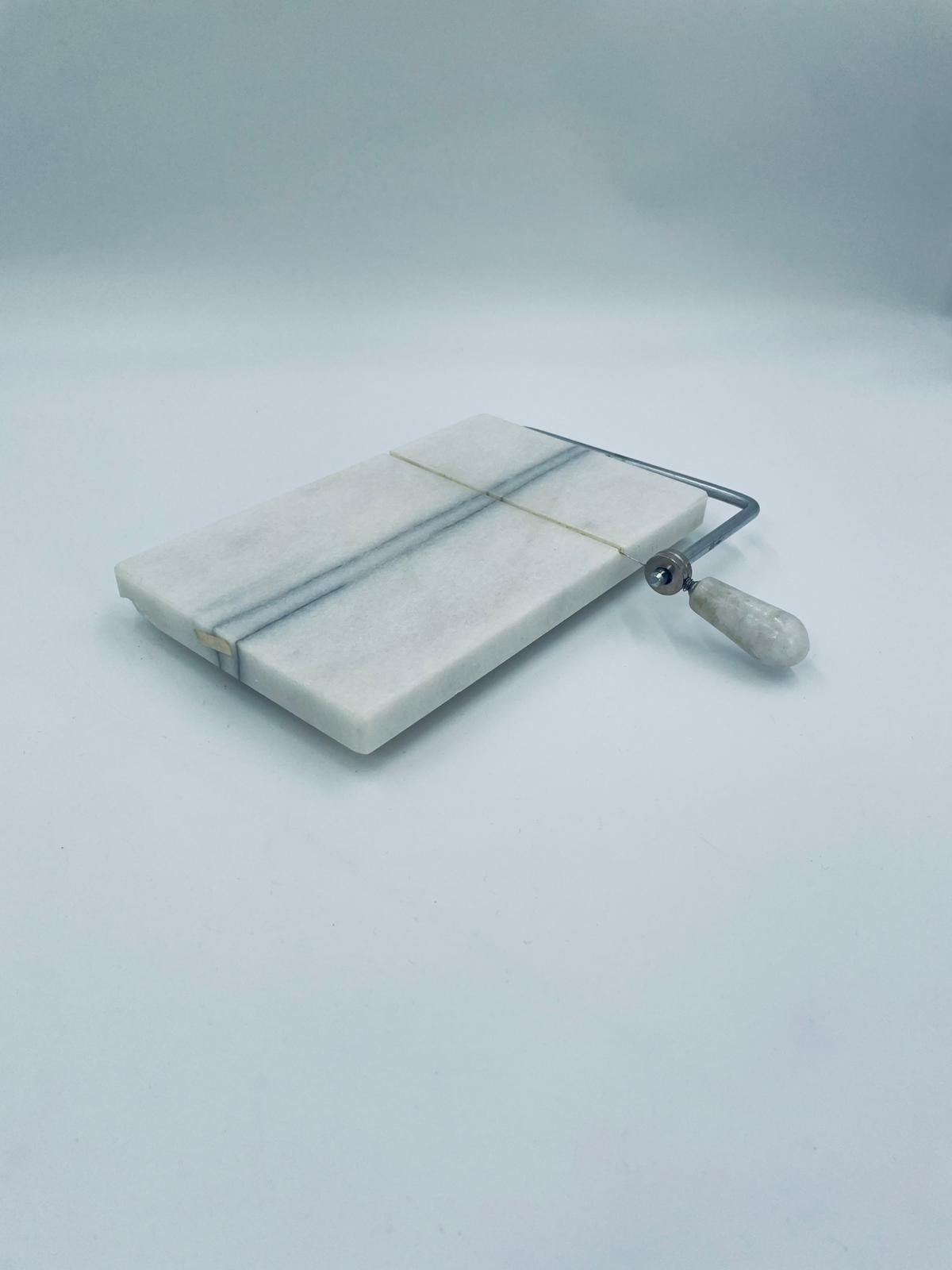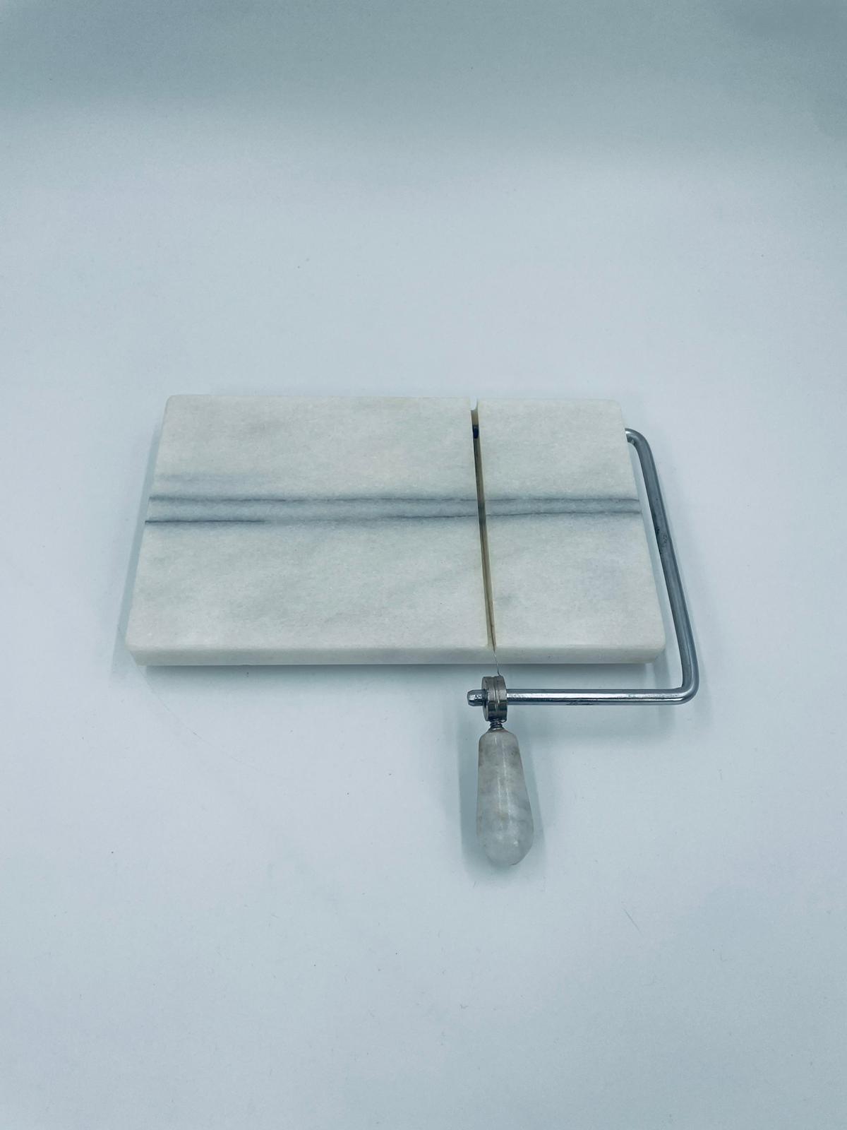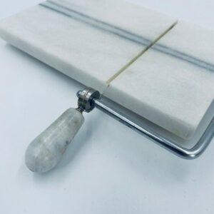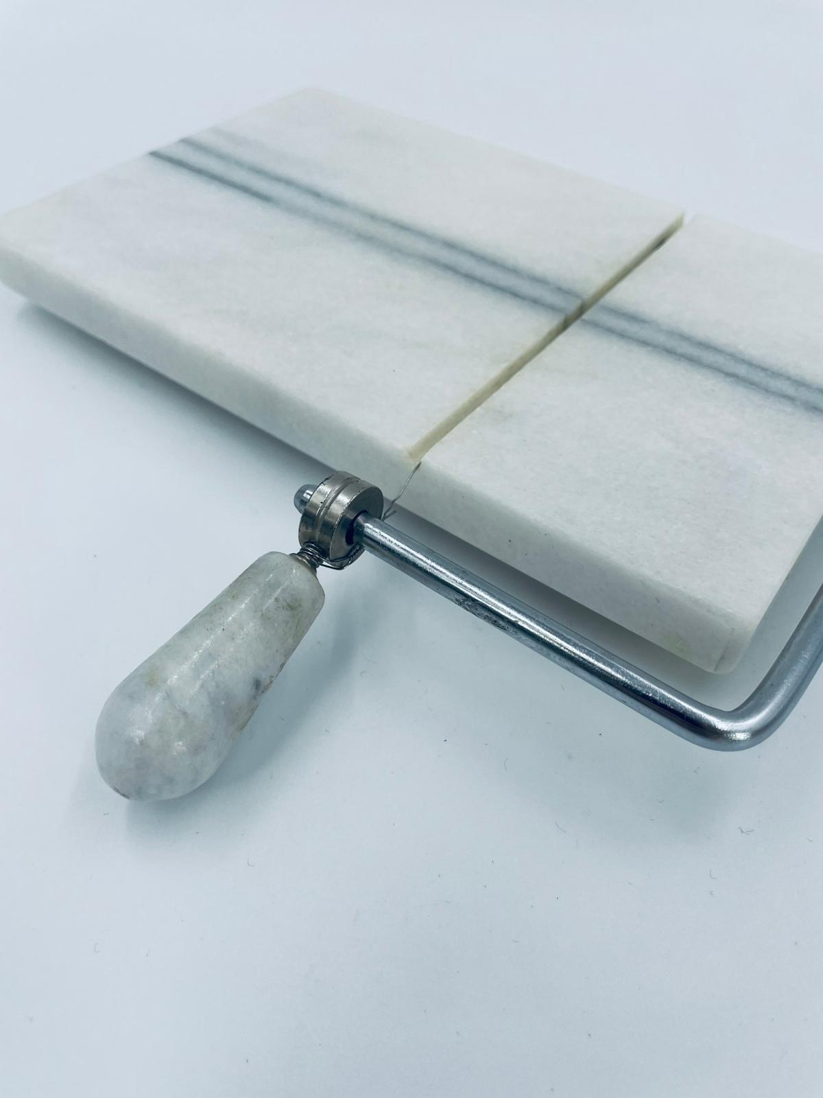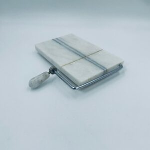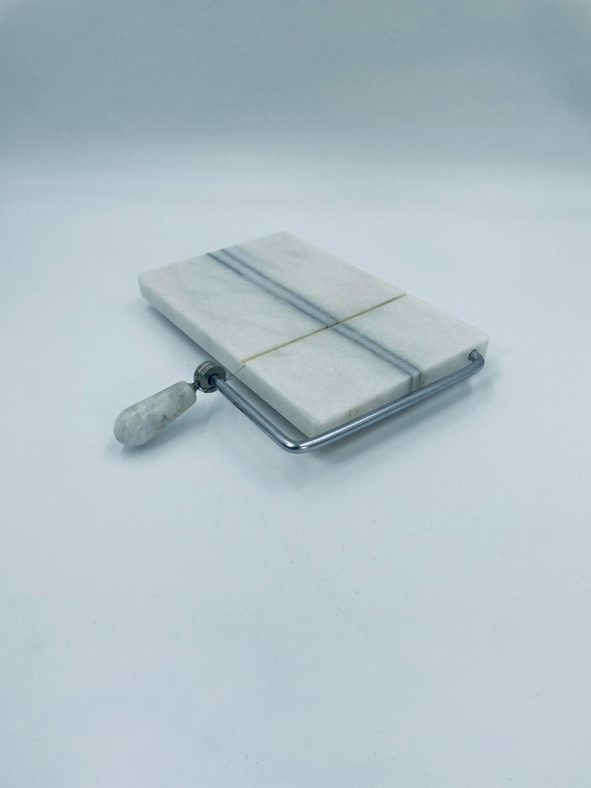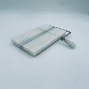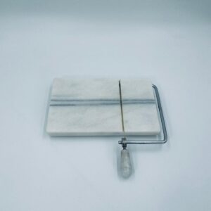 Deska, krajalnica do sera w stylu Vintage, wykonana z marmuru w białym kolorze z szarymi przejściami. Posiada metalową linkę do precyzyjnego krojenia sera, masła lub innych produktów. Marmurowa deska pomaga utrzymać ser w chłodzie.