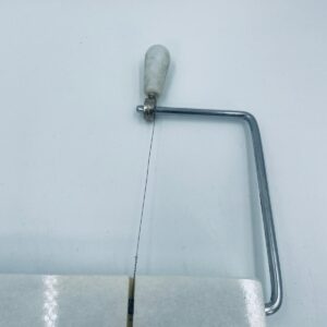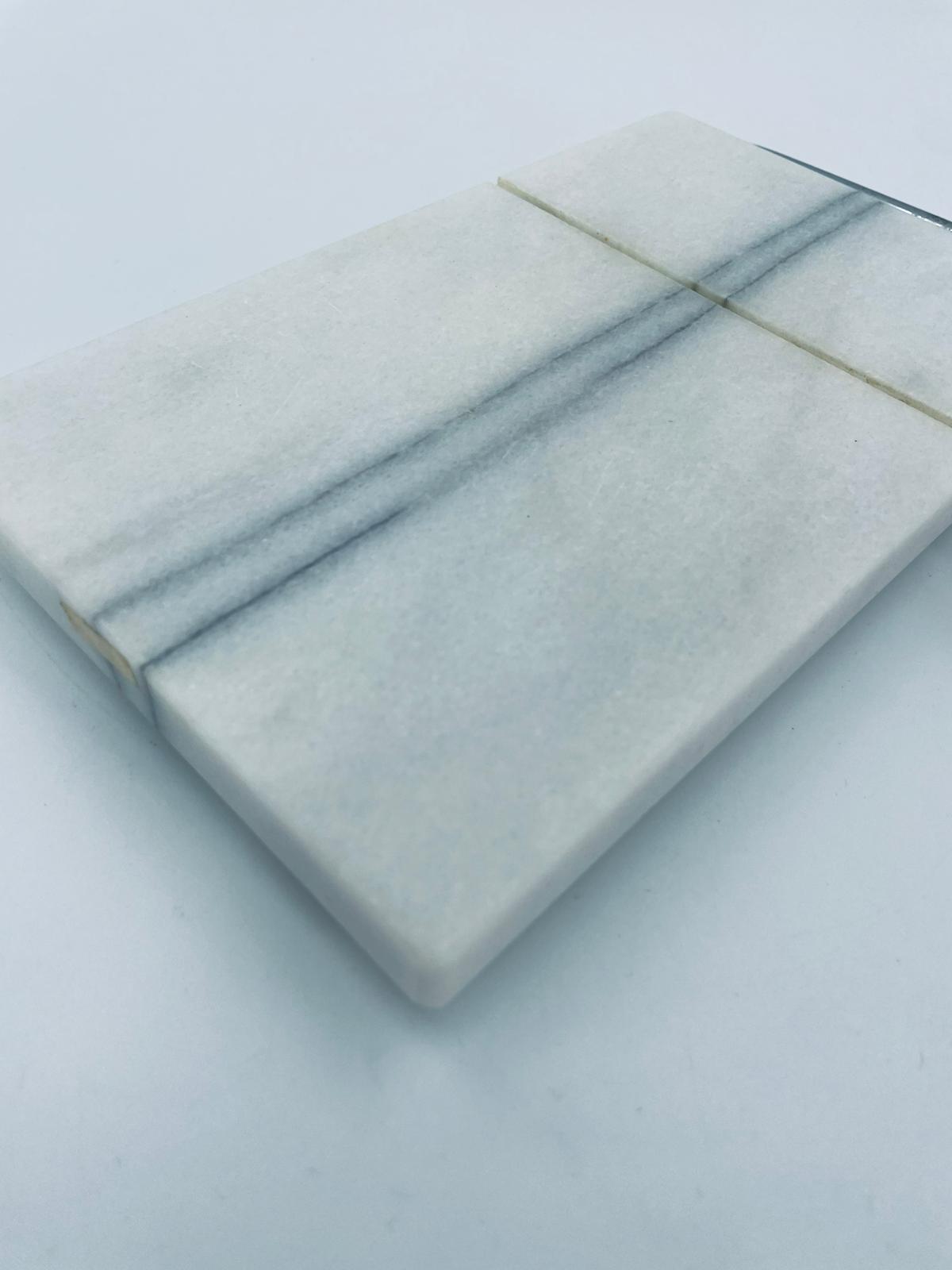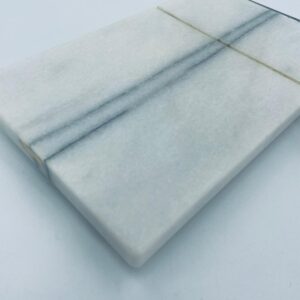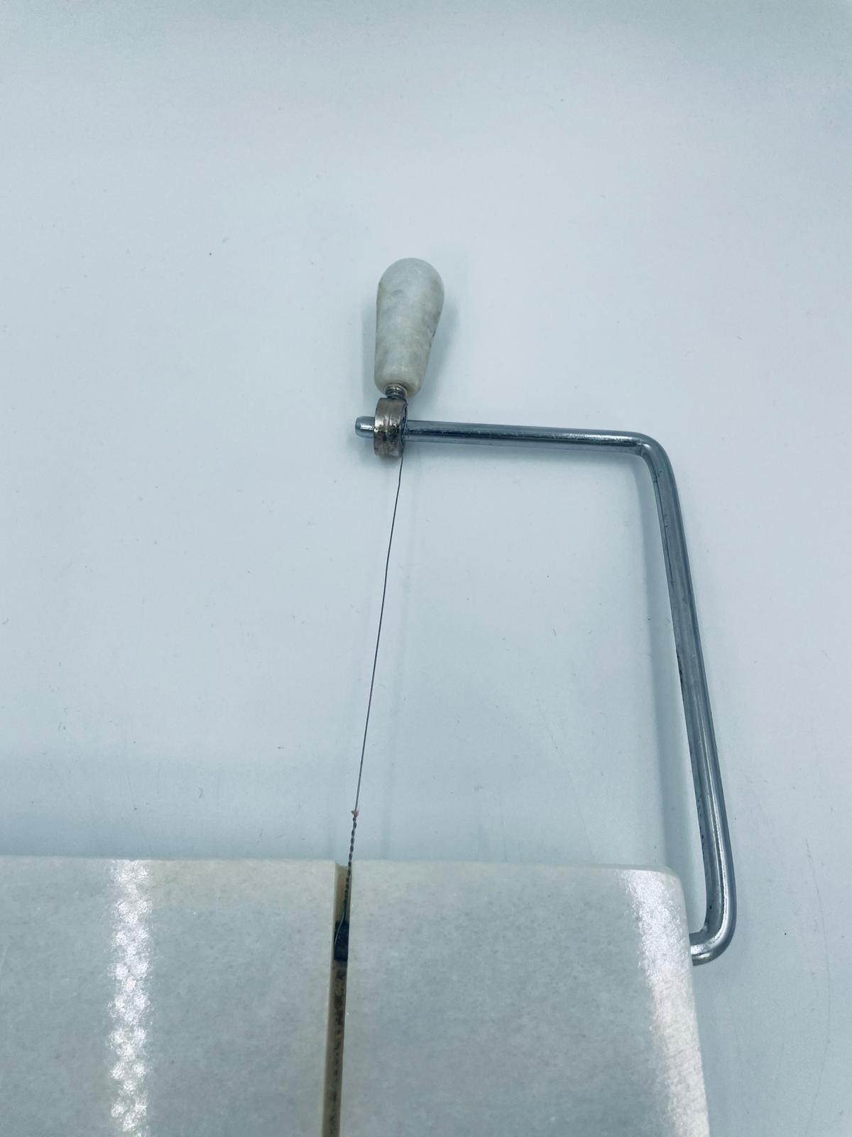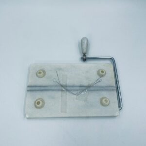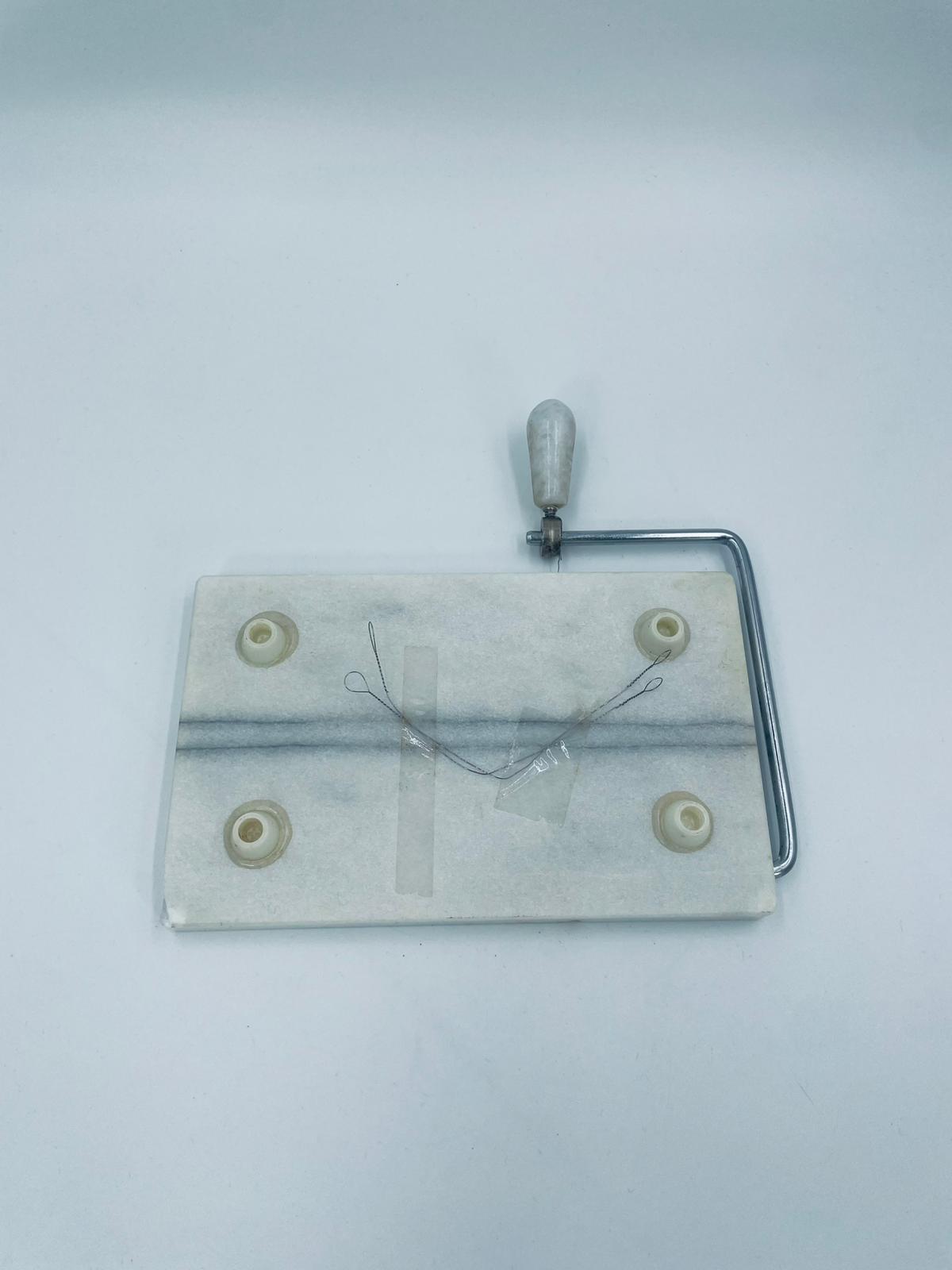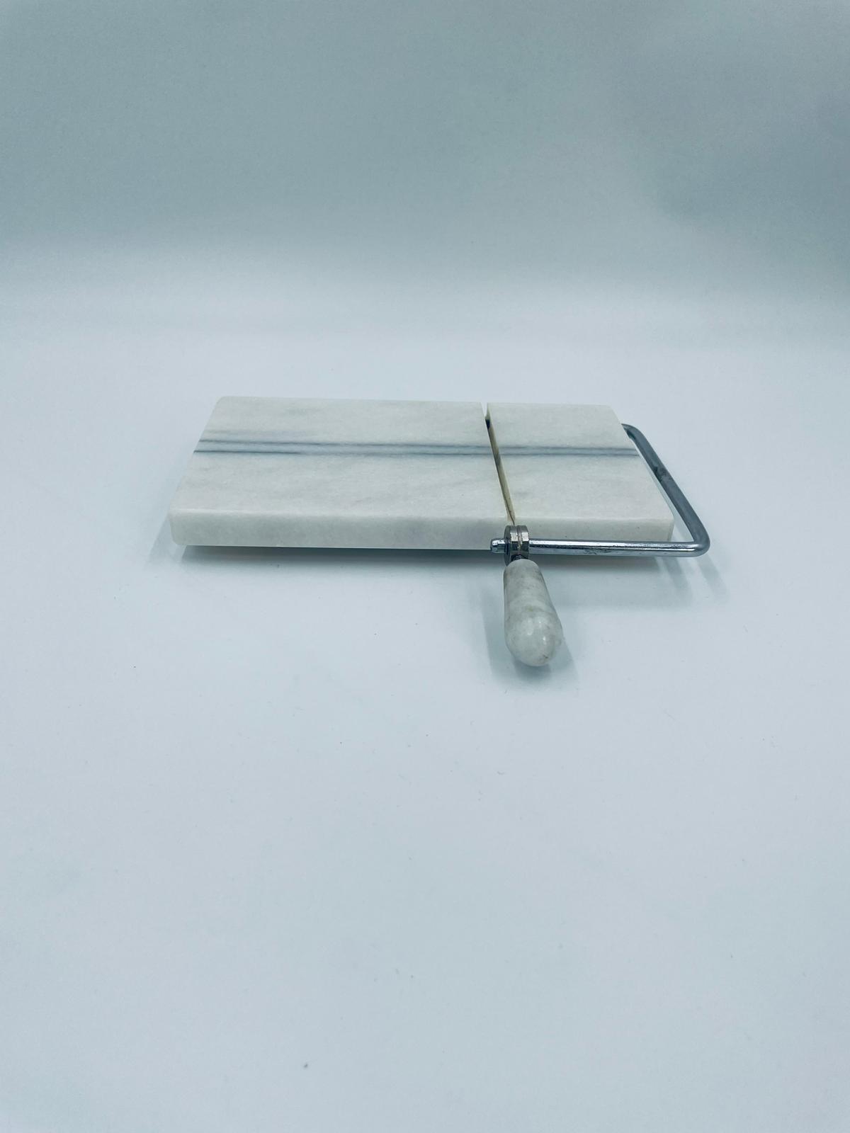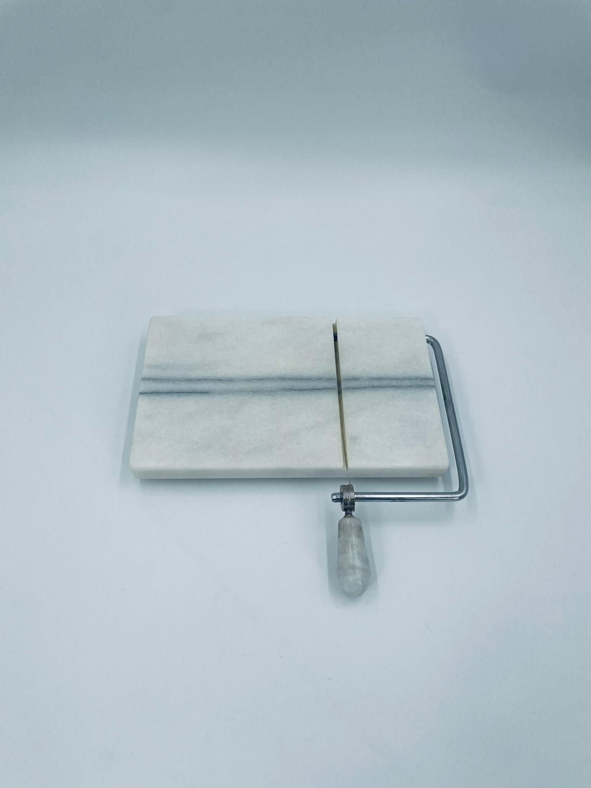 Deska, krajalnica do sera w stylu Vintage, wykonana z marmuru w białym kolorze z szarymi przejściami. Posiada metalową linkę do precyzyjnego krojenia sera, masła lub innych produktów. Marmurowa deska pomaga utrzymać ser w chłodzie.