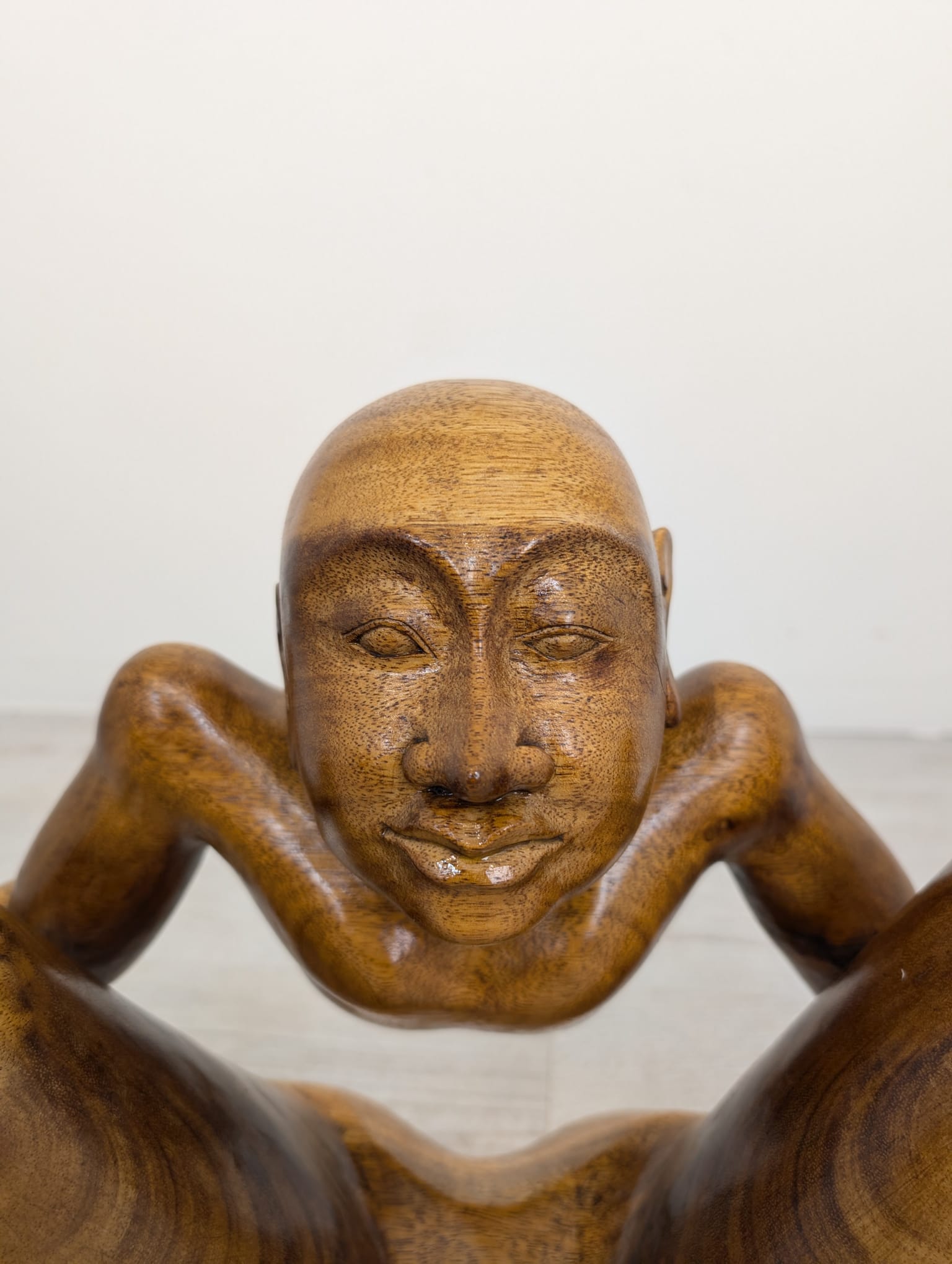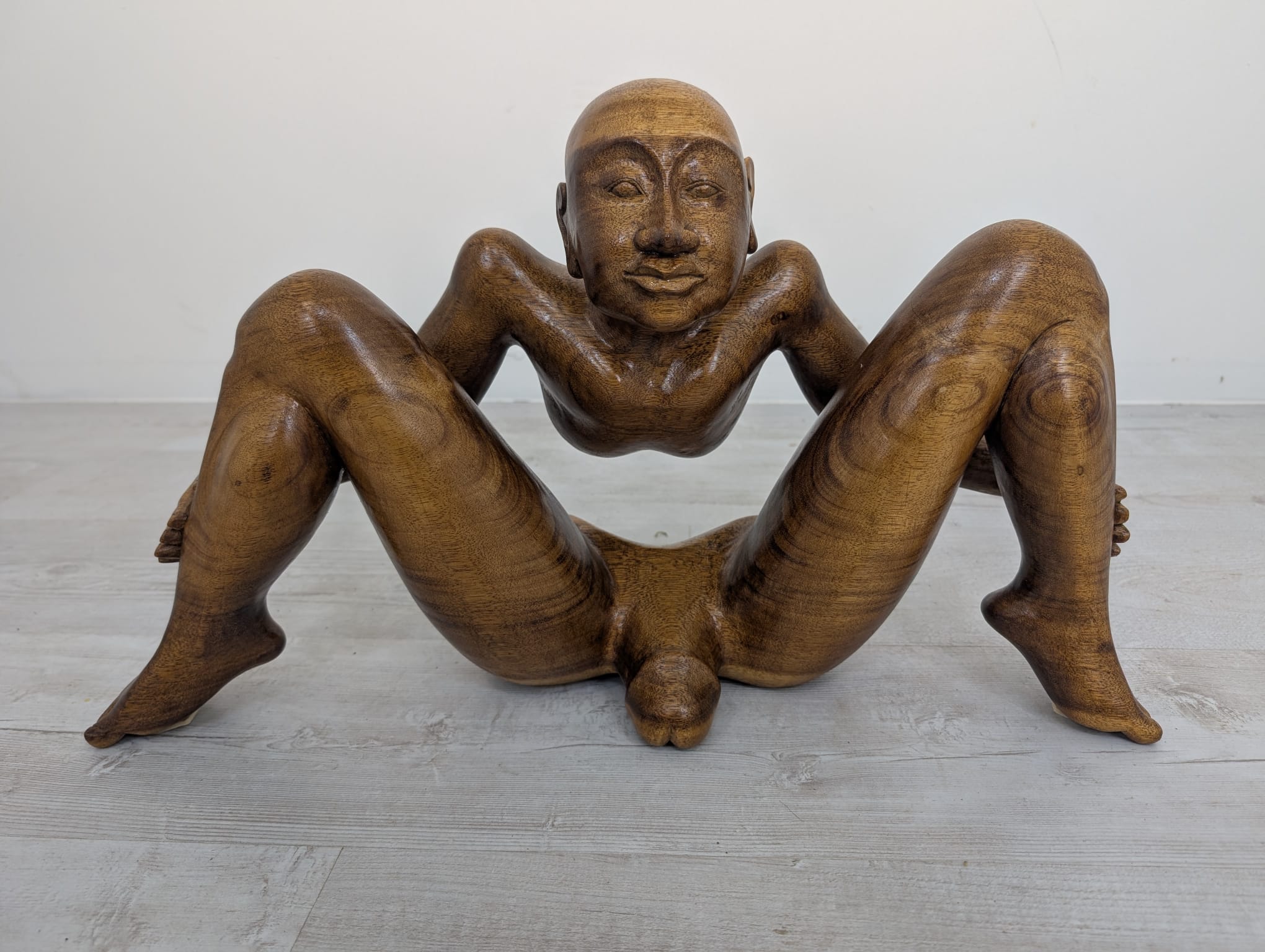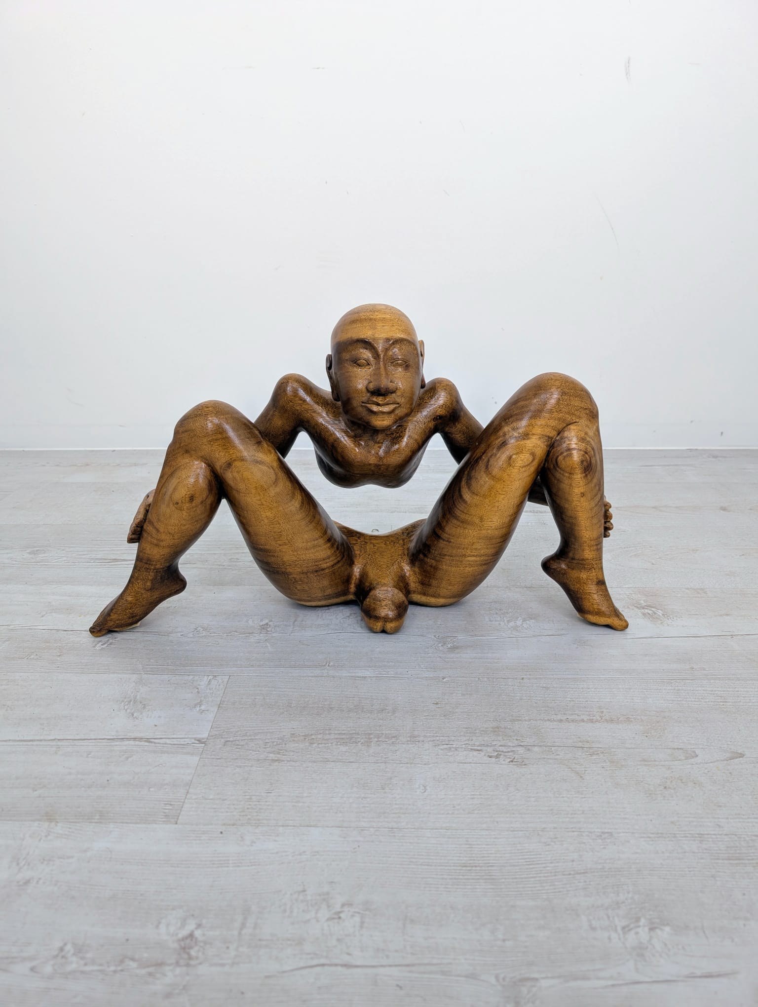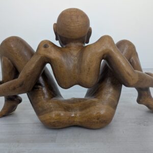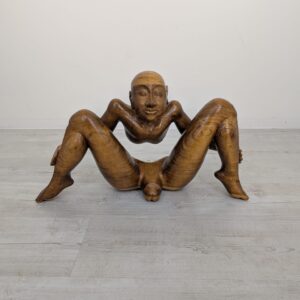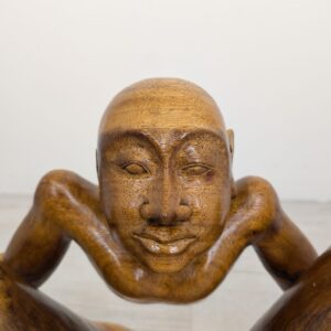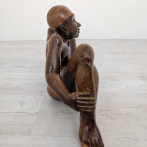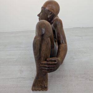 Rzeźba z litego drewna tekowego przedstawiająca nagiego mężczyznę w pozycji siedzącej. Drewniana figura została starannie wykonana, z dbałością o szczegóły anatomiczne. Stanowi interesujący element dekoracyjny do wnętrza.