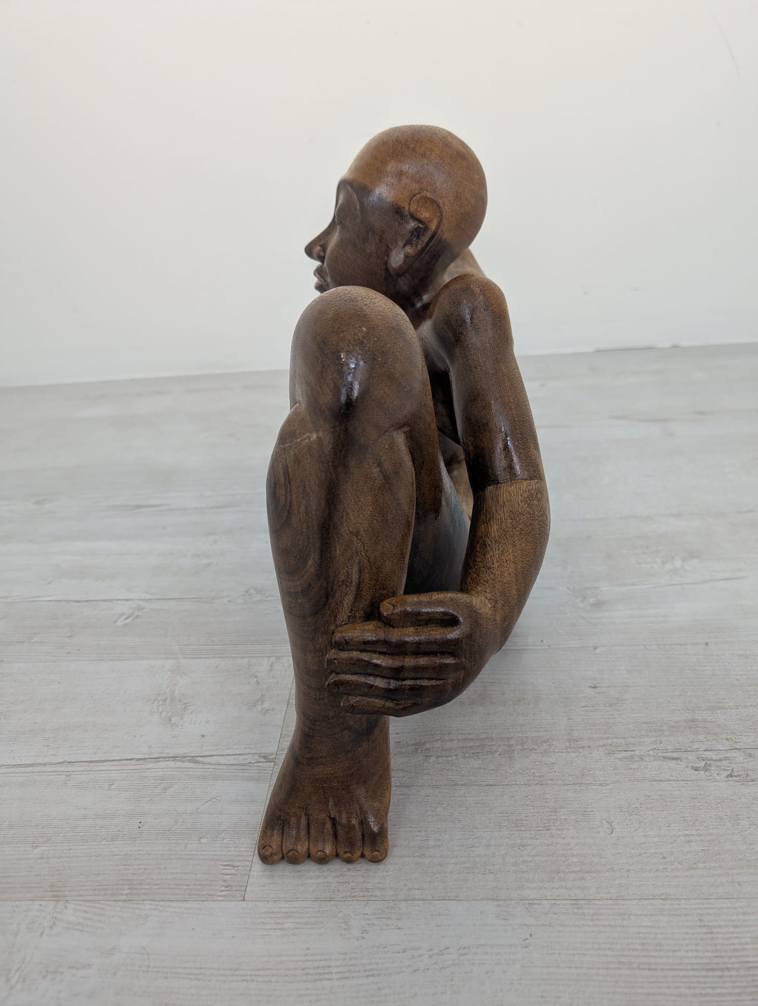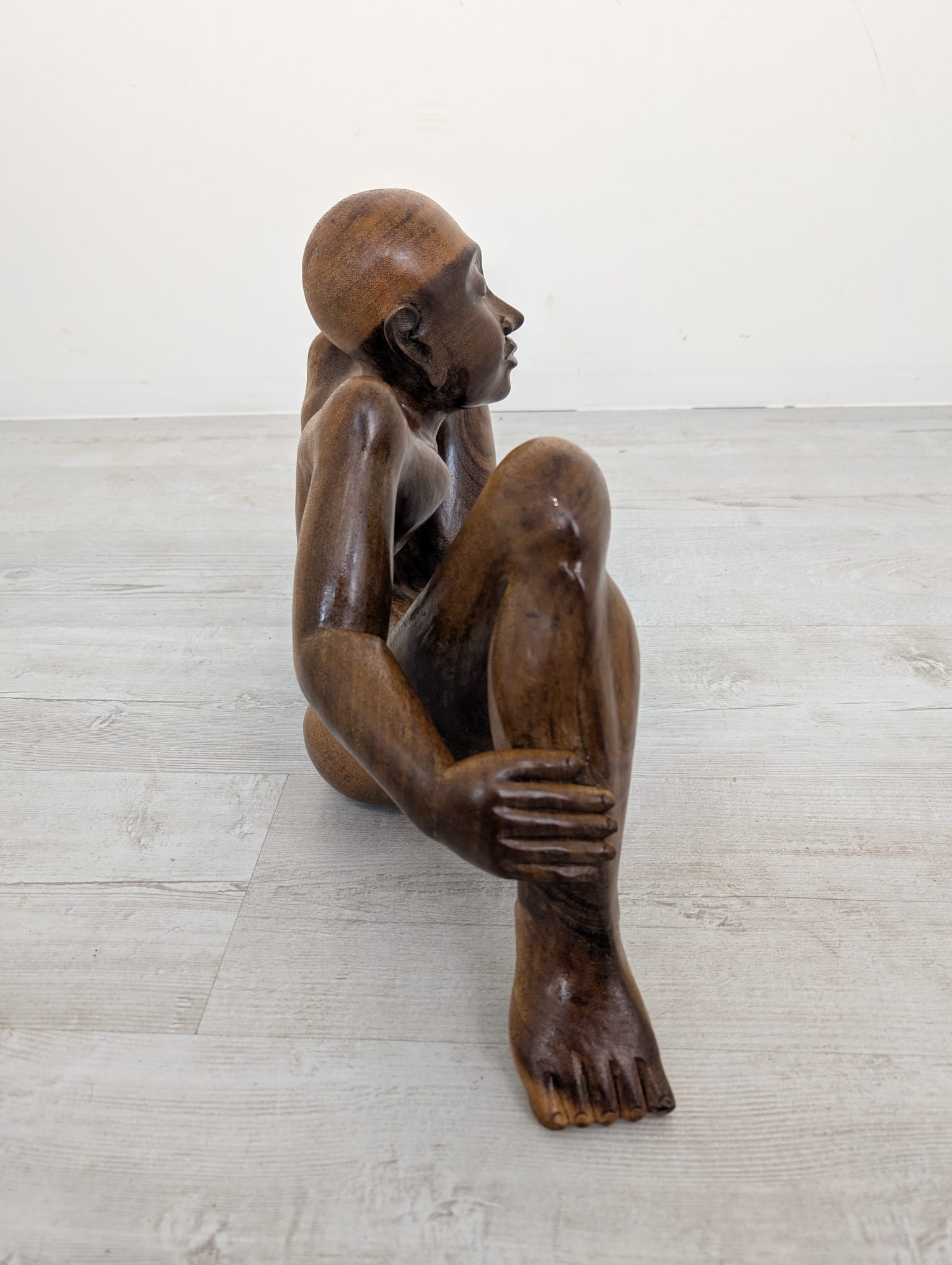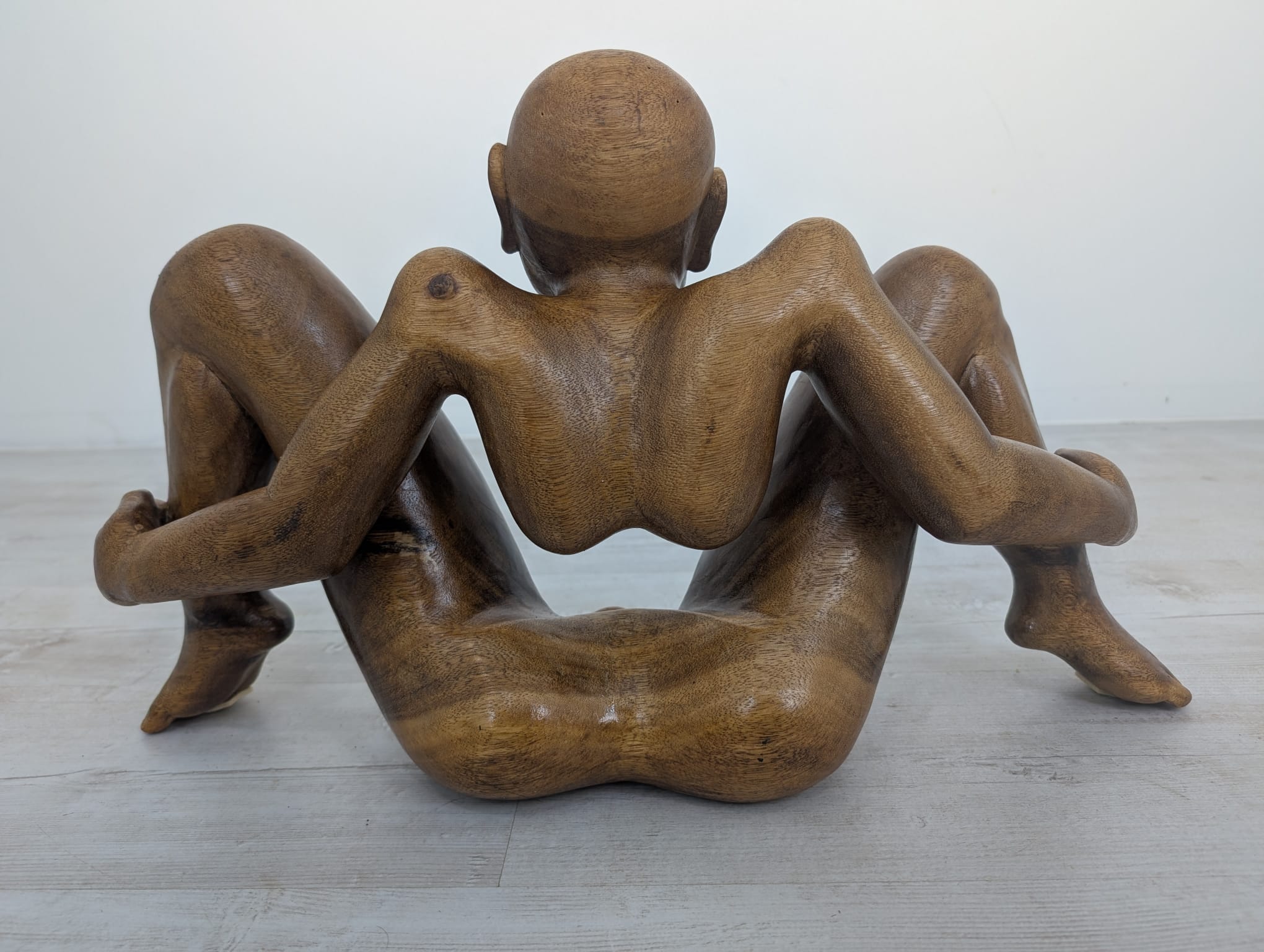 Rzeźba z litego drewna tekowego przedstawiająca nagiego mężczyznę w pozycji siedzącej. Drewniana figura została starannie wykonana, z dbałością o szczegóły anatomiczne. Stanowi interesujący element dekoracyjny do wnętrza.