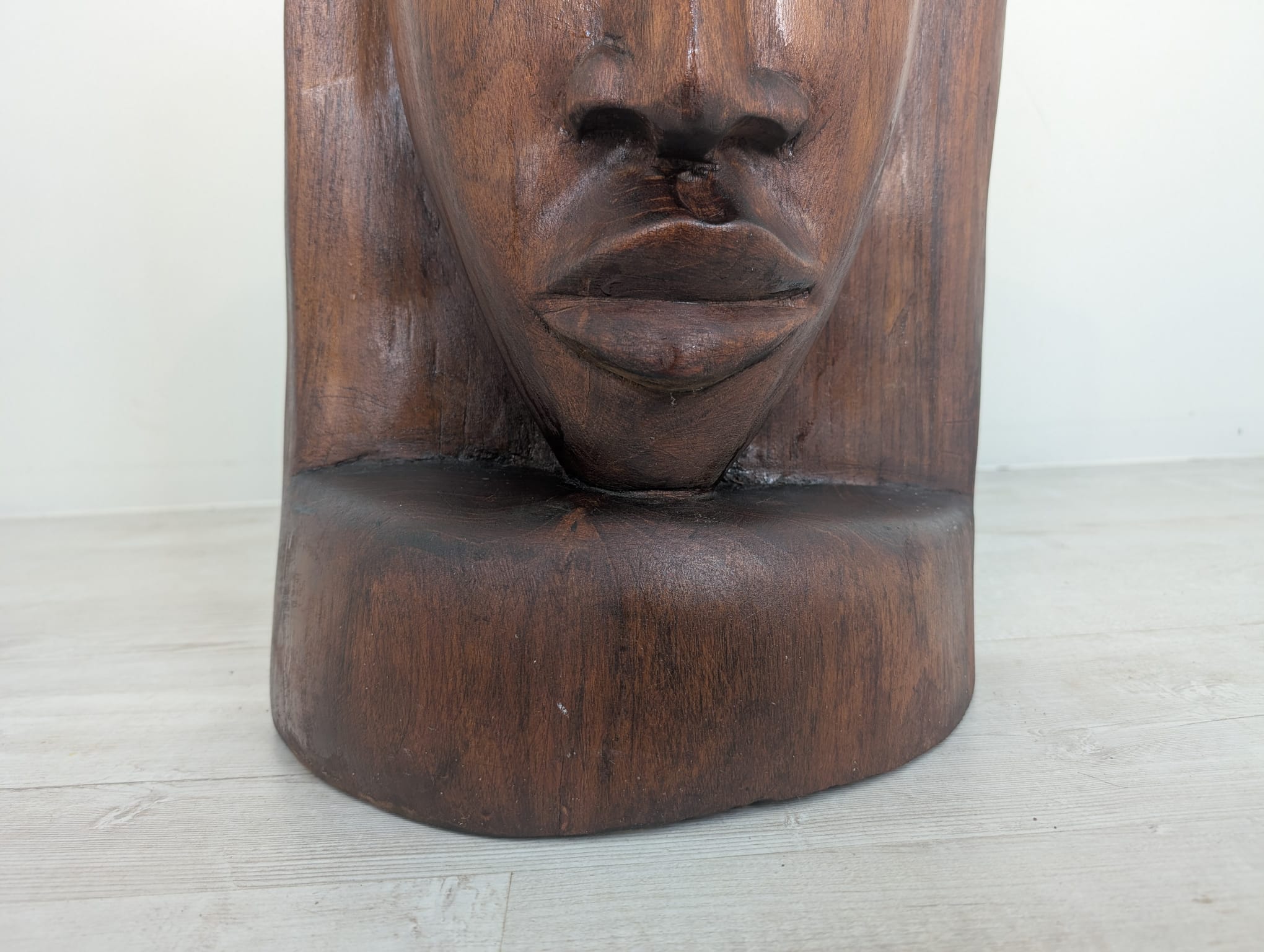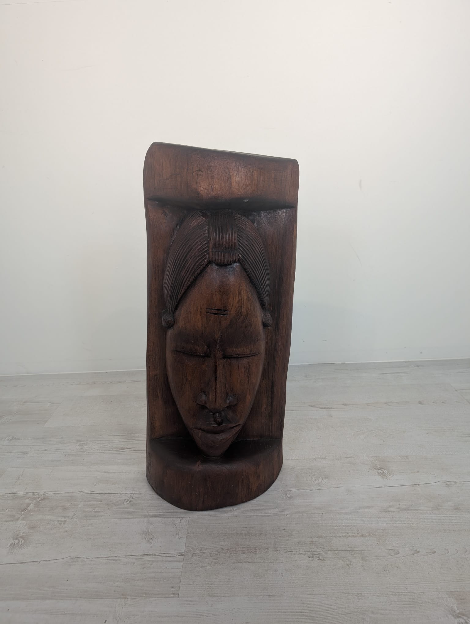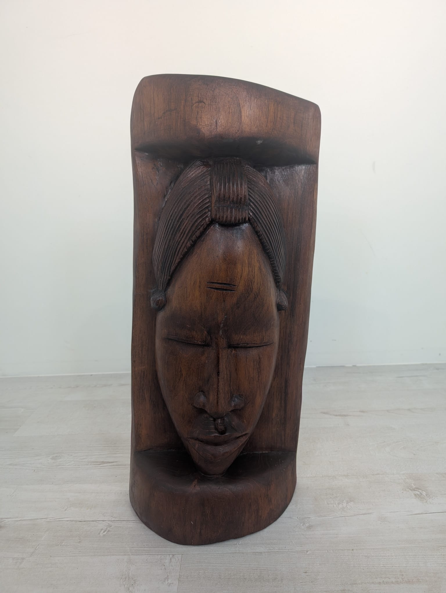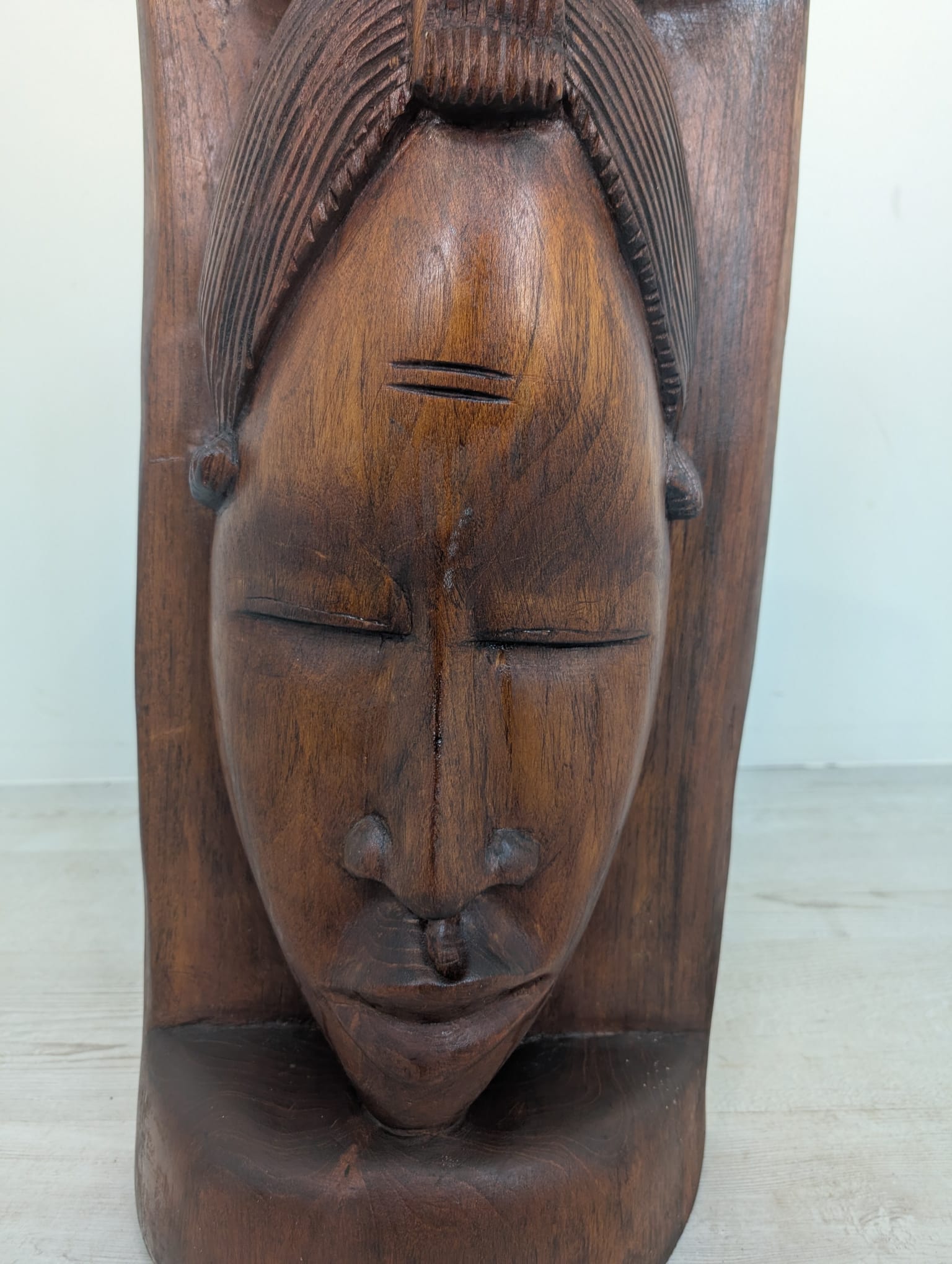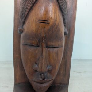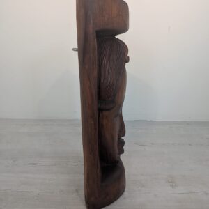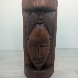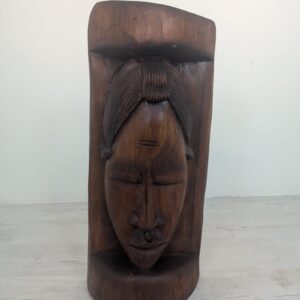Rzeźba przedstawia twarz kobiety w jednym kawałku drewna.