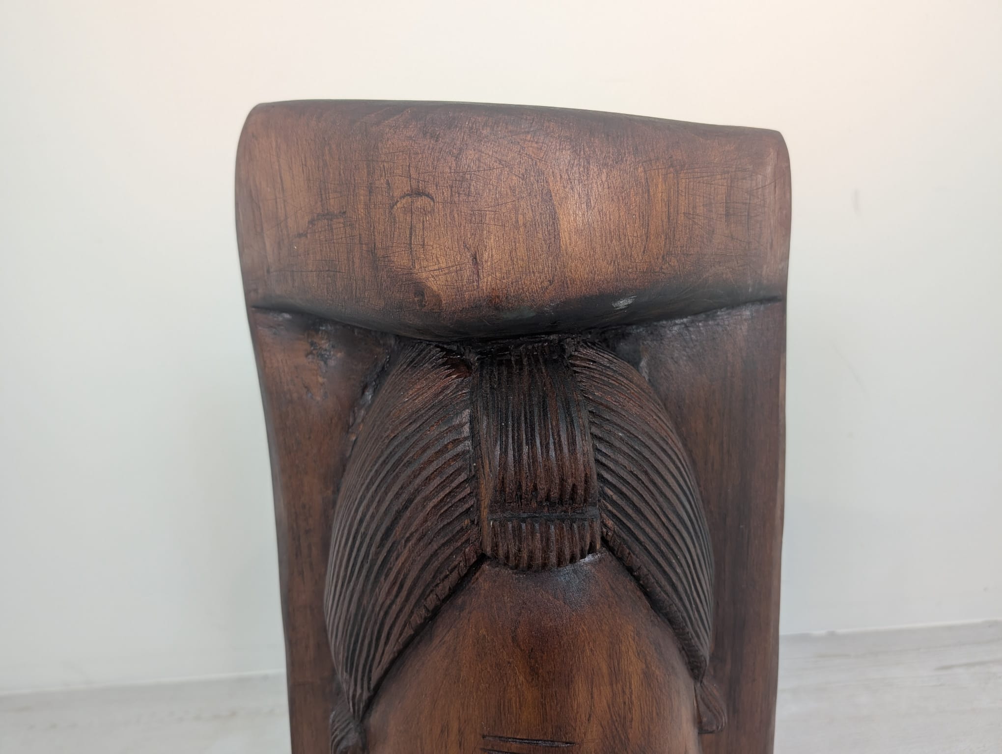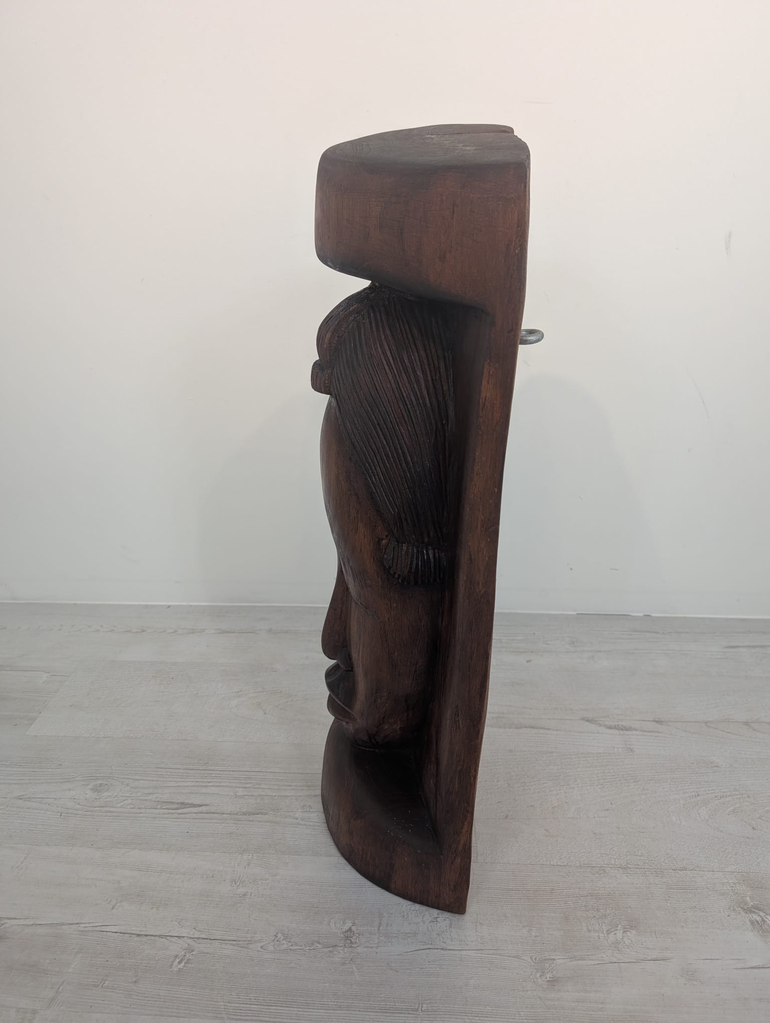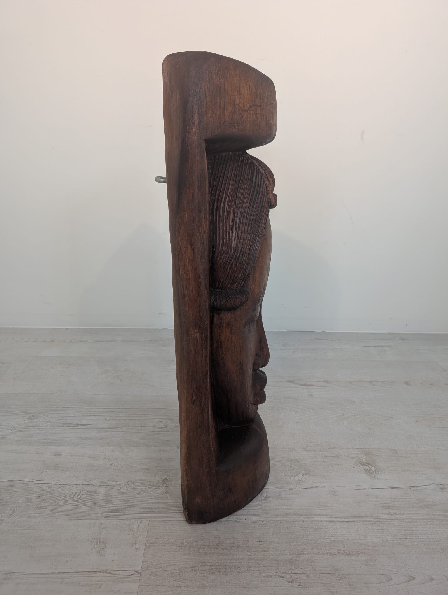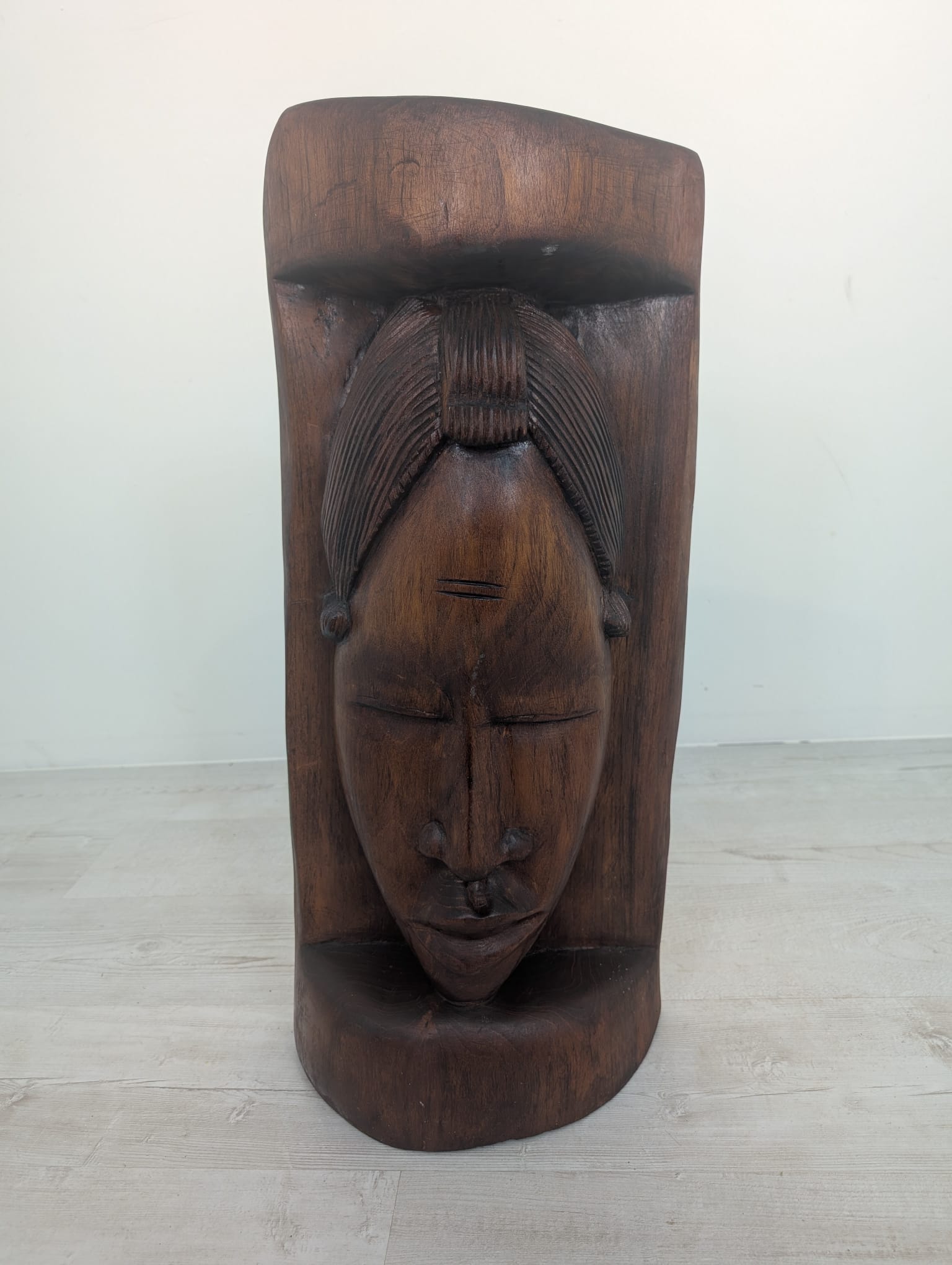 Rzeźba przedstawia twarz kobiety w jednym kawałku drewna.