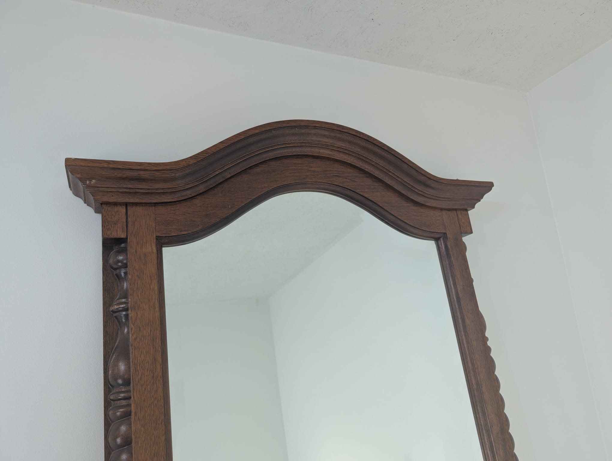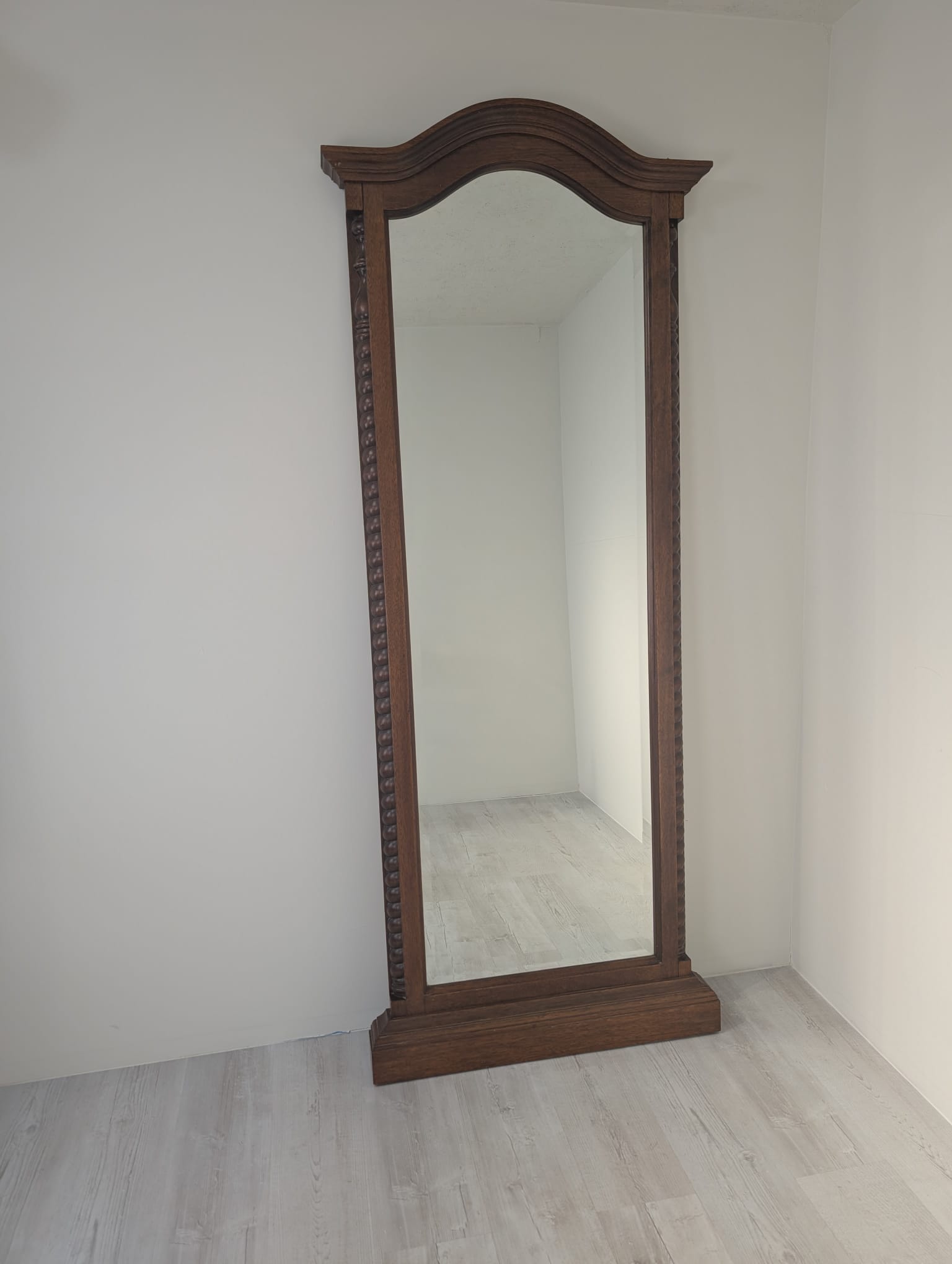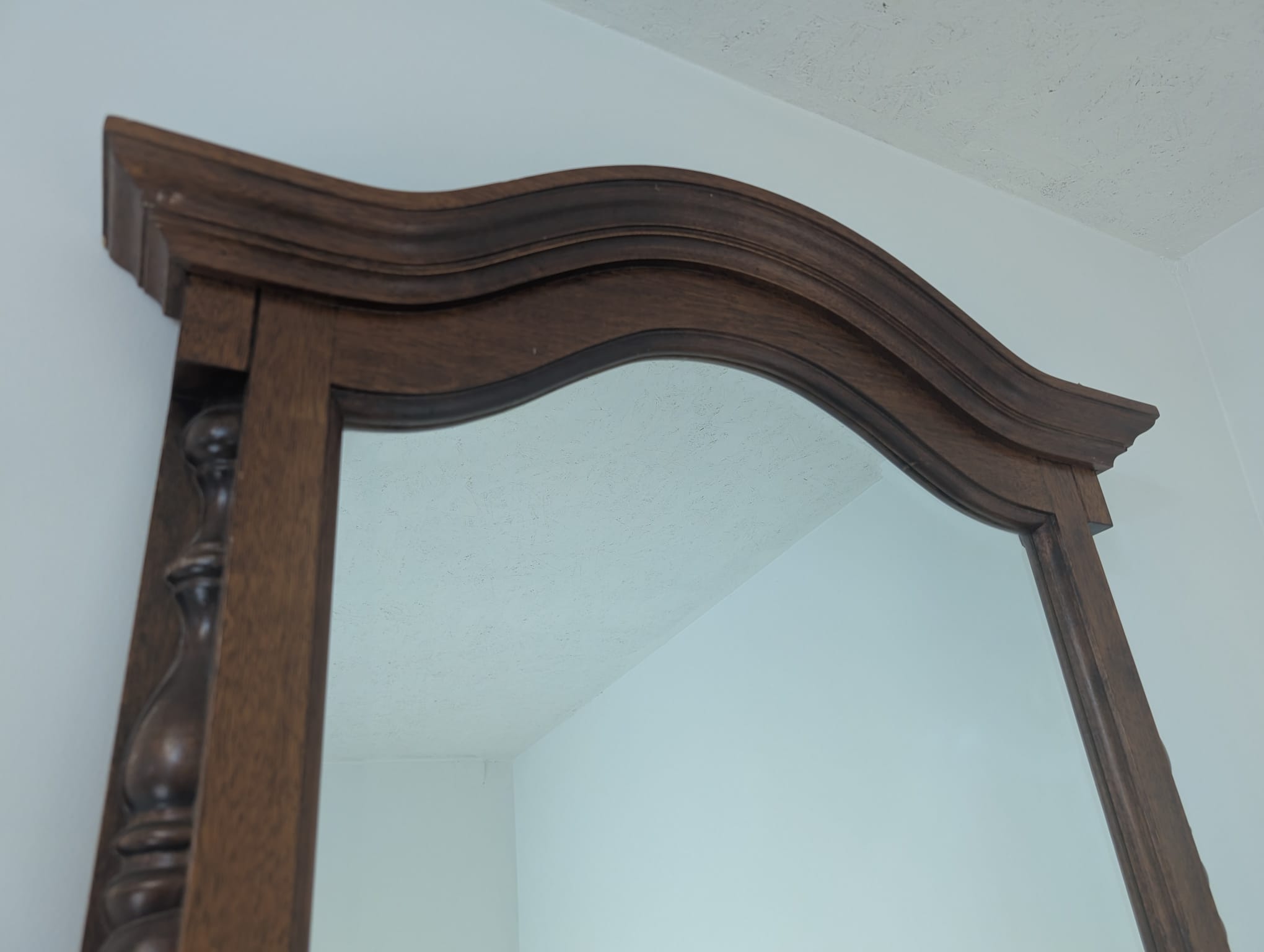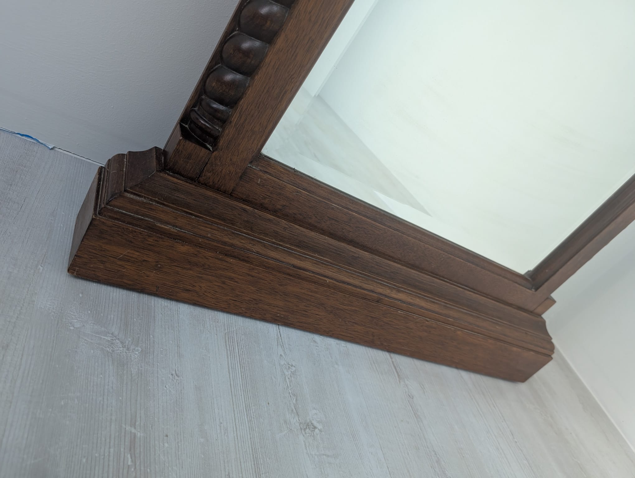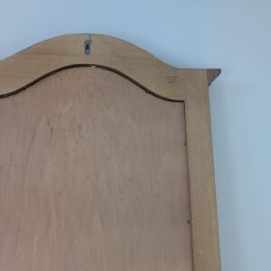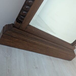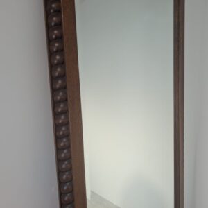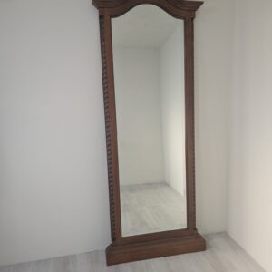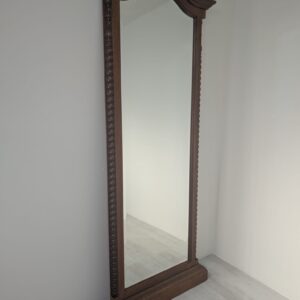 Lustro wiszące ale również może stać przy ścianie w litej ramie drewnianej bukowej, z ozdobami rzeźbionymi na bokach ramy oraz na górnym łukowatym zwieńczeniu.