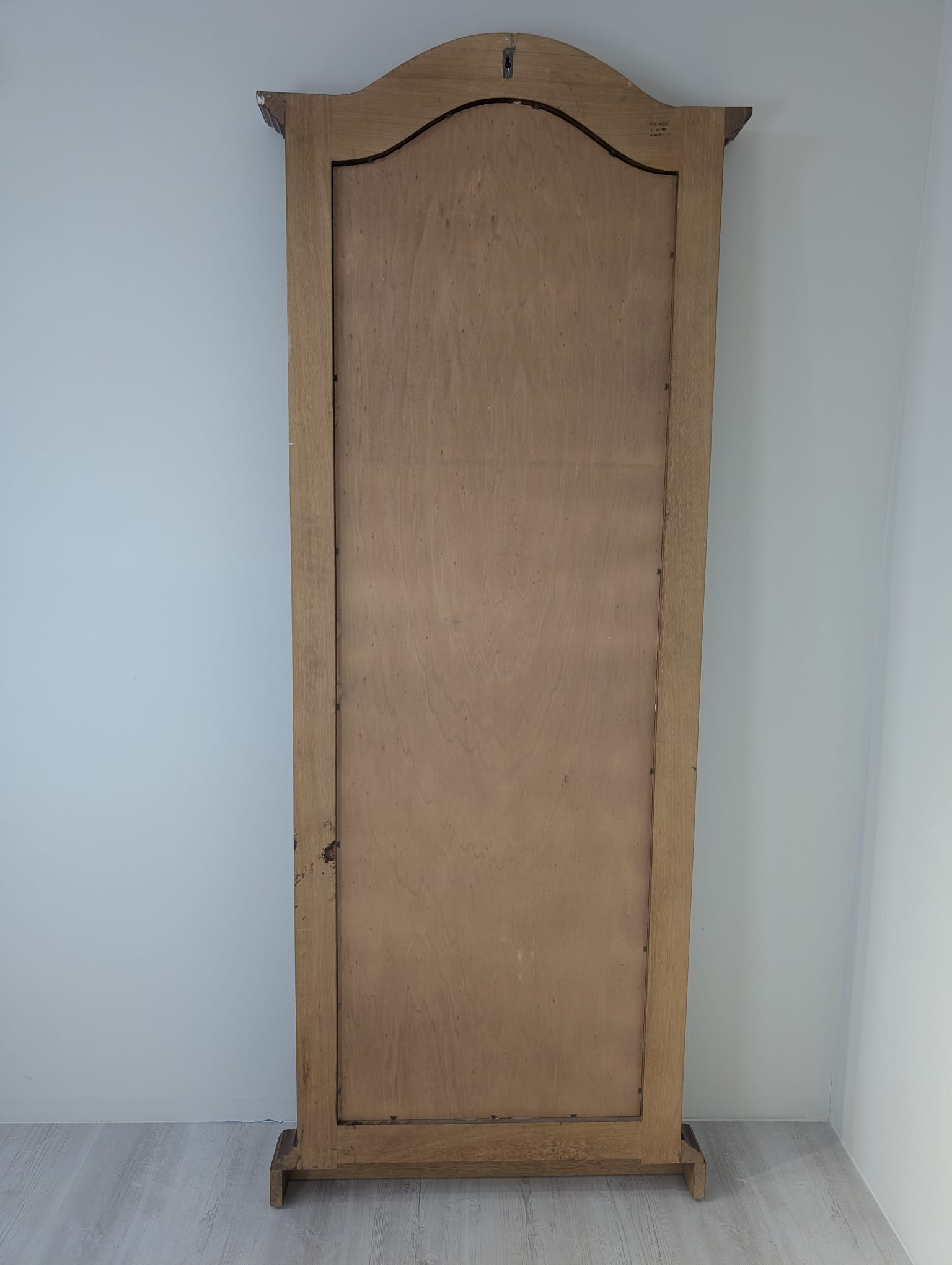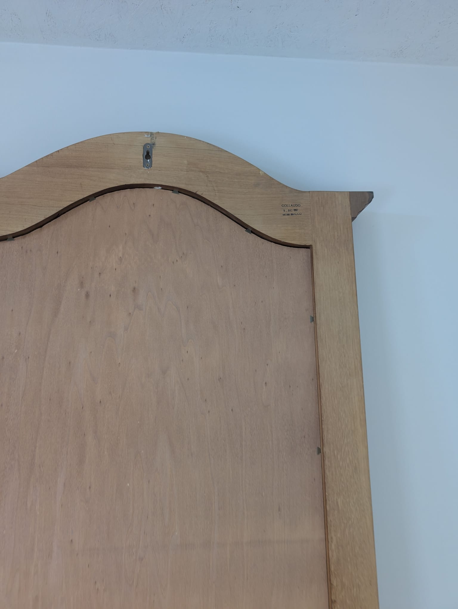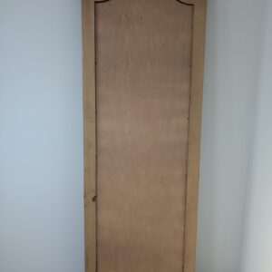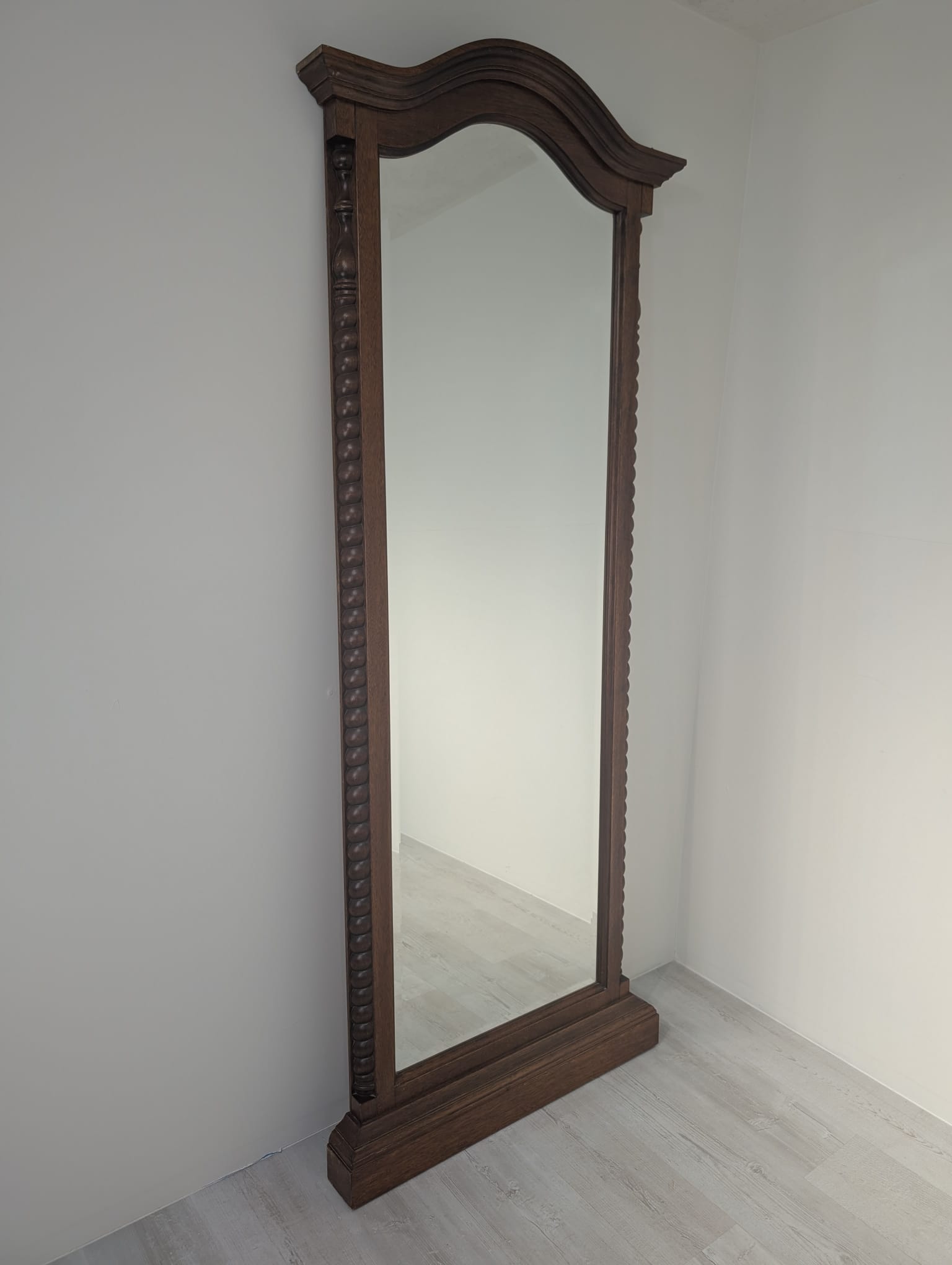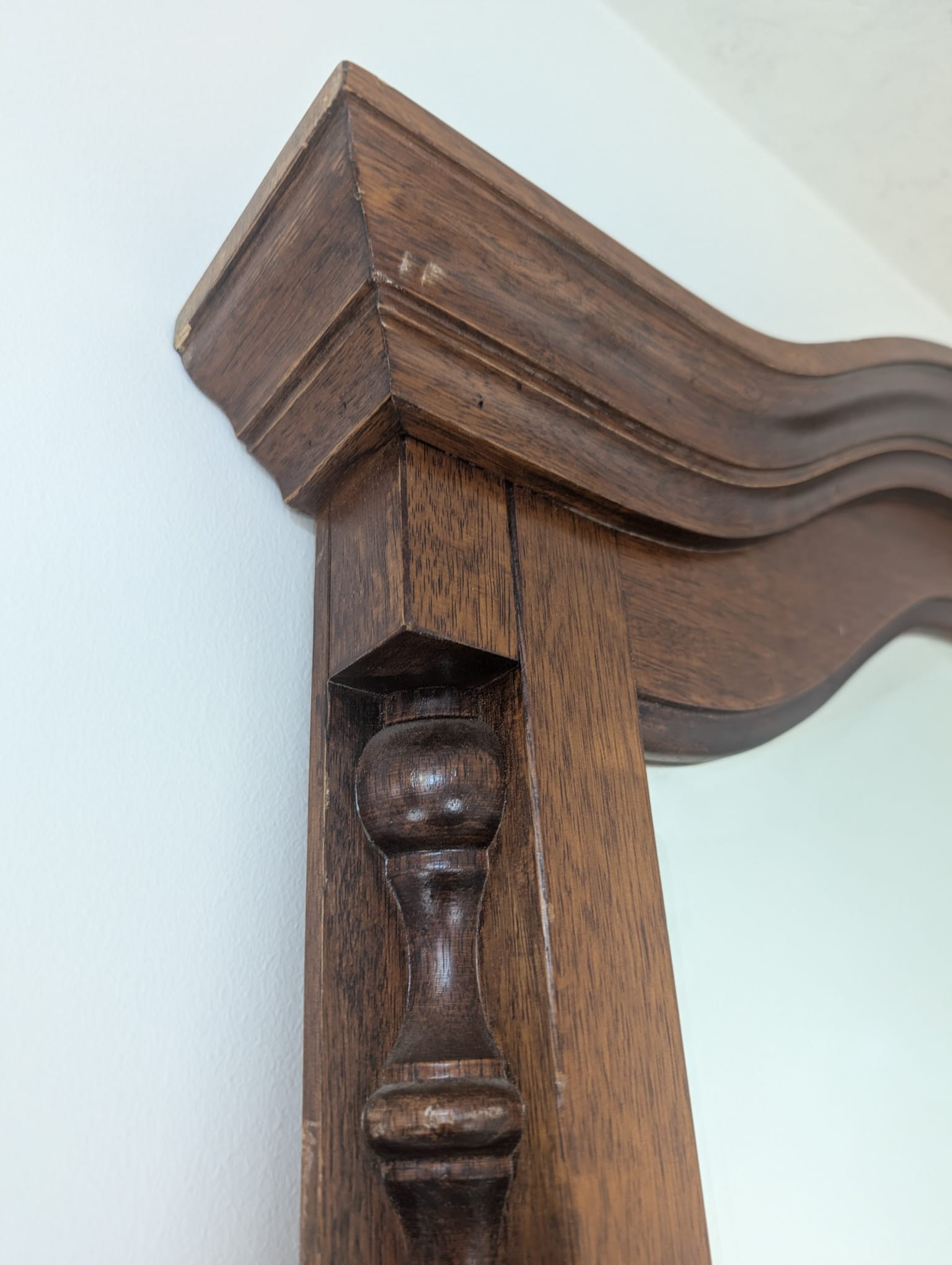 Lustro wiszące ale również może stać przy ścianie w litej ramie drewnianej bukowej, z ozdobami rzeźbionymi na bokach ramy oraz na górnym łukowatym zwieńczeniu.