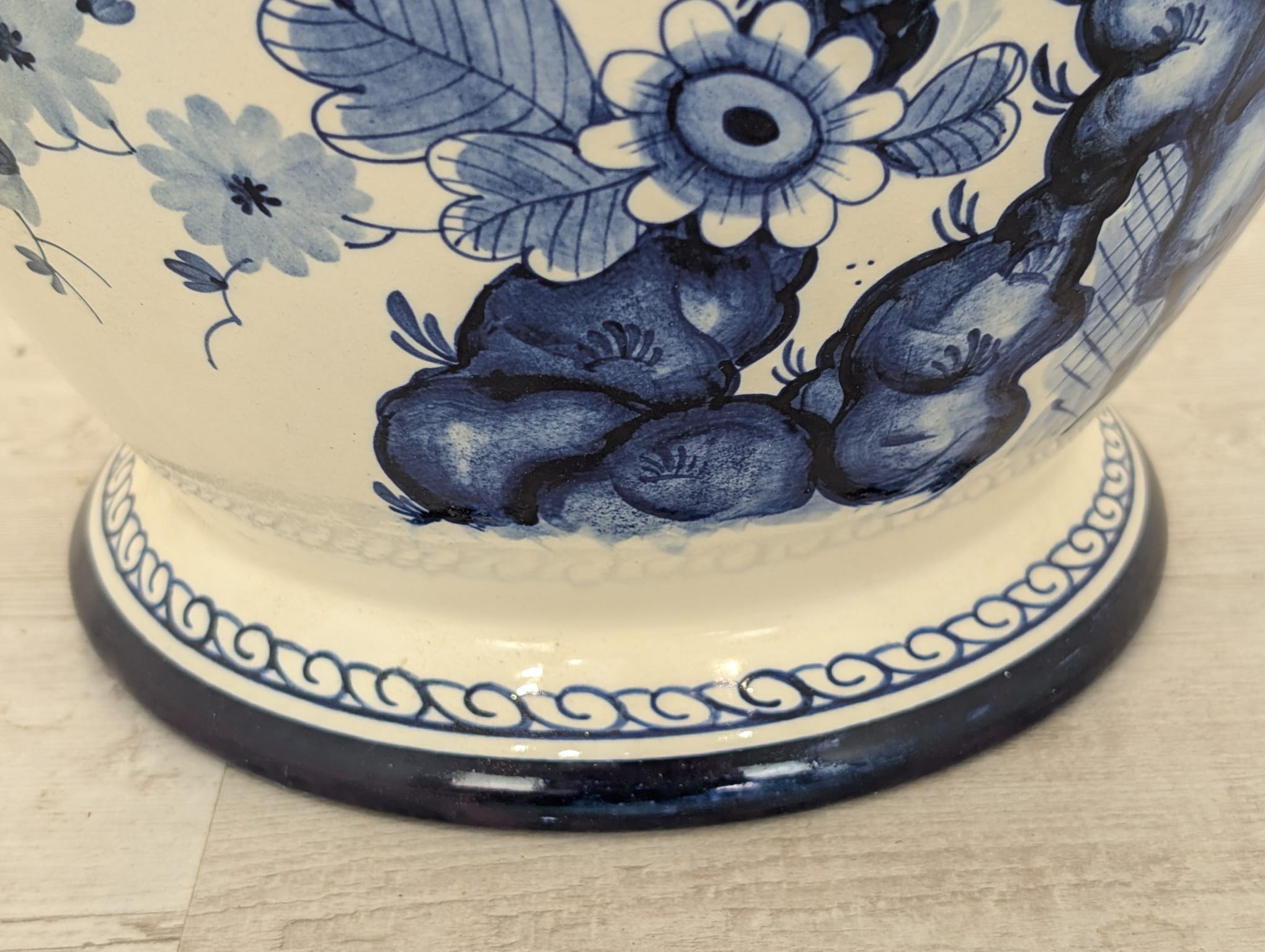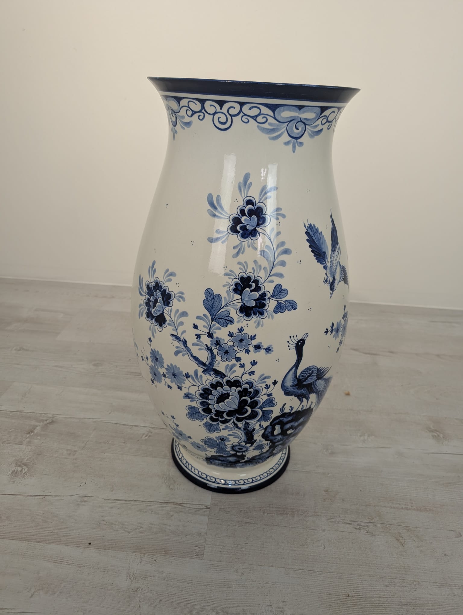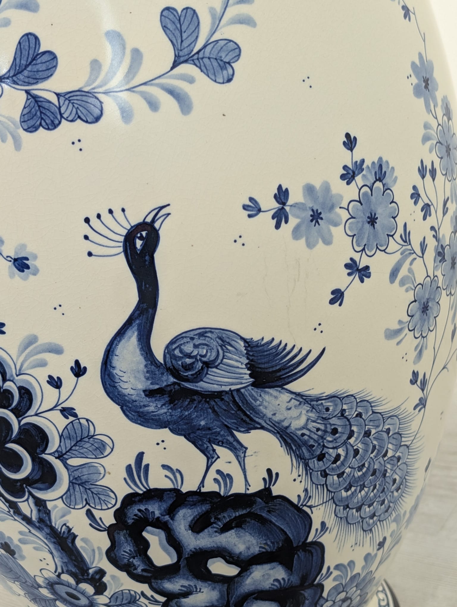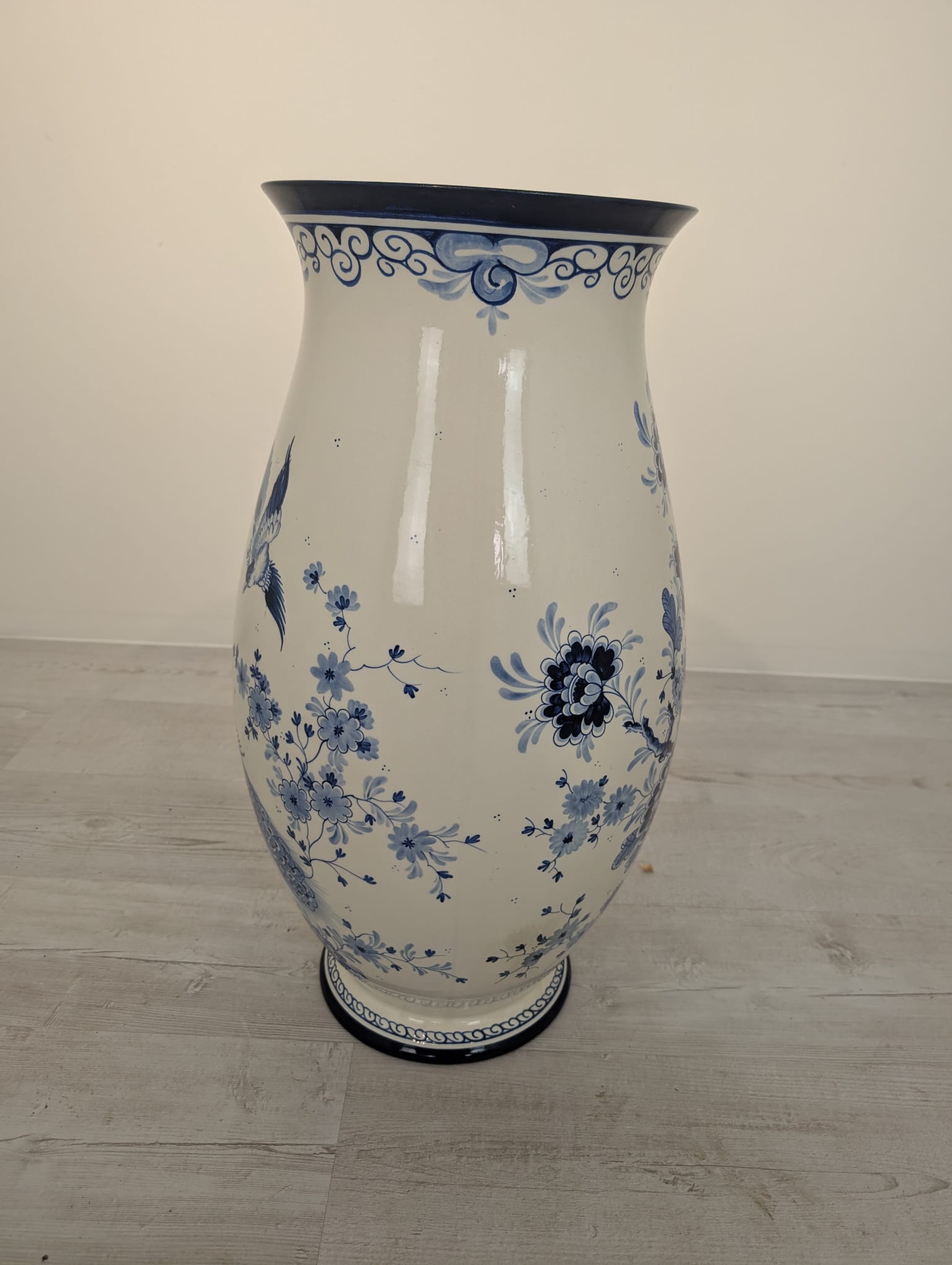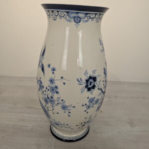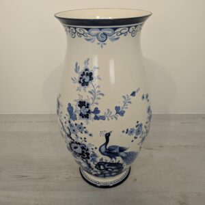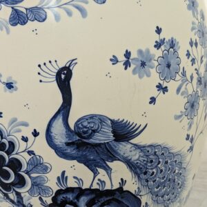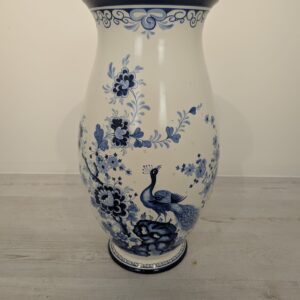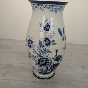 Duży porcelanowy wazon w pięknych kobaltowych wzorach przedstawiających żurawia w stylu holenderskim.