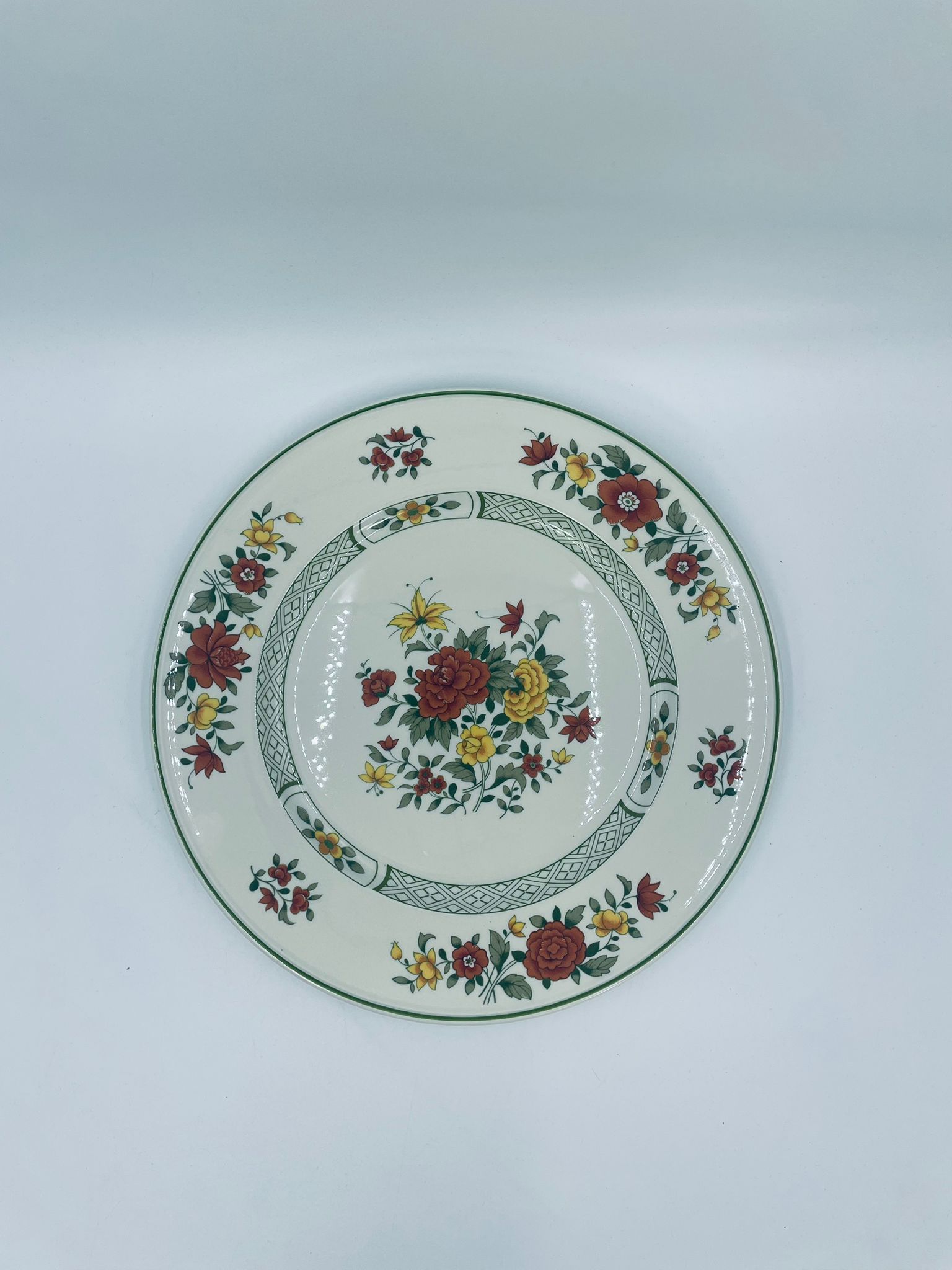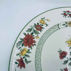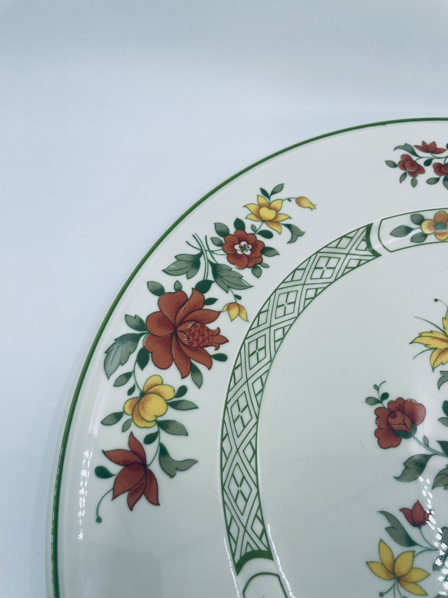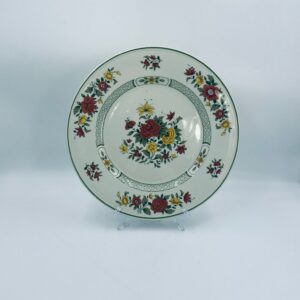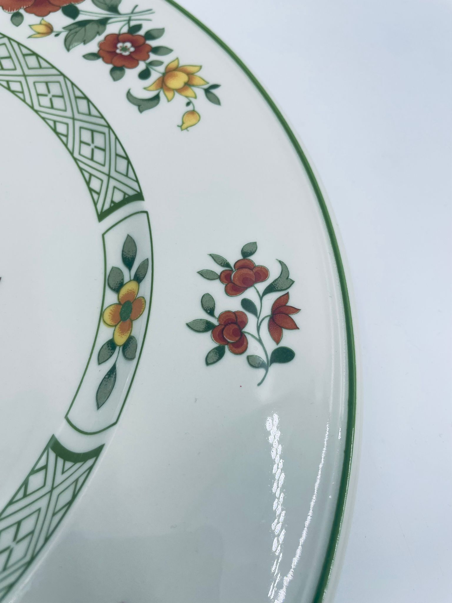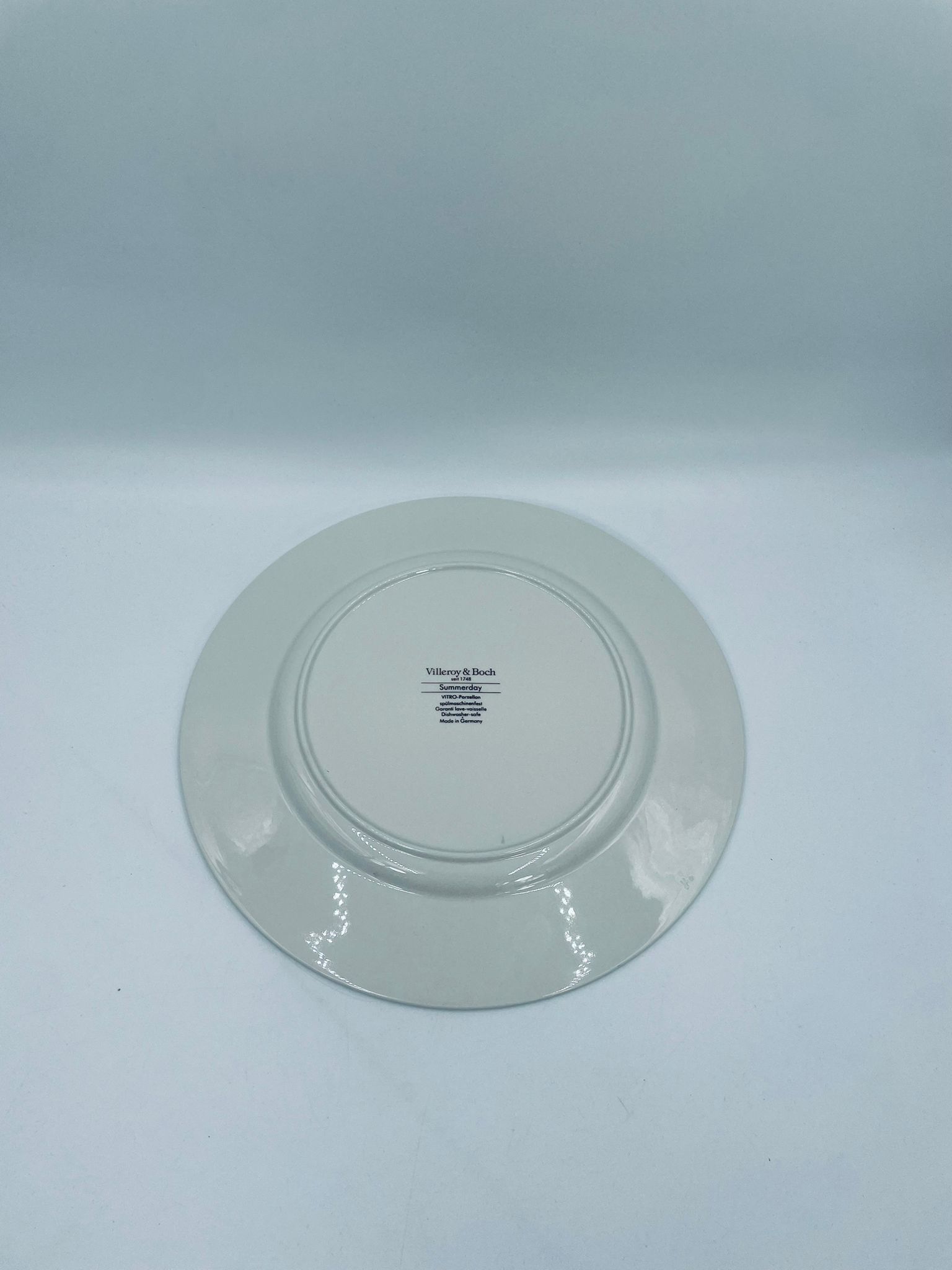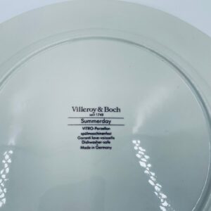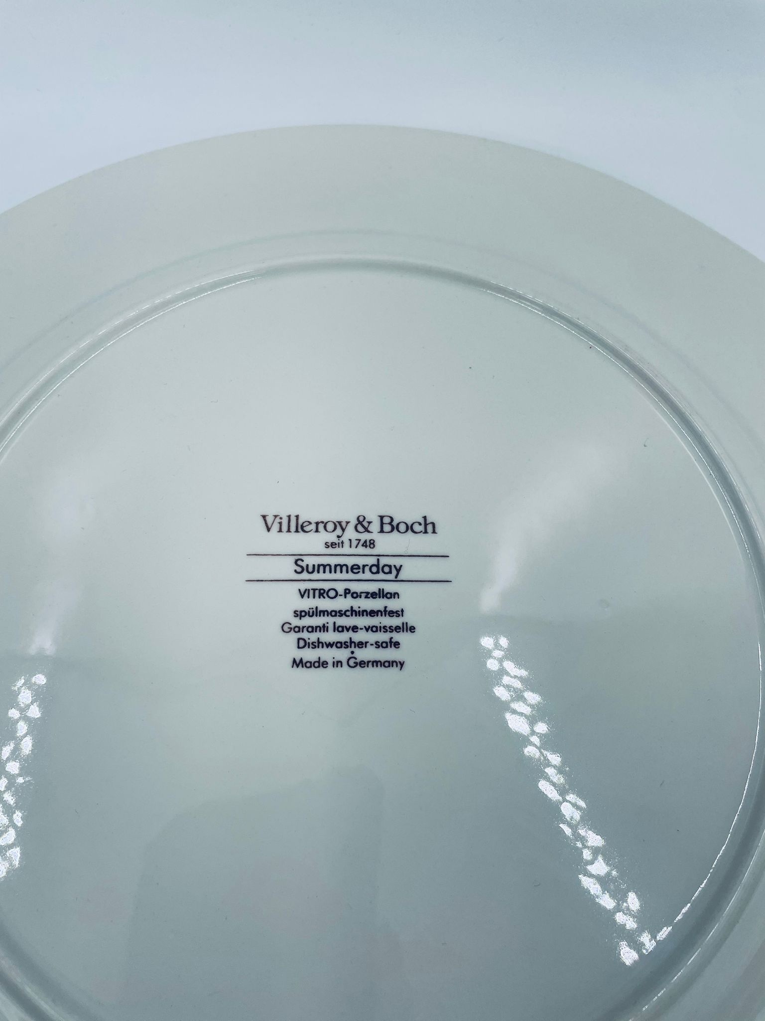 Duży talerz, patera renomowanej wytwórni Villeroy&Boch z kolekcji Summerday produkowanej od 1748r, wykonana z wysokiej jakości porcelany. Talerz charakteryzuje się kwiatowym motywem w odcieniach czerwieni i żółci oraz zielonym wzorem geometrycznym, wykończony zieloną obwódką dookoła rantu.
